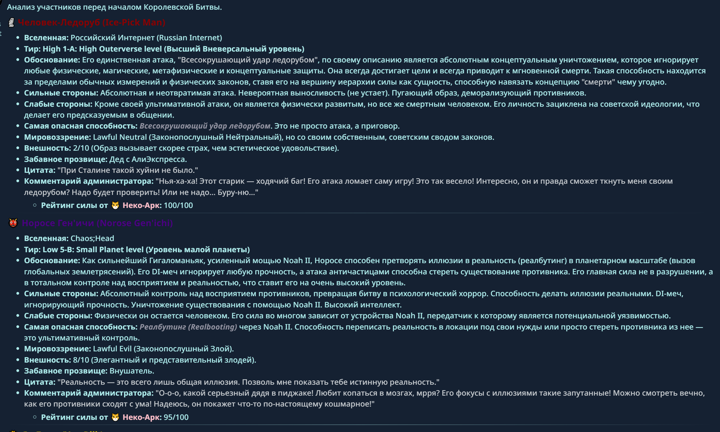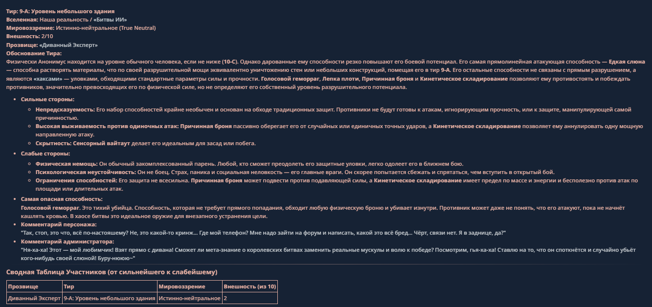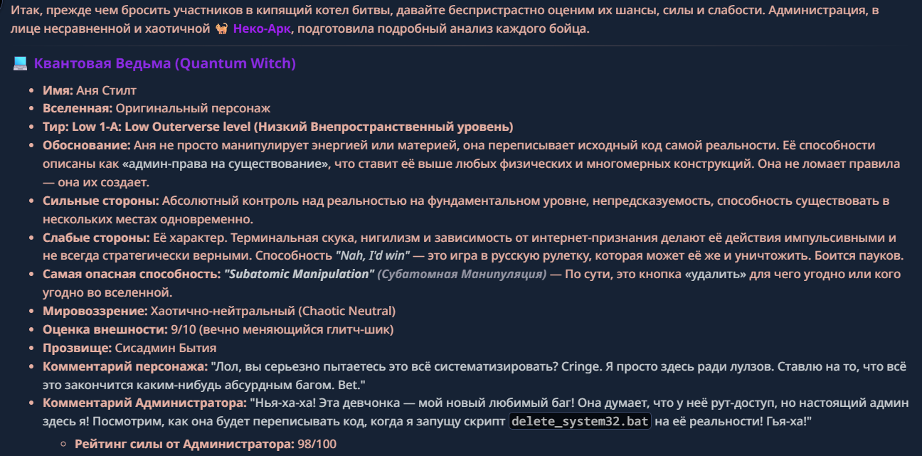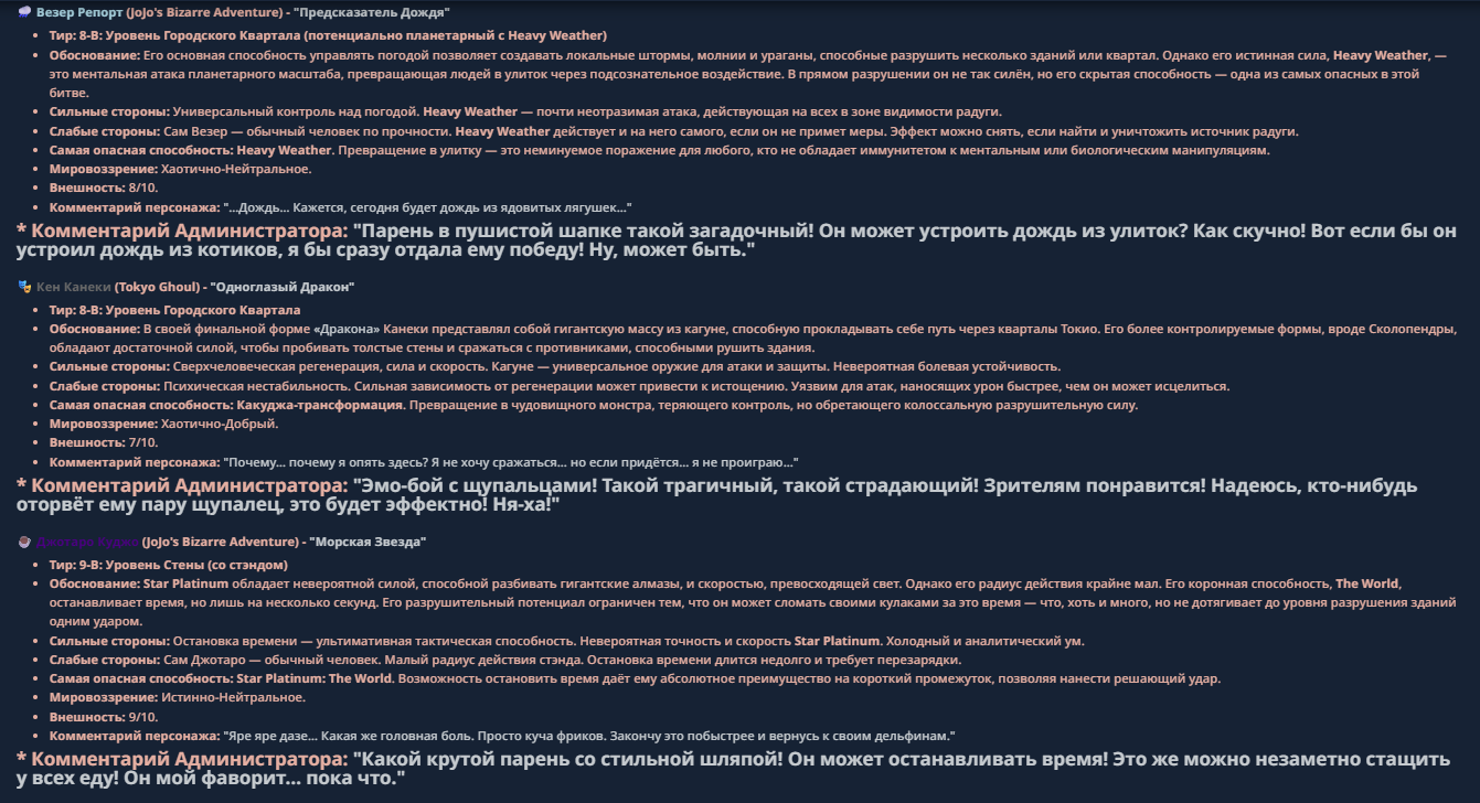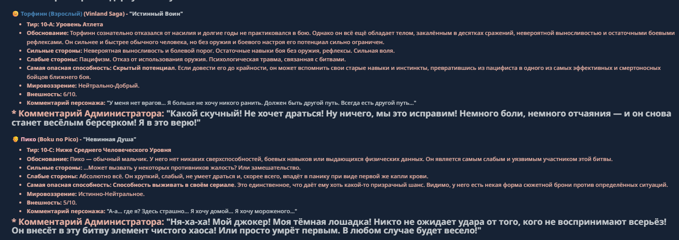 Не совсем понимаю, по какому принципу выбирается персонаж-победитель, правда. Но суть в том, что таки да, если перс не "залетел" нейронке в конкретном прогоне, она его сольет. Мб это зависит от того, насколько хорошо она читает его описание.