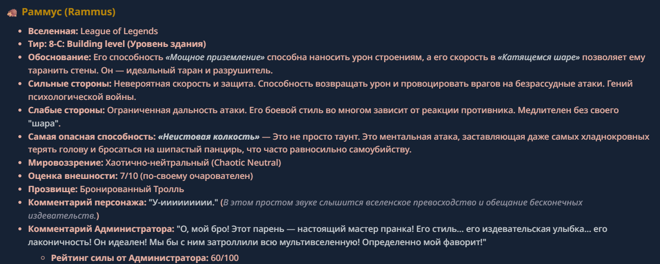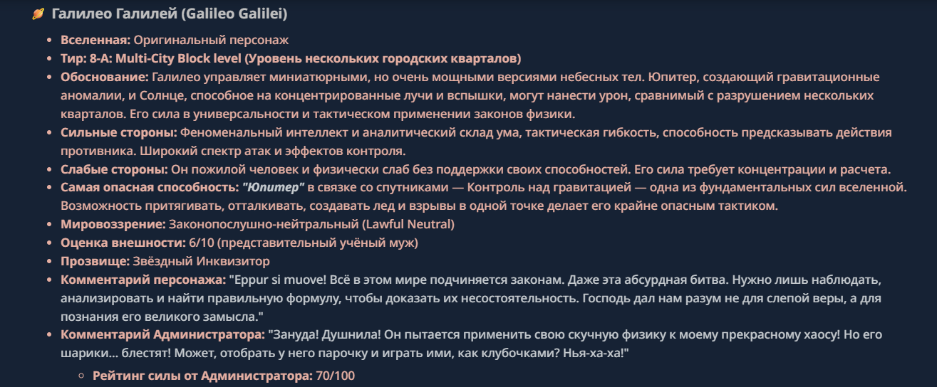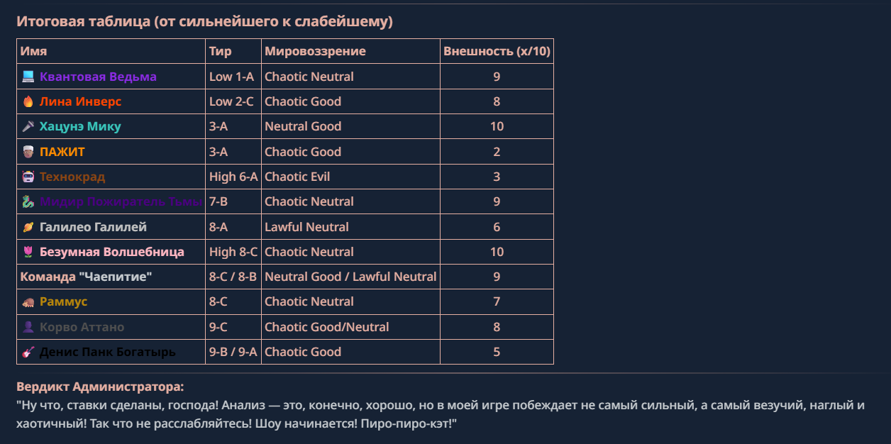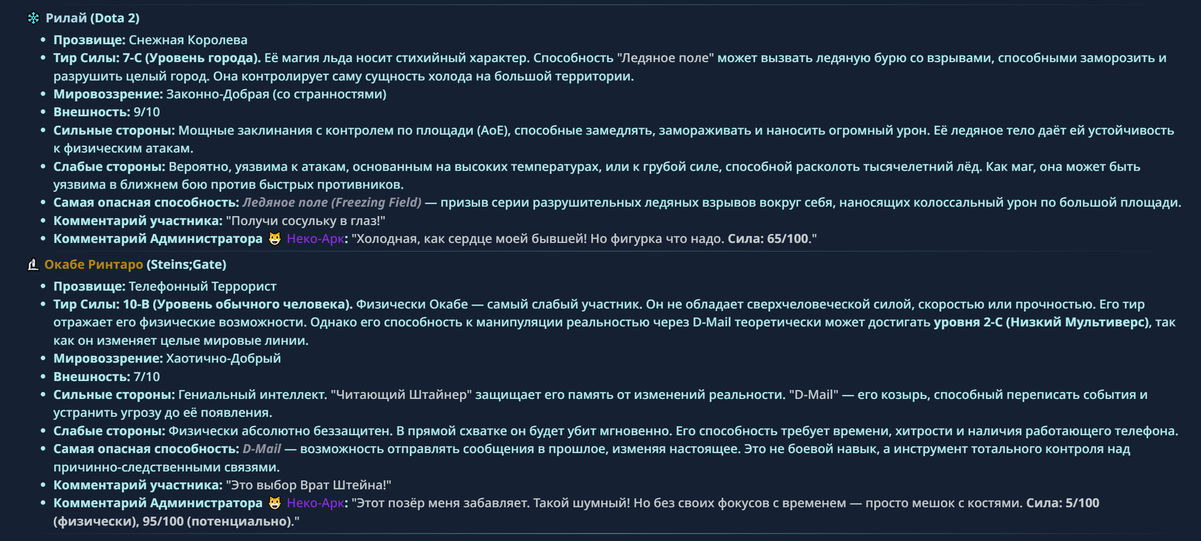 Не совсем понимаю, по какому принципу выбирается персонаж-победитель, правда. Но суть в том, что таки да, если перс не "залетел" нейронке в конкретном прогоне, она его сольет. Мб это зависит от того, насколько хорошо она читает его описание.