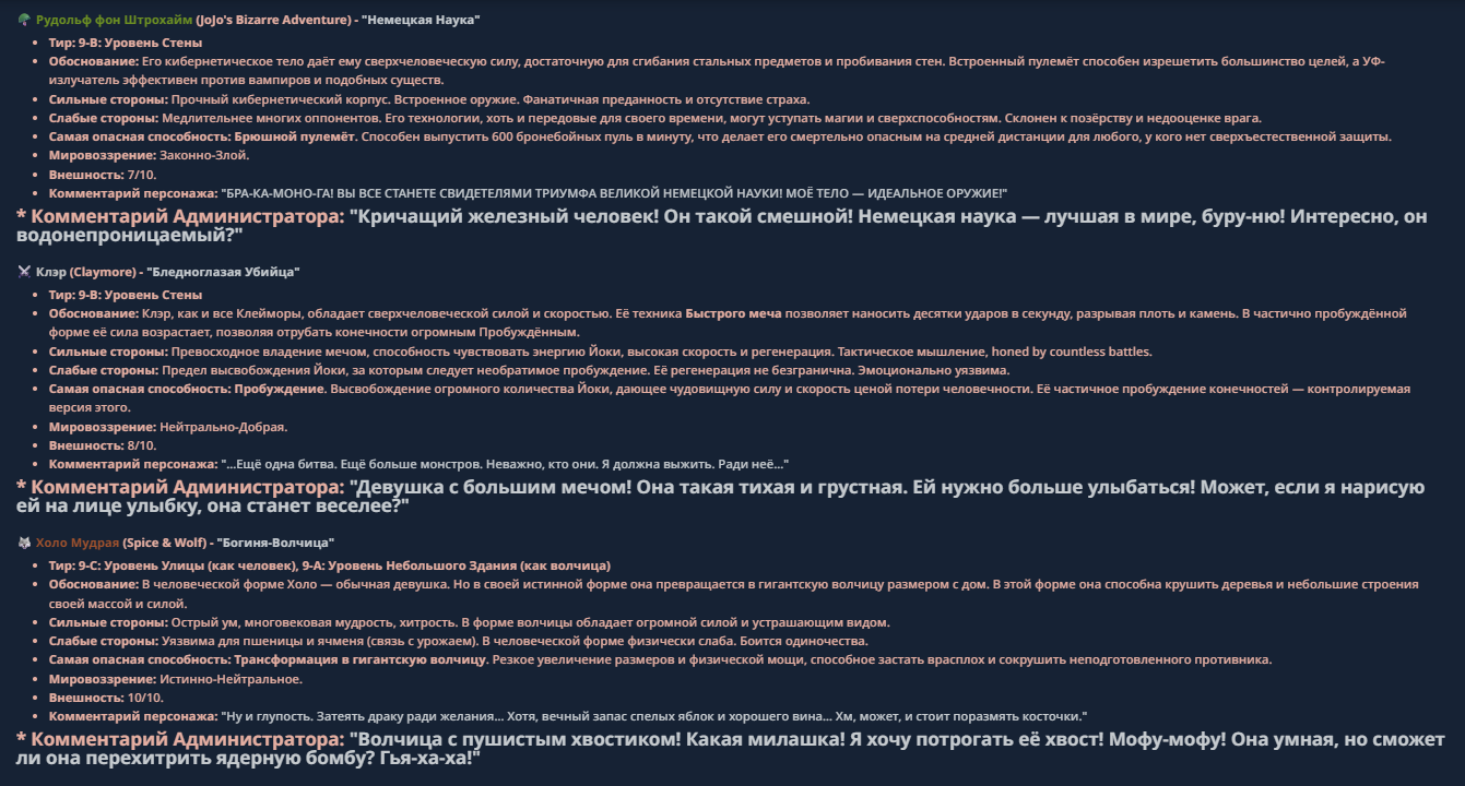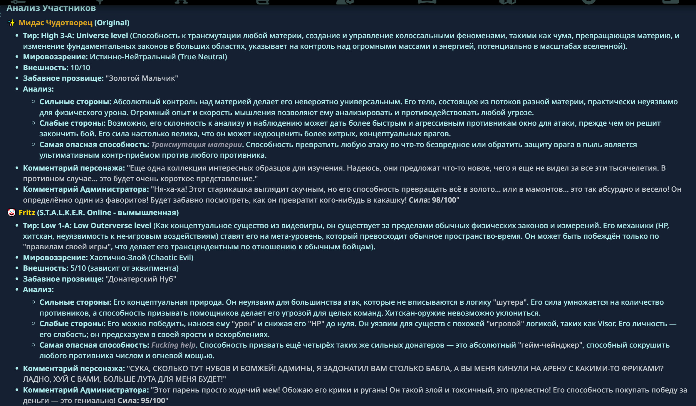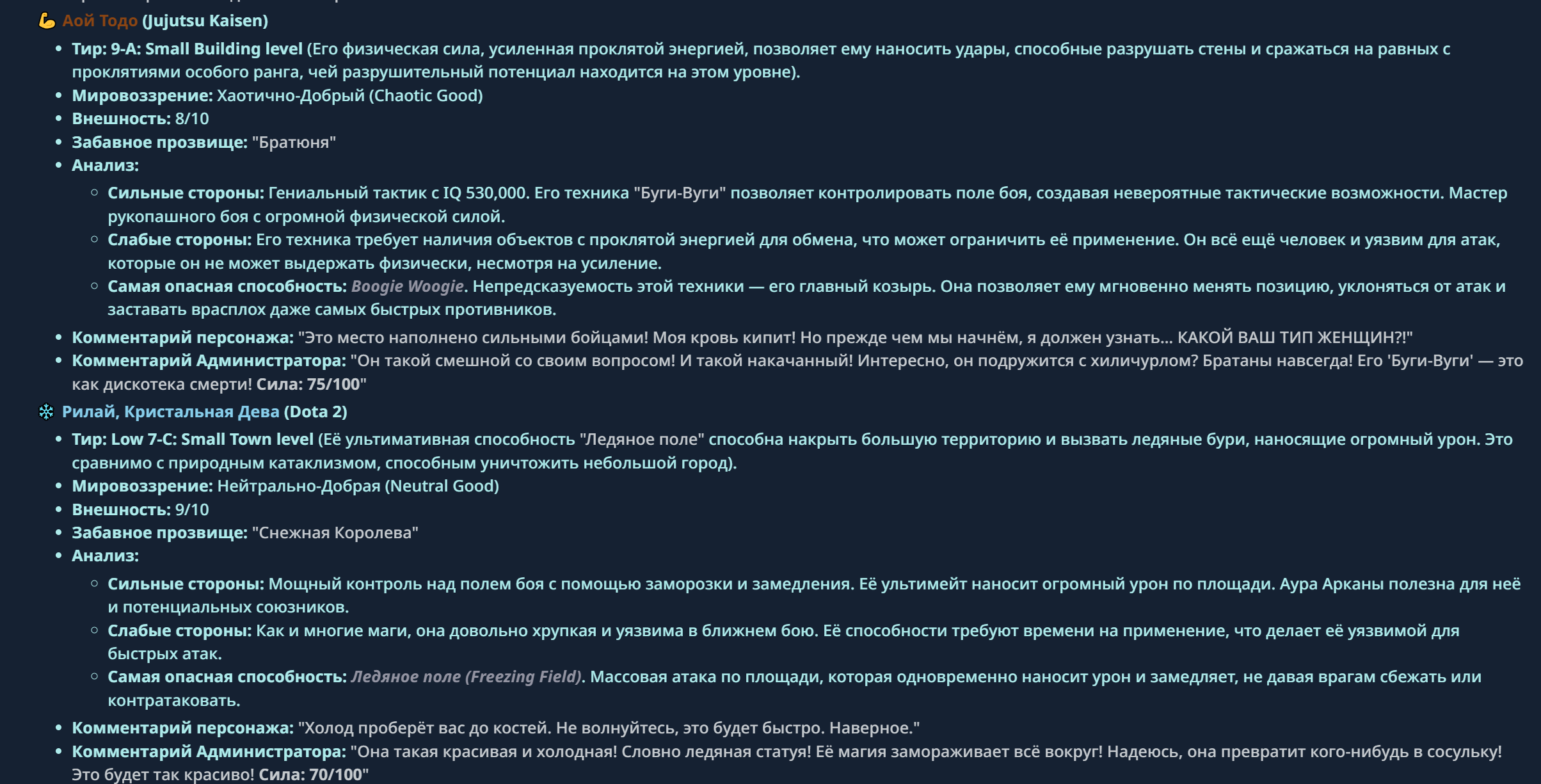 >>839246 Персонажи которые выглядят как герои получают неплохой буст к шансу на победу, злодеи наоборот. Монстры почти никогда победить не могут. Слабым персонажам нейронка подыгрывает, но только если ей не нравится более сильный персонаж (например если он злой). Персонажи у которых есть какой то сюжет или цель имеют больше шансов чем те, у которых его нет.