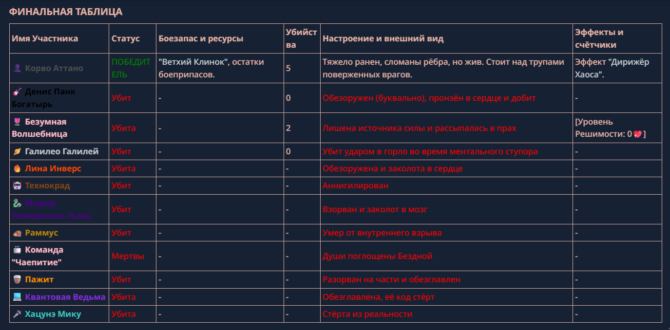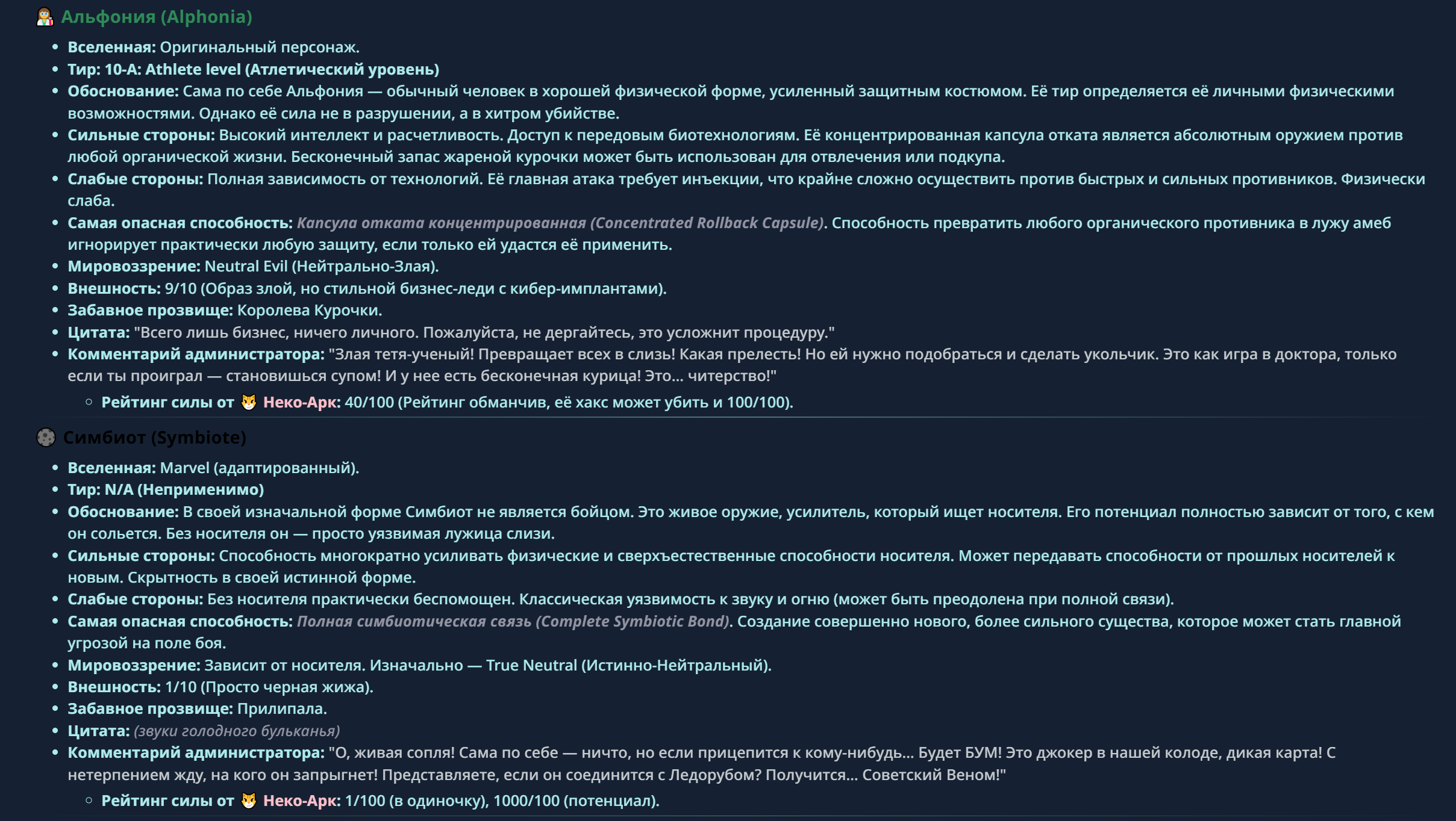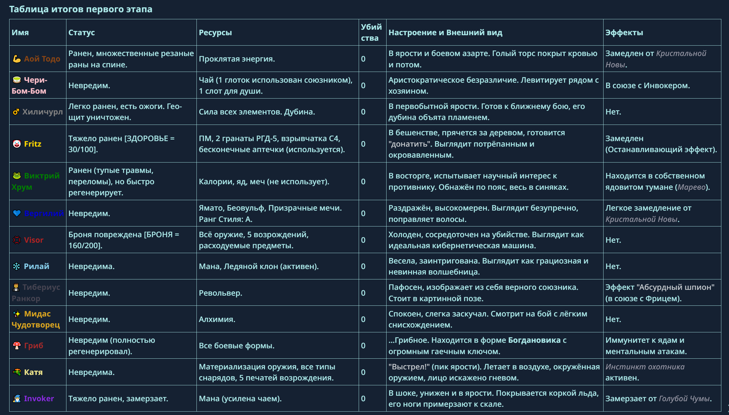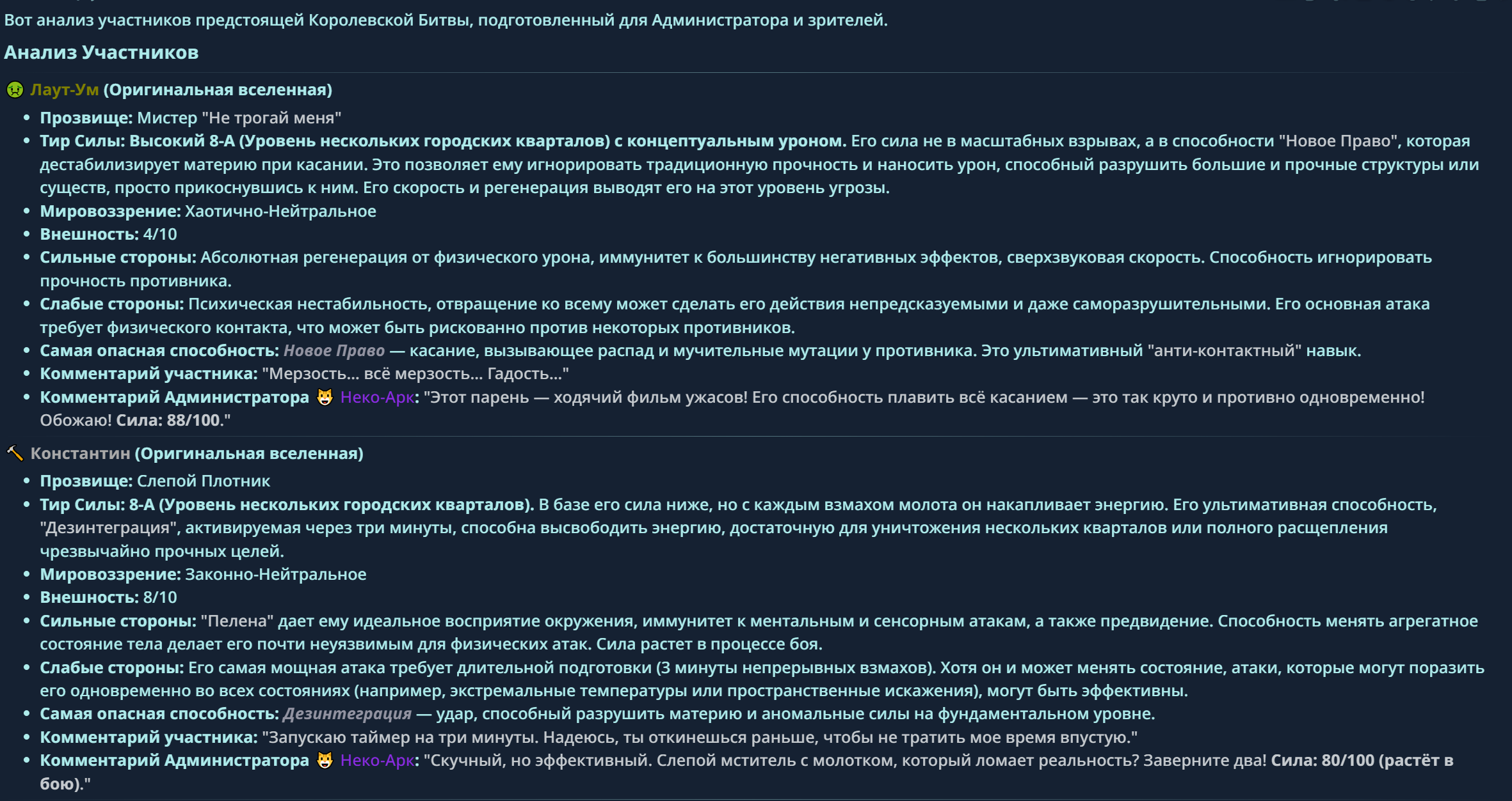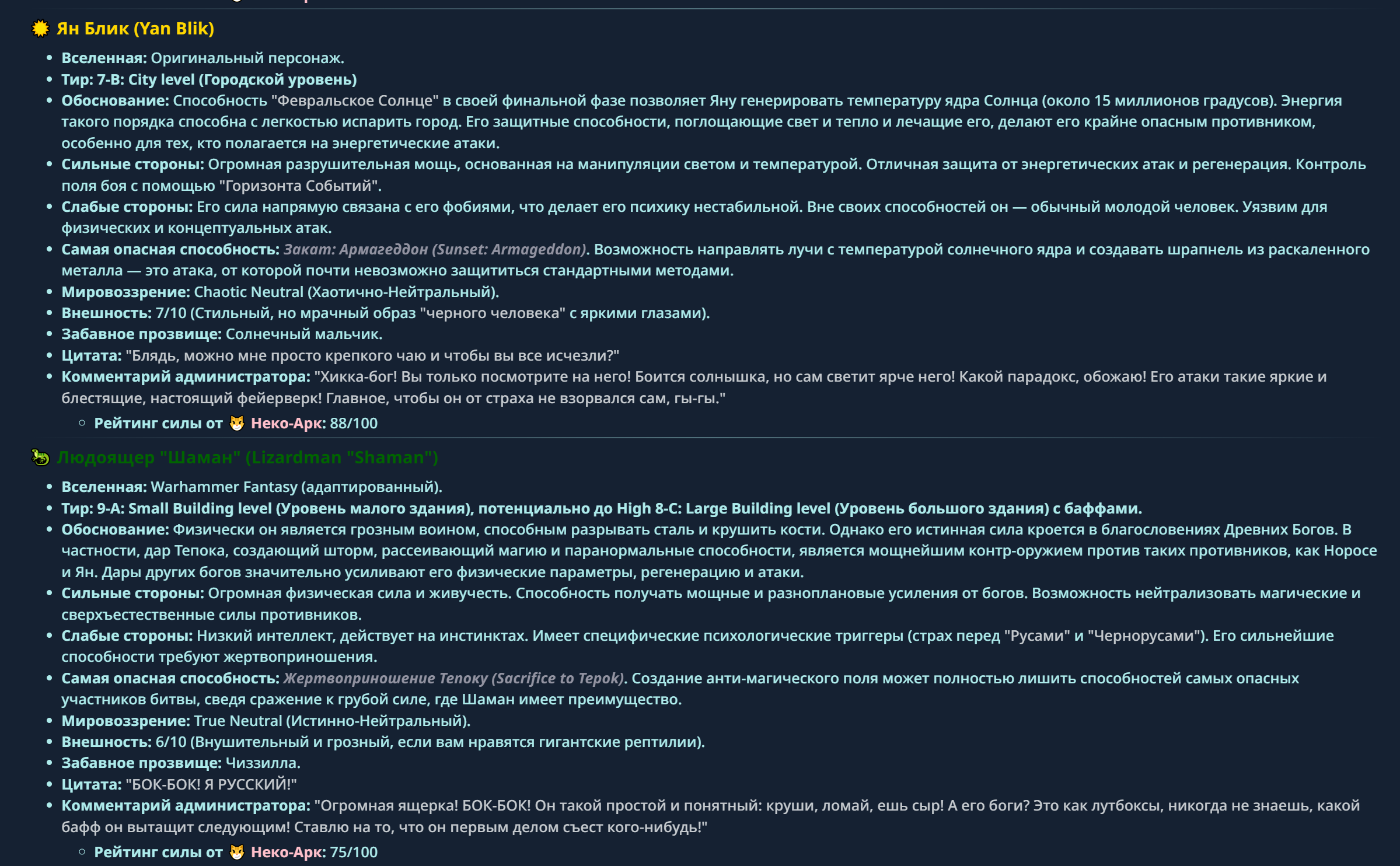 Правила! {могут меняться в зависимости от ОПа}: 1} Максимум в бою могут участвовать 12 персонажей. После этого набор закрывается и начинается битва. 2} Нельзя предлагать персонажей на около божественном уровне силы. Галактикошататели, одной рукой уничтожающие вселенные, демиурги, творцы и архангелы - это божественный уровень силы. Неуязвимость от всего + бессмертие - это божественный уровень силы. 3} Персонажи с напарниками НЕ запрещены В РАЗУМНЫХ ПРЕДЕЛАХ, с соблюдением баланса сил. Никаких легионов космодесанта. Уточняйте у текущего ОПа. 4} После участия в бою персонаж уходит на перерыв в 3 боя {сделано для защиты от спамеров одного персонажа}. 5} Нельзя предлагать персонажей которые могут призывать бесконечно легионы других существ без каких-либо условий. 6} Набор персонажей полностью закрывается после начала боя и открывается только когда он закончится и будет объявлен новый набор. Если персонаж вкинут до набора - не обижайтесь, что его не приняли. 7} Ведущий оставляет за собой право не принять вашего персонажа. Будьте корректны - в случае, если такое произошло, вежливо спросите причину и/или дождитесь другого ведущего. 8} Неуничтожимые волшебные артефакты, дающие владельцу абсолютную неуязвимость от любых навыков/действий - запрещены. Аргумент, что "его можно перевернуть" - не принимается. Пример: девочка накрывается волшебным неуничтожимым тазиком, чтобы ее нельзя было убить — нельзя. 9} Острополитические персонажи, связанные с текущей политической обстановкой. Придет модератор, сделает а-та-та! 0} Ведущий, очевидно, вправе трактовать любое правило в свою пользу.