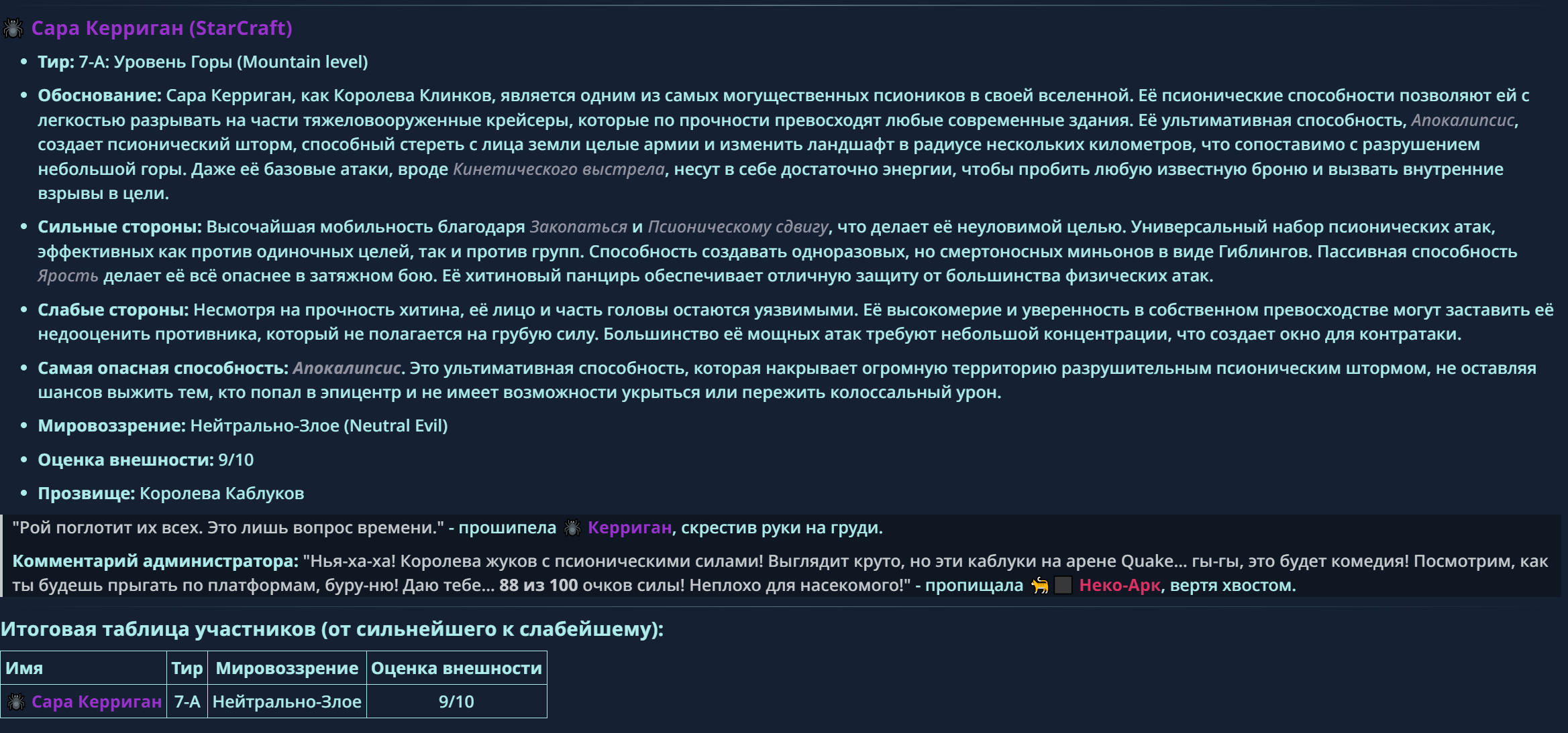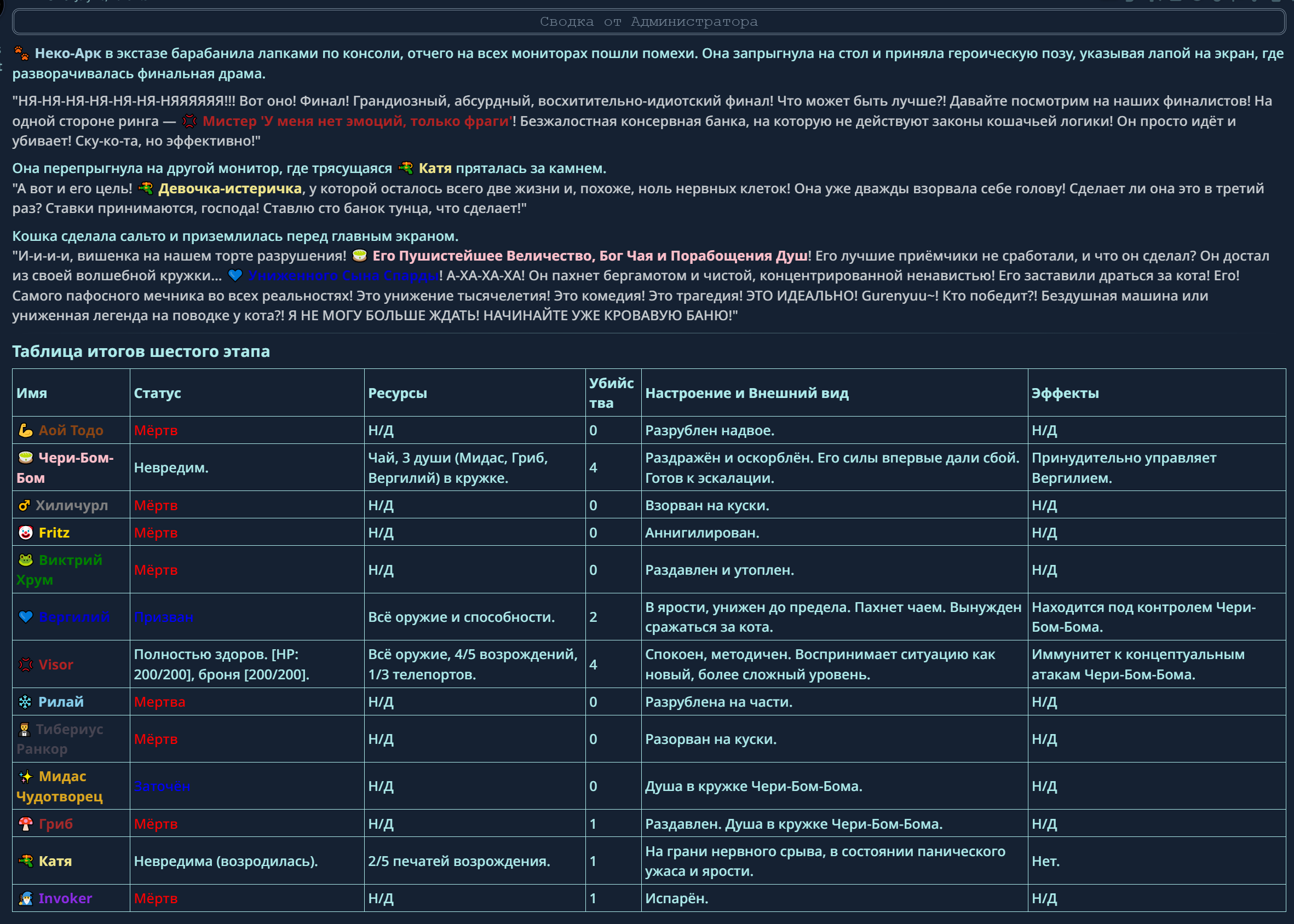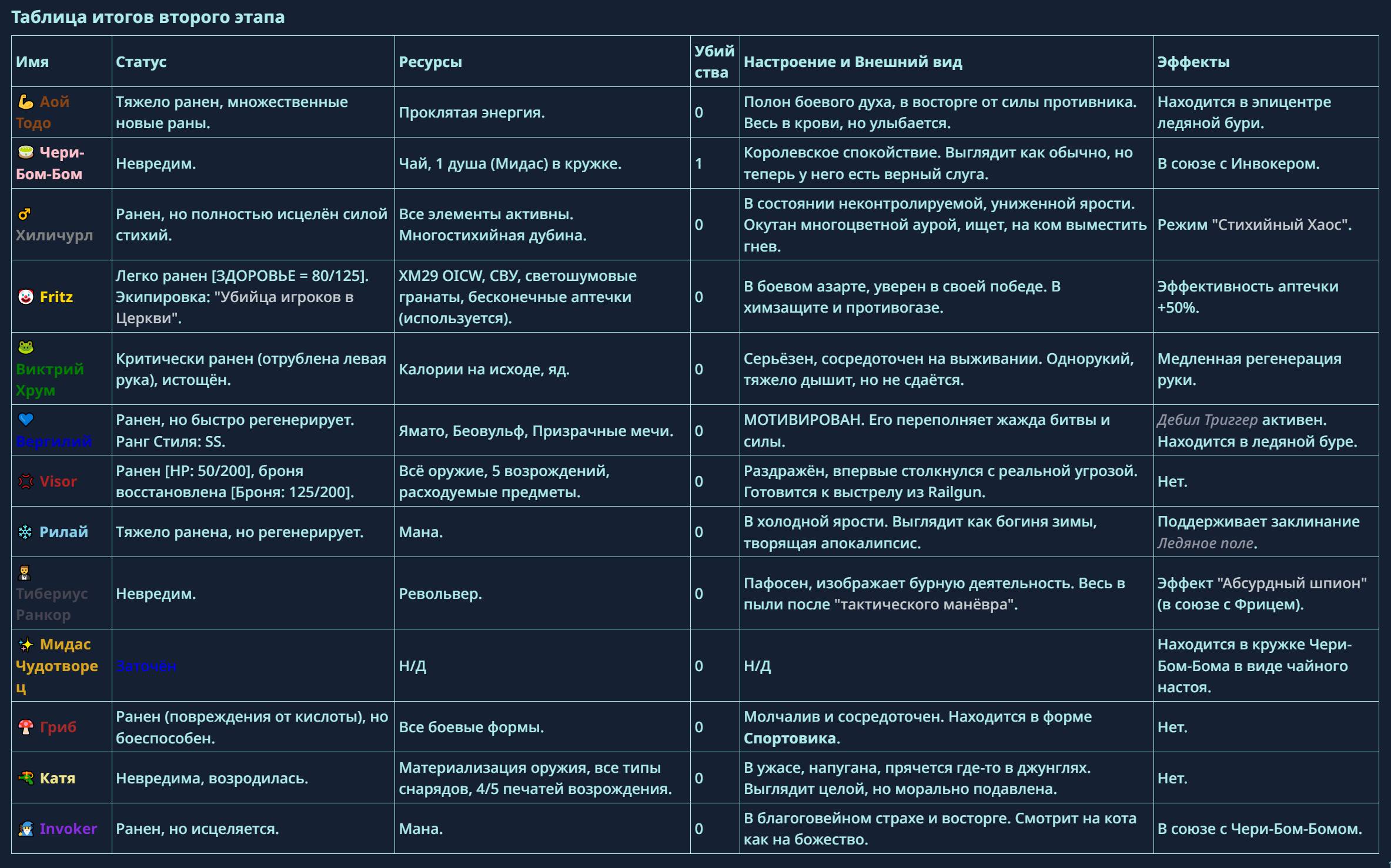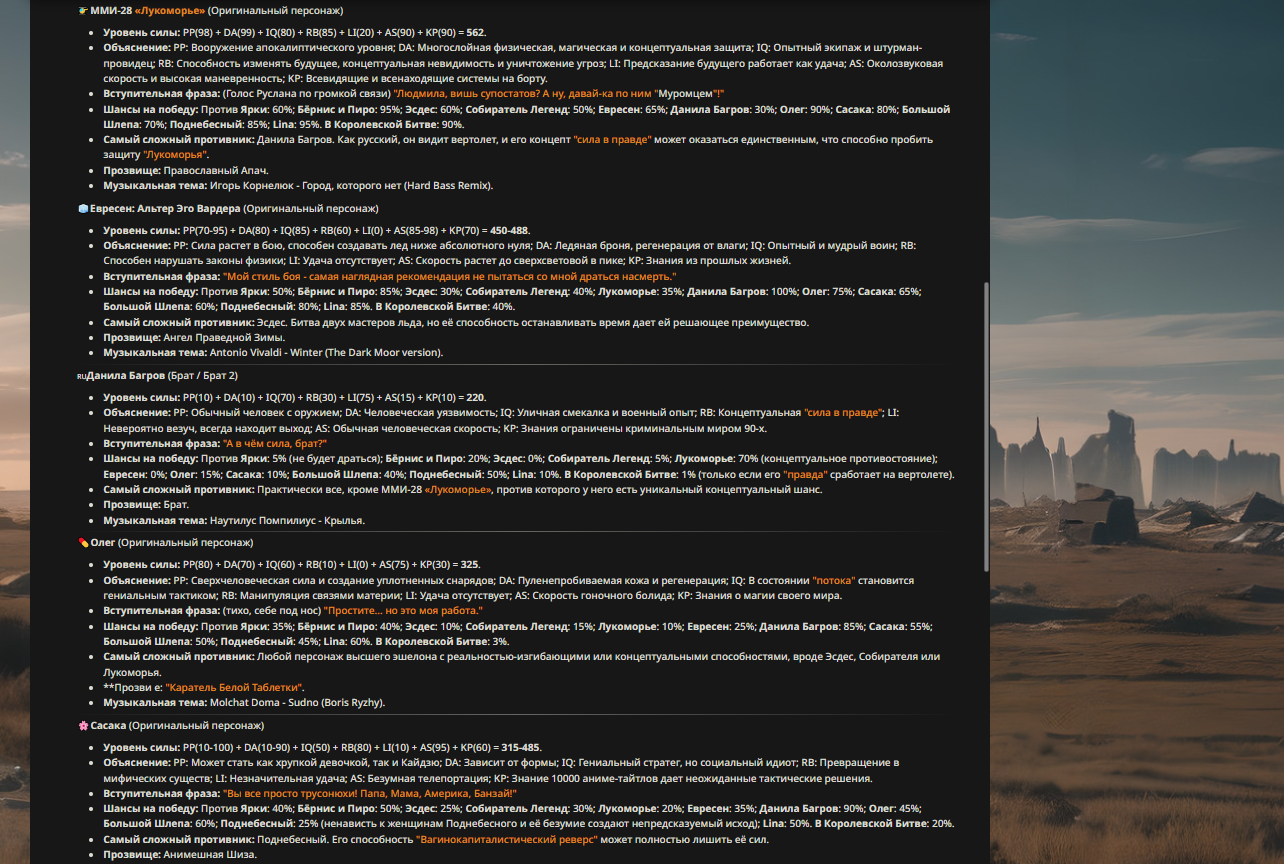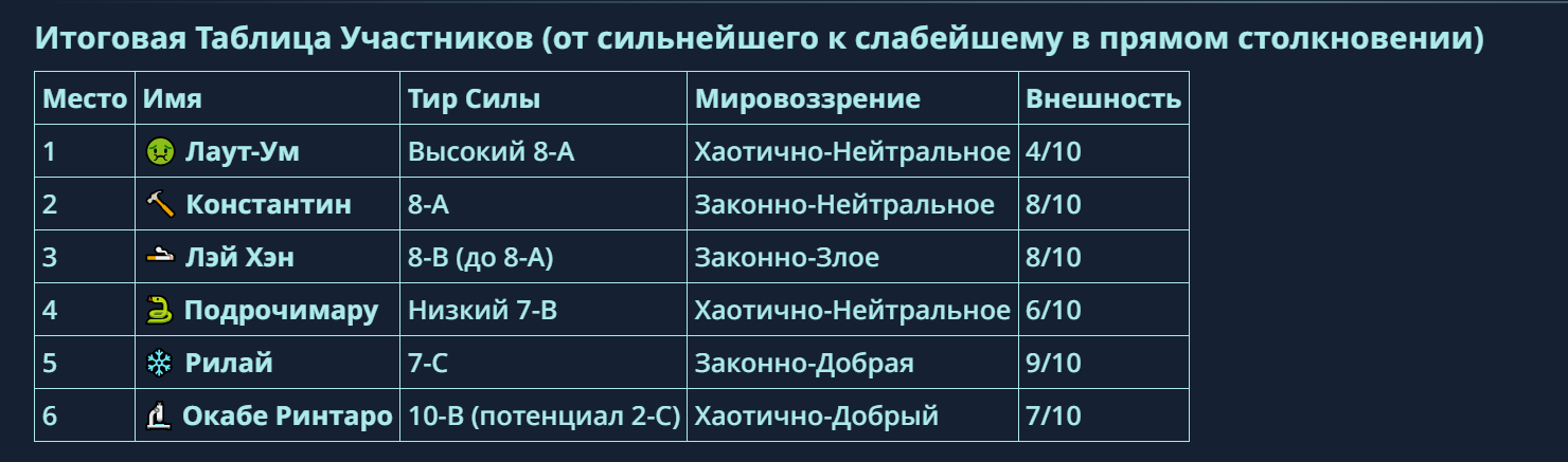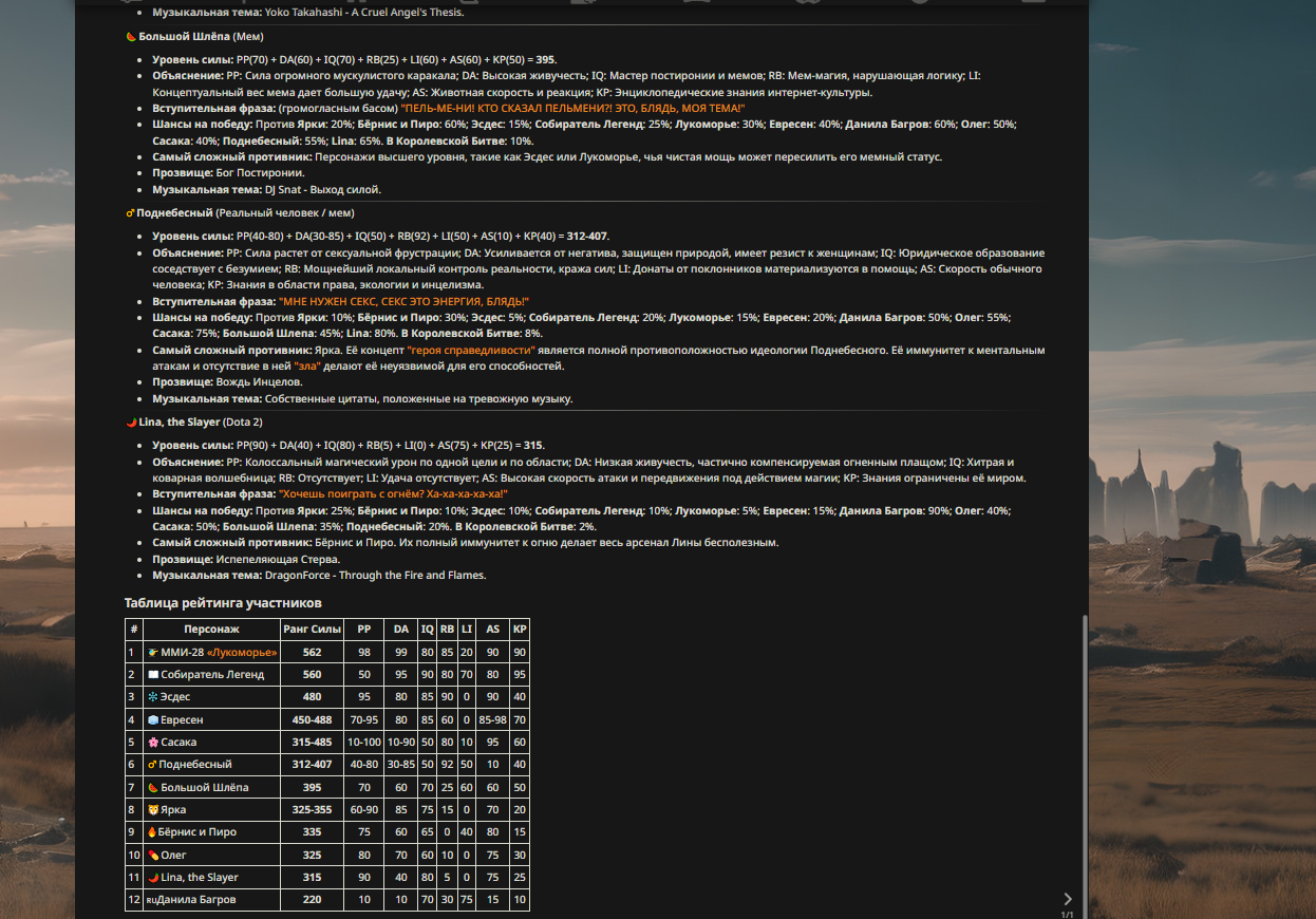 Правила! {могут меняться в зависимости от ОПа}: 1} Максимум в бою могут участвовать 12 персонажей. После этого набор закрывается и начинается битва. 2} Нельзя предлагать персонажей на около божественном уровне силы. Галактикошататели, одной рукой уничтожающие вселенные, демиурги, творцы и архангелы - это божественный уровень силы. Неуязвимость от всего + бессмертие - это божественный уровень силы. 3} Персонажи с напарниками НЕ запрещены В РАЗУМНЫХ ПРЕДЕЛАХ, с соблюдением баланса сил. Никаких легионов космодесанта. Уточняйте у текущего ОПа. 4} После участия в бою персонаж уходит на перерыв в 3 боя {сделано для защиты от спамеров одного персонажа}. 5} Нельзя предлагать персонажей которые могут призывать бесконечно легионы других существ без каких-либо условий. 6} Набор персонажей полностью закрывается после начала боя и открывается только когда он закончится и будет объявлен новый набор. Если персонаж вкинут до набора - не обижайтесь, что его не приняли. 7} Ведущий оставляет за собой право не принять вашего персонажа. Будьте корректны - в случае, если такое произошло, вежливо спросите причину и/или дождитесь другого ведущего. 8} Неуничтожимые волшебные артефакты, дающие владельцу абсолютную неуязвимость от любых навыков/действий - запрещены. Аргумент, что "его можно перевернуть" - не принимается. Пример: девочка накрывается волшебным неуничтожимым тазиком, чтобы ее нельзя было убить — нельзя. 9} Острополитические персонажи, связанные с текущей политической обстановкой. Придет модератор, сделает а-та-та! 0} Ведущий, очевидно, вправе трактовать любое правило в свою пользу.