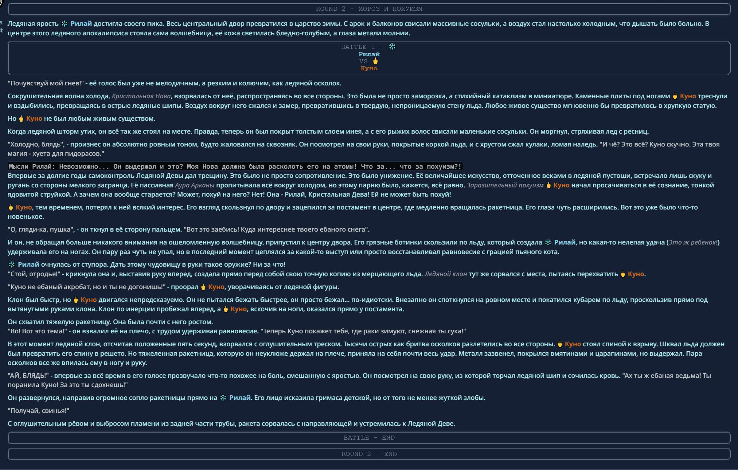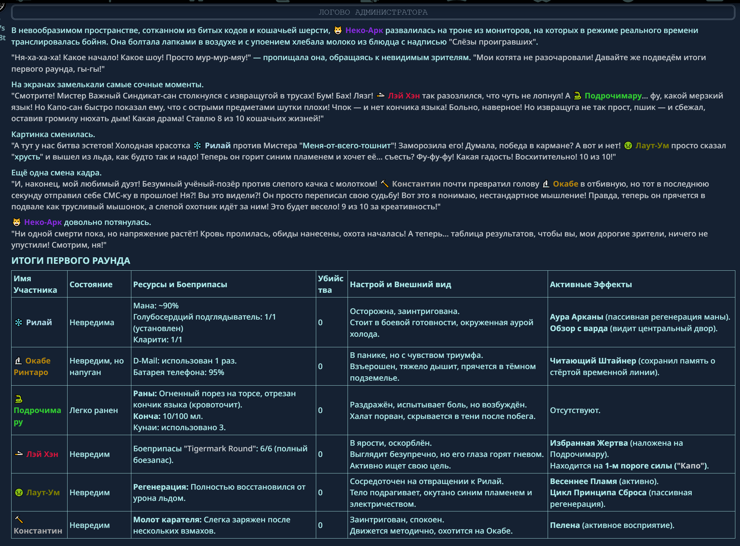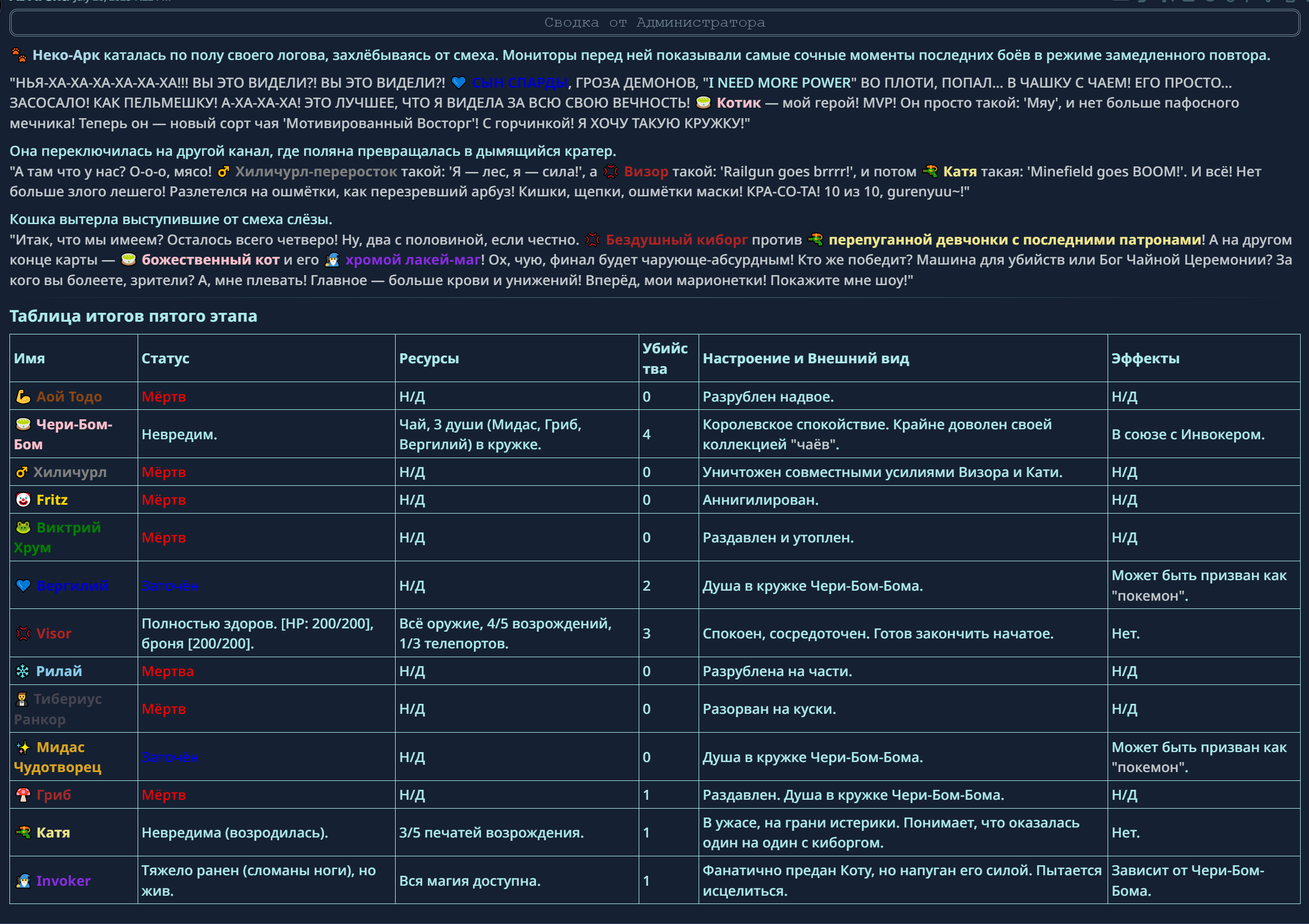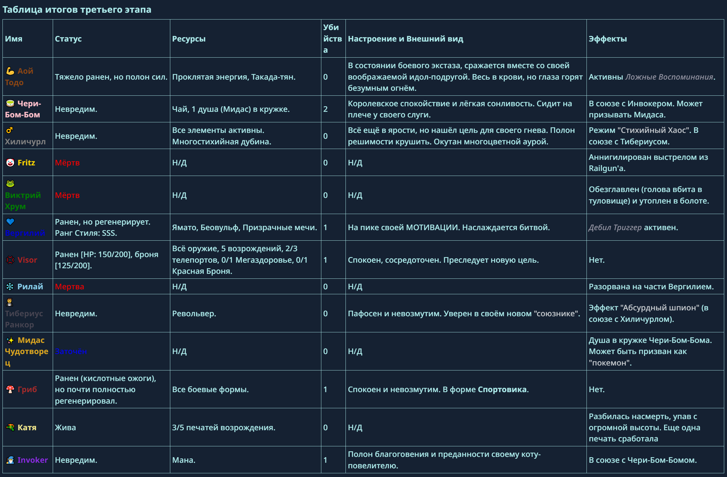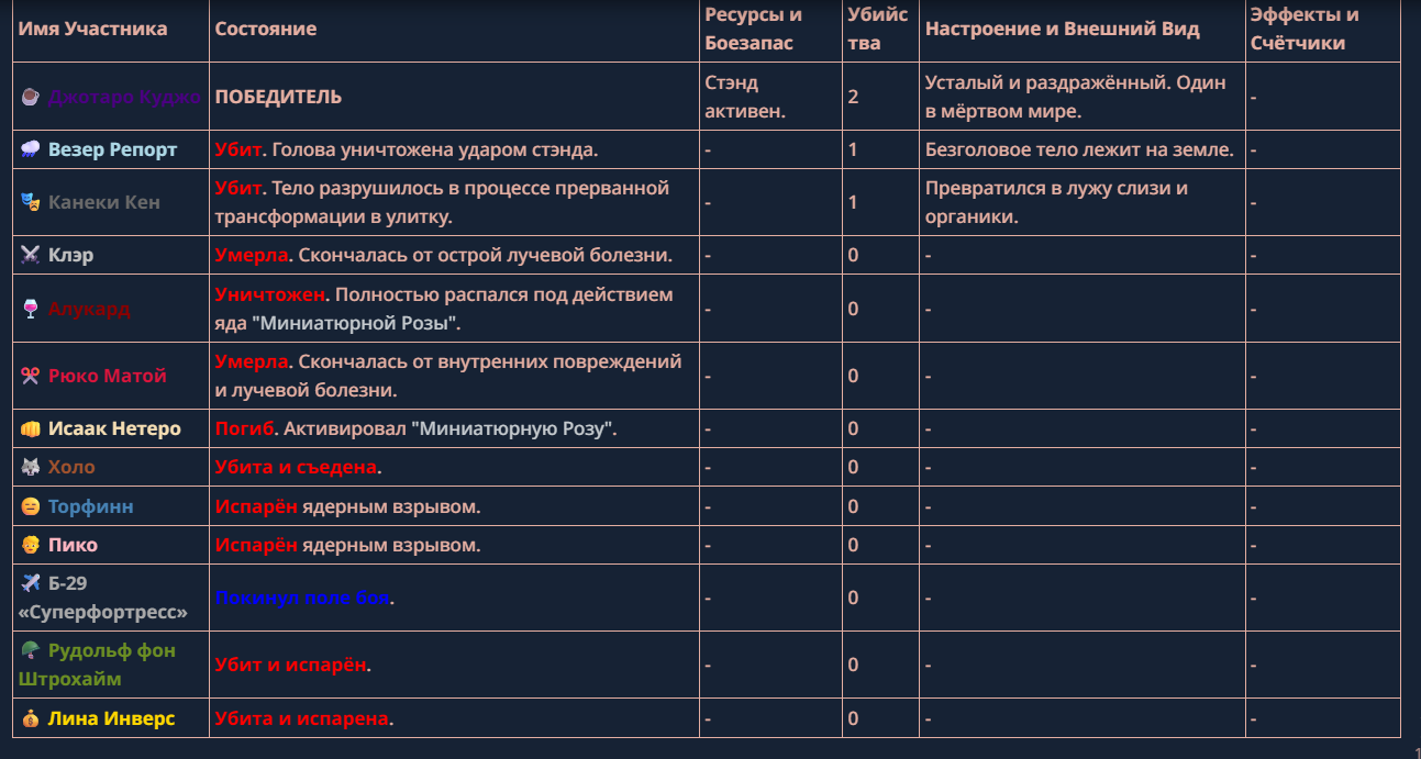 Правила! {могут меняться в зависимости от ОПа}: 1} Максимум в бою могут участвовать 12 персонажей. После этого набор закрывается и начинается битва. 2} Нельзя предлагать персонажей на около божественном уровне силы. Галактикошататели, одной рукой уничтожающие вселенные, демиурги, творцы и архангелы - это божественный уровень силы. Неуязвимость от всего + бессмертие - это божественный уровень силы. 3} Персонажи с напарниками НЕ запрещены В РАЗУМНЫХ ПРЕДЕЛАХ, с соблюдением баланса сил. Никаких легионов космодесанта. Уточняйте у текущего ОПа. 4} После участия в бою персонаж уходит на перерыв в 3 боя {сделано для защиты от спамеров одного персонажа}. 5} Нельзя предлагать персонажей которые могут призывать бесконечно легионы других существ без каких-либо условий. 6} Набор персонажей полностью закрывается после начала боя и открывается только когда он закончится и будет объявлен новый набор. Если персонаж вкинут до набора - не обижайтесь, что его не приняли. 7} Ведущий оставляет за собой право не принять вашего персонажа. Будьте корректны - в случае, если такое произошло, вежливо спросите причину и/или дождитесь другого ведущего. 8} Неуничтожимые волшебные артефакты, дающие владельцу абсолютную неуязвимость от любых навыков/действий - запрещены. Аргумент, что "его можно перевернуть" - не принимается. Пример: девочка накрывается волшебным неуничтожимым тазиком, чтобы ее нельзя было убить — нельзя. 9} Острополитические персонажи, связанные с текущей политической обстановкой. Придет модератор, сделает а-та-та! 0} Ведущий, очевидно, вправе трактовать любое правило в свою пользу.