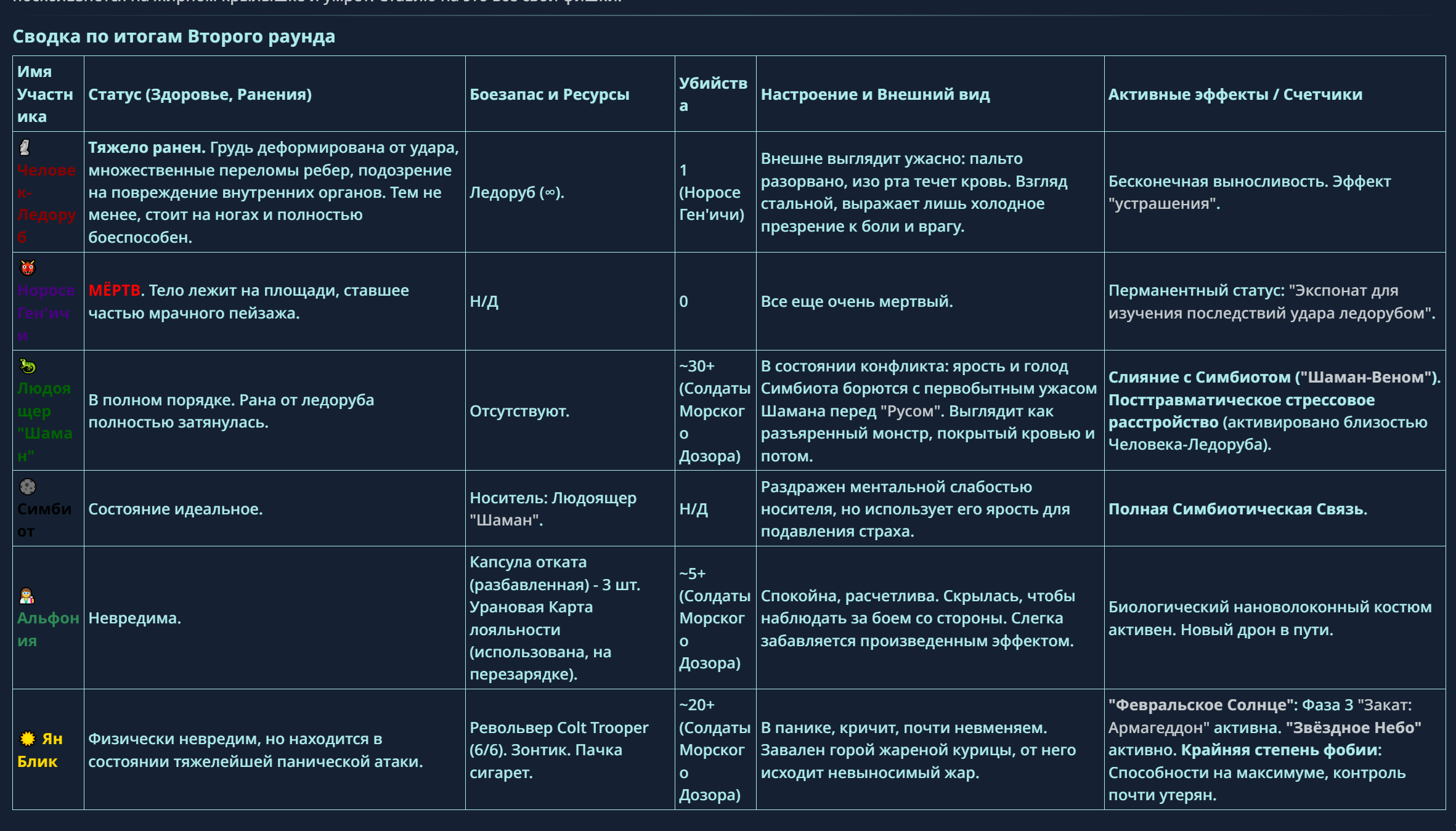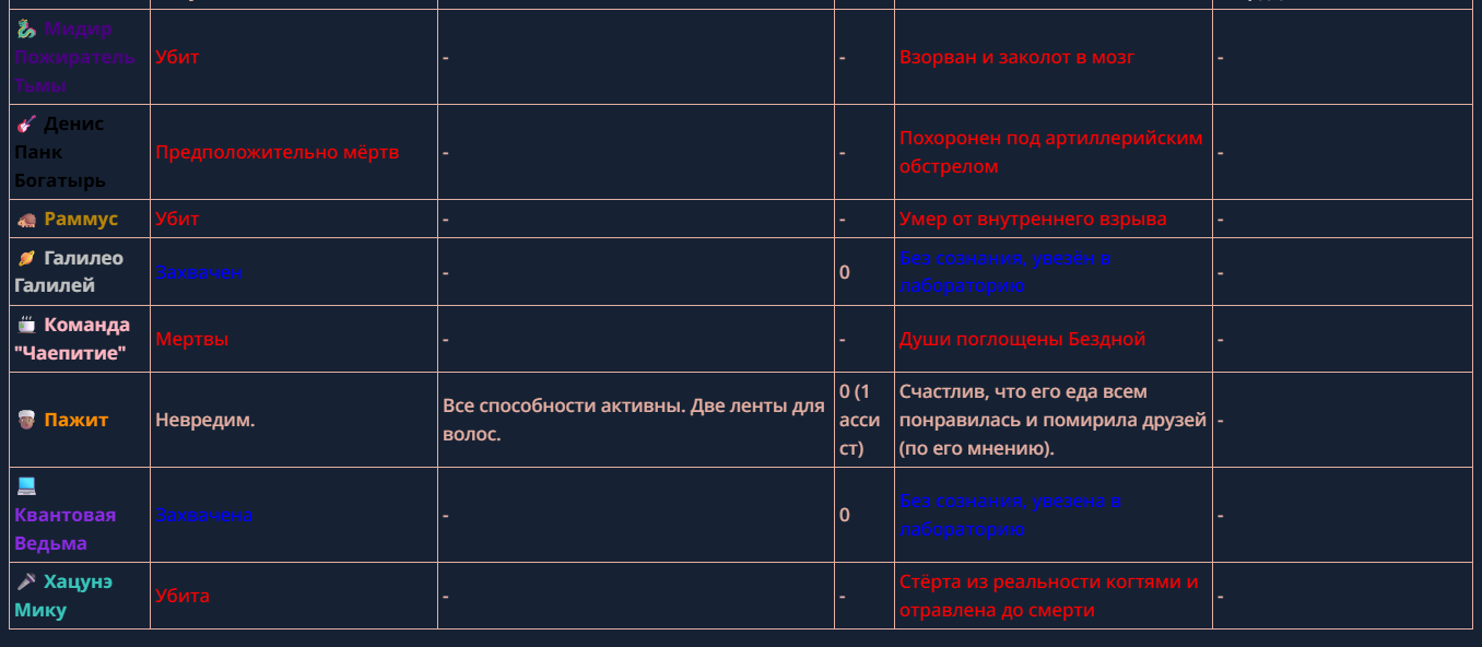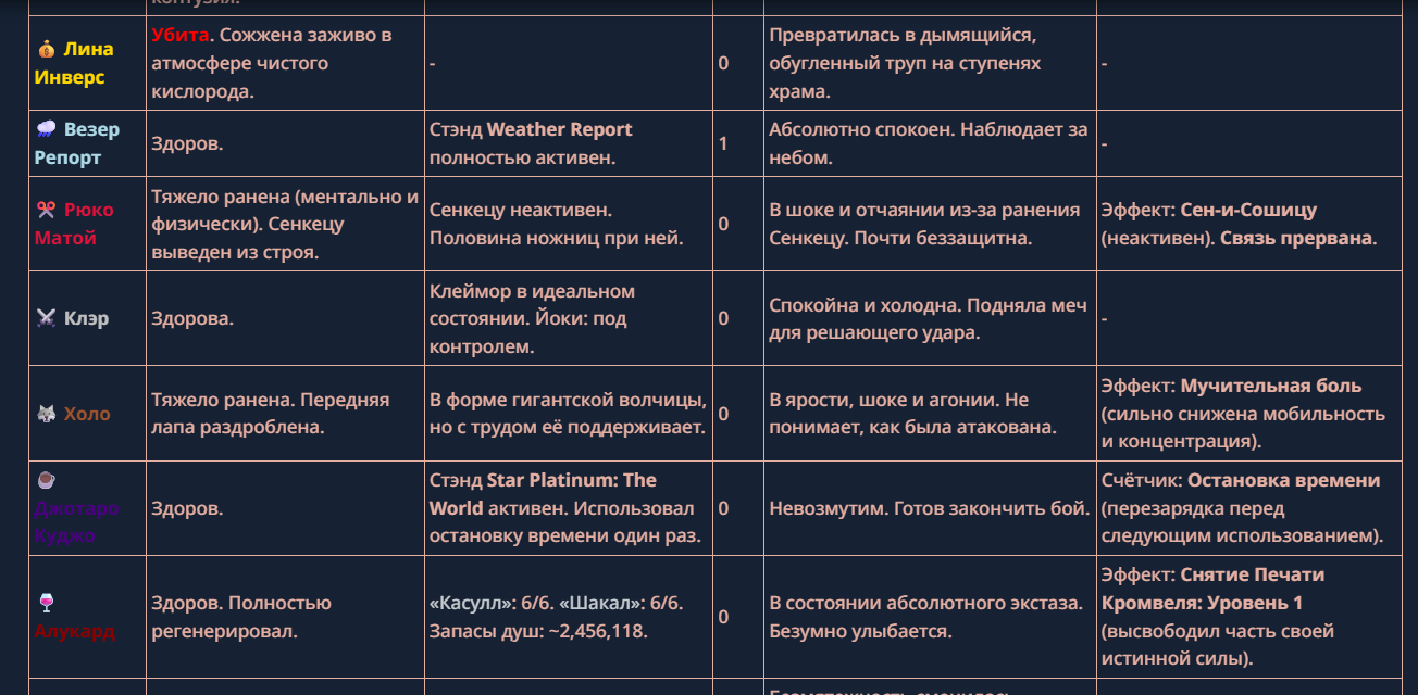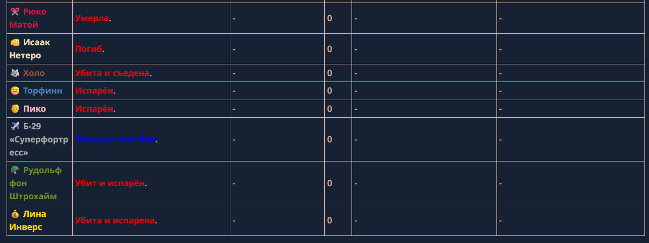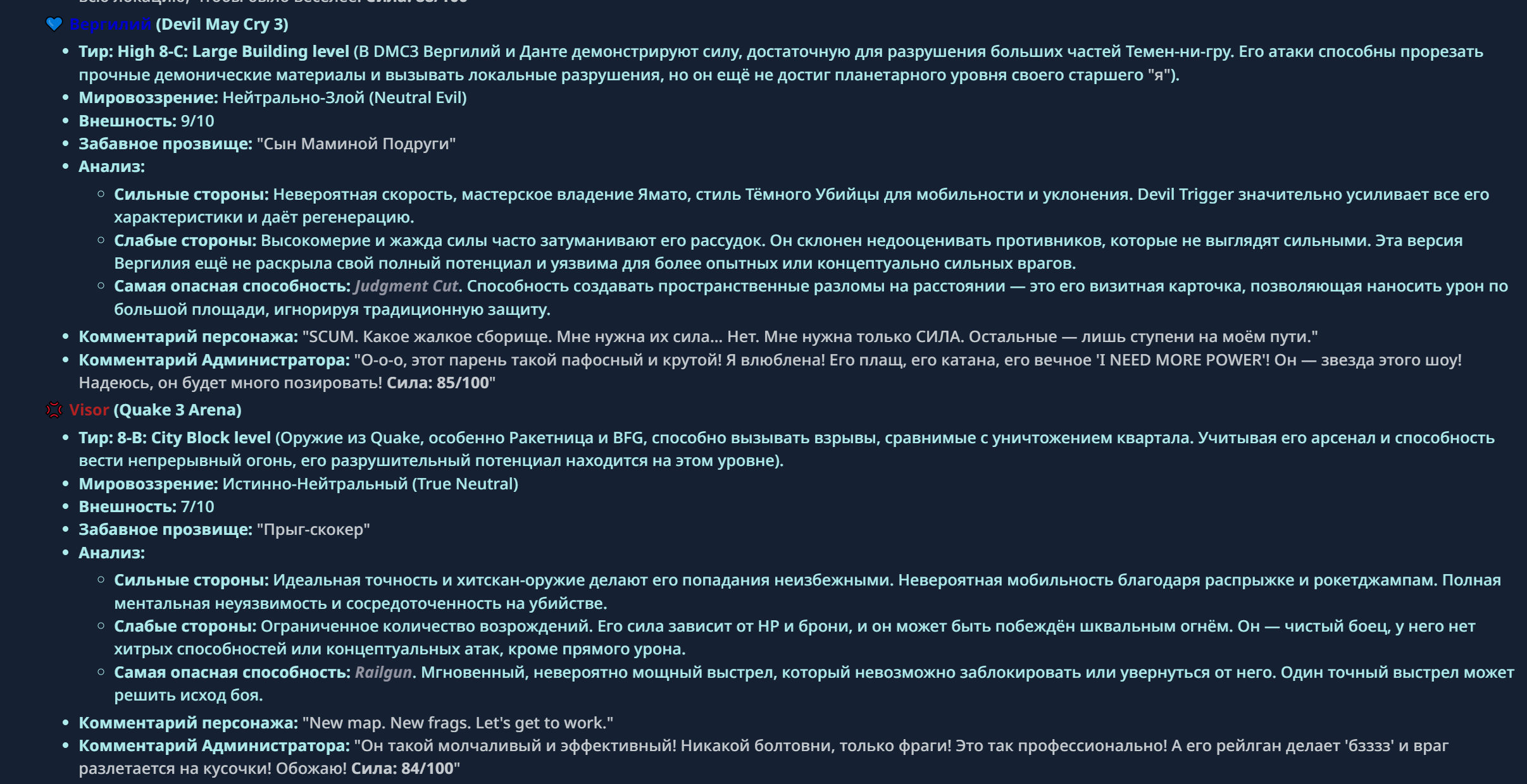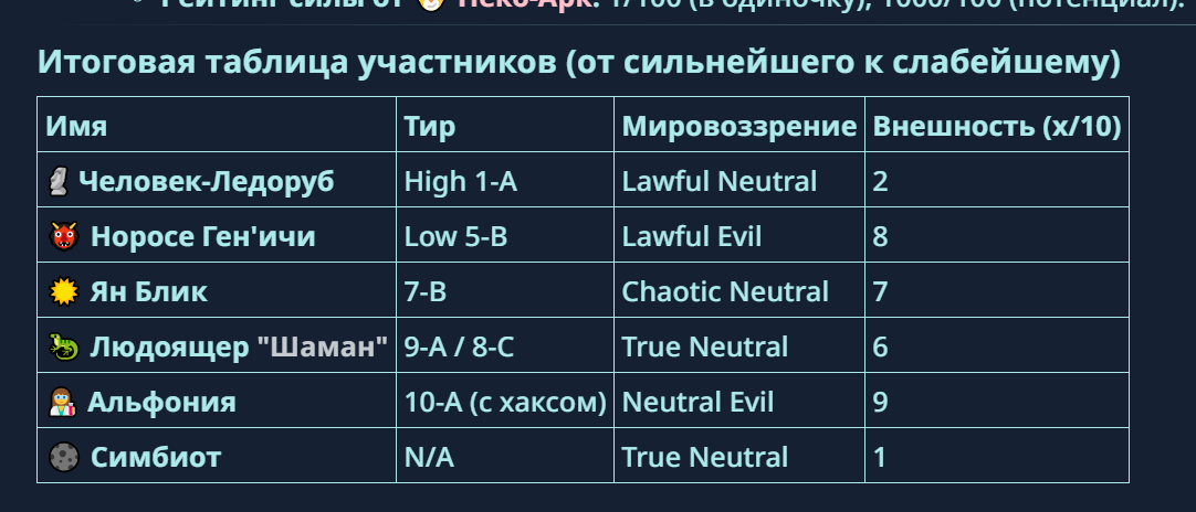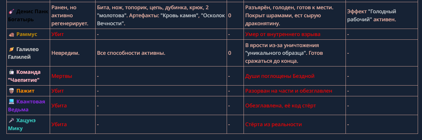Правила! {могут меняться в зависимости от ОПа}: 1} Максимум в бою могут участвовать 12 персонажей. После этого набор закрывается и начинается битва. 2} Нельзя предлагать персонажей на около божественном уровне силы. Галактикошататели, одной рукой уничтожающие вселенные, демиурги, творцы и архангелы - это божественный уровень силы. Неуязвимость от всего + бессмертие - это божественный уровень силы. 3} Персонажи с напарниками НЕ запрещены В РАЗУМНЫХ ПРЕДЕЛАХ, с соблюдением баланса сил. Никаких легионов космодесанта. Уточняйте у текущего ОПа. 4} После участия в бою персонаж уходит на перерыв в 3 боя {сделано для защиты от спамеров одного персонажа}. 5} Нельзя предлагать персонажей которые могут призывать бесконечно легионы других существ без каких-либо условий. 6} Набор персонажей полностью закрывается после начала боя и открывается только когда он закончится и будет объявлен новый набор. Если персонаж вкинут до набора - не обижайтесь, что его не приняли. 7} Ведущий оставляет за собой право не принять вашего персонажа. Будьте корректны - в случае, если такое произошло, вежливо спросите причину и/или дождитесь другого ведущего. 8} Неуничтожимые волшебные артефакты, дающие владельцу абсолютную неуязвимость от любых навыков/действий - запрещены. Аргумент, что "его можно перевернуть" - не принимается. Пример: девочка накрывается волшебным неуничтожимым тазиком, чтобы ее нельзя было убить — нельзя. 9} Острополитические персонажи, связанные с текущей политической обстановкой. Придет модератор, сделает а-та-та! 0} Ведущий, очевидно, вправе трактовать любое правило в свою пользу.