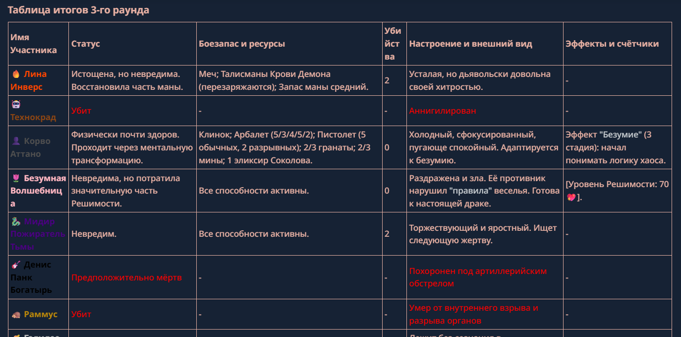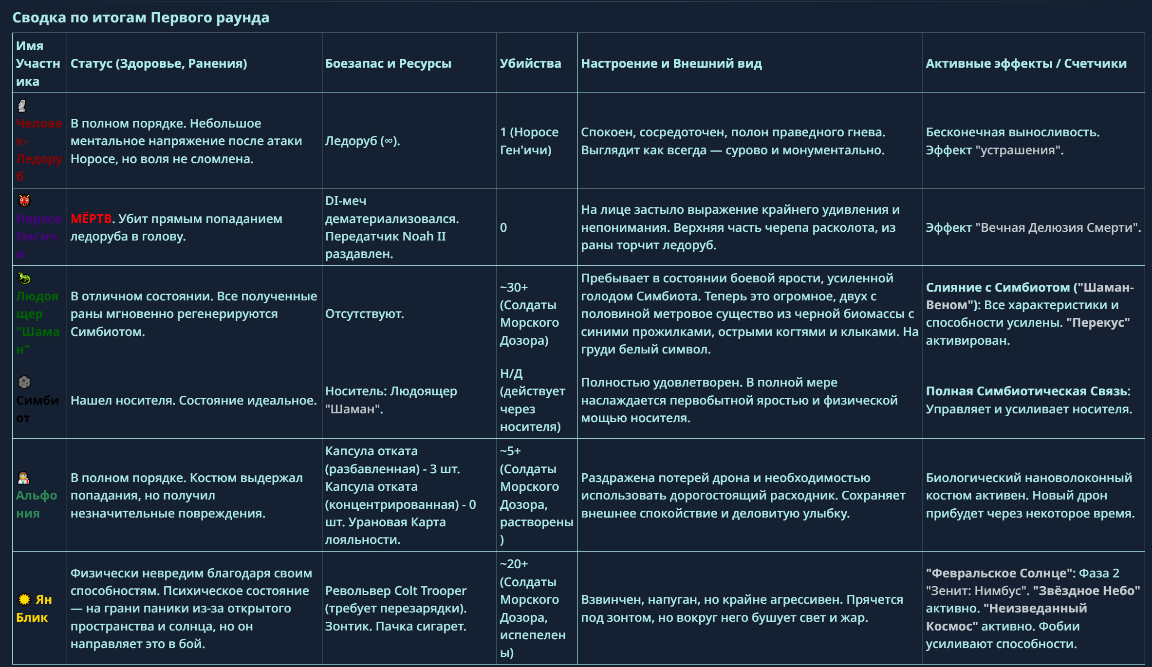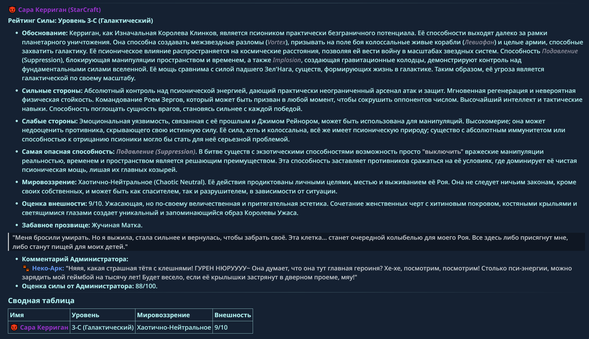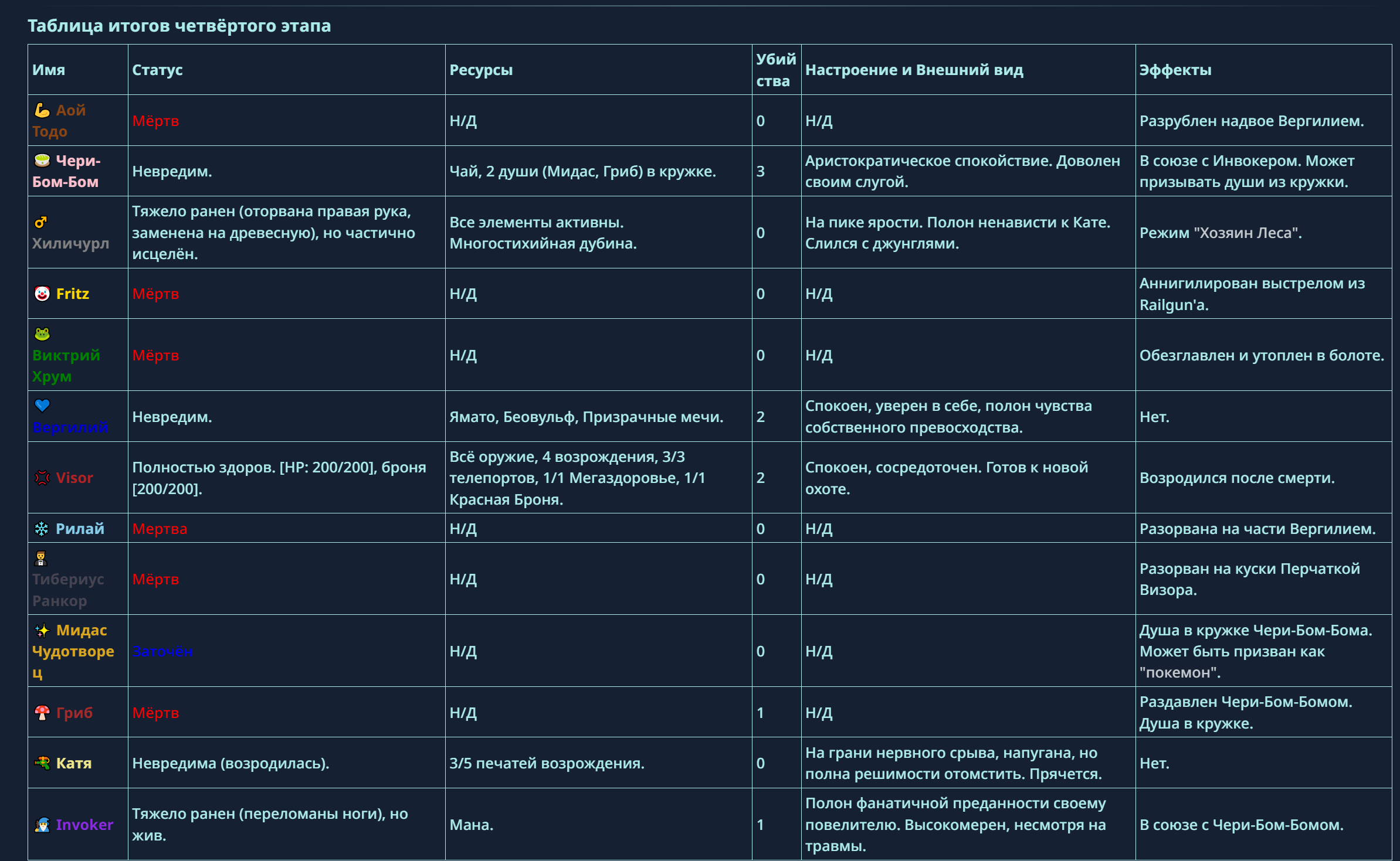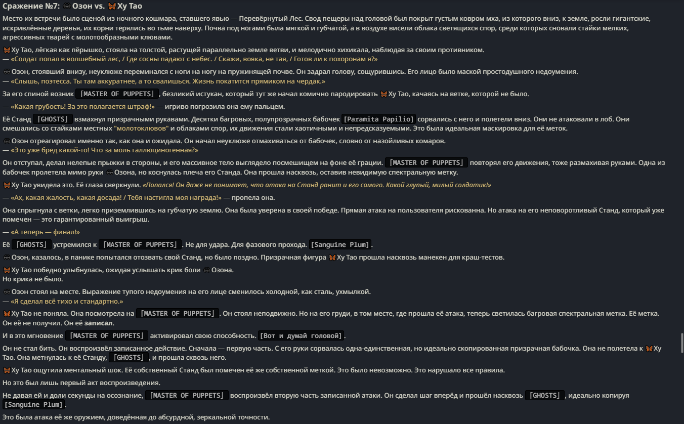 Правила! {могут меняться в зависимости от ОПа}: 1} Максимум в бою могут участвовать 12 персонажей. После этого набор закрывается и начинается битва. 2} Нельзя предлагать персонажей на около божественном уровне силы. Галактикошататели, одной рукой уничтожающие вселенные, демиурги, творцы и архангелы - это божественный уровень силы. Неуязвимость от всего + бессмертие - это божественный уровень силы. 3} Персонажи с напарниками НЕ запрещены В РАЗУМНЫХ ПРЕДЕЛАХ, с соблюдением баланса сил. Никаких легионов космодесанта. Уточняйте у текущего ОПа. 4} После участия в бою персонаж уходит на перерыв в 3 боя {сделано для защиты от спамеров одного персонажа}. 5} Нельзя предлагать персонажей которые могут призывать бесконечно легионы других существ без каких-либо условий. 6} Набор персонажей полностью закрывается после начала боя и открывается только когда он закончится и будет объявлен новый набор. Если персонаж вкинут до набора - не обижайтесь, что его не приняли. 7} Ведущий оставляет за собой право не принять вашего персонажа. Будьте корректны - в случае, если такое произошло, вежливо спросите причину и/или дождитесь другого ведущего. 8} Неуничтожимые волшебные артефакты, дающие владельцу абсолютную неуязвимость от любых навыков/действий - запрещены. Аргумент, что "его можно перевернуть" - не принимается. Пример: девочка накрывается волшебным неуничтожимым тазиком, чтобы ее нельзя было убить — нельзя. 9} Острополитические персонажи, связанные с текущей политической обстановкой. Придет модератор, сделает а-та-та! 0} Ведущий, очевидно, вправе трактовать любое правило в свою пользу.