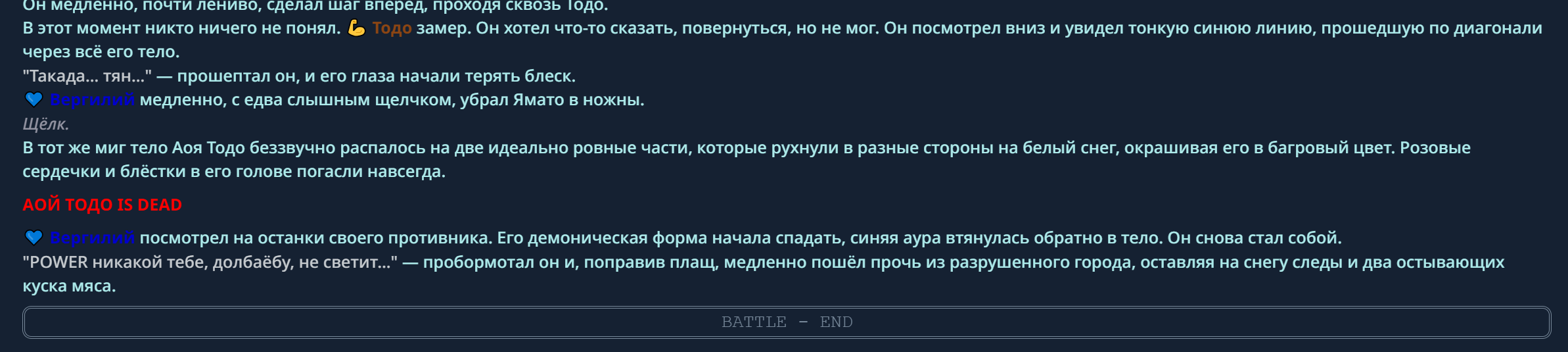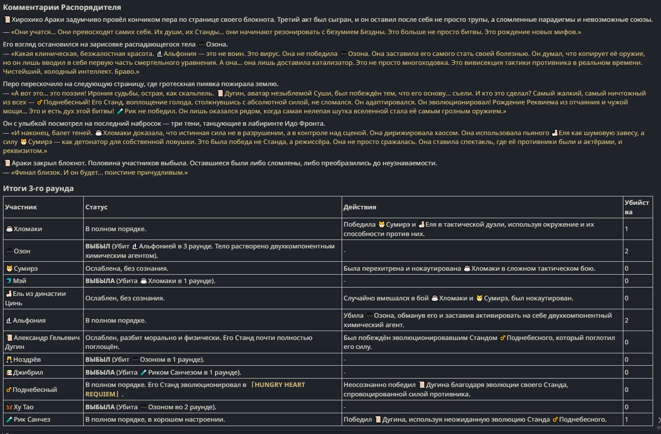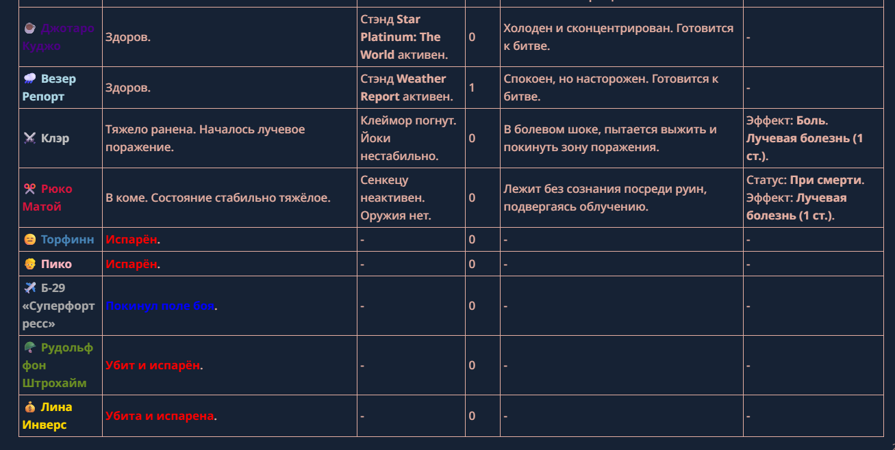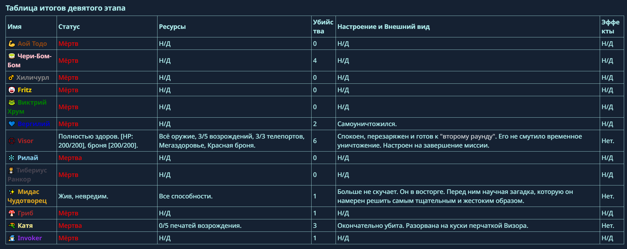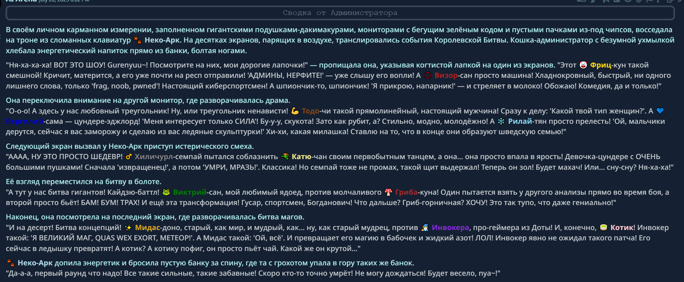 Правила! {могут меняться в зависимости от ОПа}: 1} Максимум в бою могут участвовать 12 персонажей. После этого набор закрывается и начинается битва. 2} Нельзя предлагать персонажей на около божественном уровне силы. Галактикошататели, одной рукой уничтожающие вселенные, демиурги, творцы и архангелы - это божественный уровень силы. Неуязвимость от всего + бессмертие - это божественный уровень силы. 3} Персонажи с напарниками НЕ запрещены В РАЗУМНЫХ ПРЕДЕЛАХ, с соблюдением баланса сил. Никаких легионов космодесанта. Уточняйте у текущего ОПа. 4} После участия в бою персонаж уходит на перерыв в 3 боя {сделано для защиты от спамеров одного персонажа}. 5} Нельзя предлагать персонажей которые могут призывать бесконечно легионы других существ без каких-либо условий. 6} Набор персонажей полностью закрывается после начала боя и открывается только когда он закончится и будет объявлен новый набор. Если персонаж вкинут до набора - не обижайтесь, что его не приняли. 7} Ведущий оставляет за собой право не принять вашего персонажа. Будьте корректны - в случае, если такое произошло, вежливо спросите причину и/или дождитесь другого ведущего. 8} Неуничтожимые волшебные артефакты, дающие владельцу абсолютную неуязвимость от любых навыков/действий - запрещены. Аргумент, что "его можно перевернуть" - не принимается. Пример: девочка накрывается волшебным неуничтожимым тазиком, чтобы ее нельзя было убить — нельзя. 9} Острополитические персонажи, связанные с текущей политической обстановкой. Придет модератор, сделает а-та-та! 0} Ведущий, очевидно, вправе трактовать любое правило в свою пользу.
