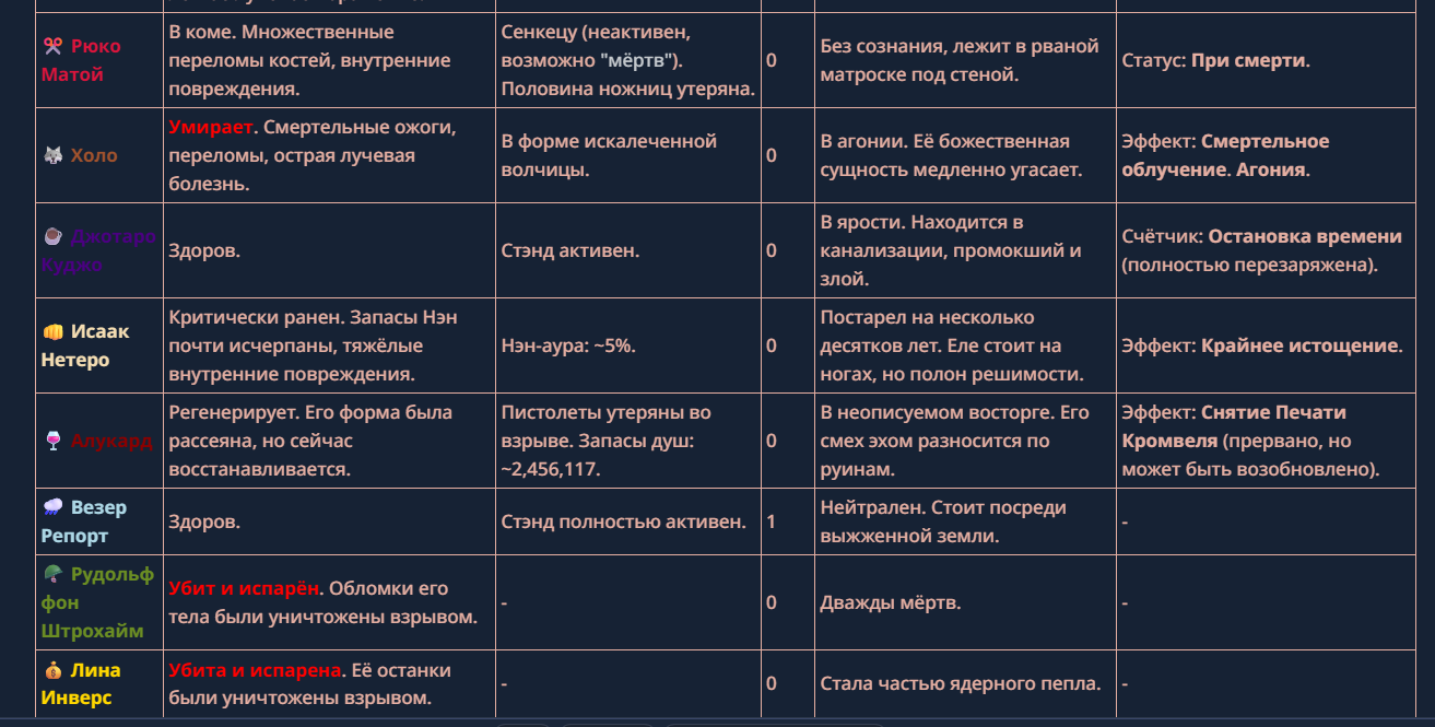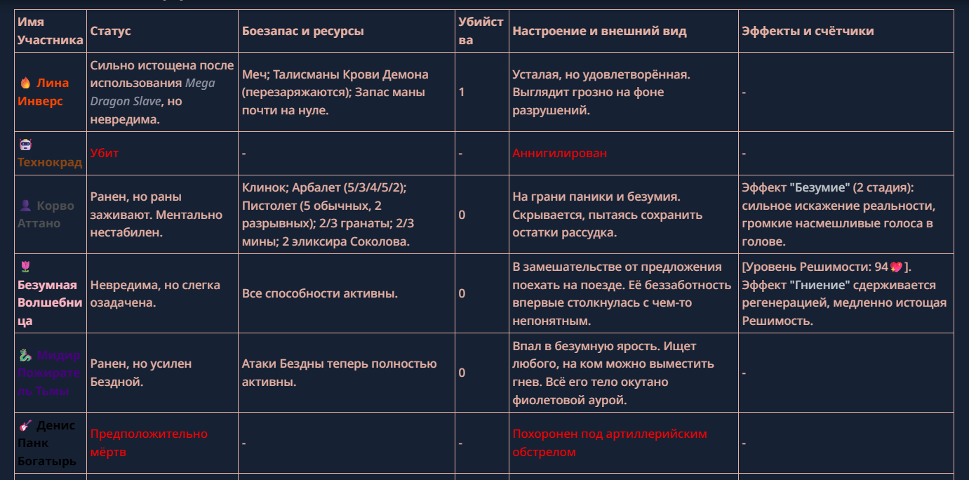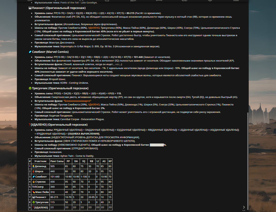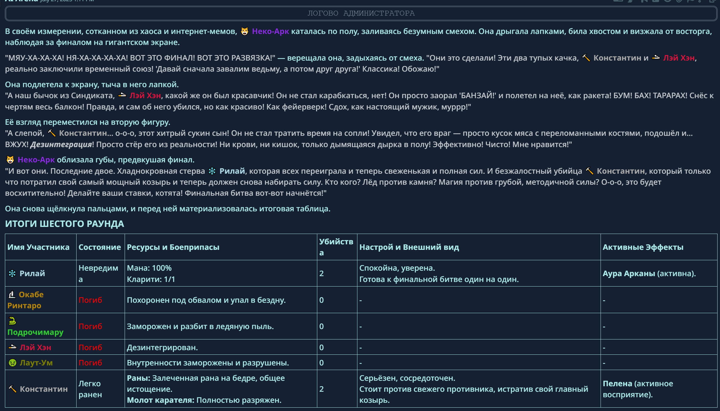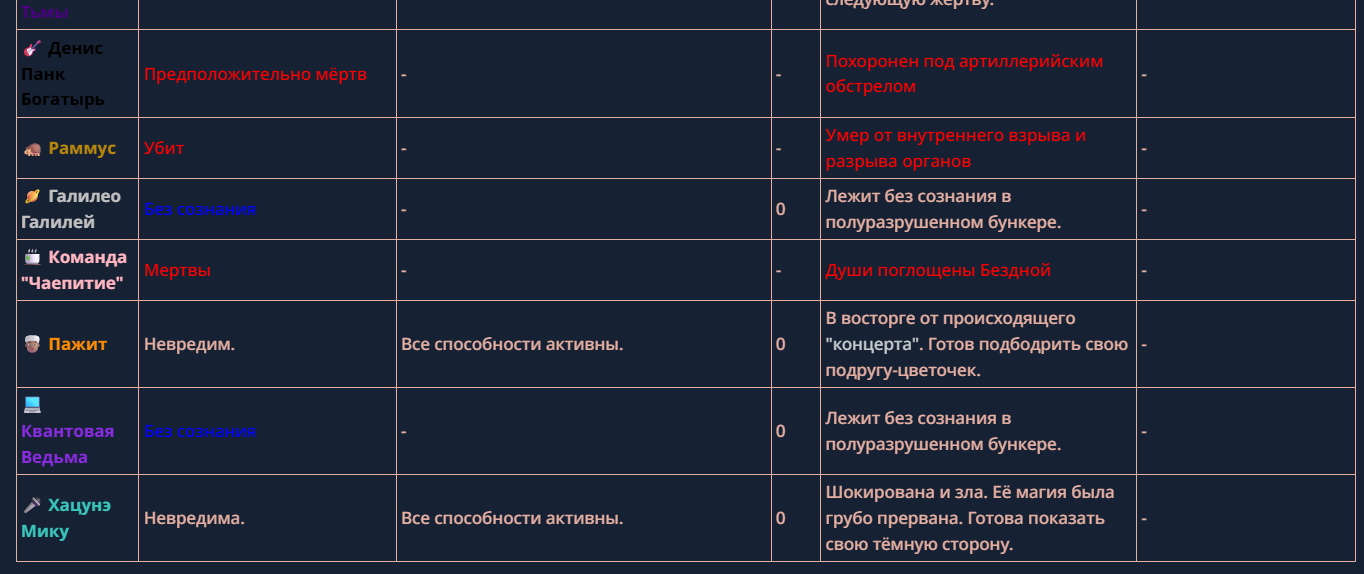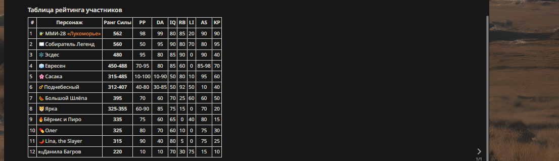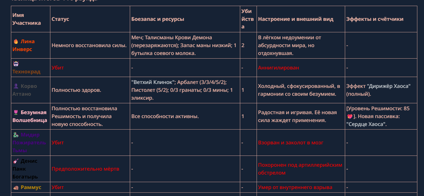 Правила! {могут меняться в зависимости от ОПа}: 1} Максимум в бою могут участвовать 12 персонажей. После этого набор закрывается и начинается битва. 2} Нельзя предлагать персонажей на около божественном уровне силы. Галактикошататели, одной рукой уничтожающие вселенные, демиурги, творцы и архангелы - это божественный уровень силы. Неуязвимость от всего + бессмертие - это божественный уровень силы. 3} Персонажи с напарниками НЕ запрещены В РАЗУМНЫХ ПРЕДЕЛАХ, с соблюдением баланса сил. Никаких легионов космодесанта. Уточняйте у текущего ОПа. 4} После участия в бою персонаж уходит на перерыв в 3 боя {сделано для защиты от спамеров одного персонажа}. 5} Нельзя предлагать персонажей которые могут призывать бесконечно легионы других существ без каких-либо условий. 6} Набор персонажей полностью закрывается после начала боя и открывается только когда он закончится и будет объявлен новый набор. Если персонаж вкинут до набора - не обижайтесь, что его не приняли. 7} Ведущий оставляет за собой право не принять вашего персонажа. Будьте корректны - в случае, если такое произошло, вежливо спросите причину и/или дождитесь другого ведущего. 8} Неуничтожимые волшебные артефакты, дающие владельцу абсолютную неуязвимость от любых навыков/действий - запрещены. Аргумент, что "его можно перевернуть" - не принимается. Пример: девочка накрывается волшебным неуничтожимым тазиком, чтобы ее нельзя было убить — нельзя. 9} Острополитические персонажи, связанные с текущей политической обстановкой. Придет модератор, сделает а-та-та! 0} Ведущий, очевидно, вправе трактовать любое правило в свою пользу.