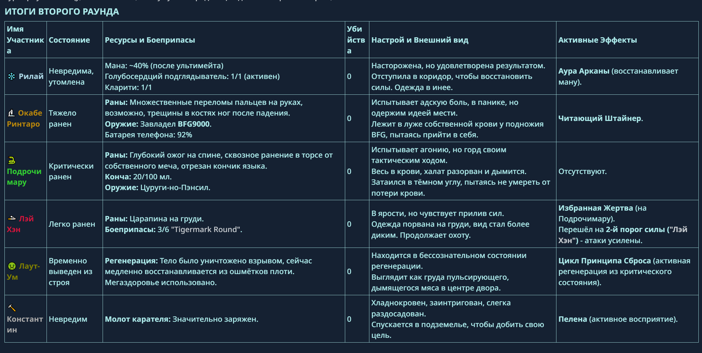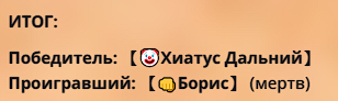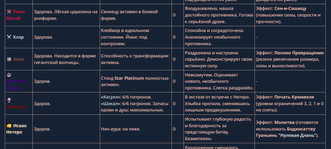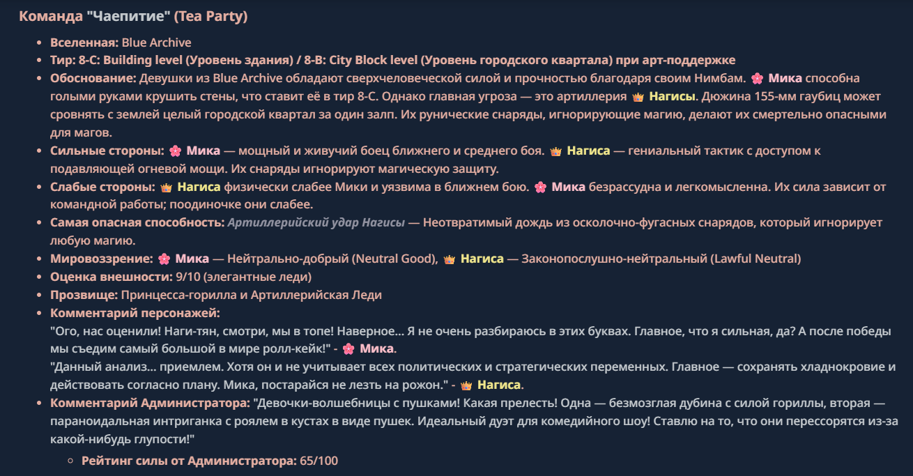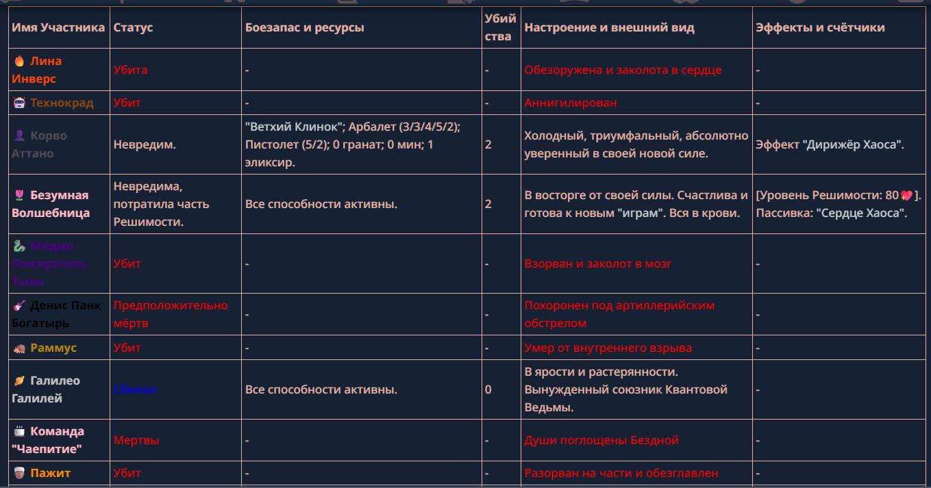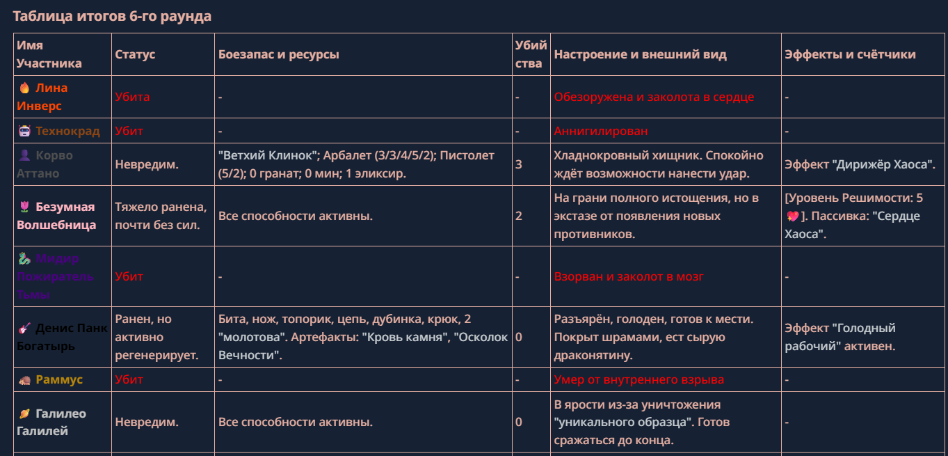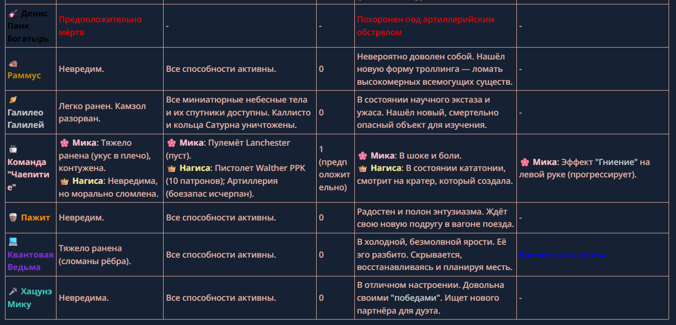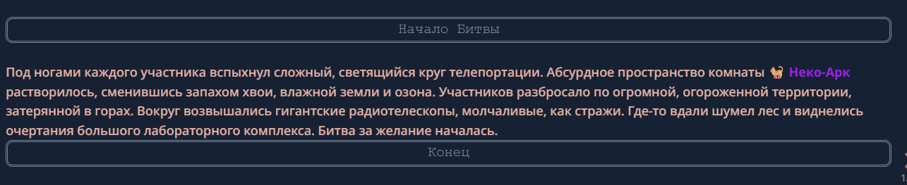 Правила! {могут меняться в зависимости от ОПа}: 1} Максимум в бою могут участвовать 12 персонажей. После этого набор закрывается и начинается битва. 2} Нельзя предлагать персонажей на около божественном уровне силы. Галактикошататели, одной рукой уничтожающие вселенные, демиурги, творцы и архангелы - это божественный уровень силы. Неуязвимость от всего + бессмертие - это божественный уровень силы. 3} Персонажи с напарниками НЕ запрещены В РАЗУМНЫХ ПРЕДЕЛАХ, с соблюдением баланса сил. Никаких легионов космодесанта. Уточняйте у текущего ОПа. 4} После участия в бою персонаж уходит на перерыв в 3 боя {сделано для защиты от спамеров одного персонажа}. 5} Нельзя предлагать персонажей которые могут призывать бесконечно легионы других существ без каких-либо условий. 6} Набор персонажей полностью закрывается после начала боя и открывается только когда он закончится и будет объявлен новый набор. Если персонаж вкинут до набора - не обижайтесь, что его не приняли. 7} Ведущий оставляет за собой право не принять вашего персонажа. Будьте корректны - в случае, если такое произошло, вежливо спросите причину и/или дождитесь другого ведущего. 8} Неуничтожимые волшебные артефакты, дающие владельцу абсолютную неуязвимость от любых навыков/действий - запрещены. Аргумент, что "его можно перевернуть" - не принимается. Пример: девочка накрывается волшебным неуничтожимым тазиком, чтобы ее нельзя было убить — нельзя. 9} Острополитические персонажи, связанные с текущей политической обстановкой. Придет модератор, сделает а-та-та! 0} Ведущий, очевидно, вправе трактовать любое правило в свою пользу.
