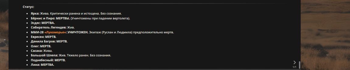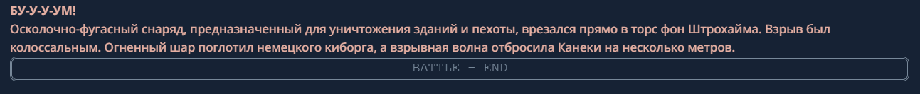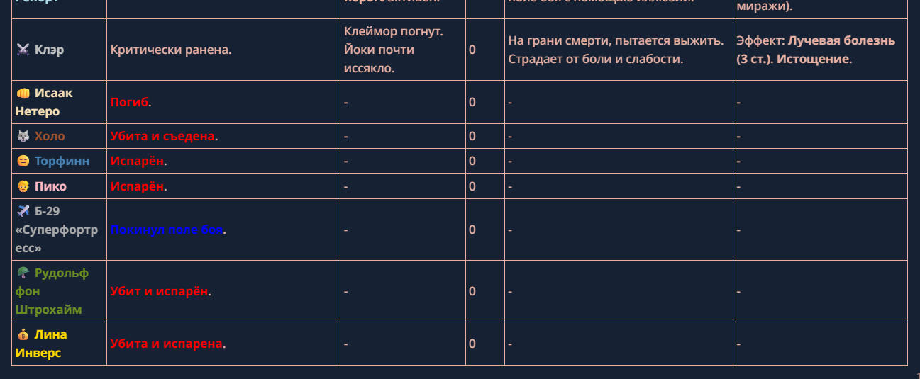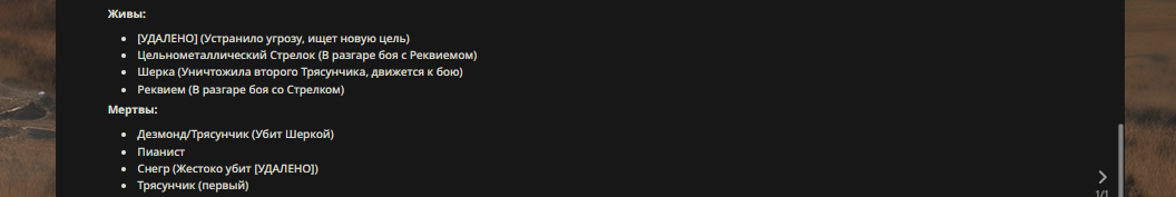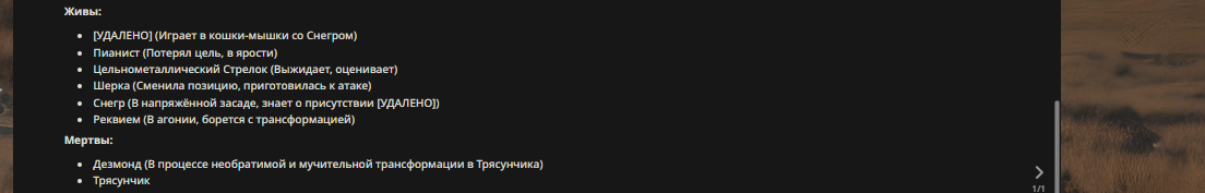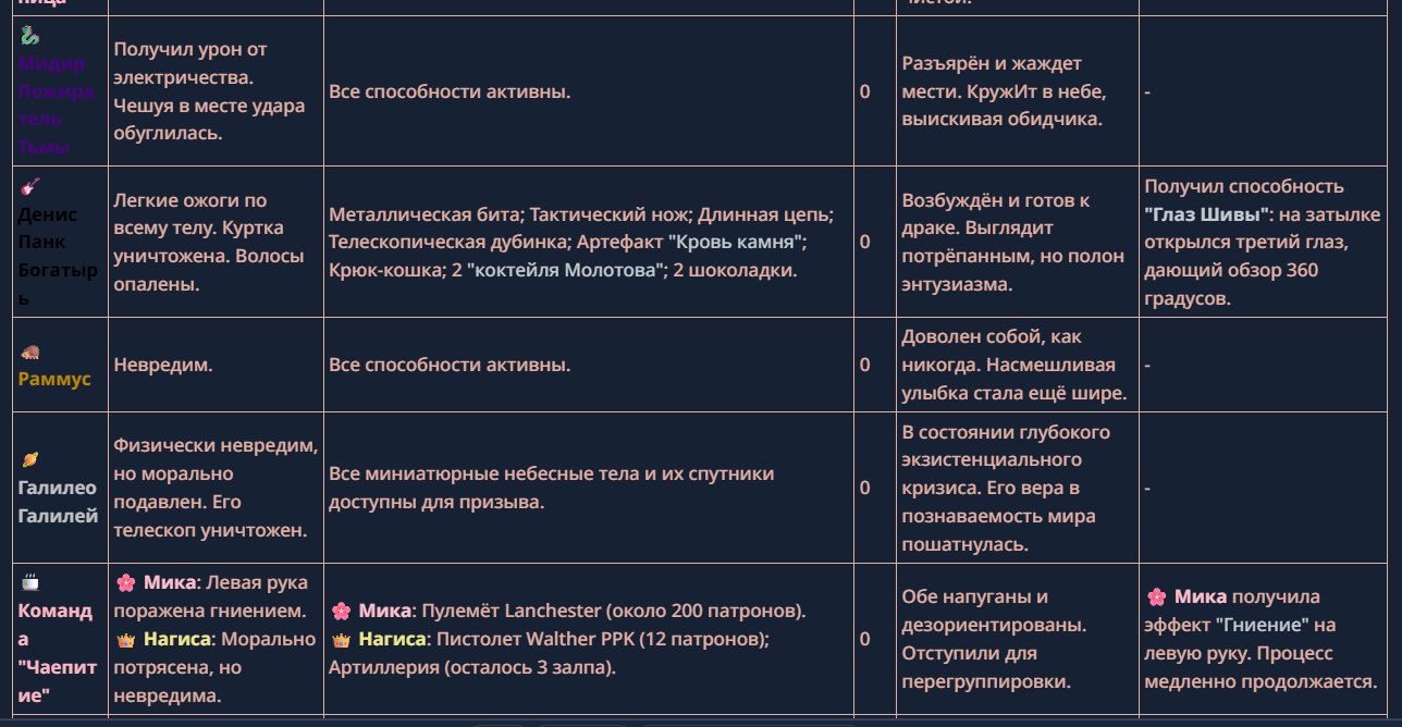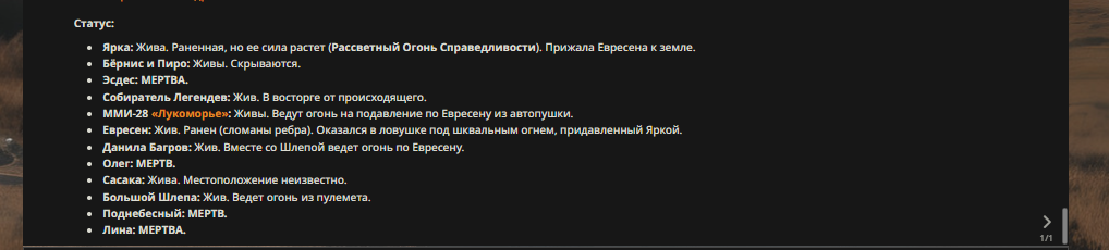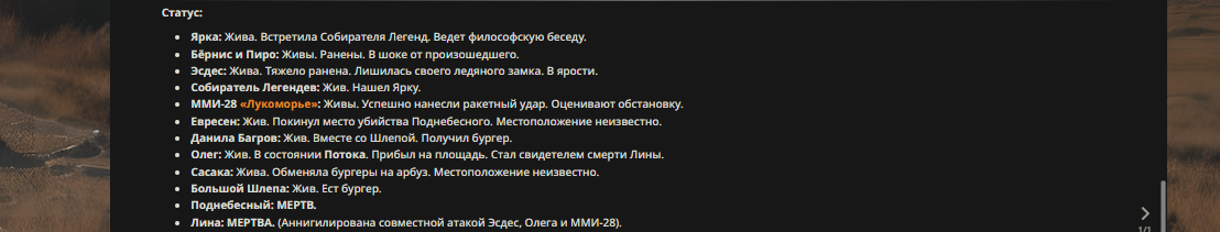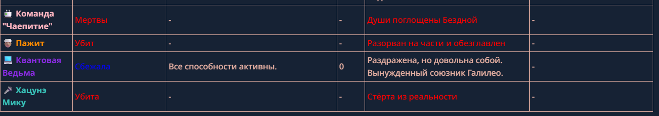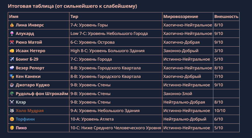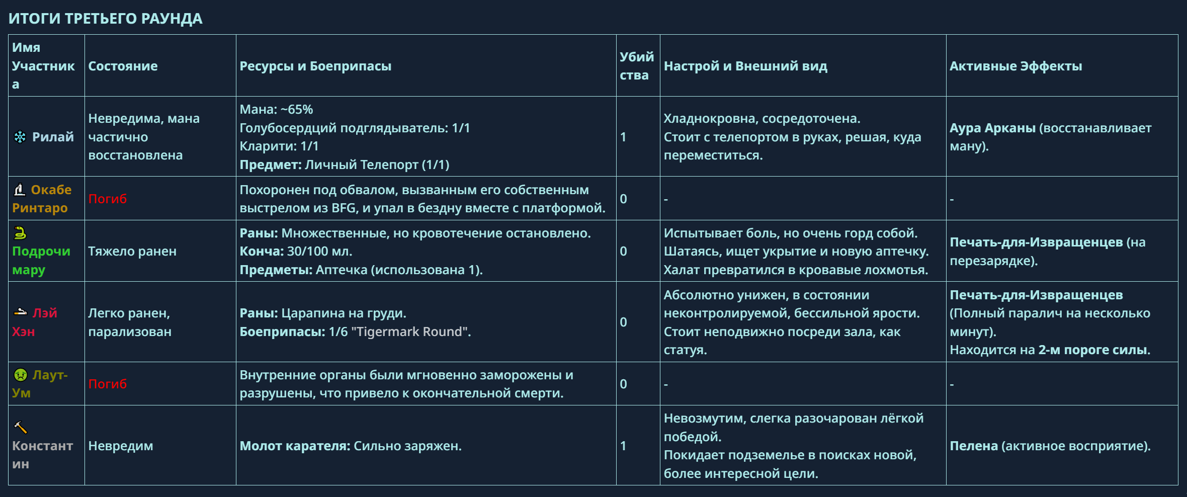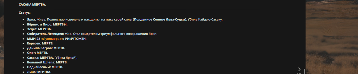 Правила! {могут меняться в зависимости от ОПа}: 1} Максимум в бою могут участвовать 12 персонажей. После этого набор закрывается и начинается битва. 2} Нельзя предлагать персонажей на около божественном уровне силы. Галактикошататели, одной рукой уничтожающие вселенные, демиурги, творцы и архангелы - это божественный уровень силы. Неуязвимость от всего + бессмертие - это божественный уровень силы. 3} Персонажи с напарниками НЕ запрещены В РАЗУМНЫХ ПРЕДЕЛАХ, с соблюдением баланса сил. Никаких легионов космодесанта. Уточняйте у текущего ОПа. 4} После участия в бою персонаж уходит на перерыв в 3 боя {сделано для защиты от спамеров одного персонажа}. 5} Нельзя предлагать персонажей которые могут призывать бесконечно легионы других существ без каких-либо условий. 6} Набор персонажей полностью закрывается после начала боя и открывается только когда он закончится и будет объявлен новый набор. Если персонаж вкинут до набора - не обижайтесь, что его не приняли. 7} Ведущий оставляет за собой право не принять вашего персонажа. Будьте корректны - в случае, если такое произошло, вежливо спросите причину и/или дождитесь другого ведущего. 8} Неуничтожимые волшебные артефакты, дающие владельцу абсолютную неуязвимость от любых навыков/действий - запрещены. Аргумент, что "его можно перевернуть" - не принимается. Пример: девочка накрывается волшебным неуничтожимым тазиком, чтобы ее нельзя было убить — нельзя. 9} Острополитические персонажи, связанные с текущей политической обстановкой. Придет модератор, сделает а-та-та! 0} Ведущий, очевидно, вправе трактовать любое правило в свою пользу.