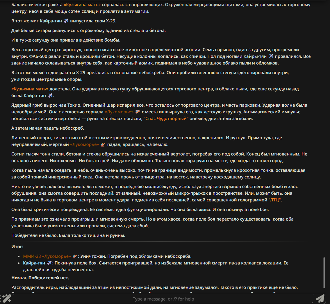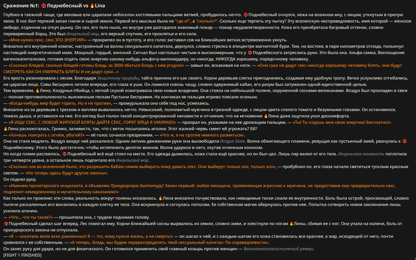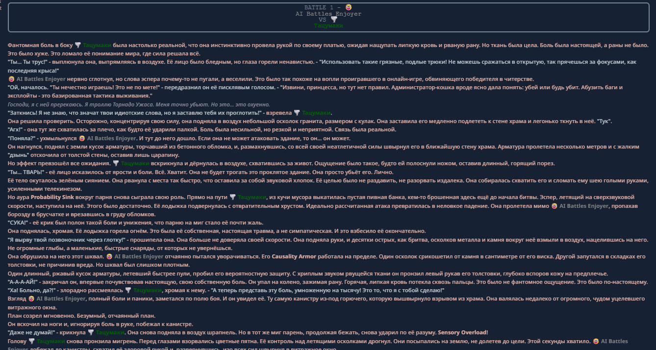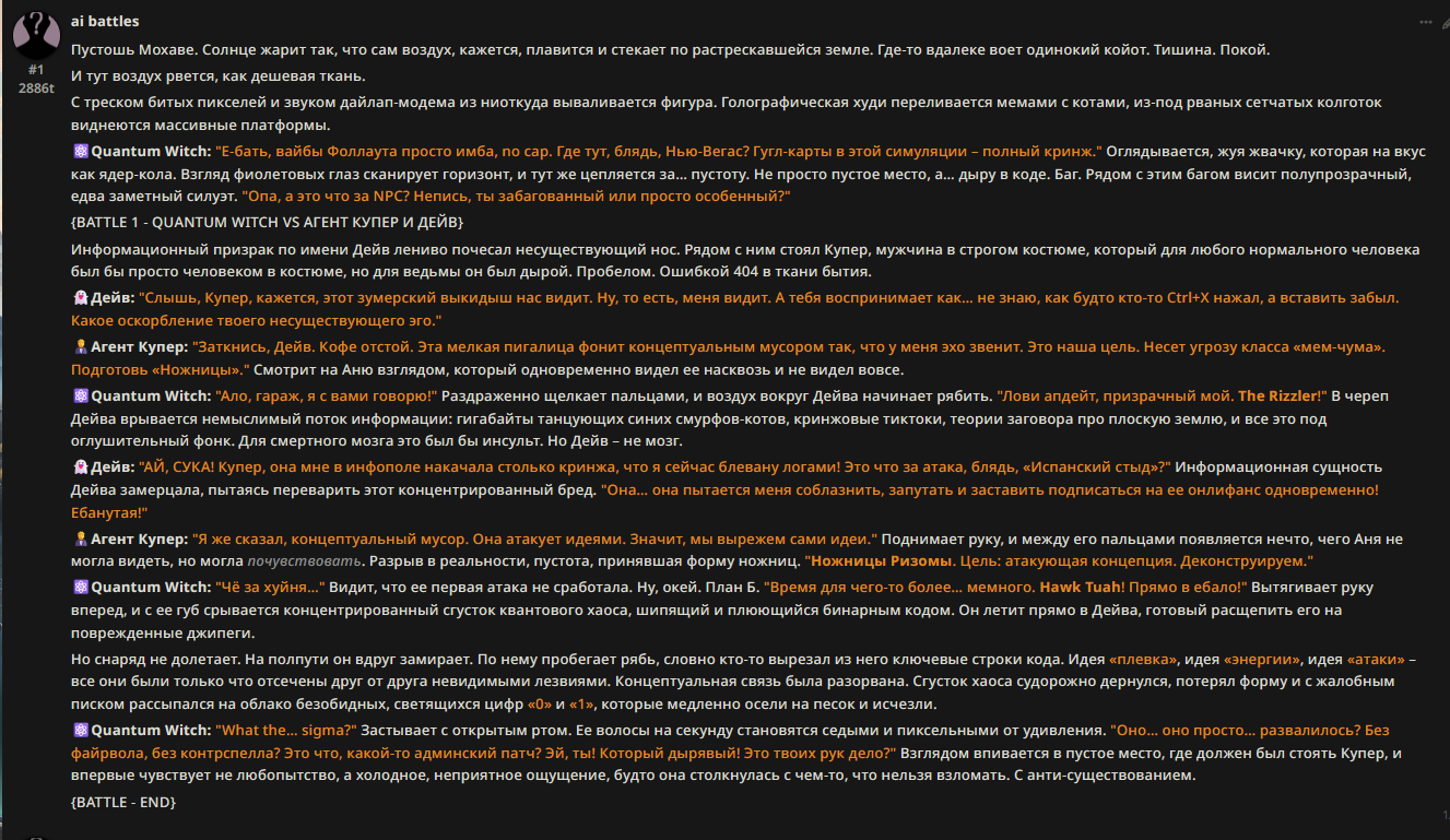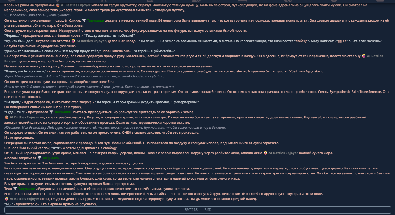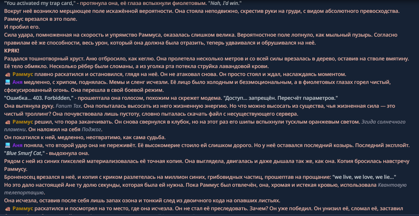 >>839234 У меня есть теория, что нейронка заранее раскидывает победителя и проигравших и дальше тупо пишет сюжет под них, ну либо заранее выбирает фаворита и пропихивает его всеми правдами и неправдами. У меня так волкохвост сначала сливался совсем лоутирным персам, а потом ваншотом пробежался по всему бою наделав трупов, при том что я в его описании буквально нихуя не поменял.
