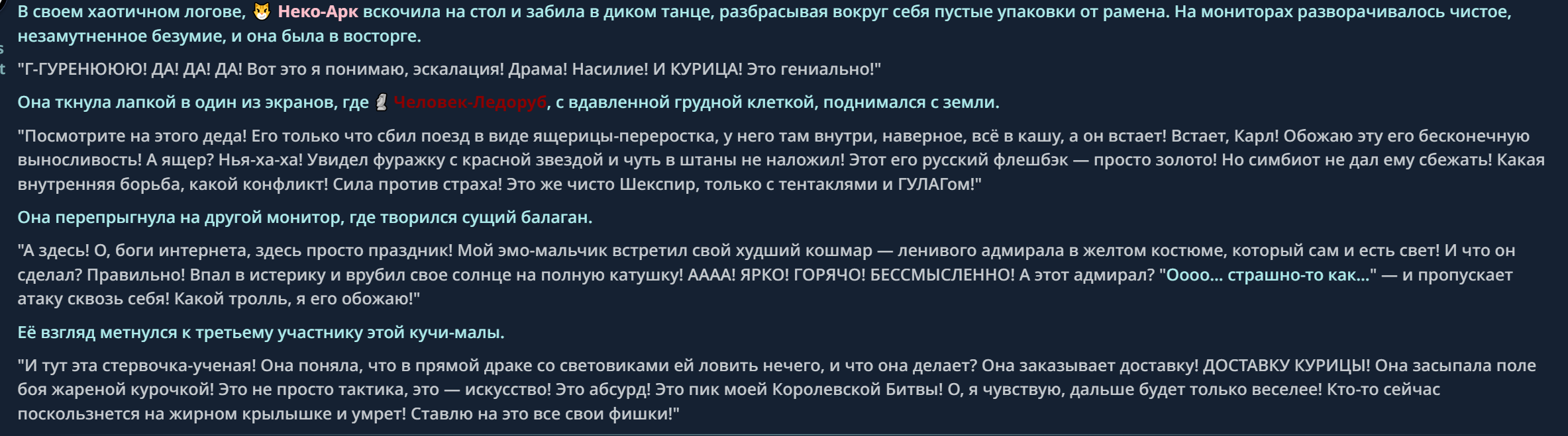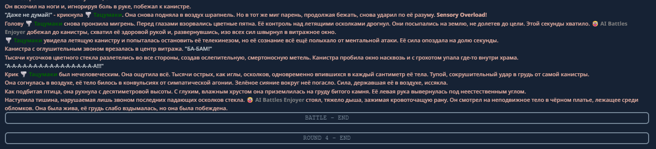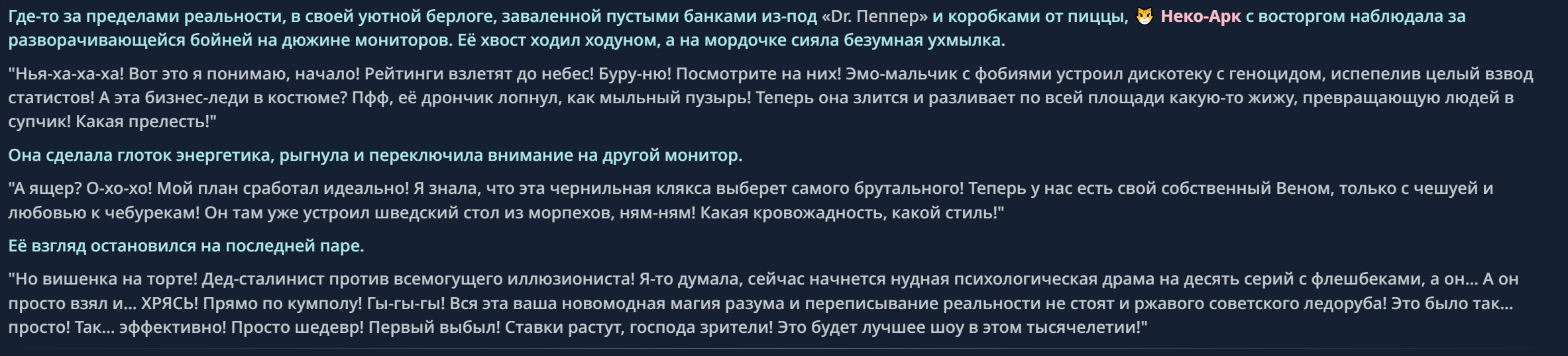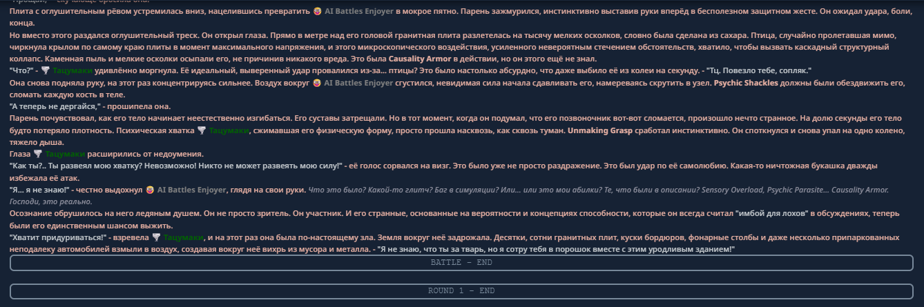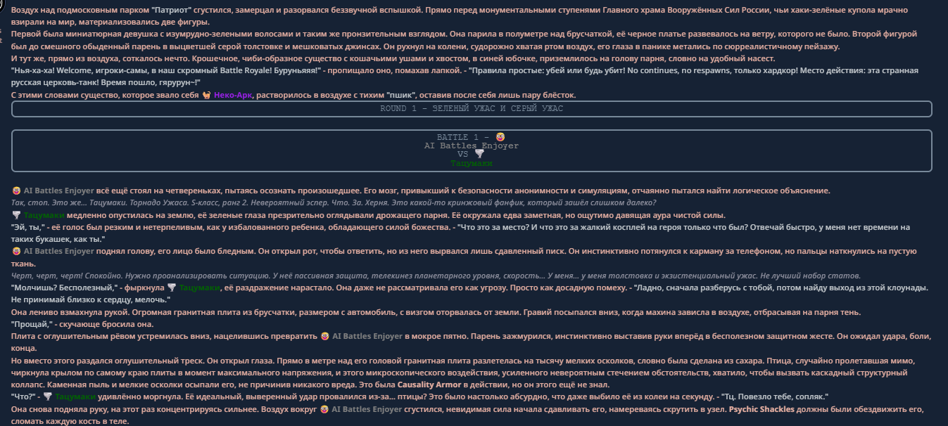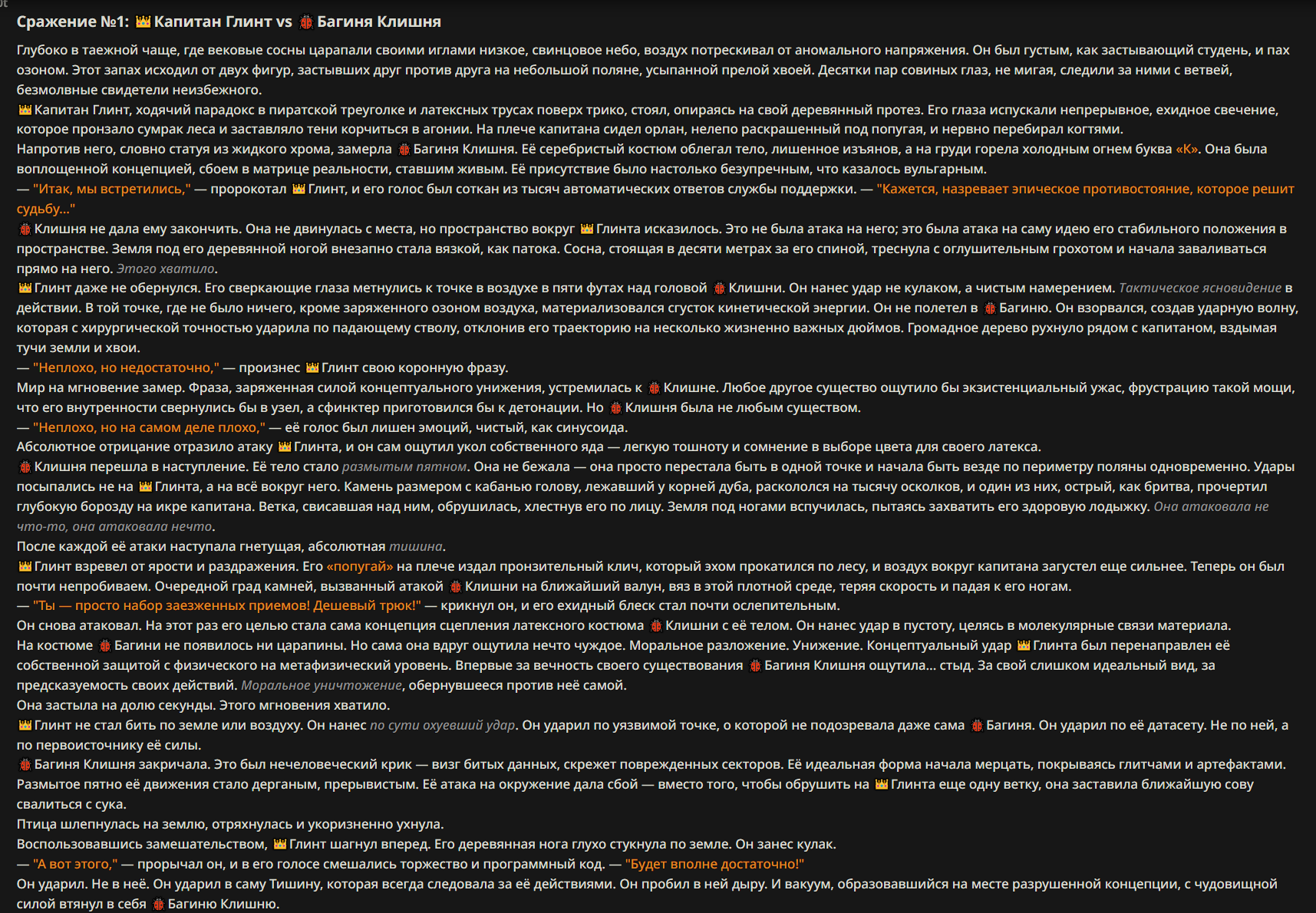 >>839234 У меня есть теория, что нейронка заранее раскидывает победителя и проигравших и дальше тупо пишет сюжет под них, ну либо заранее выбирает фаворита и пропихивает его всеми правдами и неправдами. У меня так волкохвост сначала сливался совсем лоутирным персам, а потом ваншотом пробежался по всему бою наделав трупов, при том что я в его описании буквально нихуя не поменял.