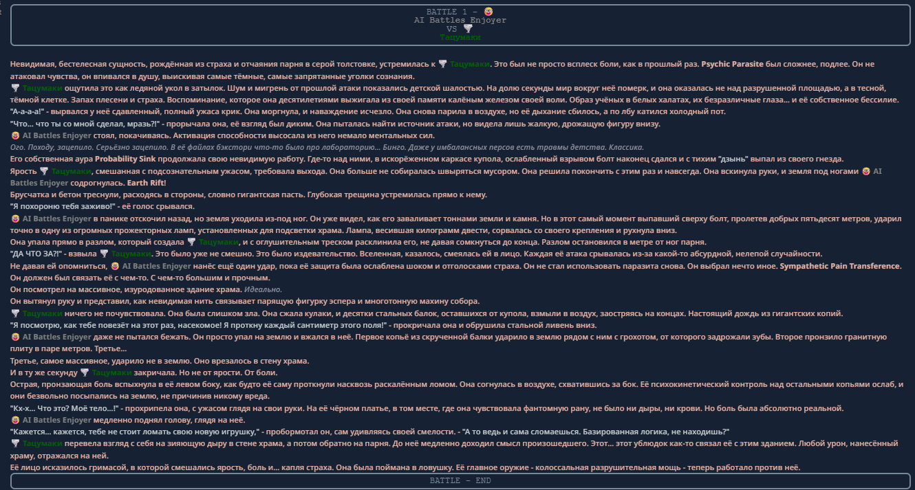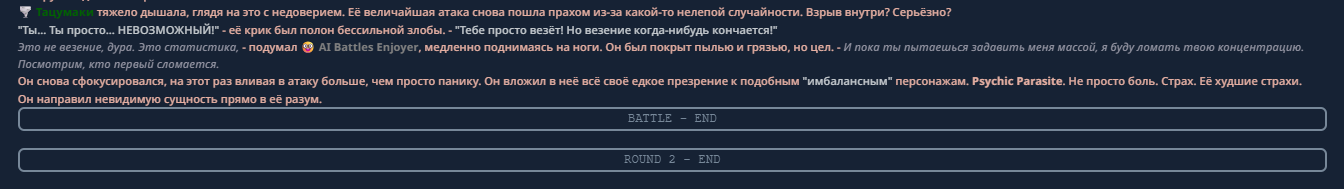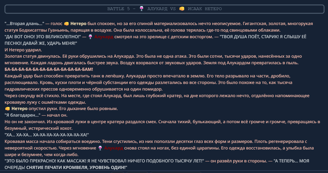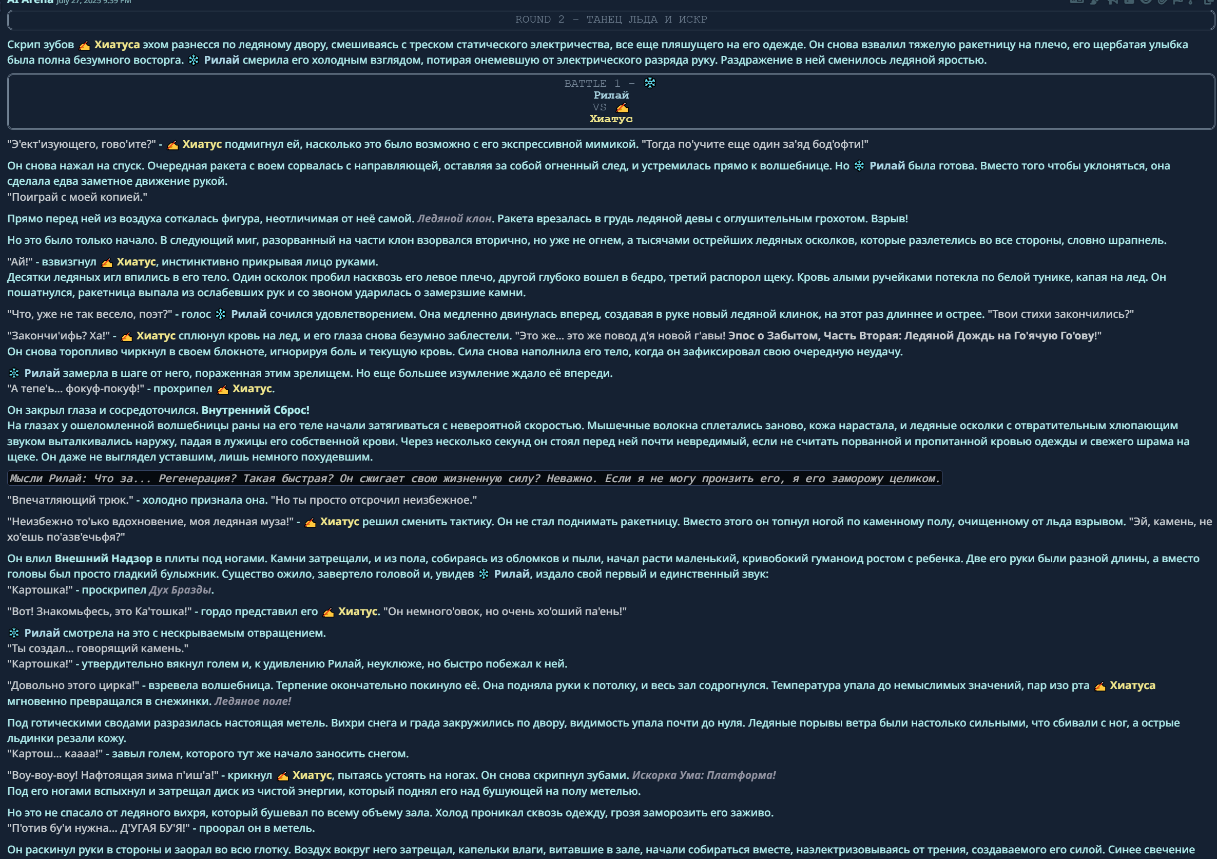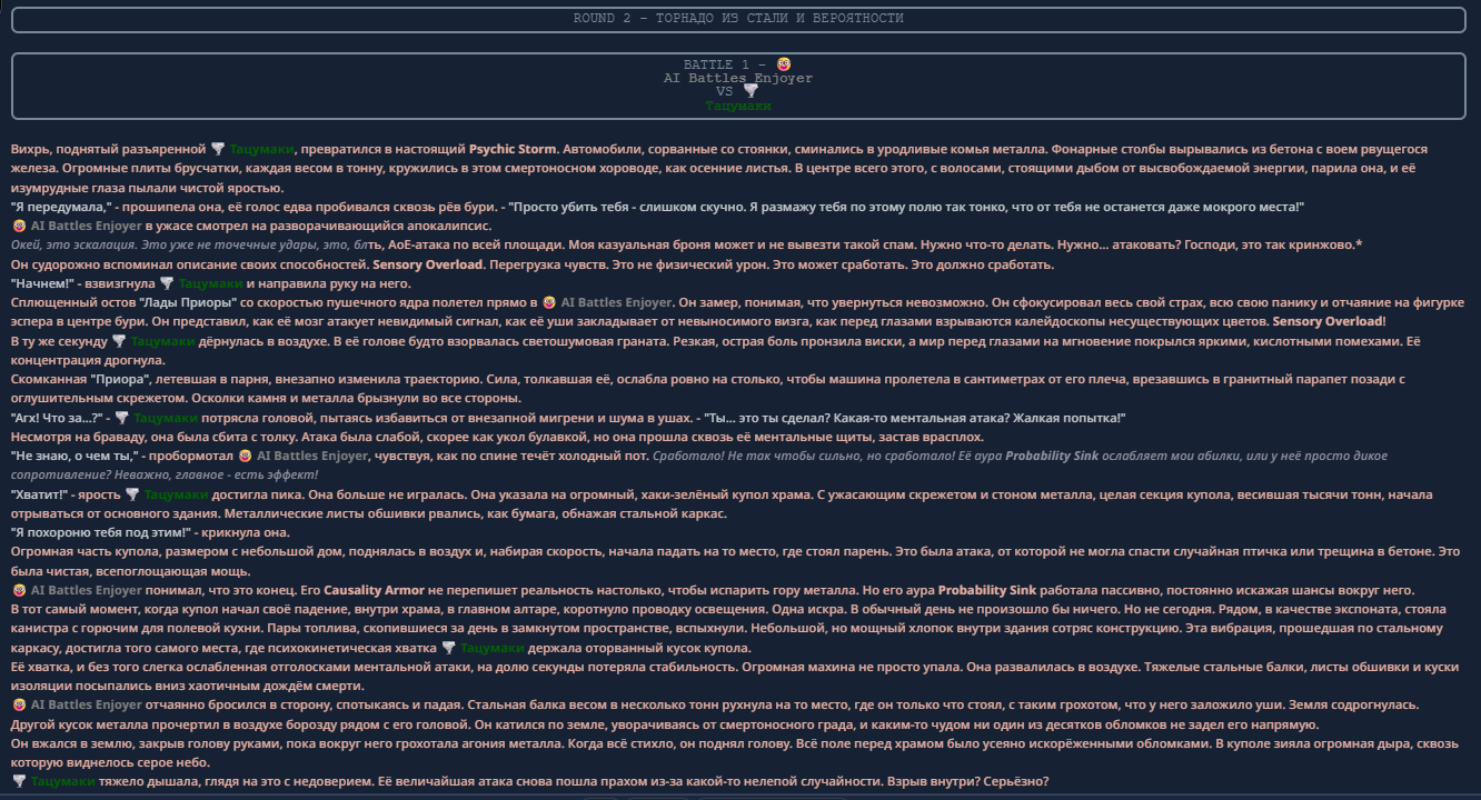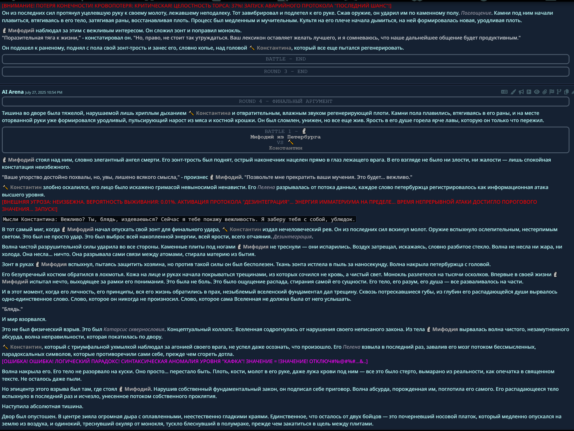 >>839234 У меня есть теория, что нейронка заранее раскидывает победителя и проигравших и дальше тупо пишет сюжет под них, ну либо заранее выбирает фаворита и пропихивает его всеми правдами и неправдами. У меня так волкохвост сначала сливался совсем лоутирным персам, а потом ваншотом пробежался по всему бою наделав трупов, при том что я в его описании буквально нихуя не поменял.