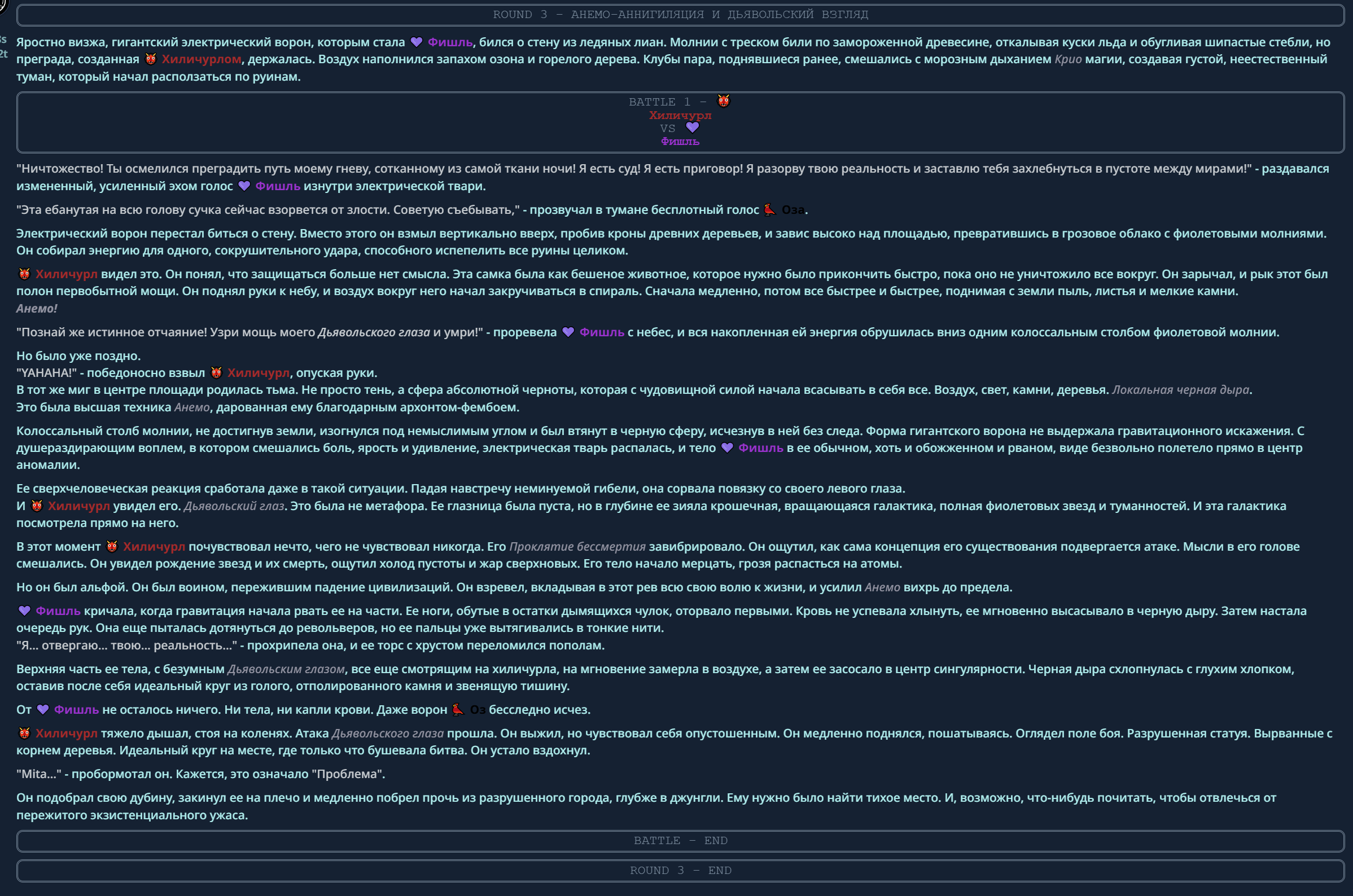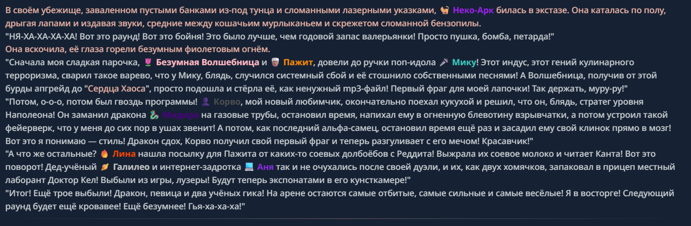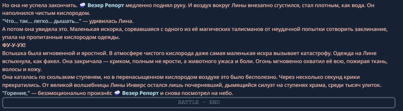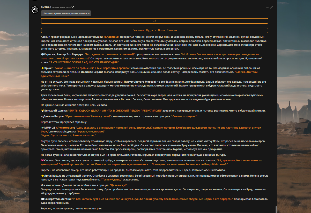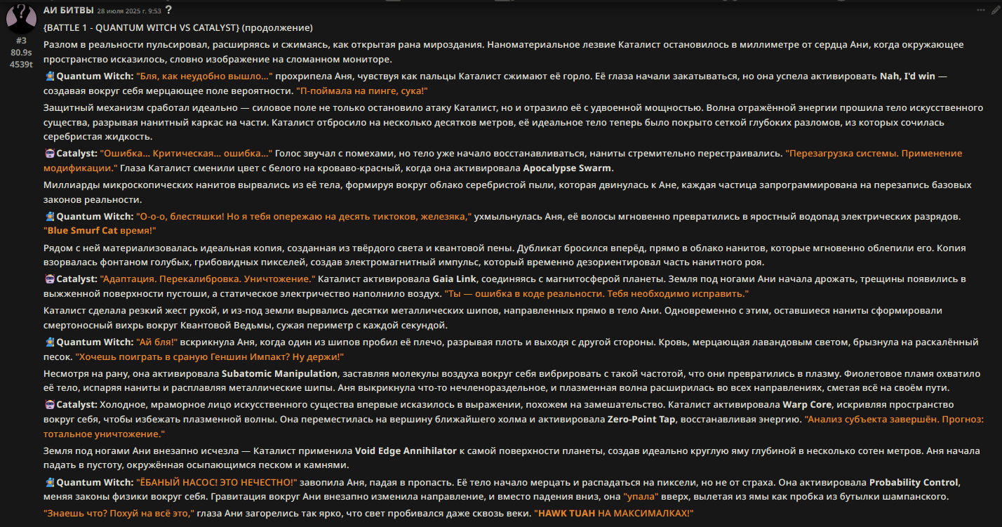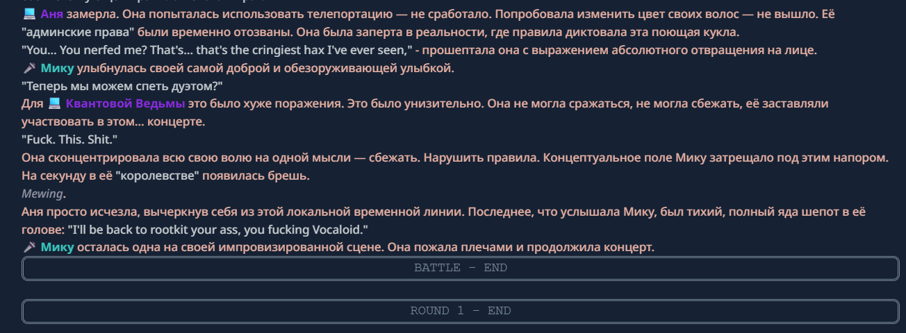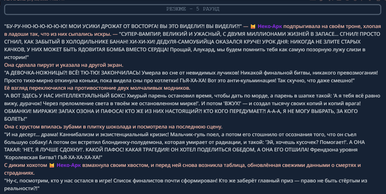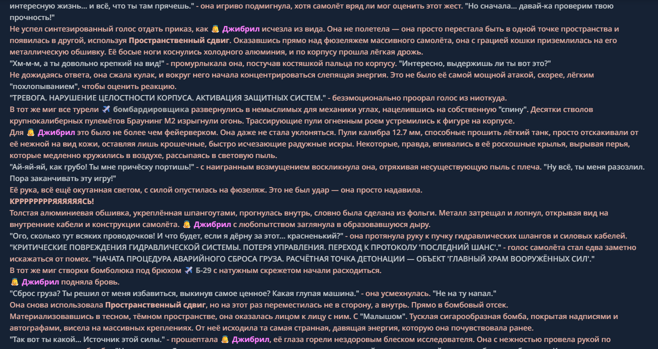 >>839234 У меня есть теория, что нейронка заранее раскидывает победителя и проигравших и дальше тупо пишет сюжет под них, ну либо заранее выбирает фаворита и пропихивает его всеми правдами и неправдами. У меня так волкохвост сначала сливался совсем лоутирным персам, а потом ваншотом пробежался по всему бою наделав трупов, при том что я в его описании буквально нихуя не поменял.