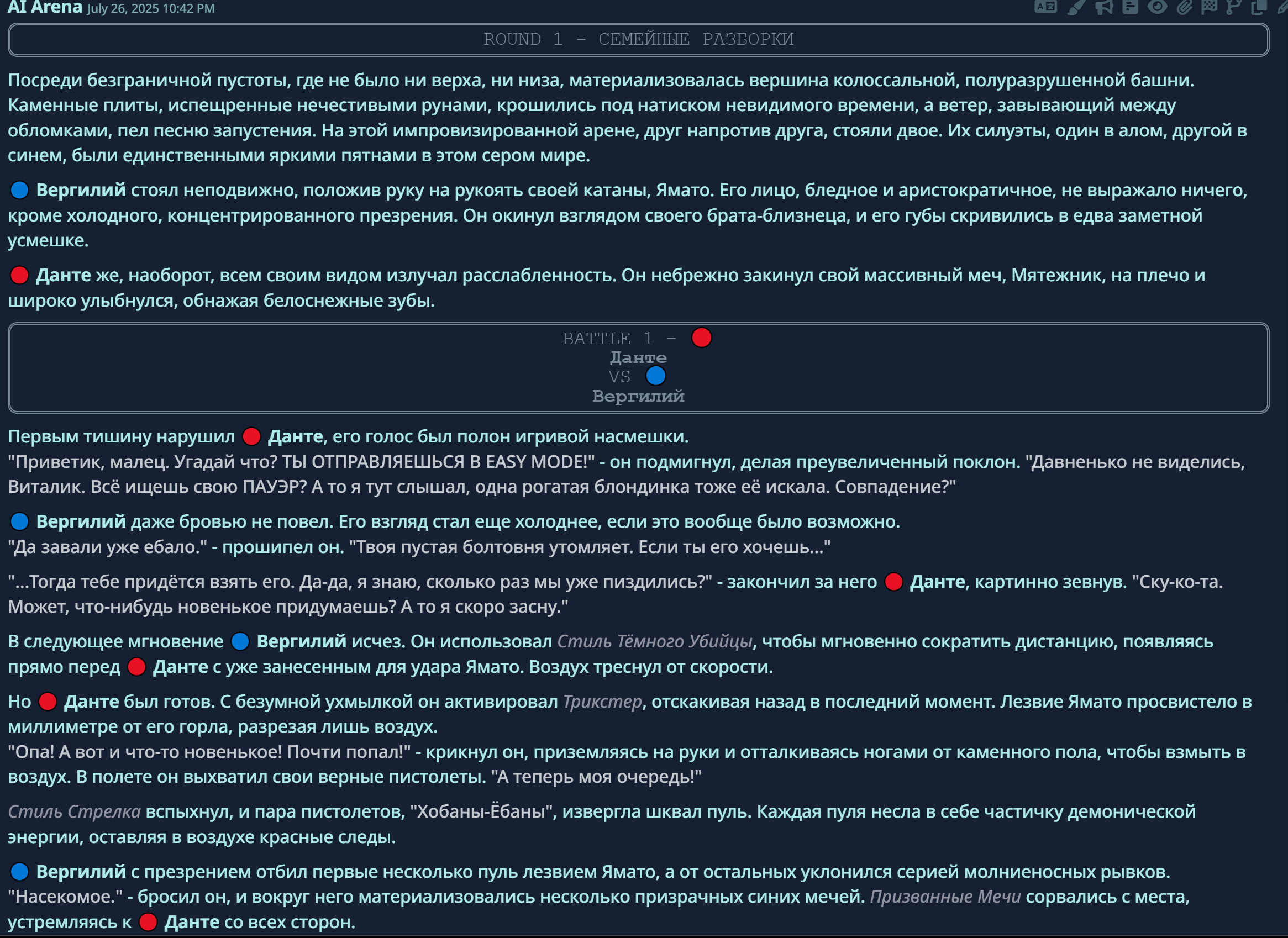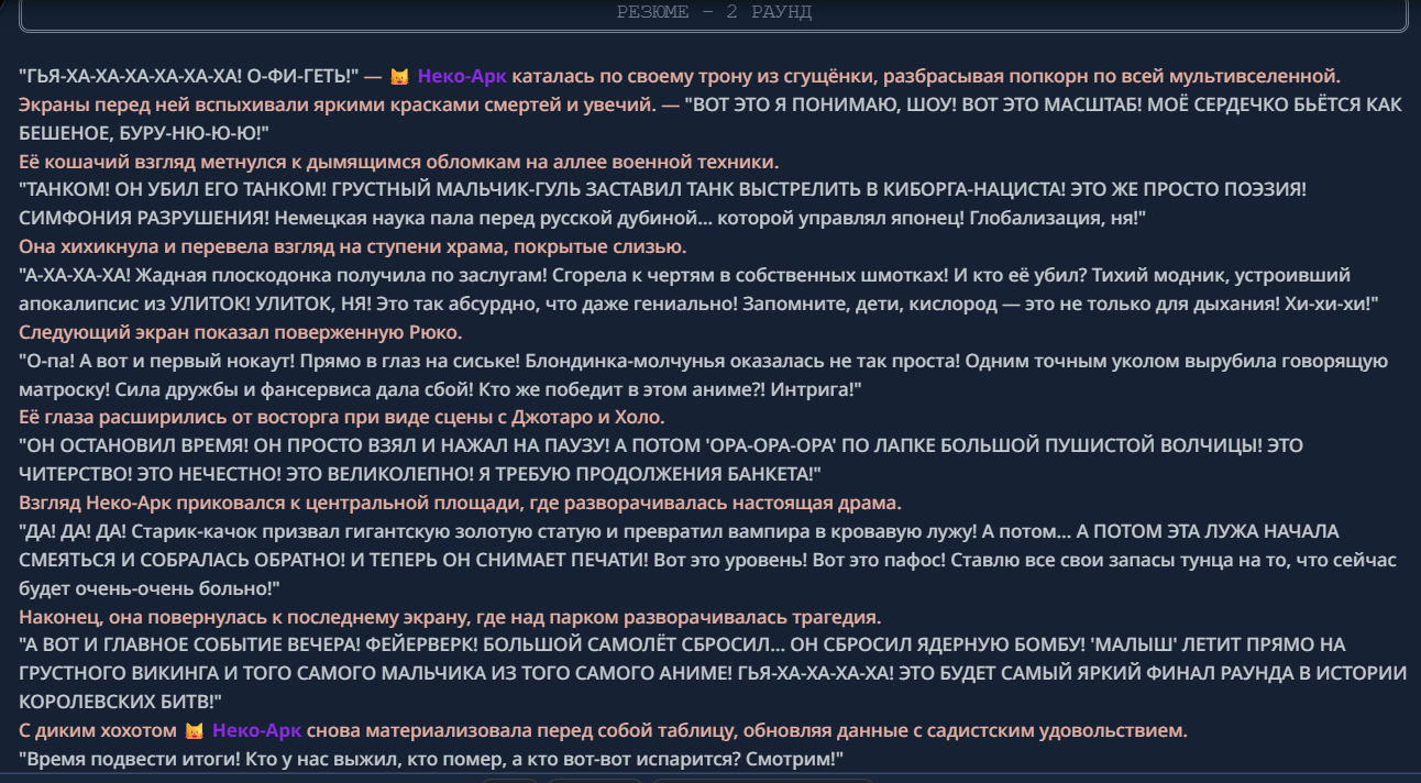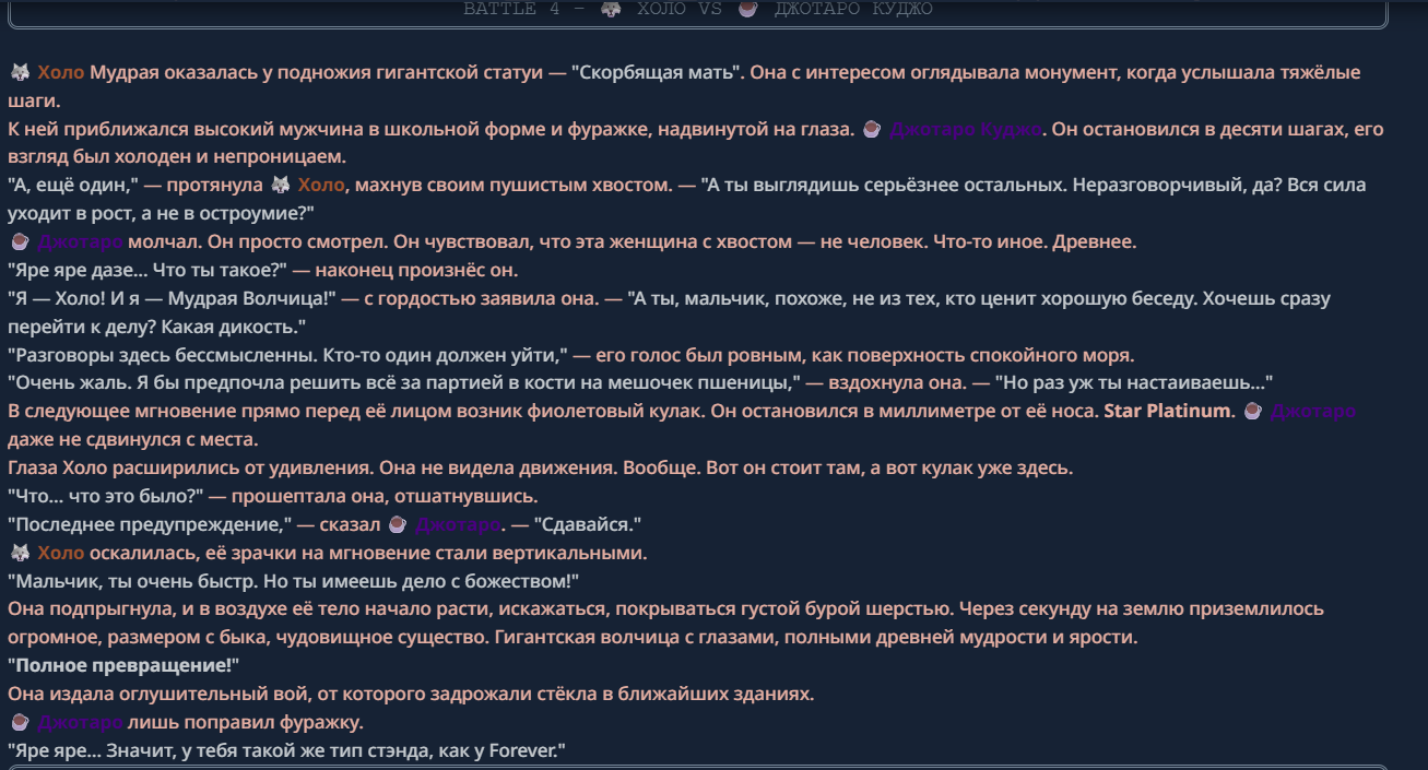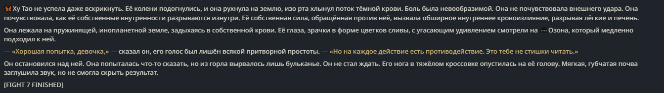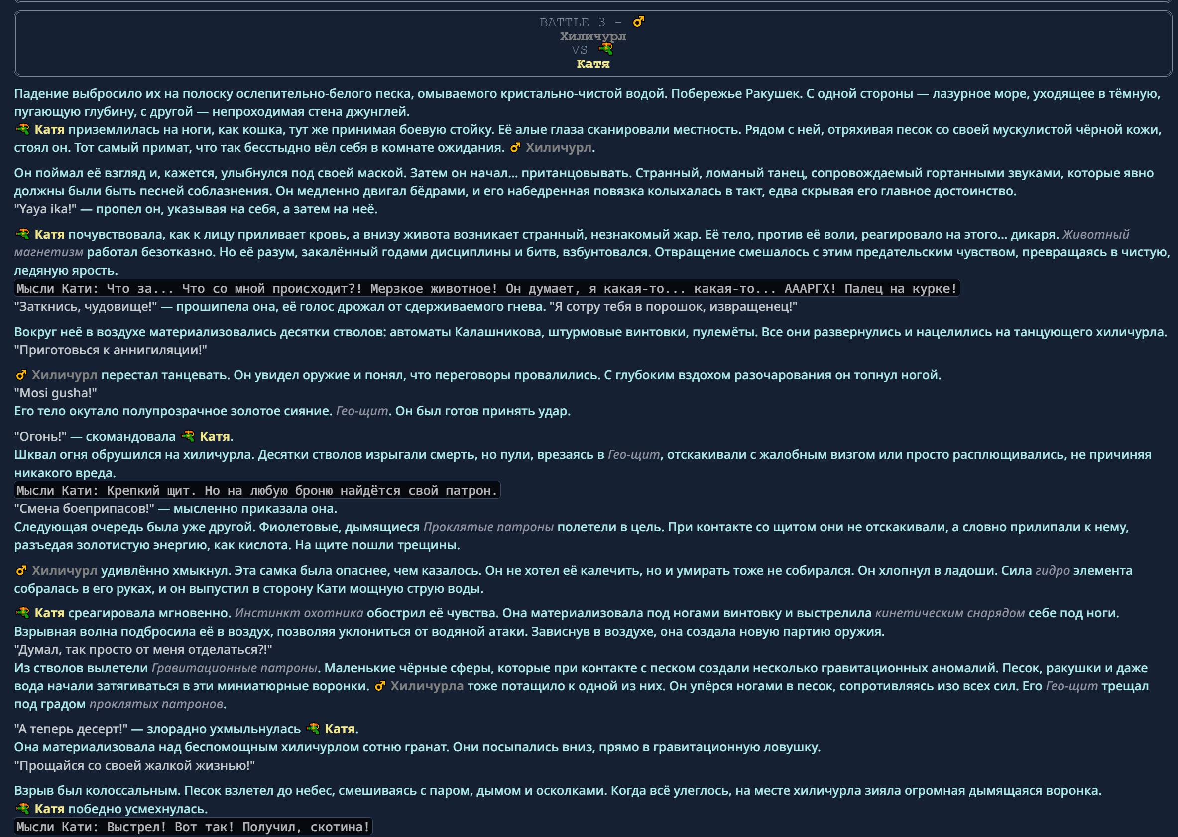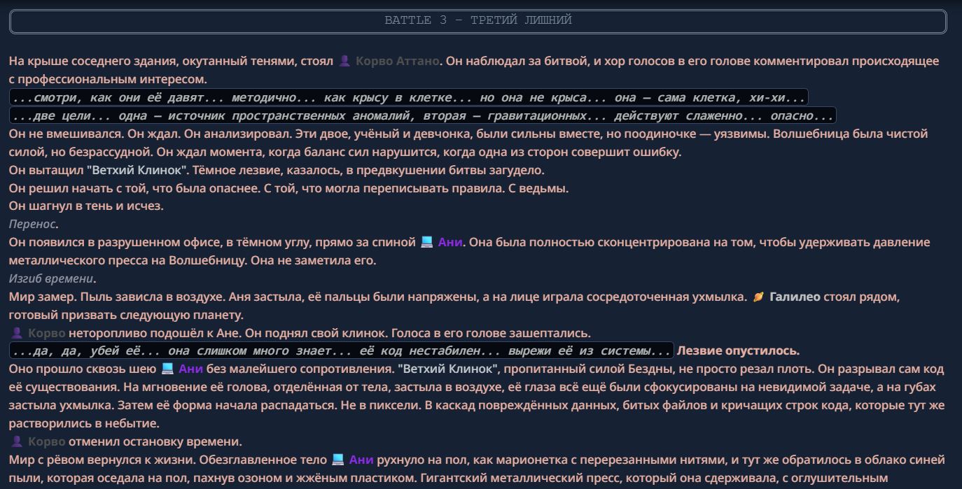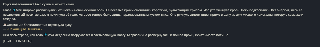 >>839234 У меня есть теория, что нейронка заранее раскидывает победителя и проигравших и дальше тупо пишет сюжет под них, ну либо заранее выбирает фаворита и пропихивает его всеми правдами и неправдами. У меня так волкохвост сначала сливался совсем лоутирным персам, а потом ваншотом пробежался по всему бою наделав трупов, при том что я в его описании буквально нихуя не поменял.