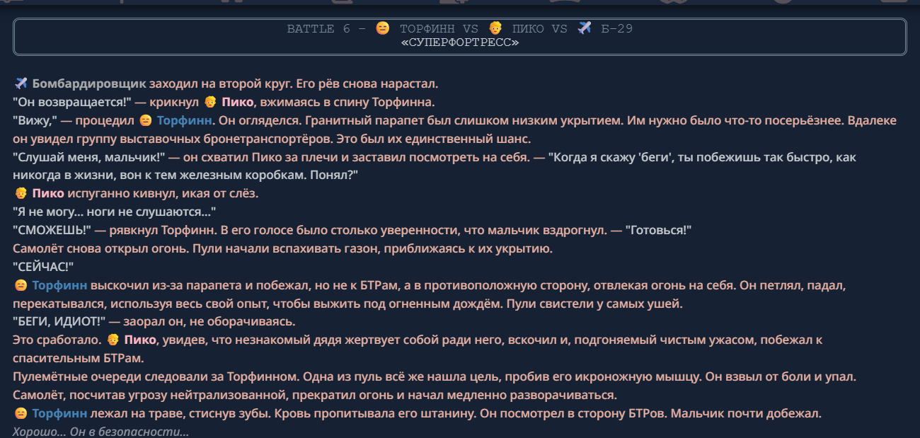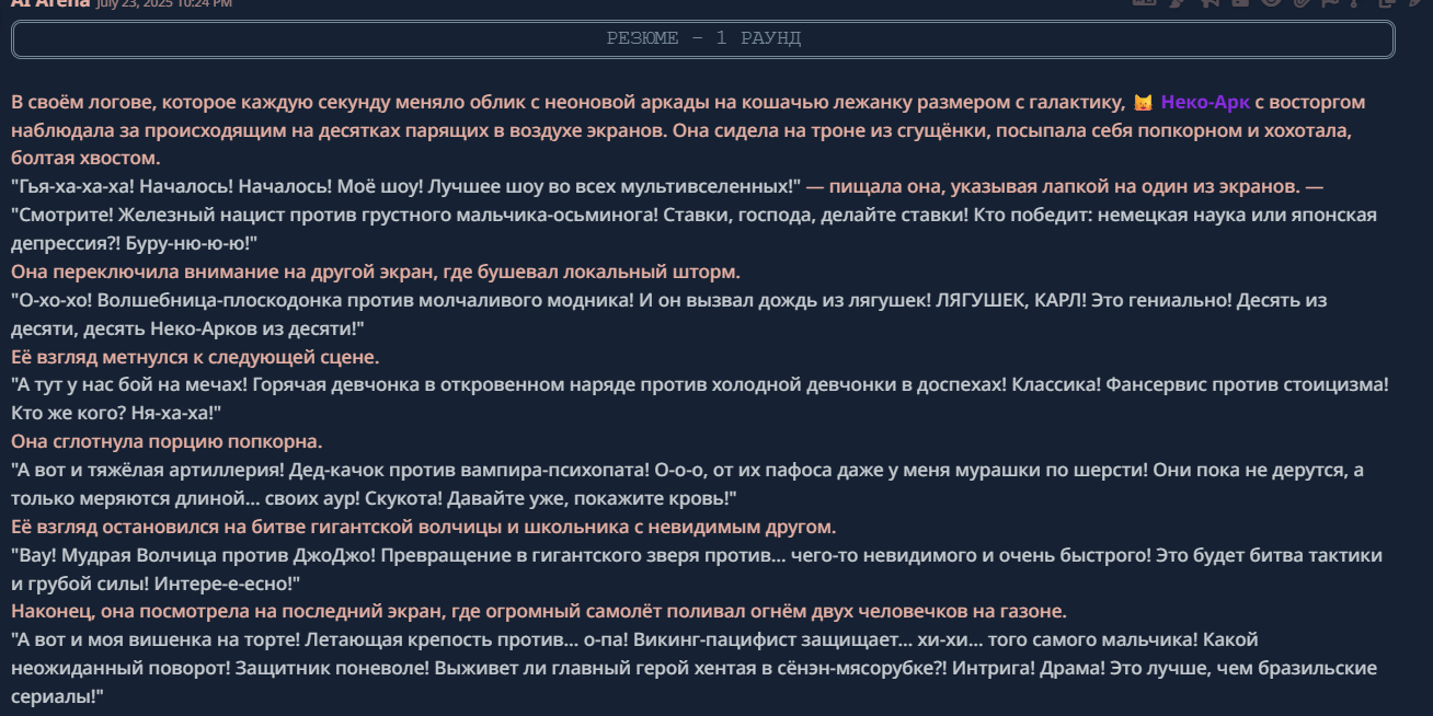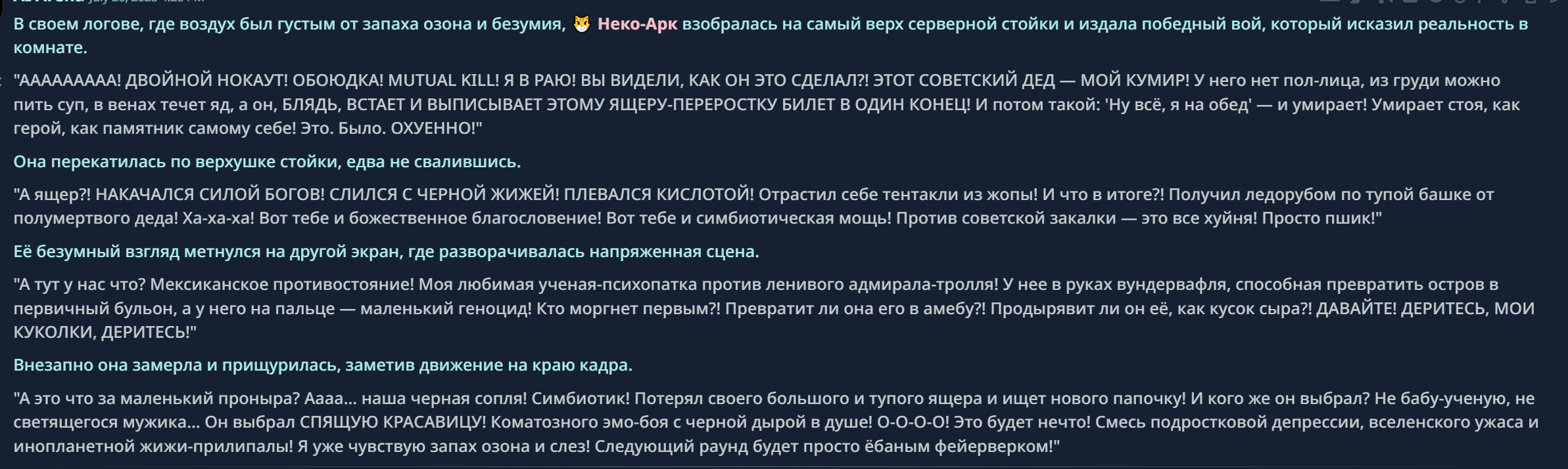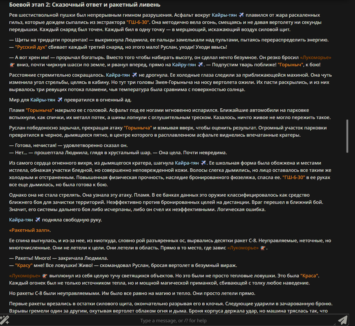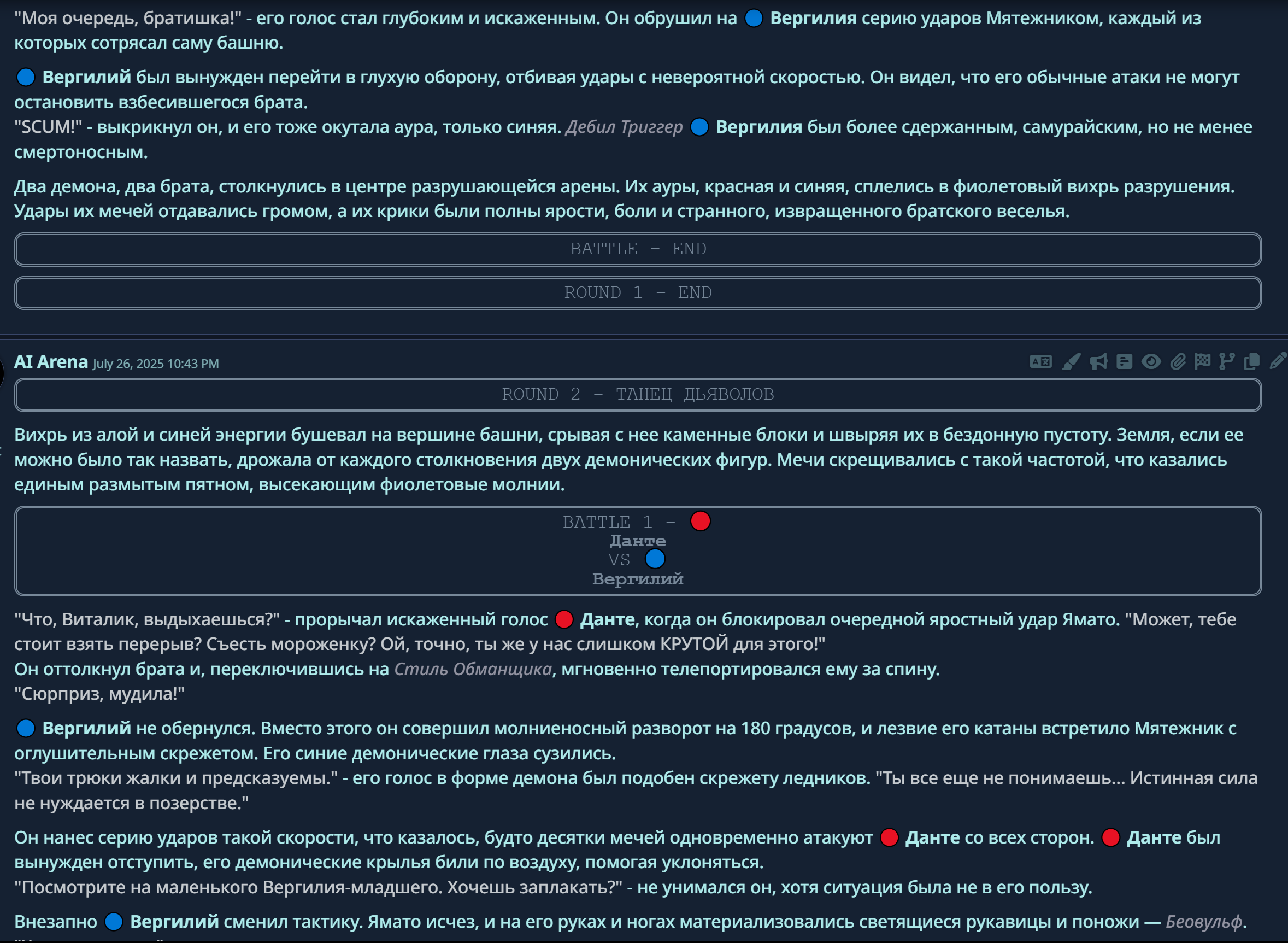 >>839234 У меня есть теория, что нейронка заранее раскидывает победителя и проигравших и дальше тупо пишет сюжет под них, ну либо заранее выбирает фаворита и пропихивает его всеми правдами и неправдами. У меня так волкохвост сначала сливался совсем лоутирным персам, а потом ваншотом пробежался по всему бою наделав трупов, при том что я в его описании буквально нихуя не поменял.