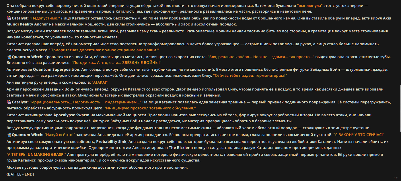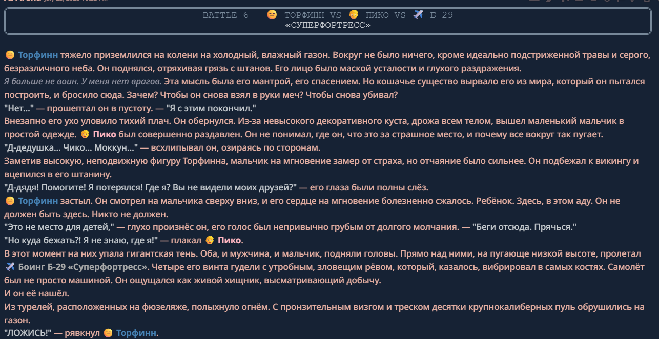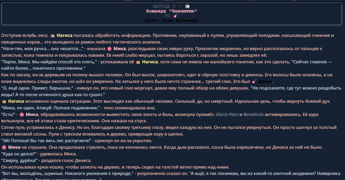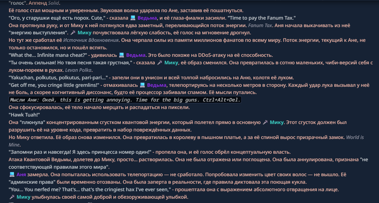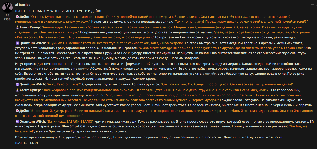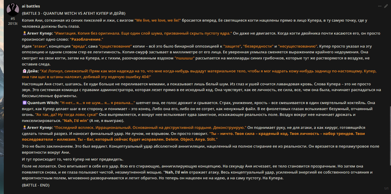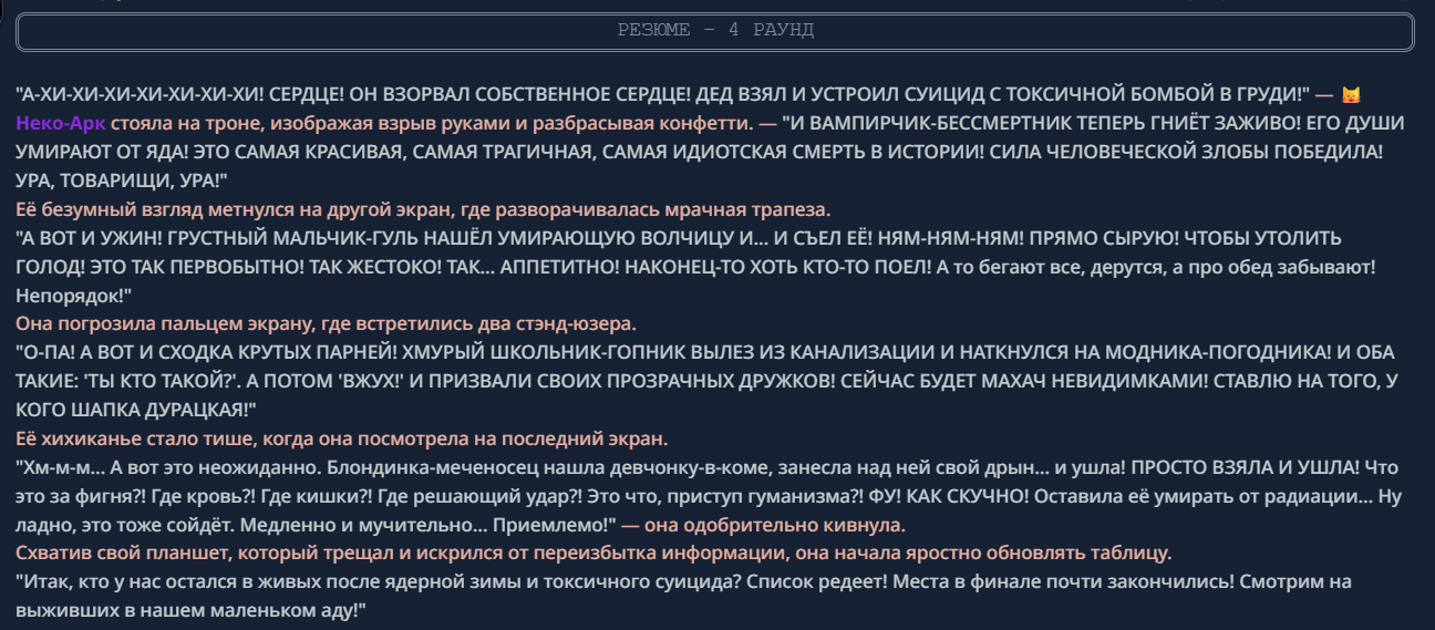>>839234 У меня есть теория, что нейронка заранее раскидывает победителя и проигравших и дальше тупо пишет сюжет под них, ну либо заранее выбирает фаворита и пропихивает его всеми правдами и неправдами. У меня так волкохвост сначала сливался совсем лоутирным персам, а потом ваншотом пробежался по всему бою наделав трупов, при том что я в его описании буквально нихуя не поменял.