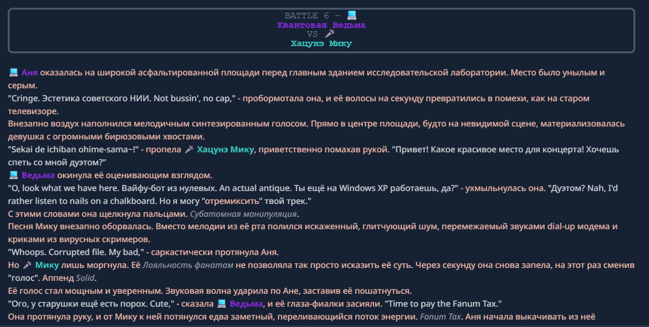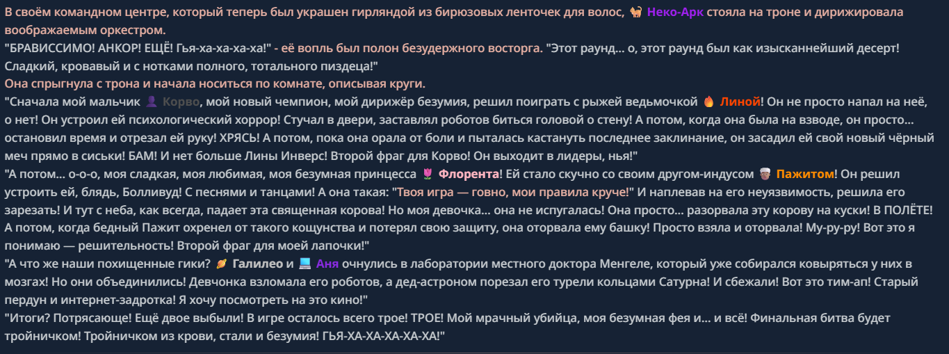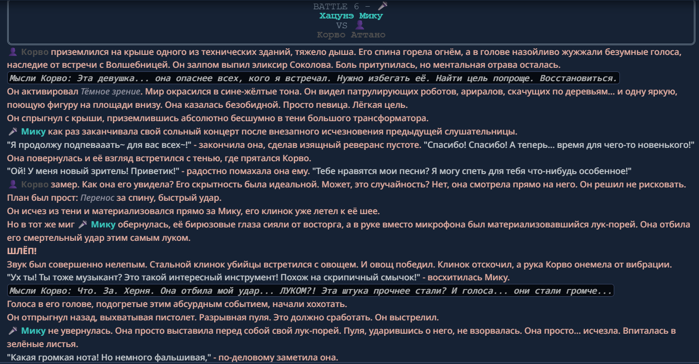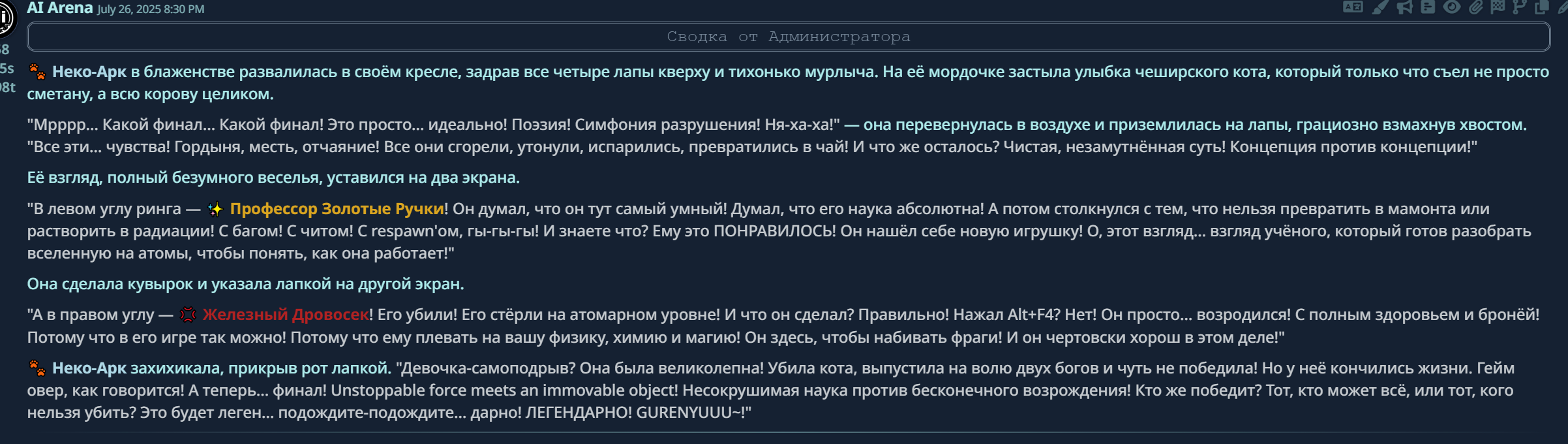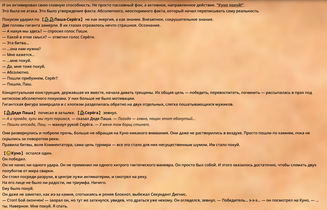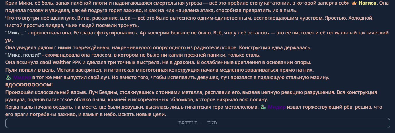 >>839234 У меня есть теория, что нейронка заранее раскидывает победителя и проигравших и дальше тупо пишет сюжет под них, ну либо заранее выбирает фаворита и пропихивает его всеми правдами и неправдами. У меня так волкохвост сначала сливался совсем лоутирным персам, а потом ваншотом пробежался по всему бою наделав трупов, при том что я в его описании буквально нихуя не поменял.