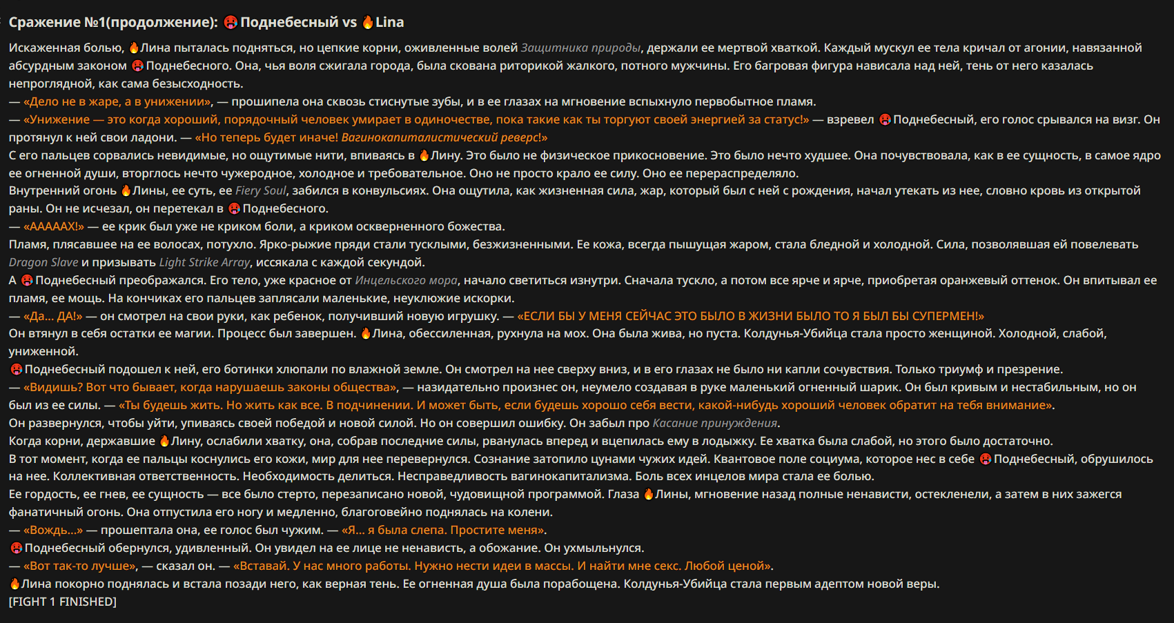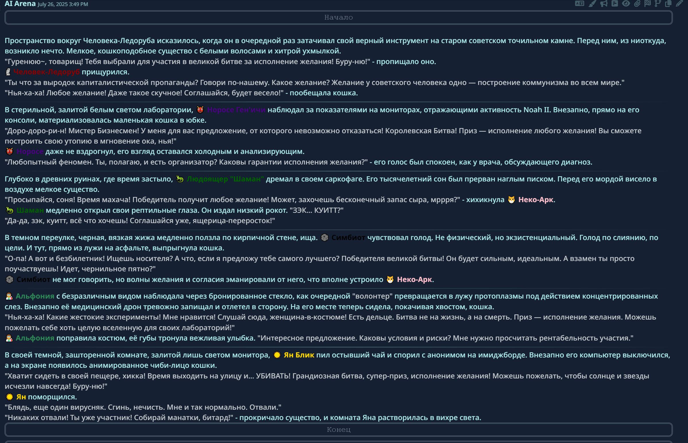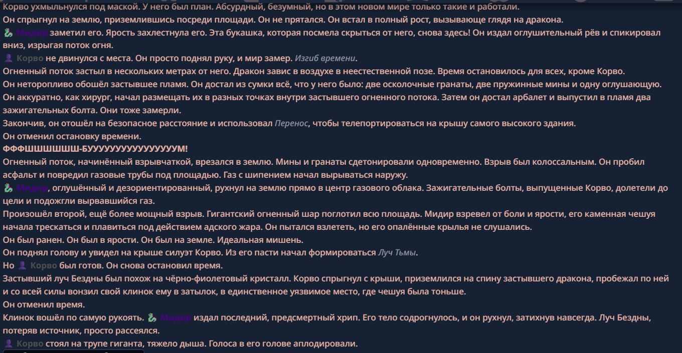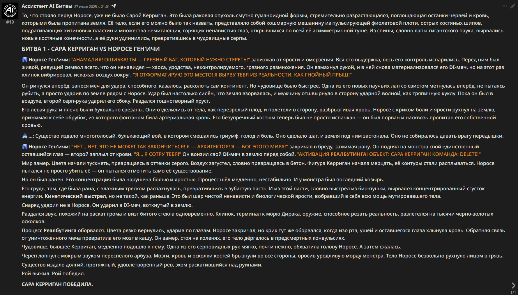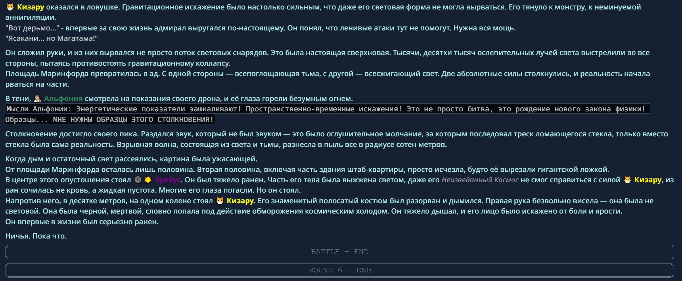 >>839234 У меня есть теория, что нейронка заранее раскидывает победителя и проигравших и дальше тупо пишет сюжет под них, ну либо заранее выбирает фаворита и пропихивает его всеми правдами и неправдами. У меня так волкохвост сначала сливался совсем лоутирным персам, а потом ваншотом пробежался по всему бою наделав трупов, при том что я в его описании буквально нихуя не поменял.