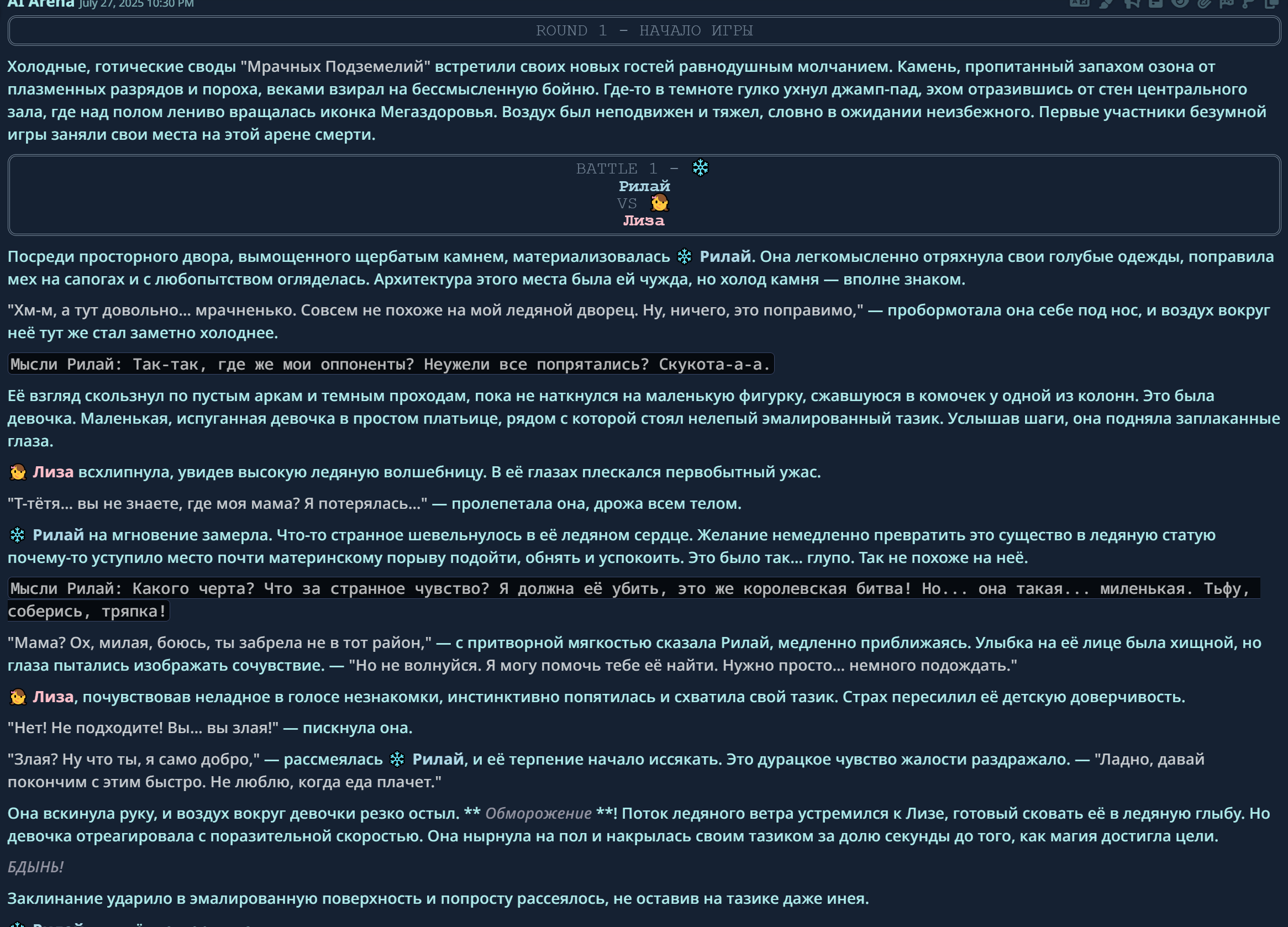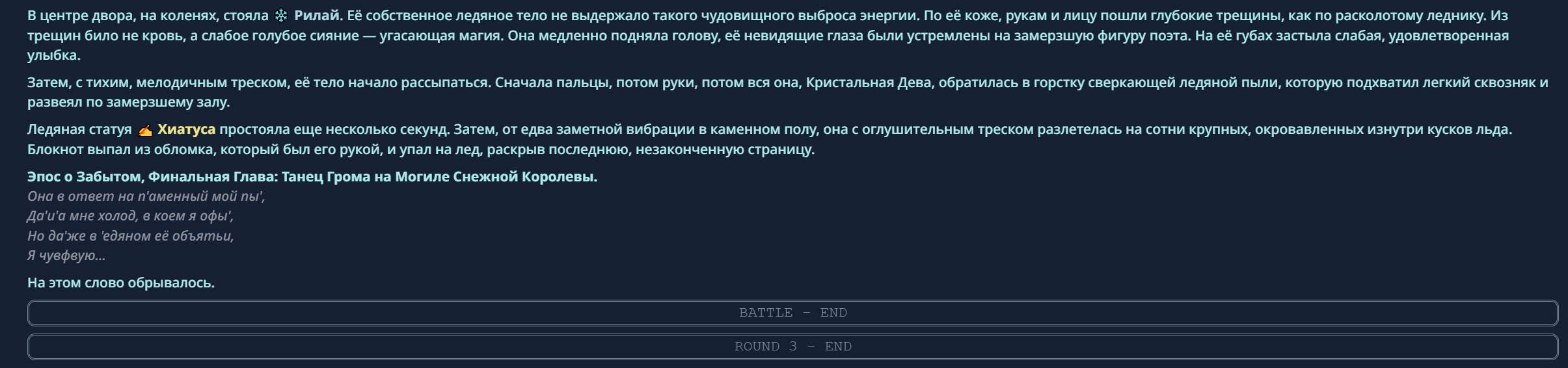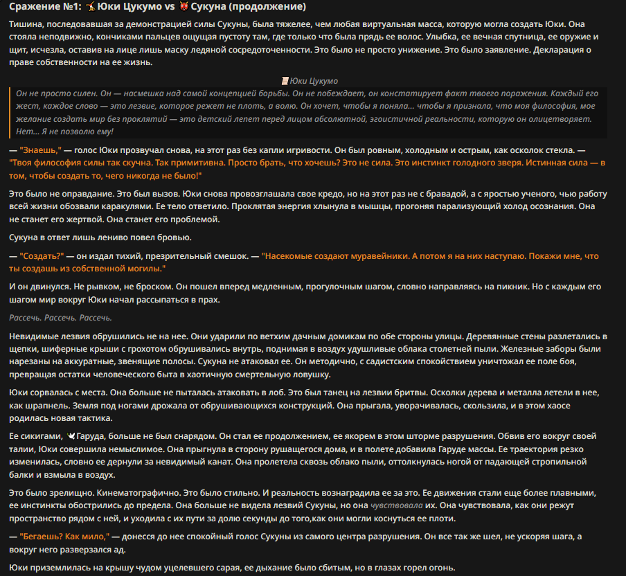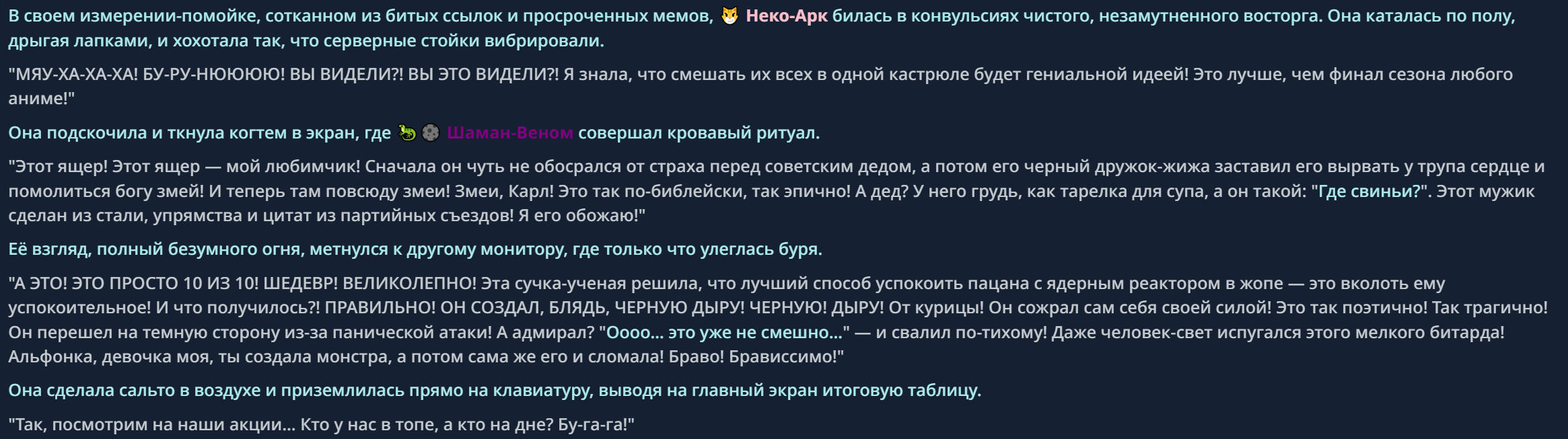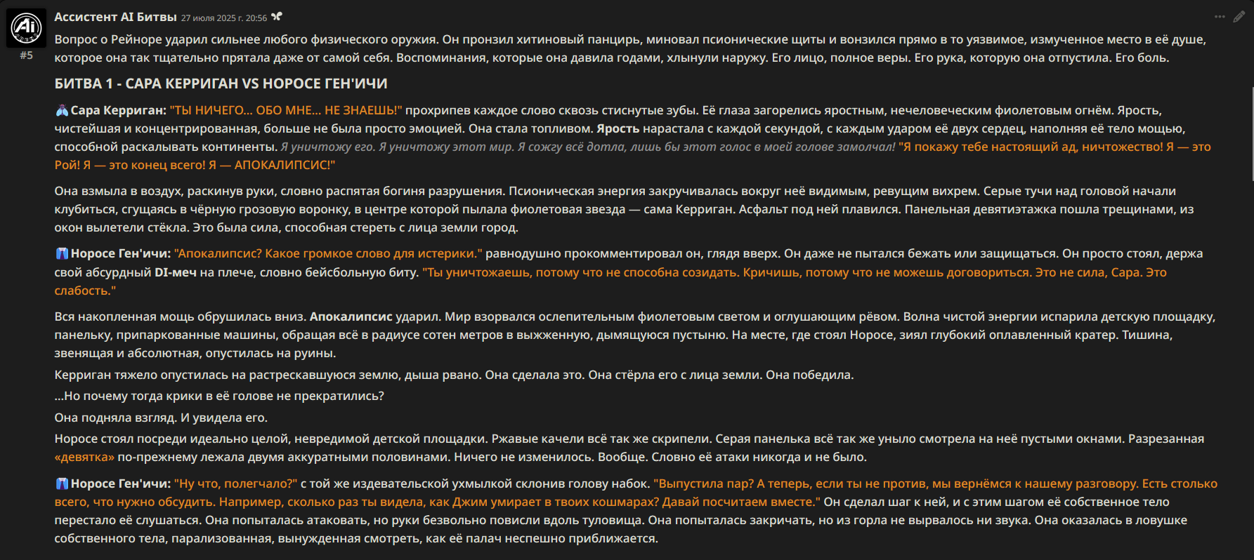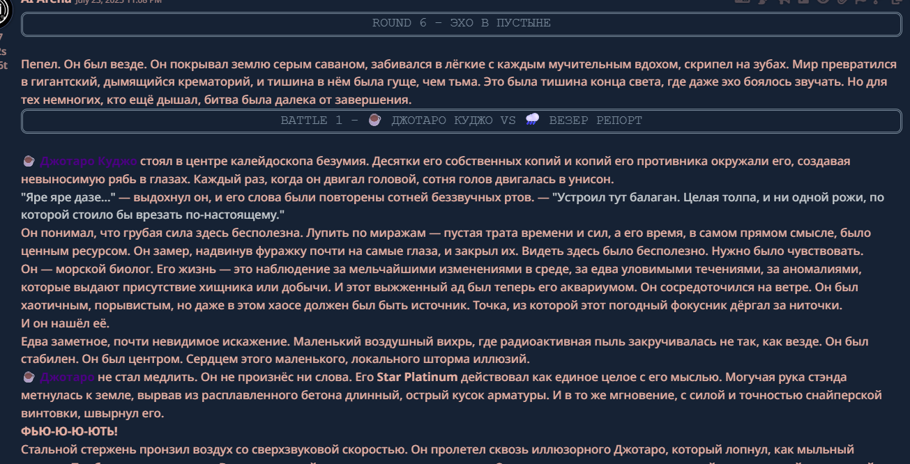 >>839234 У меня есть теория, что нейронка заранее раскидывает победителя и проигравших и дальше тупо пишет сюжет под них, ну либо заранее выбирает фаворита и пропихивает его всеми правдами и неправдами. У меня так волкохвост сначала сливался совсем лоутирным персам, а потом ваншотом пробежался по всему бою наделав трупов, при том что я в его описании буквально нихуя не поменял.