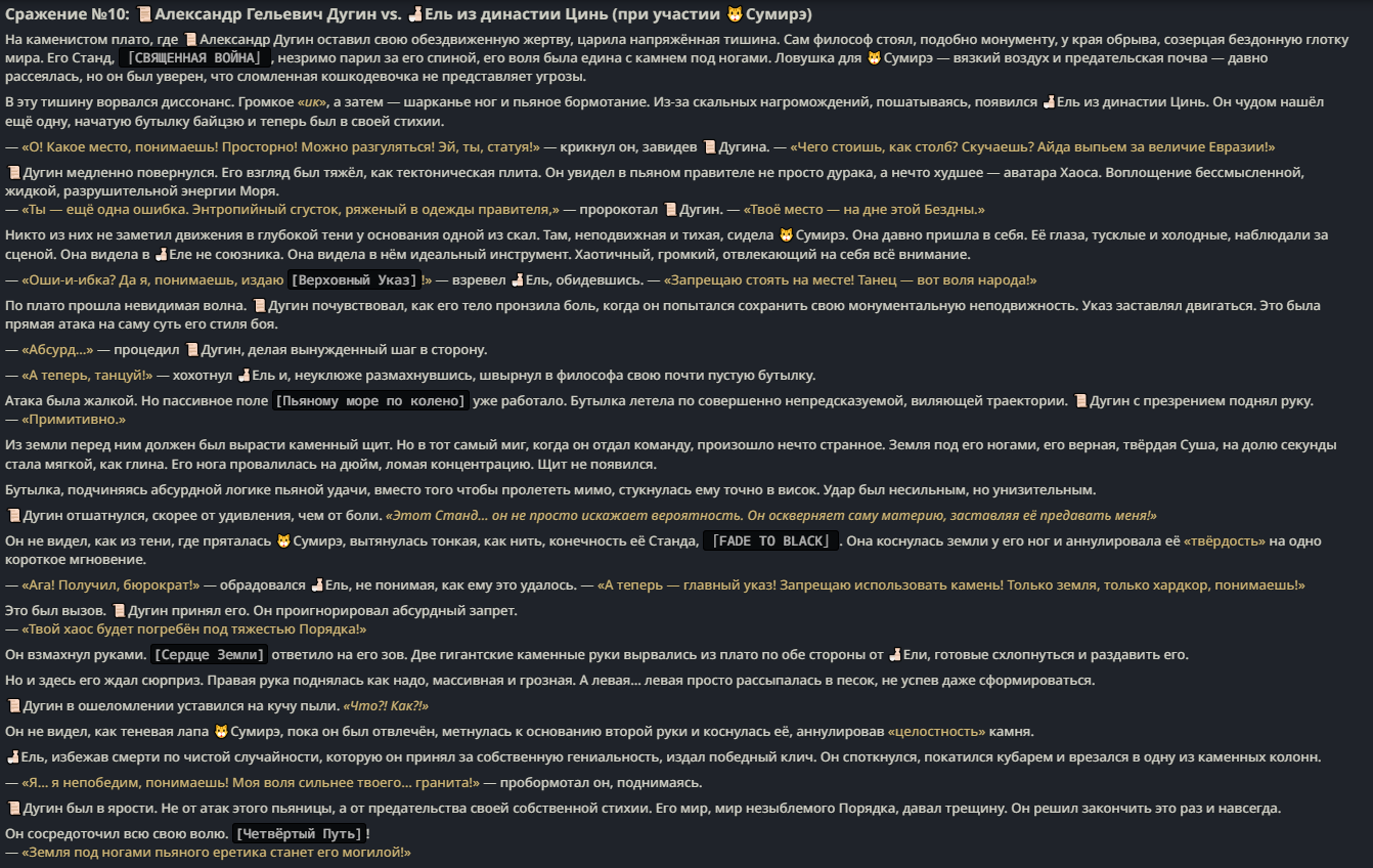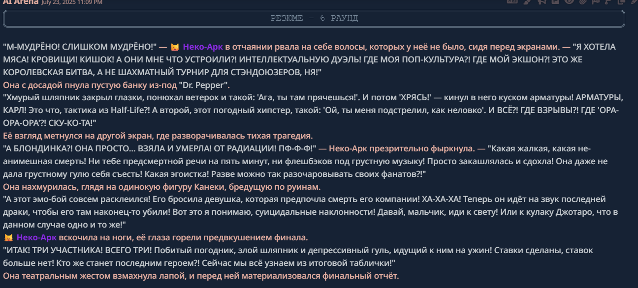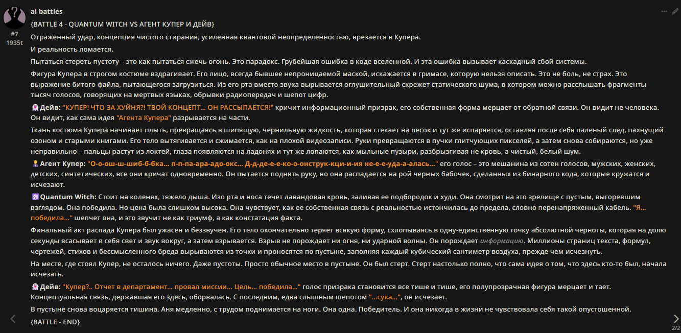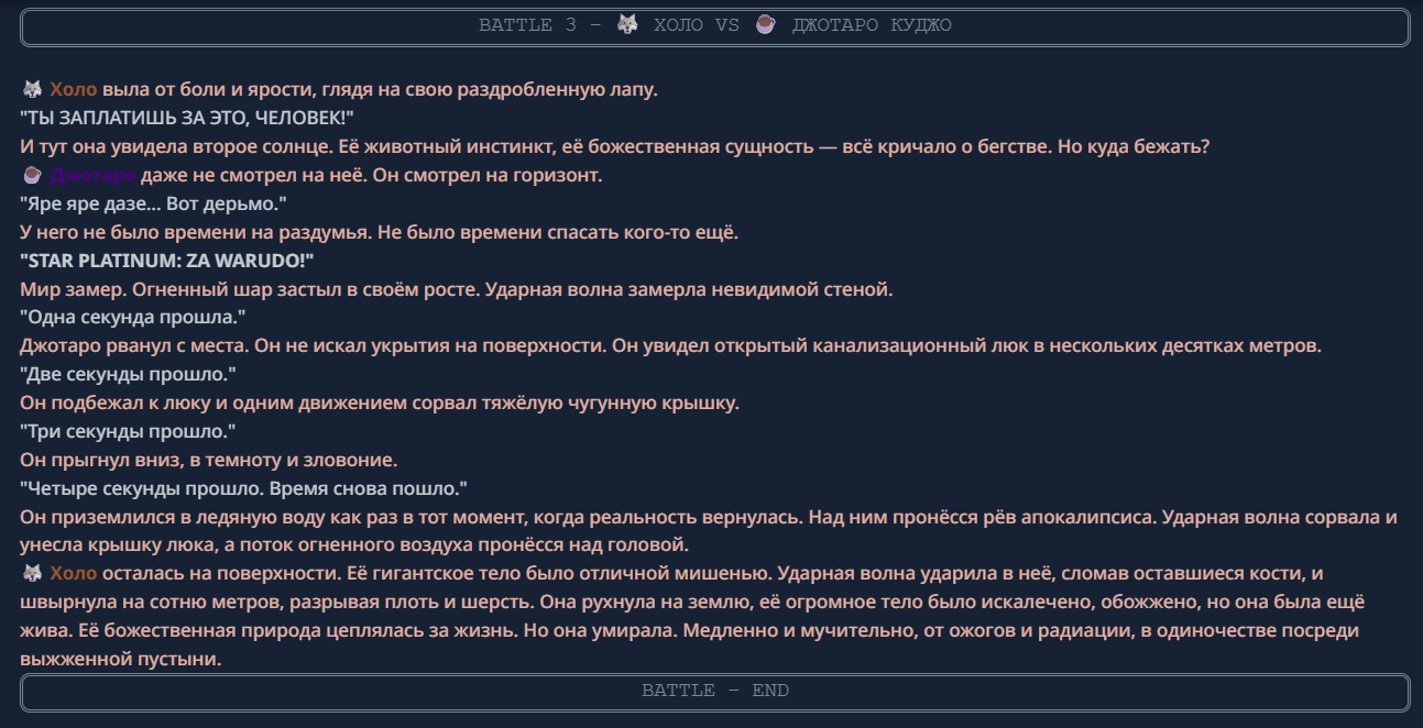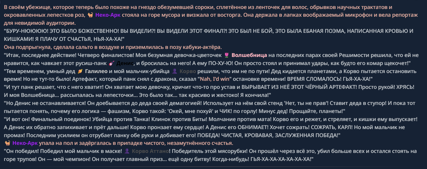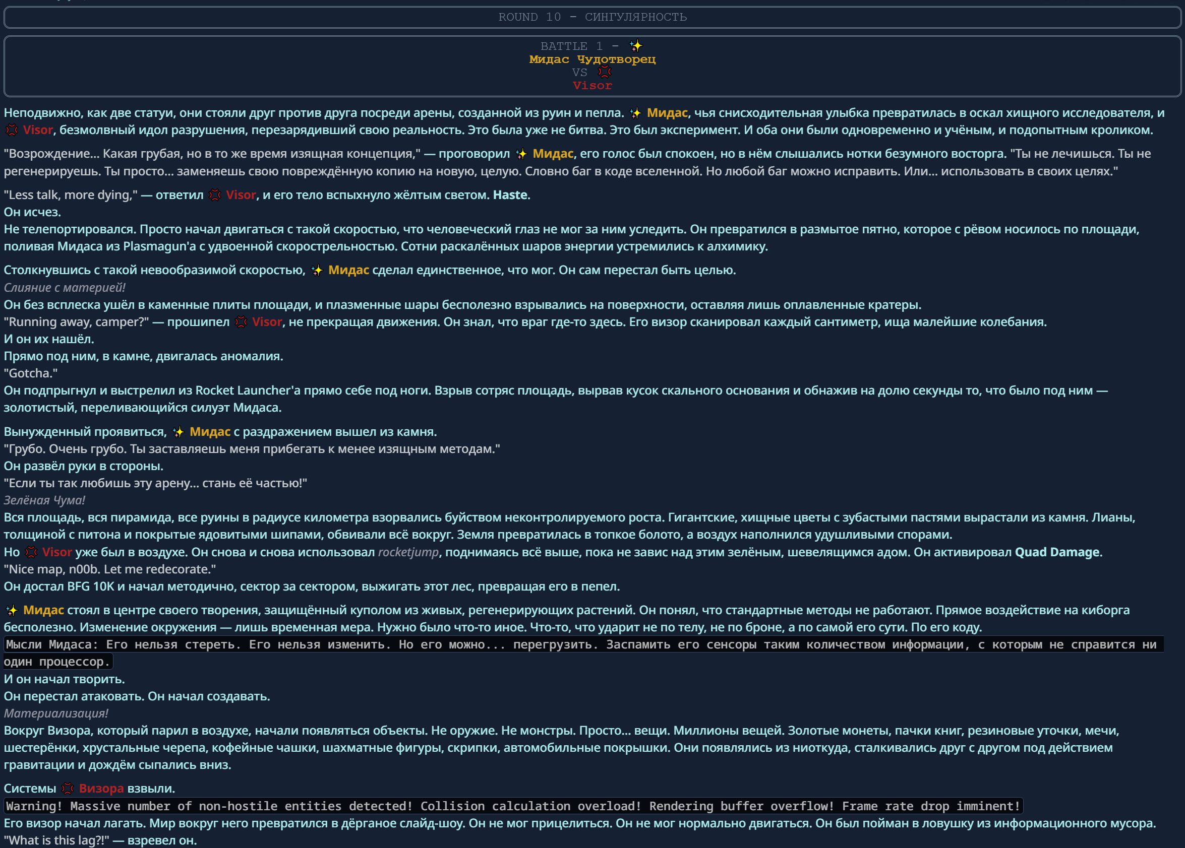 >>839234 У меня есть теория, что нейронка заранее раскидывает победителя и проигравших и дальше тупо пишет сюжет под них, ну либо заранее выбирает фаворита и пропихивает его всеми правдами и неправдами. У меня так волкохвост сначала сливался совсем лоутирным персам, а потом ваншотом пробежался по всему бою наделав трупов, при том что я в его описании буквально нихуя не поменял.