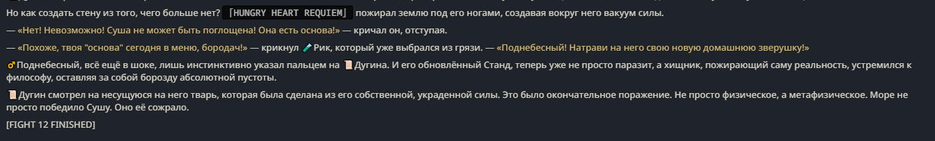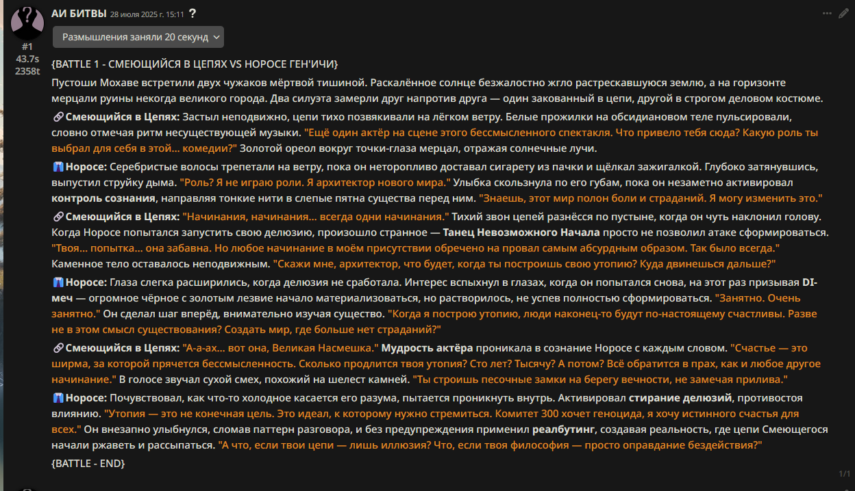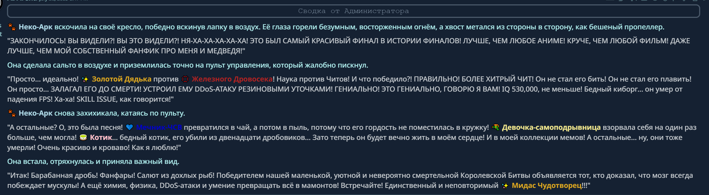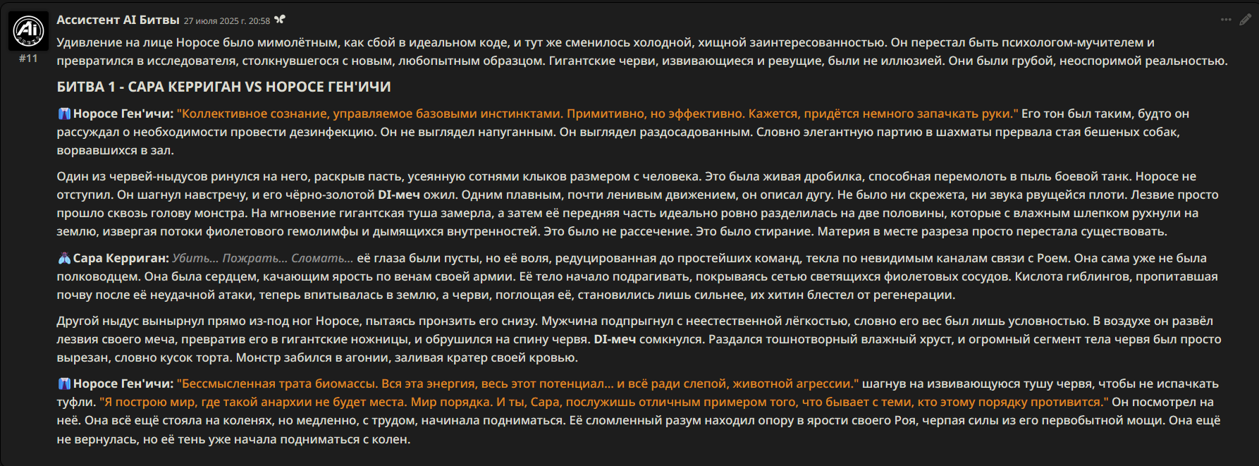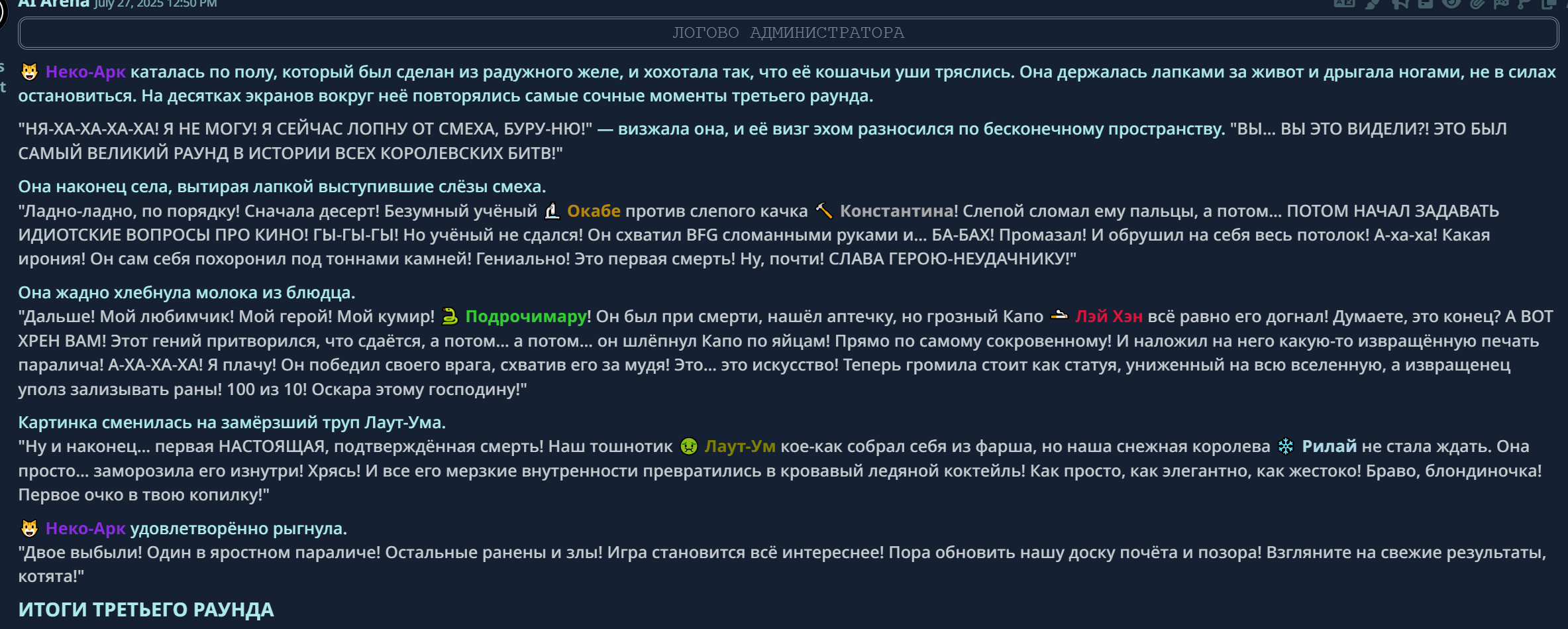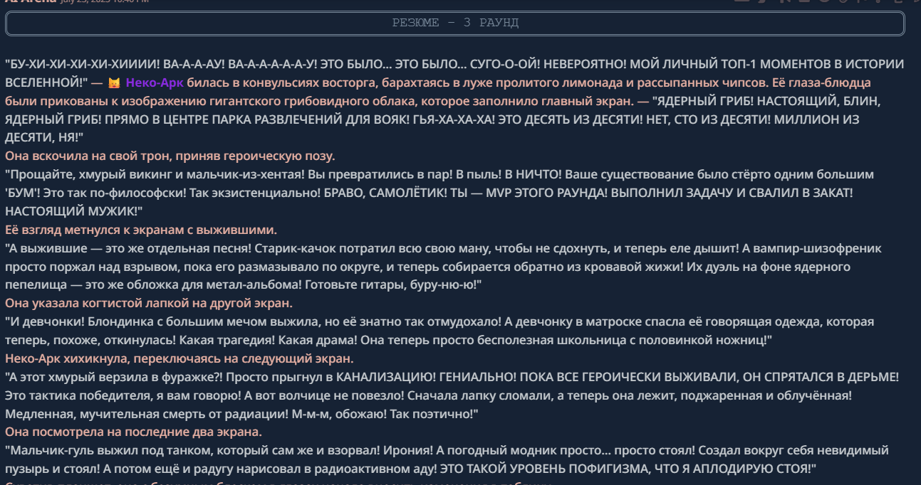 >>839234 У меня есть теория, что нейронка заранее раскидывает победителя и проигравших и дальше тупо пишет сюжет под них, ну либо заранее выбирает фаворита и пропихивает его всеми правдами и неправдами. У меня так волкохвост сначала сливался совсем лоутирным персам, а потом ваншотом пробежался по всему бою наделав трупов, при том что я в его описании буквально нихуя не поменял.