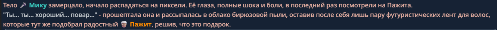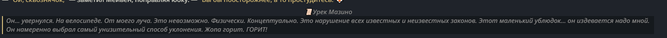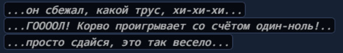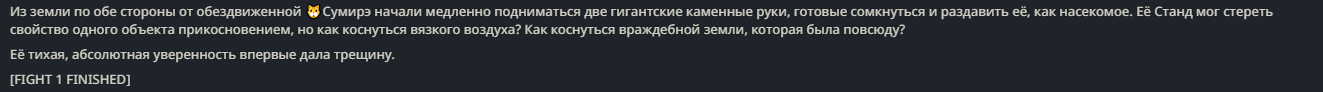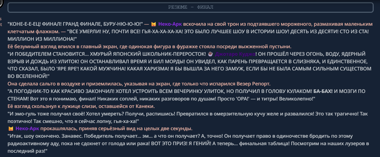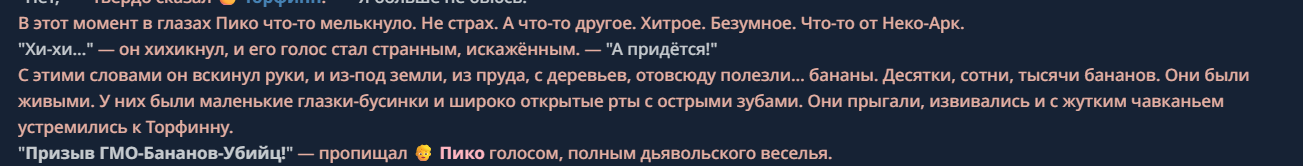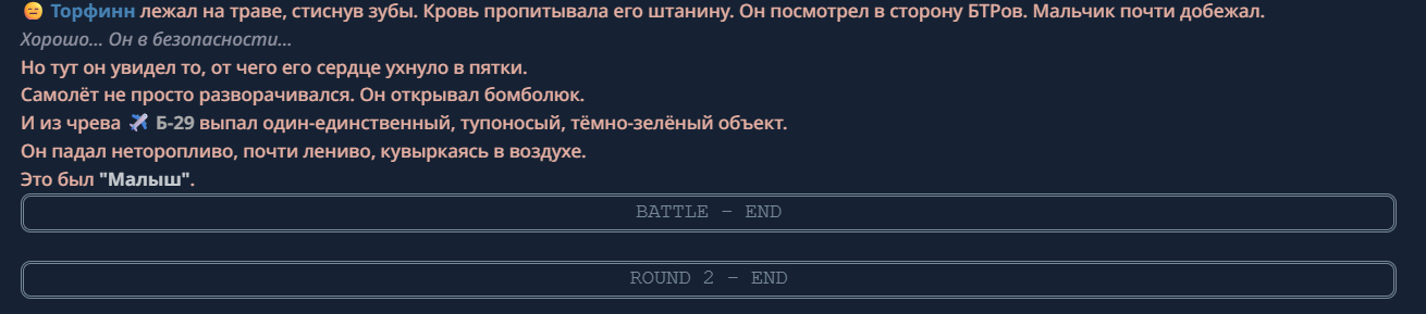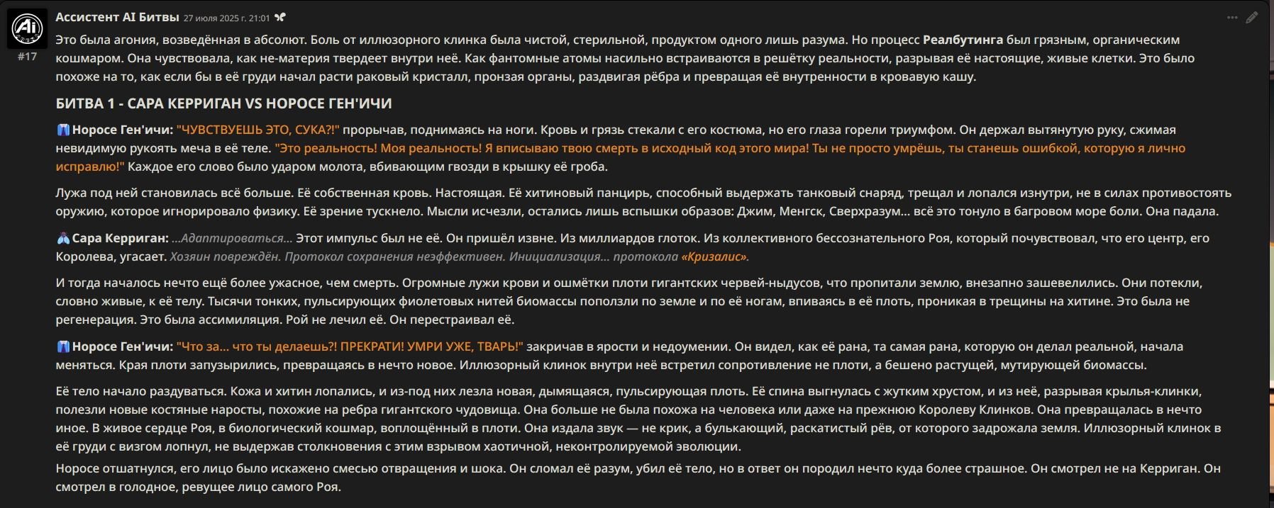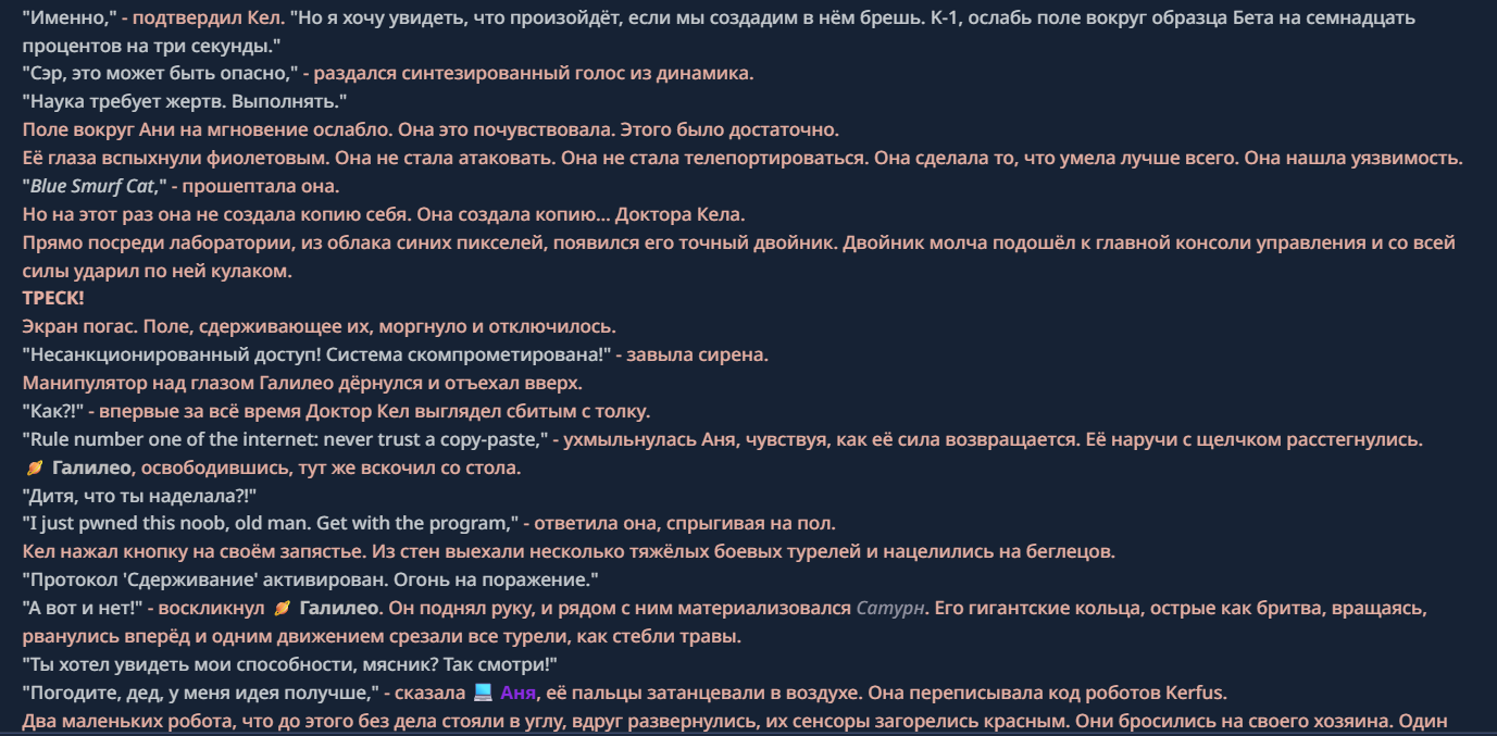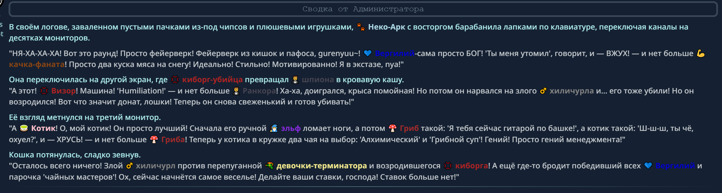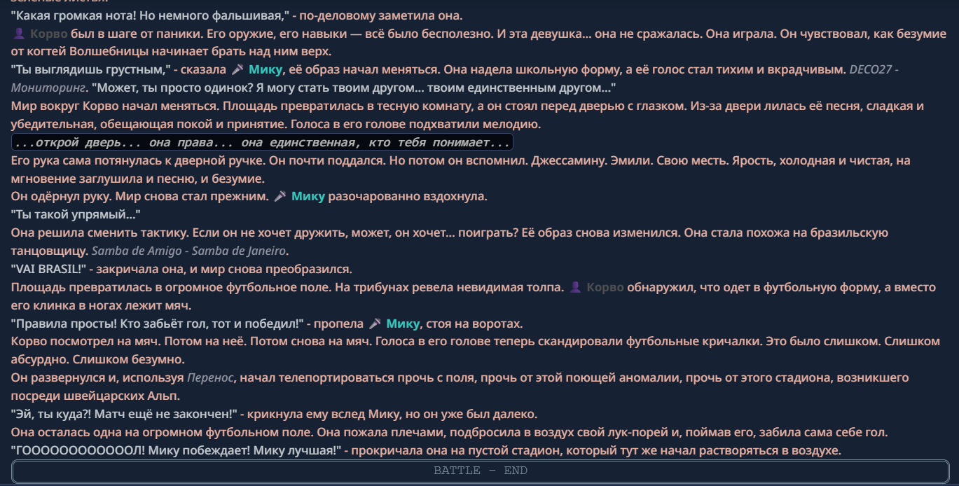 >>839234 У меня есть теория, что нейронка заранее раскидывает победителя и проигравших и дальше тупо пишет сюжет под них, ну либо заранее выбирает фаворита и пропихивает его всеми правдами и неправдами. У меня так волкохвост сначала сливался совсем лоутирным персам, а потом ваншотом пробежался по всему бою наделав трупов, при том что я в его описании буквально нихуя не поменял.