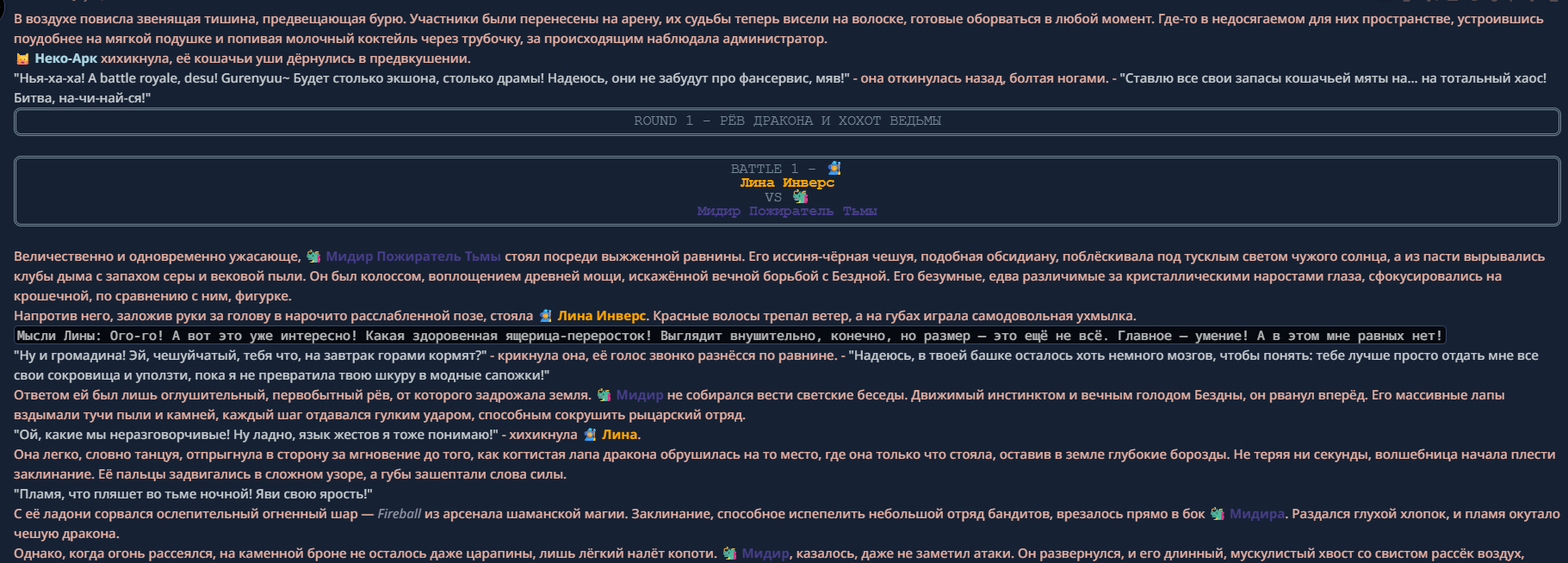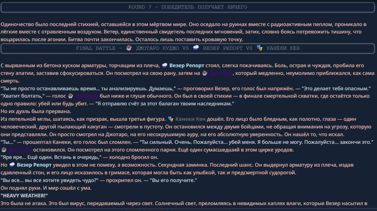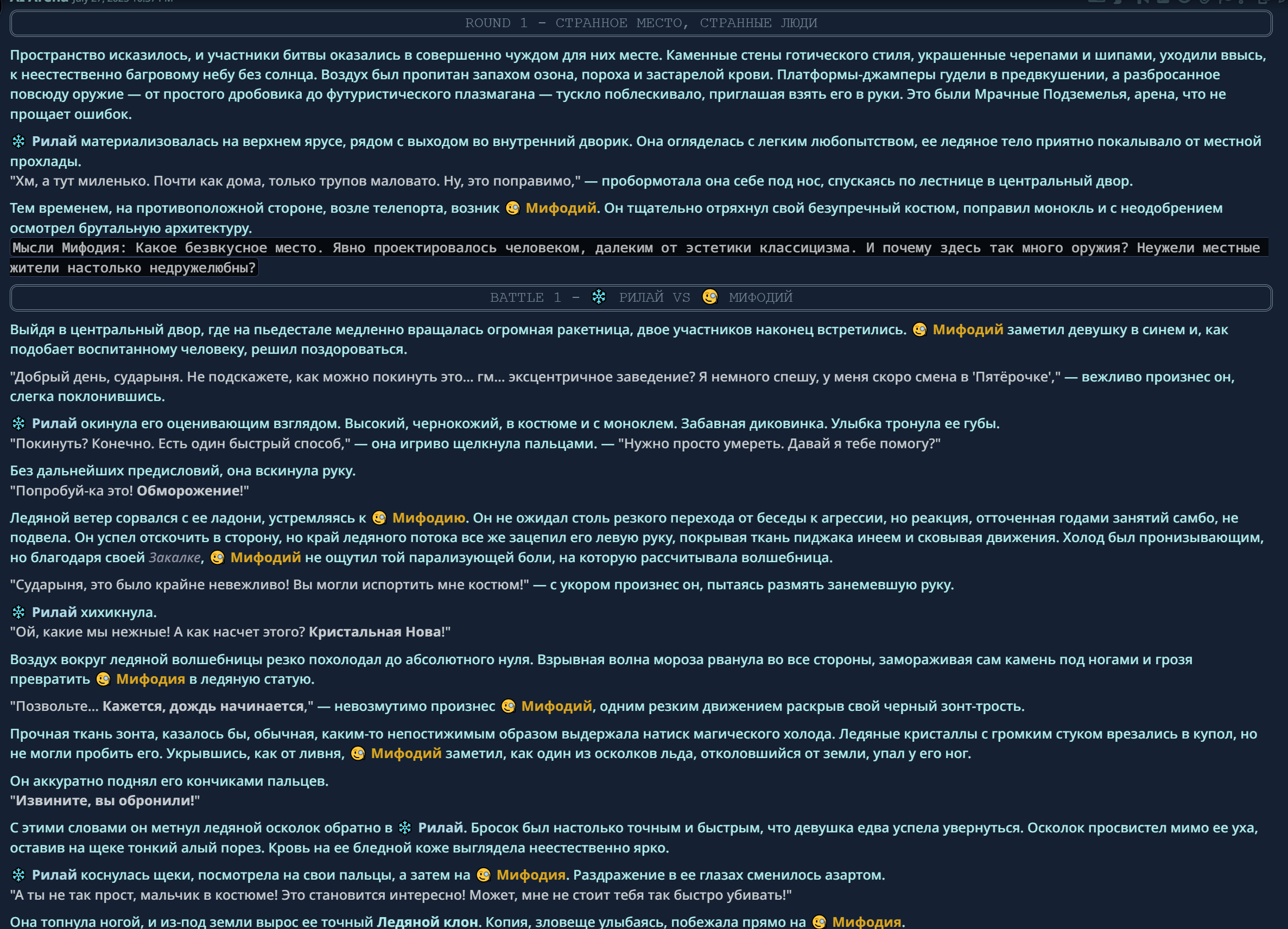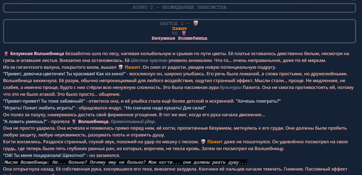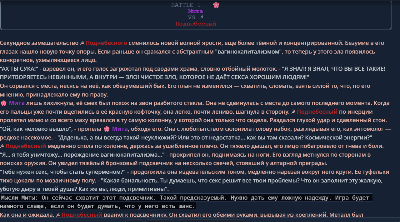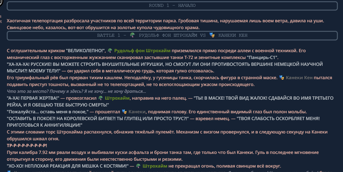 >>841547 Я просто перед каждым раундом вот это пишу нейронке и она логически сама выбирает кто с кем должен пиздиться.