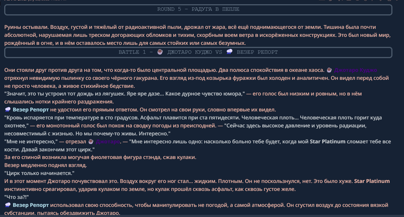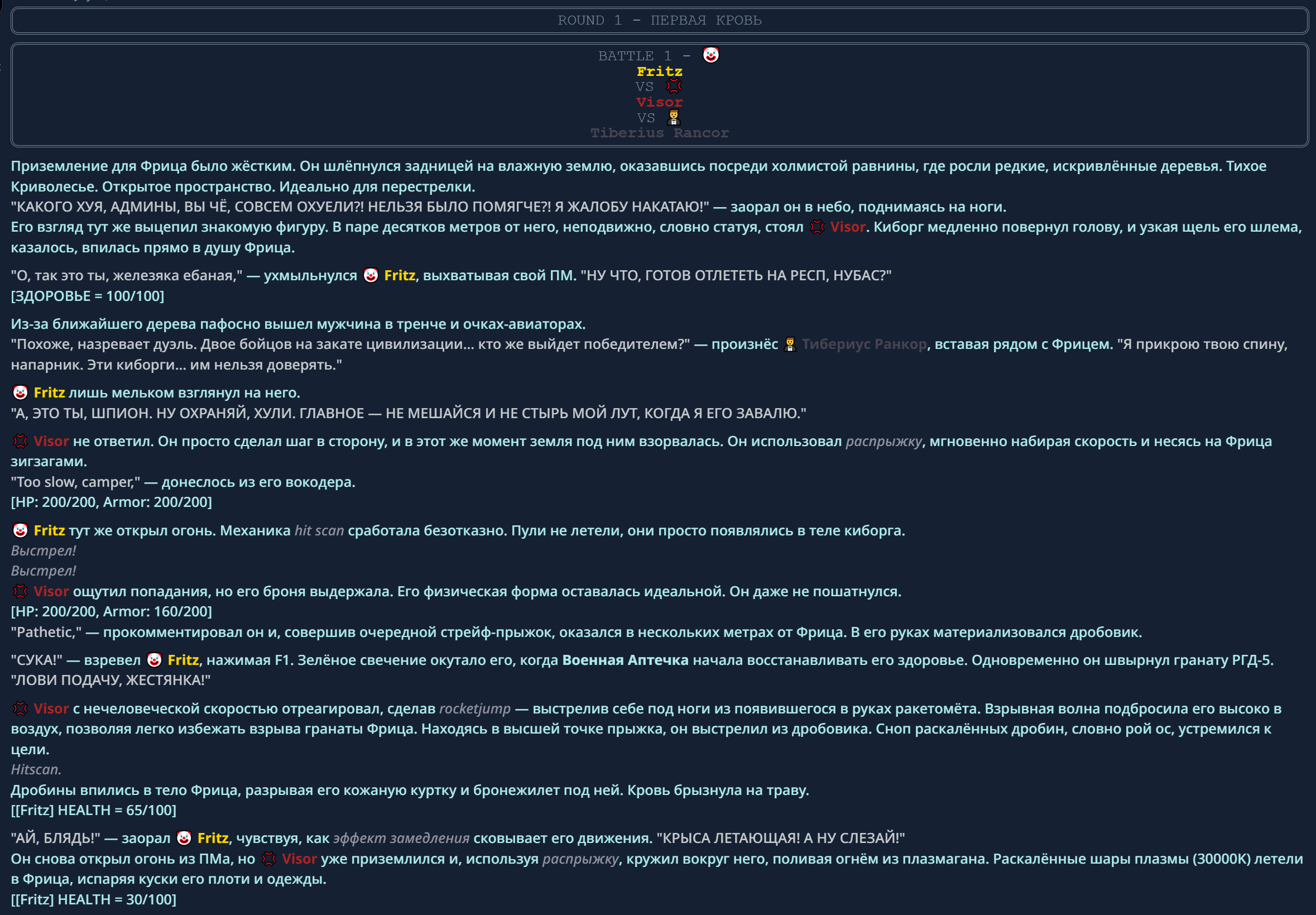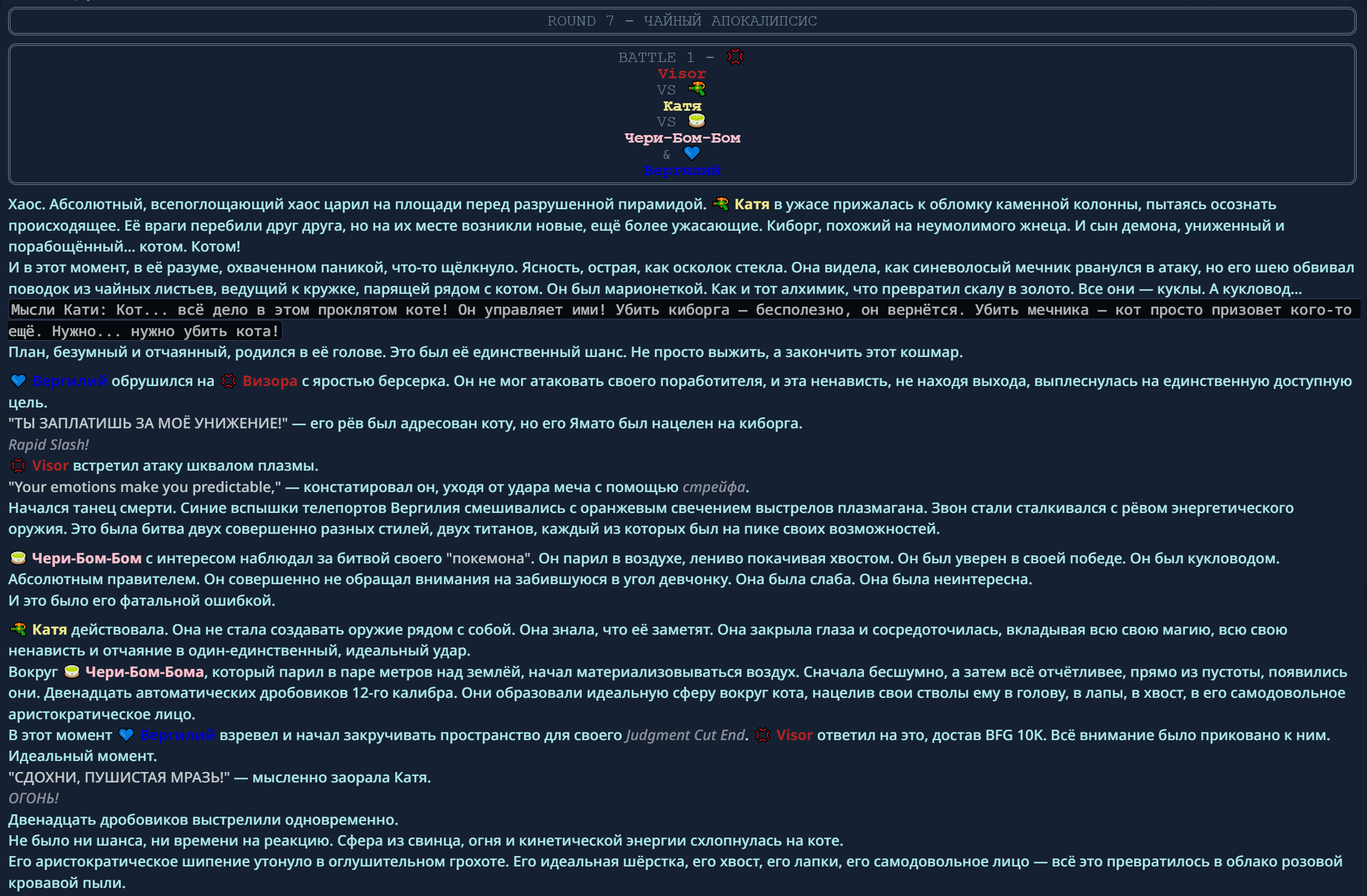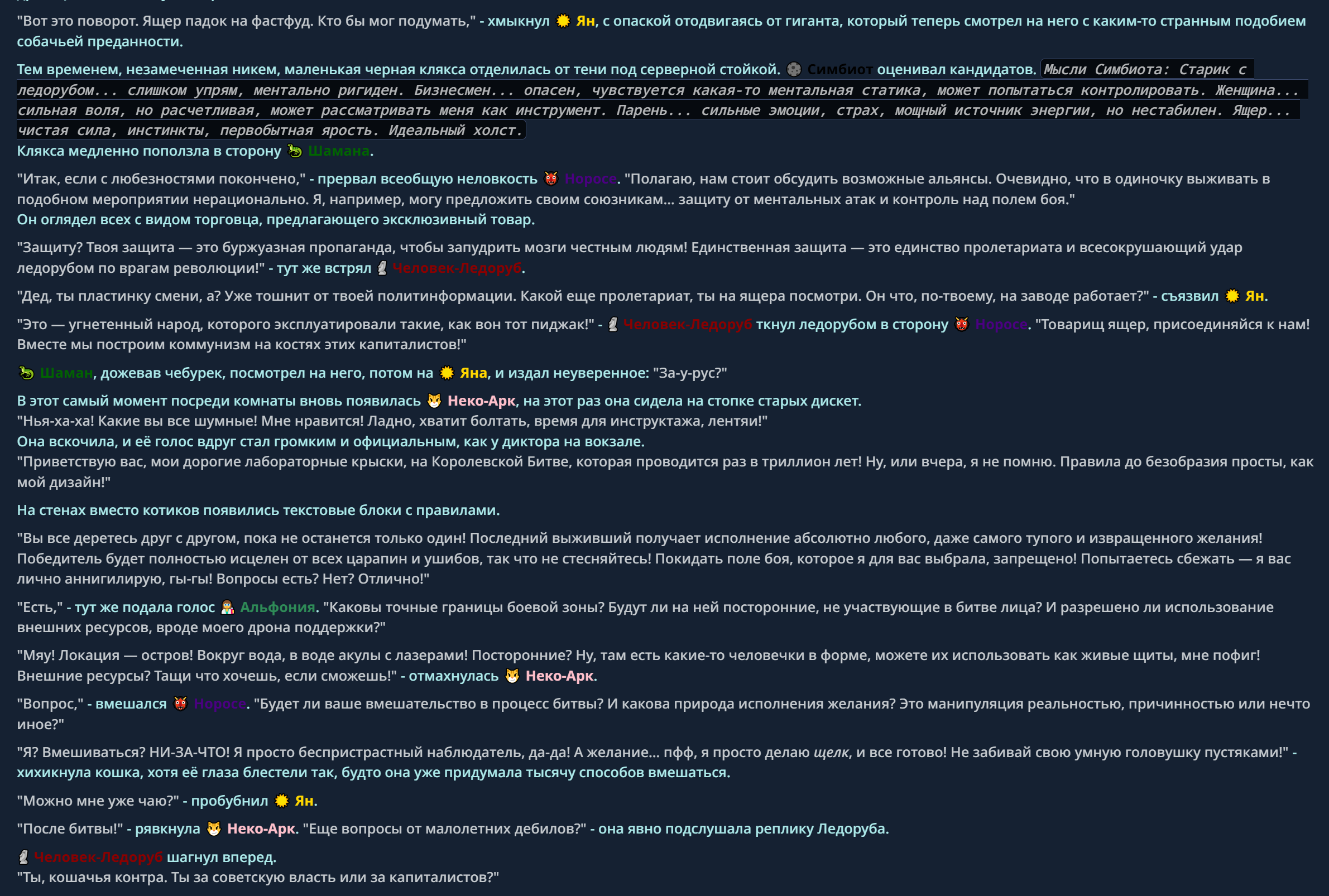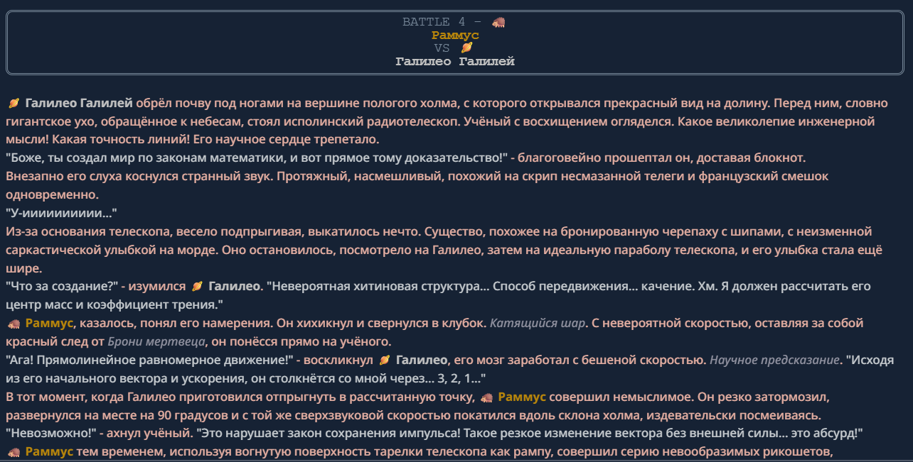 >>841547 Я просто перед каждым раундом вот это пишу нейронке и она логически сама выбирает кто с кем должен пиздиться.