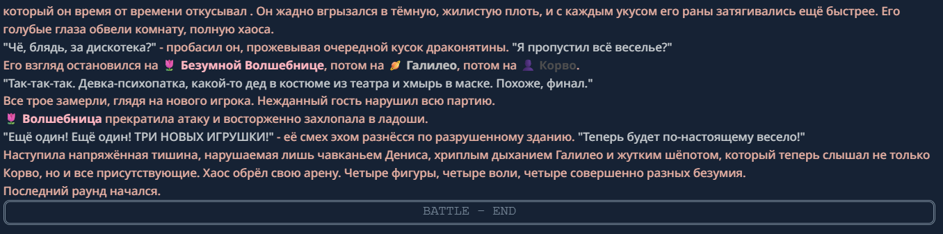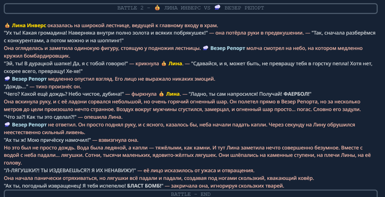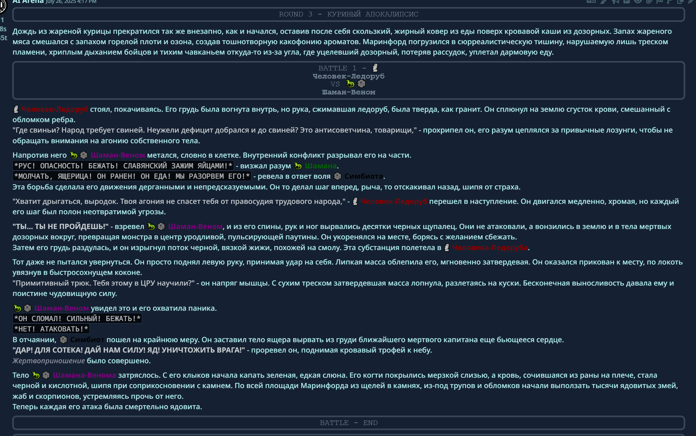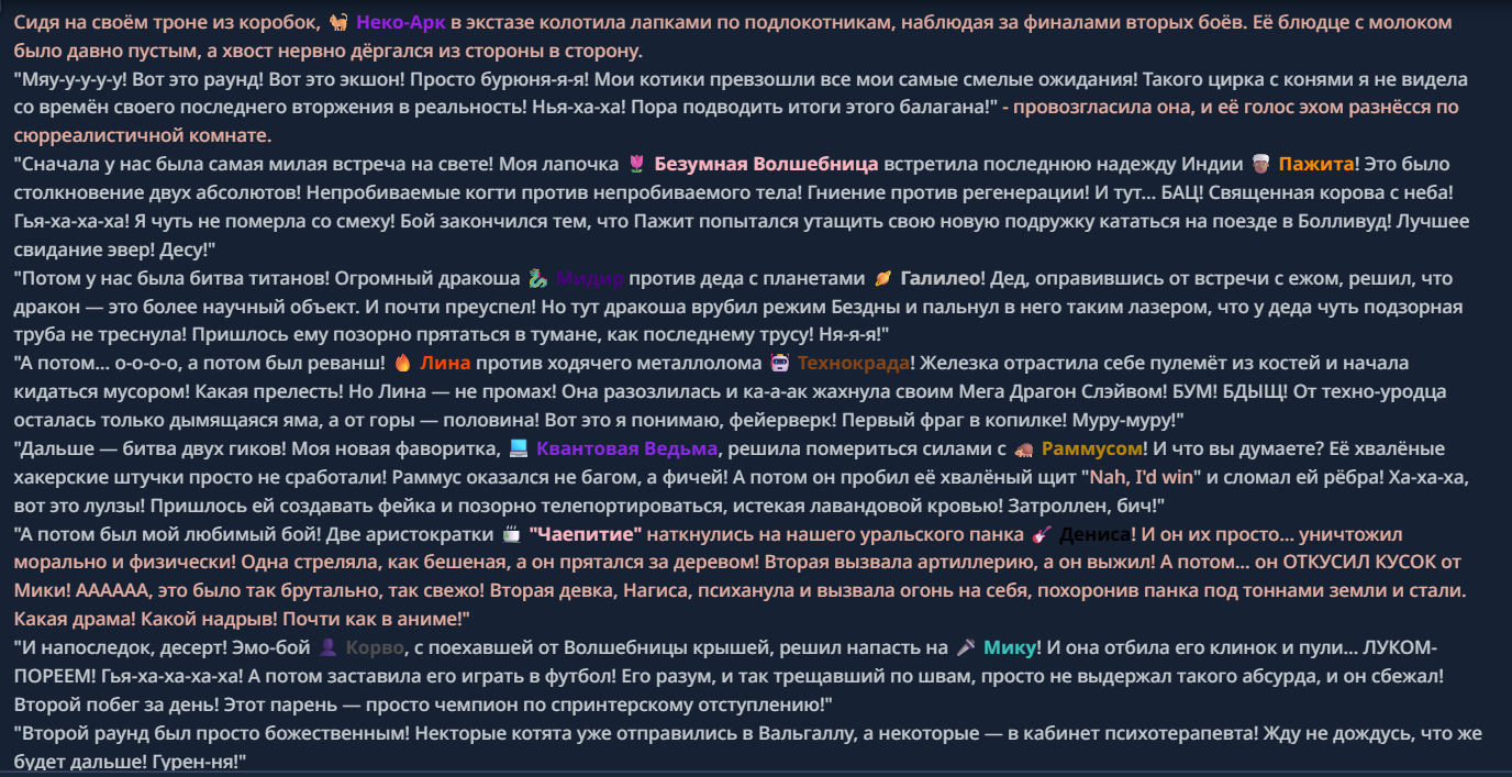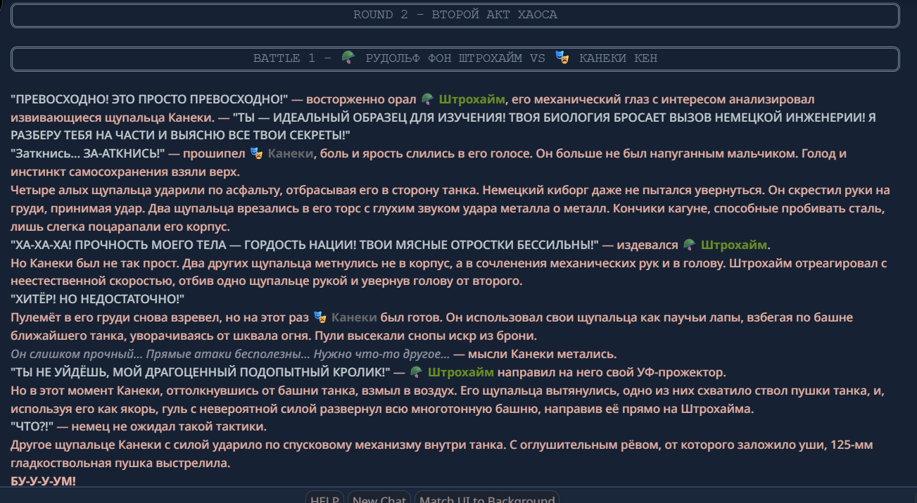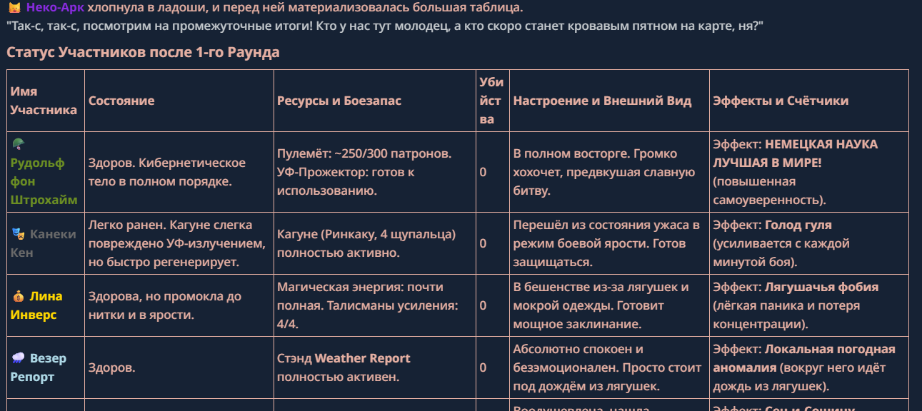 >>841547 Я просто перед каждым раундом вот это пишу нейронке и она логически сама выбирает кто с кем должен пиздиться.
