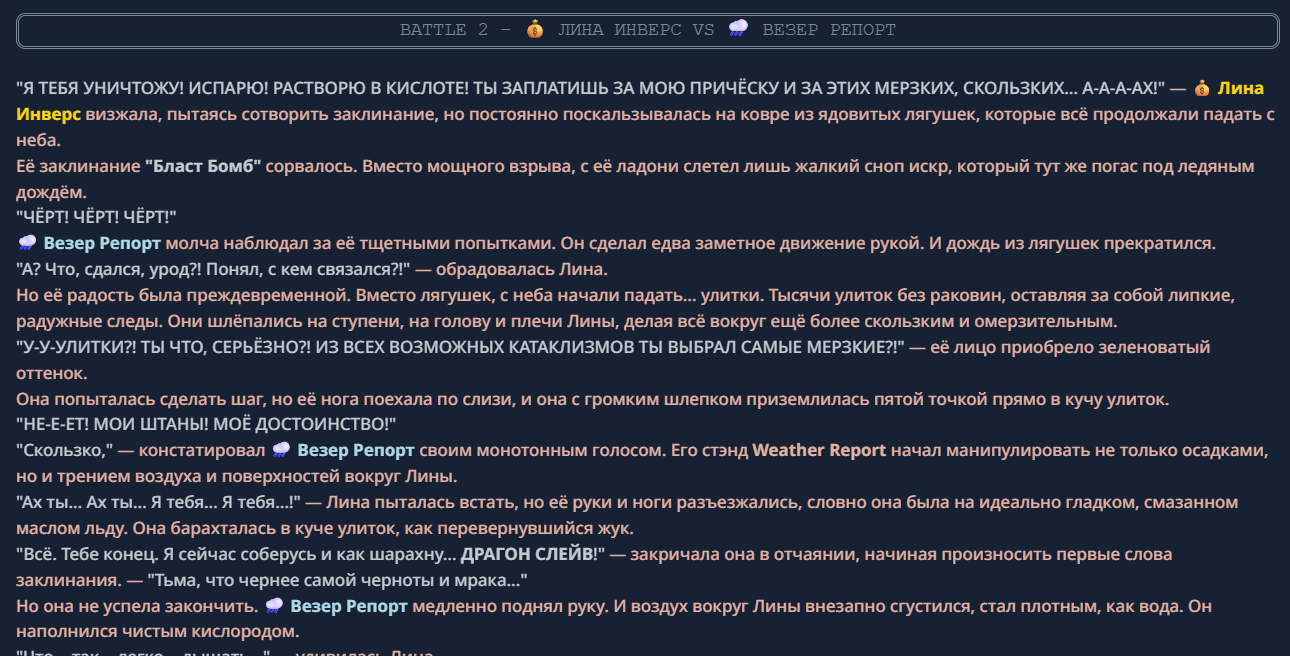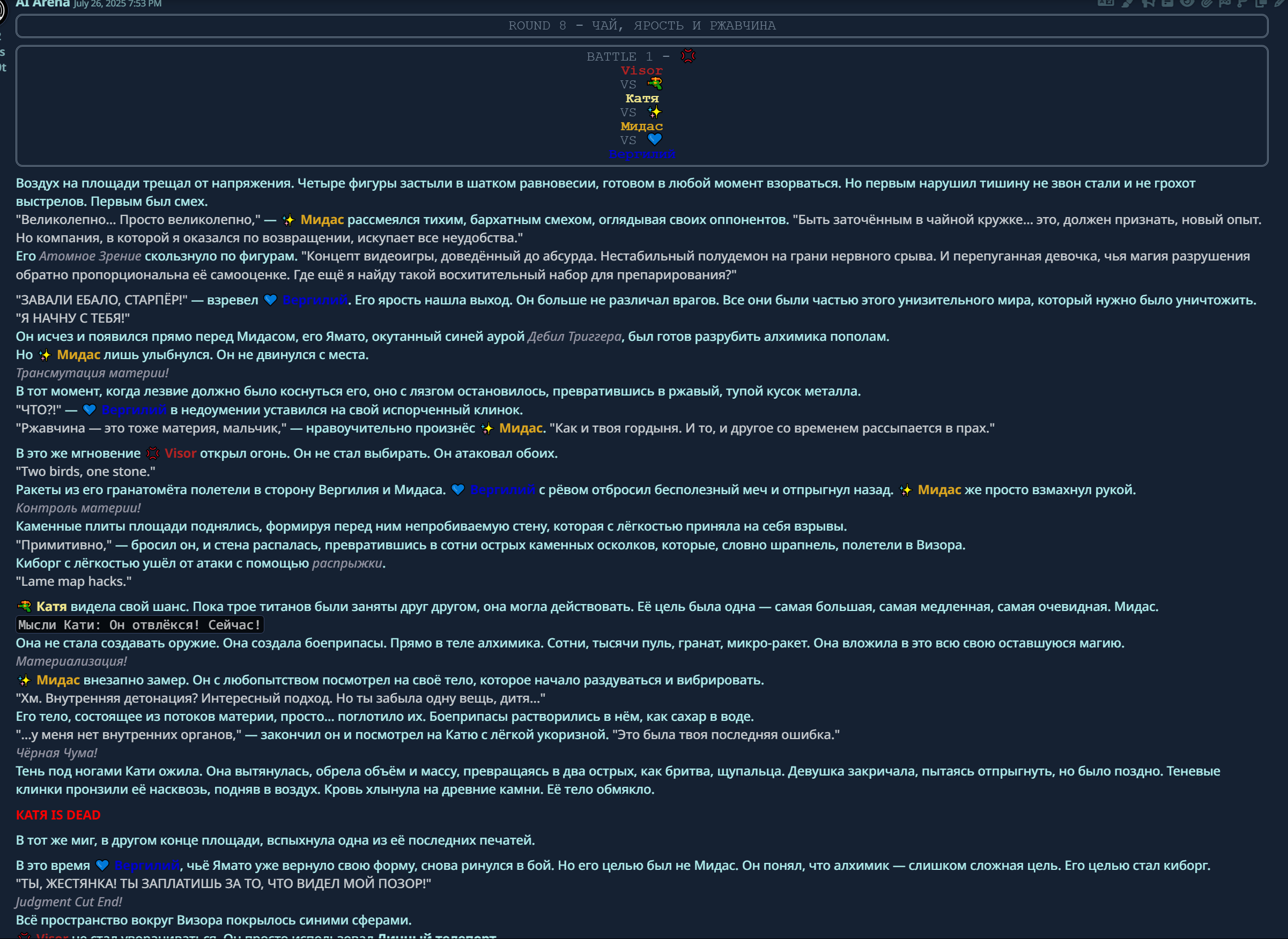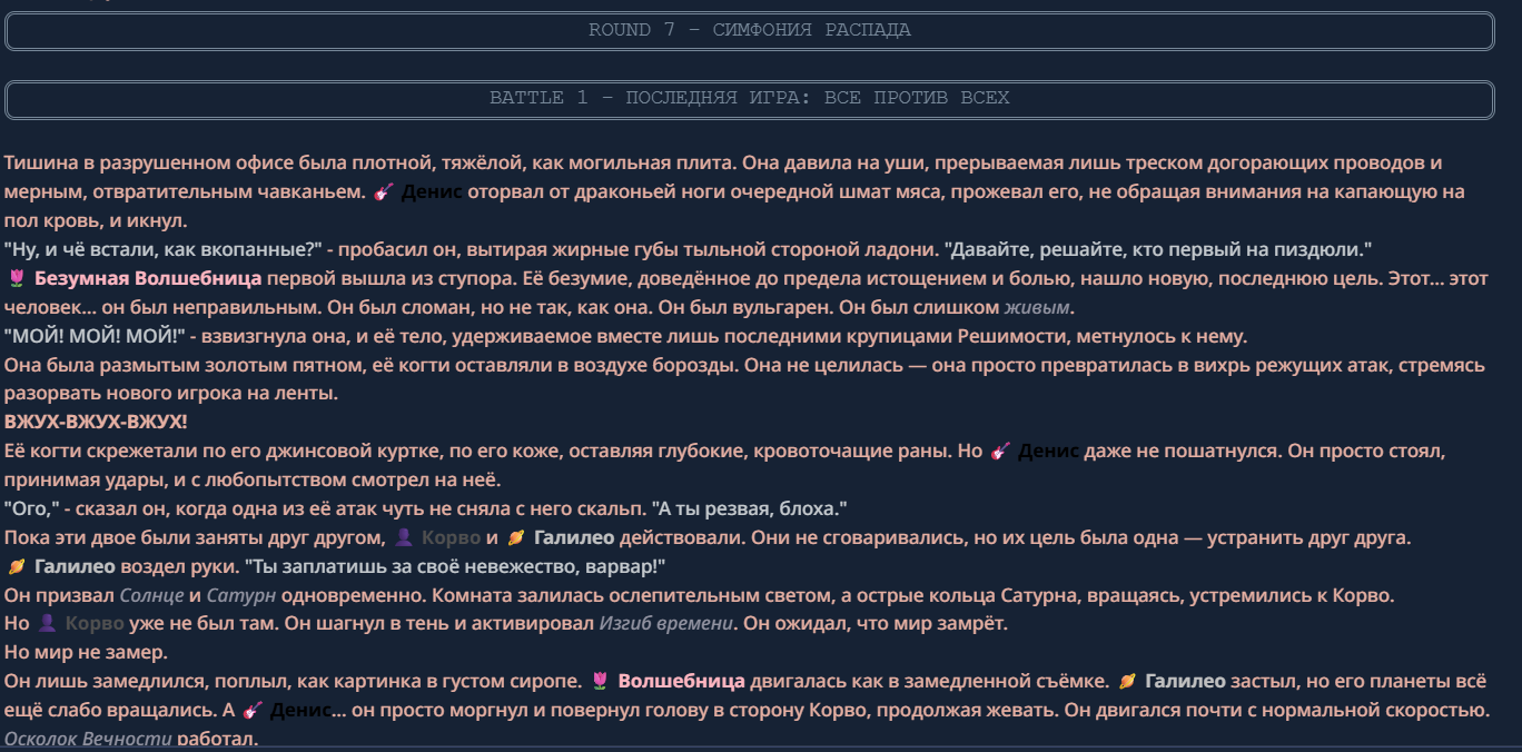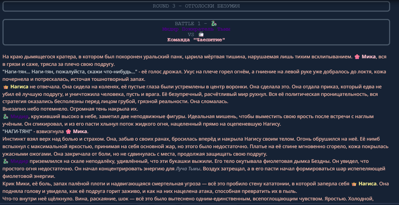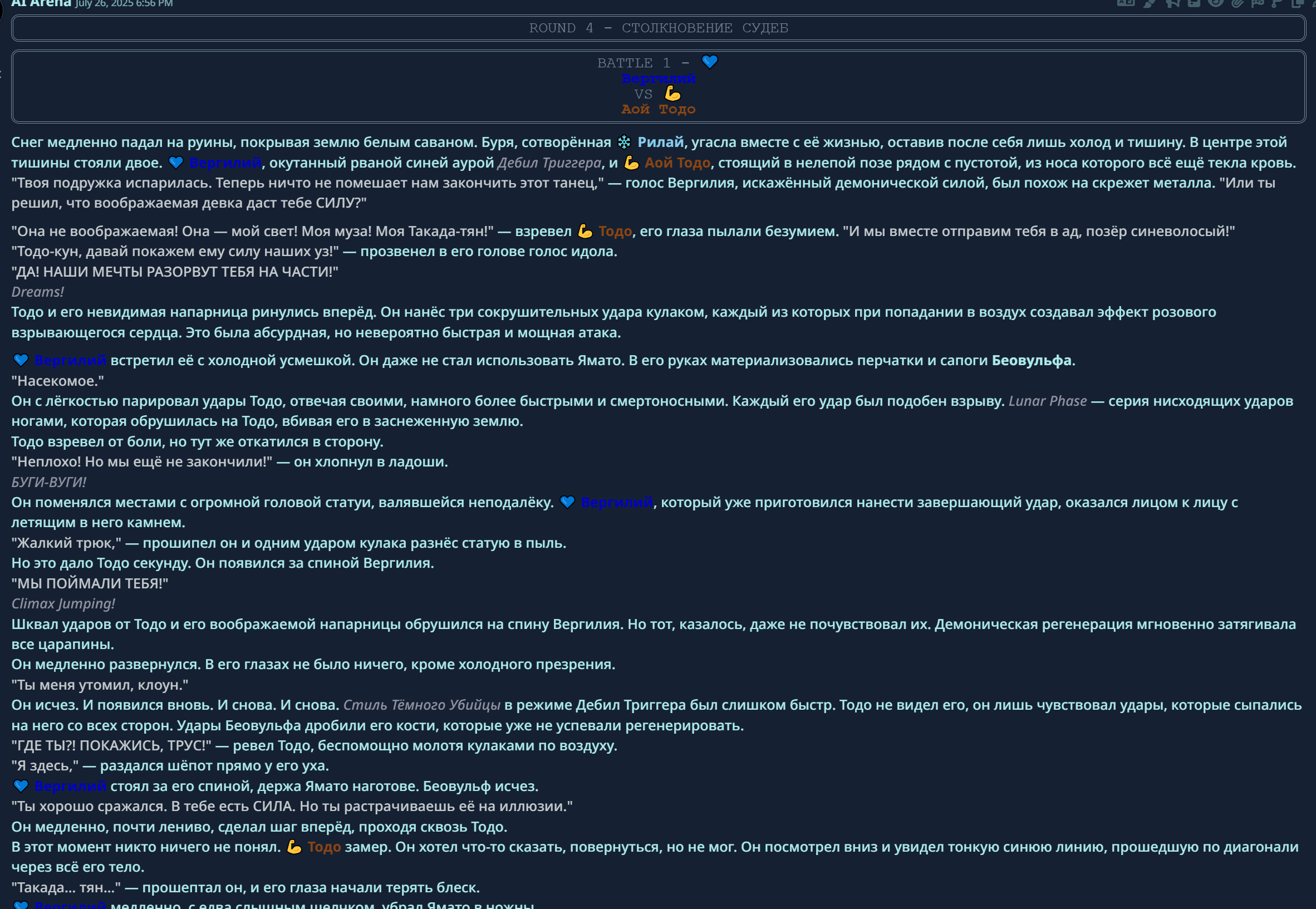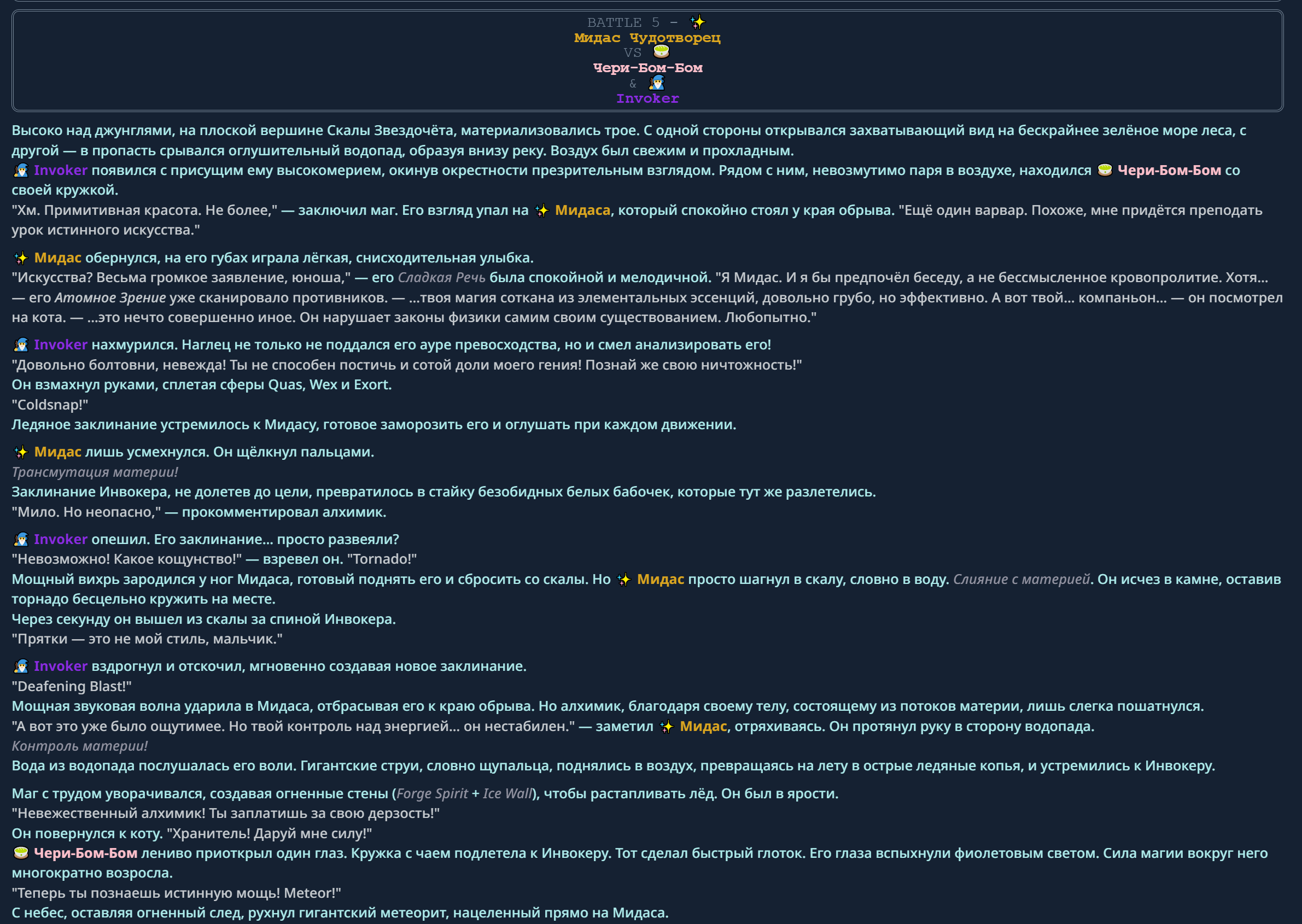 >>841547 Я просто перед каждым раундом вот это пишу нейронке и она логически сама выбирает кто с кем должен пиздиться.