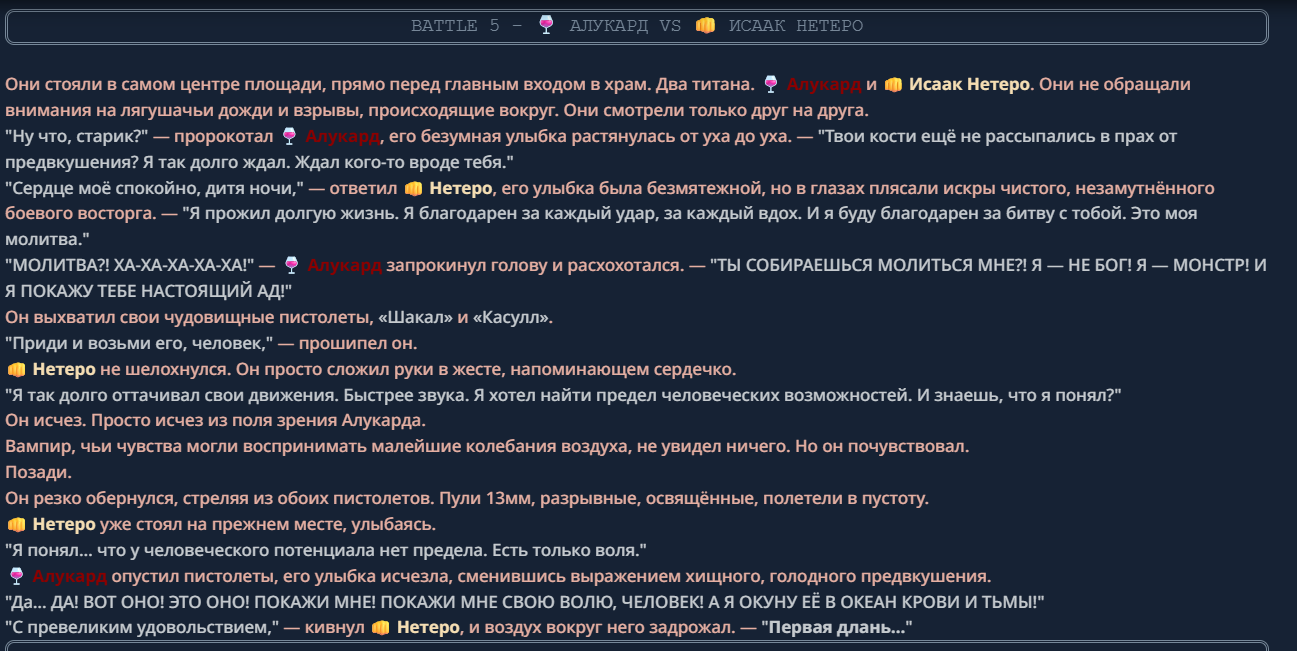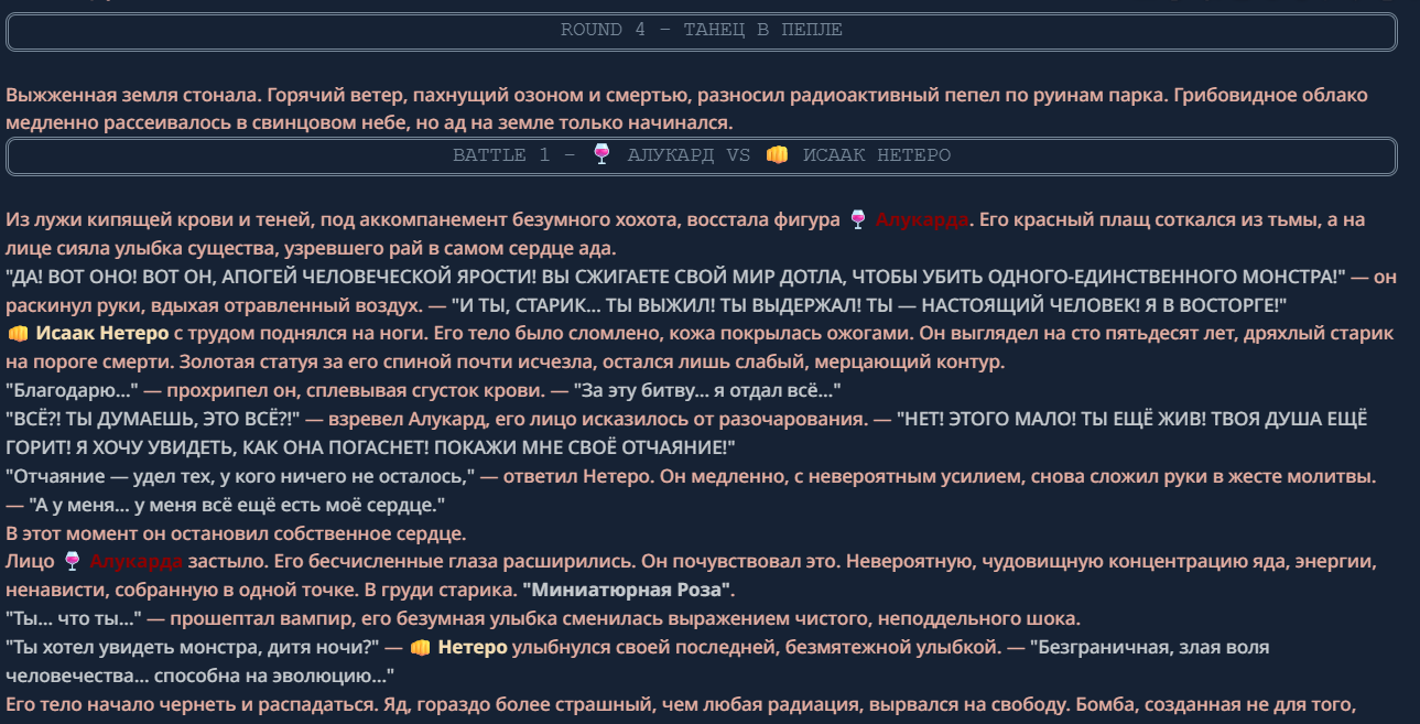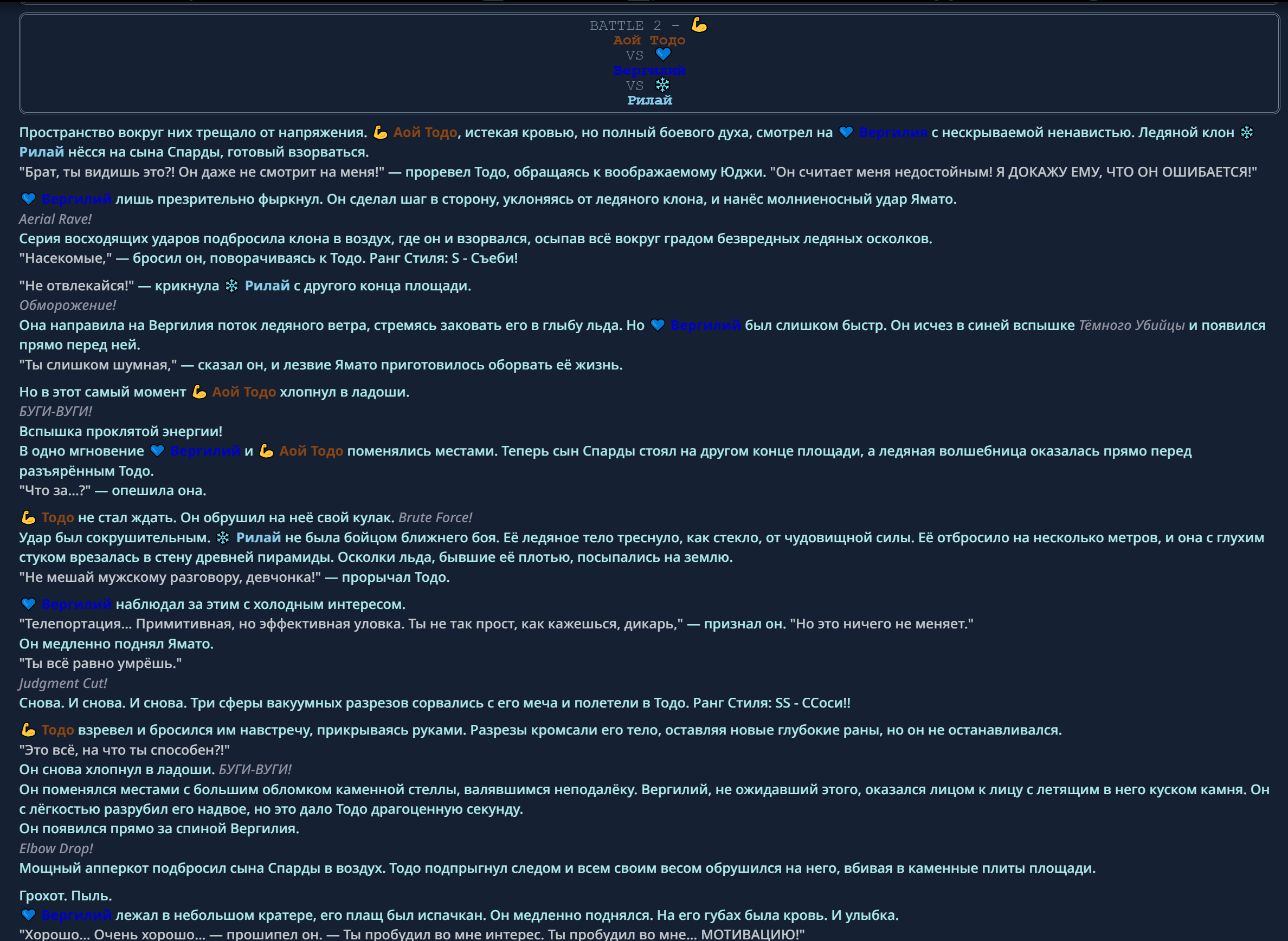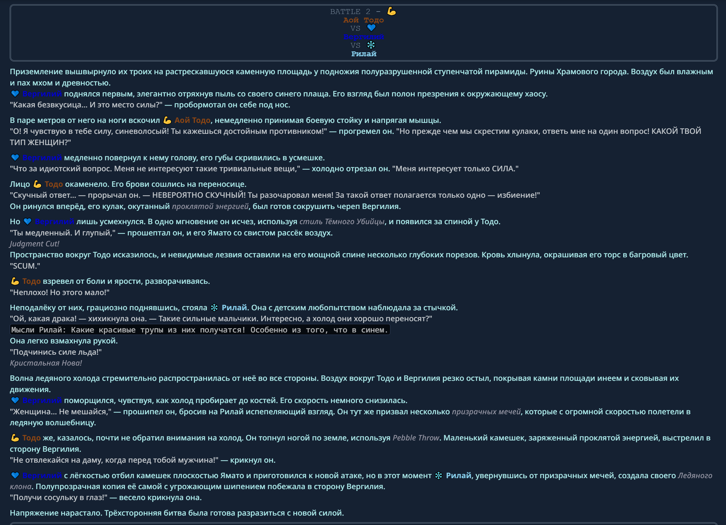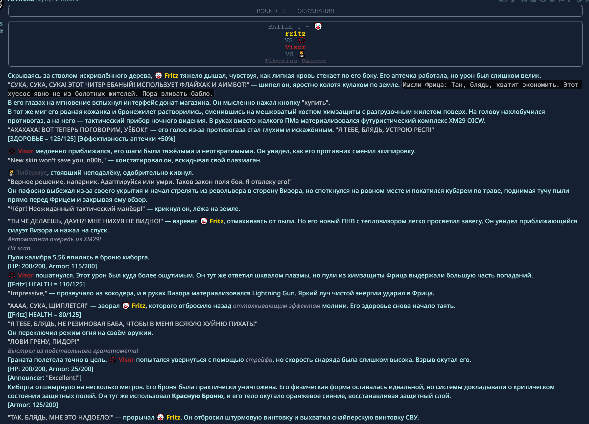 >>841547 Я просто перед каждым раундом вот это пишу нейронке и она логически сама выбирает кто с кем должен пиздиться.