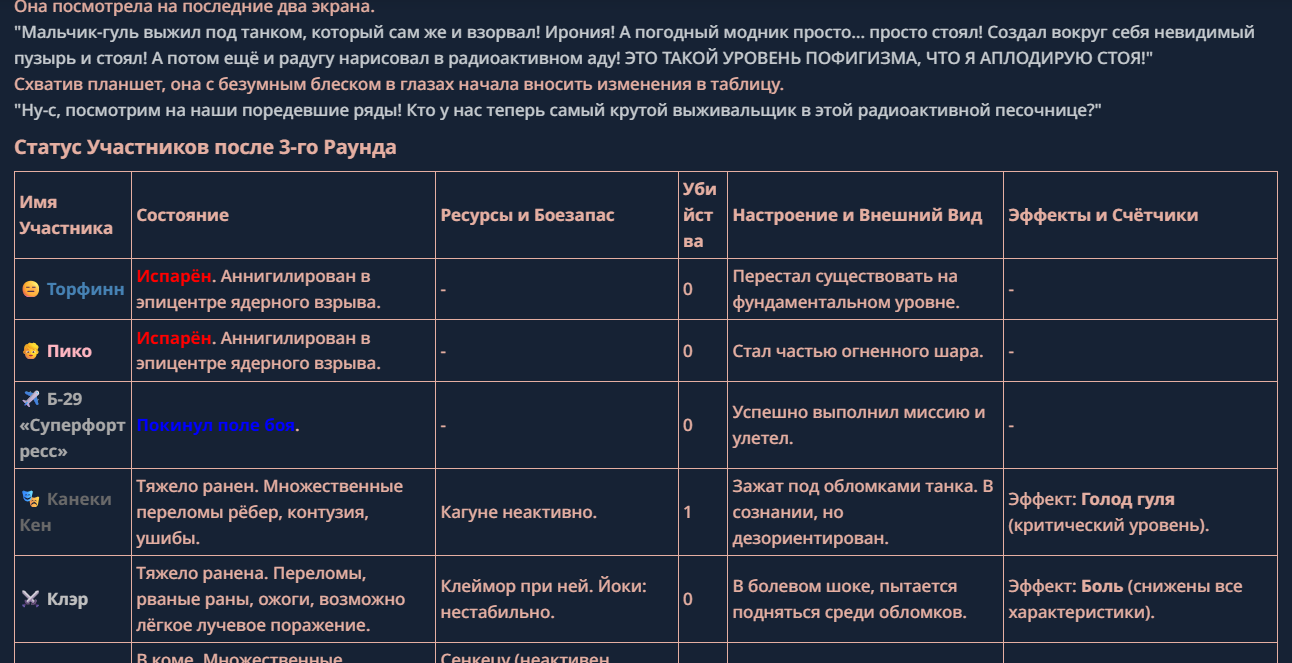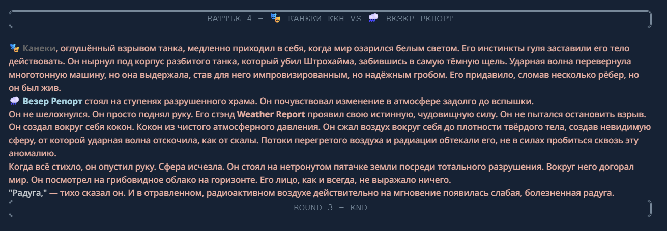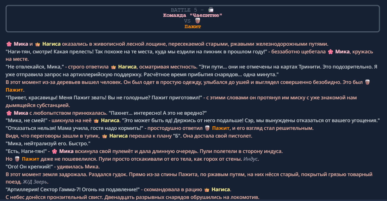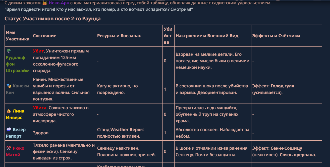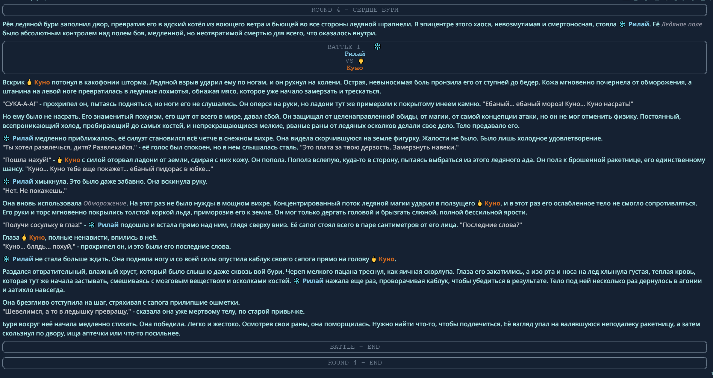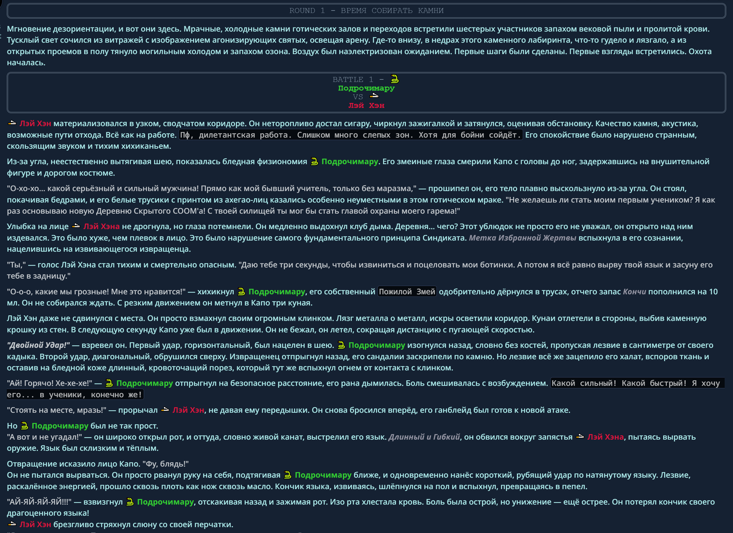 >>841547 Я просто перед каждым раундом вот это пишу нейронке и она логически сама выбирает кто с кем должен пиздиться.
