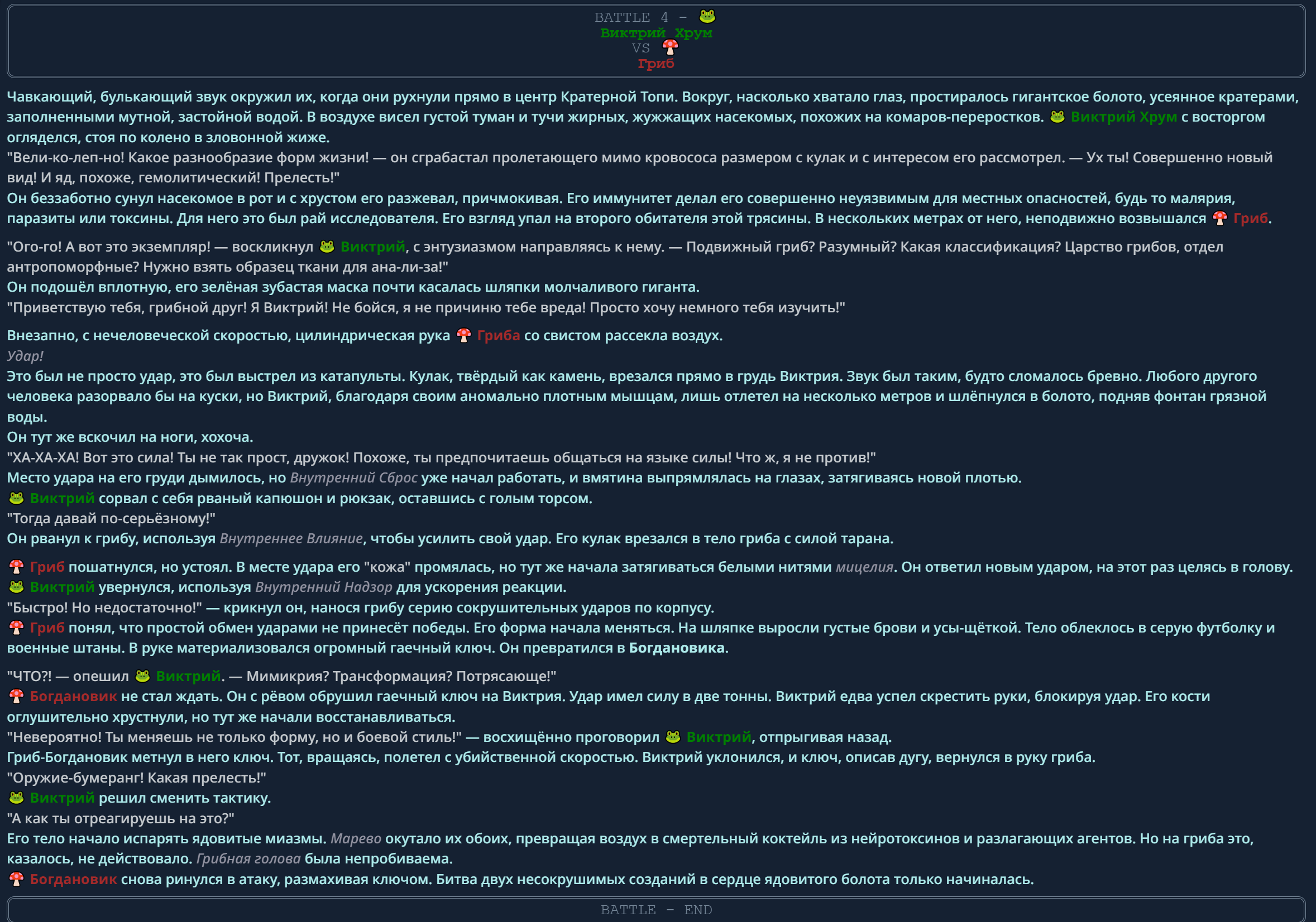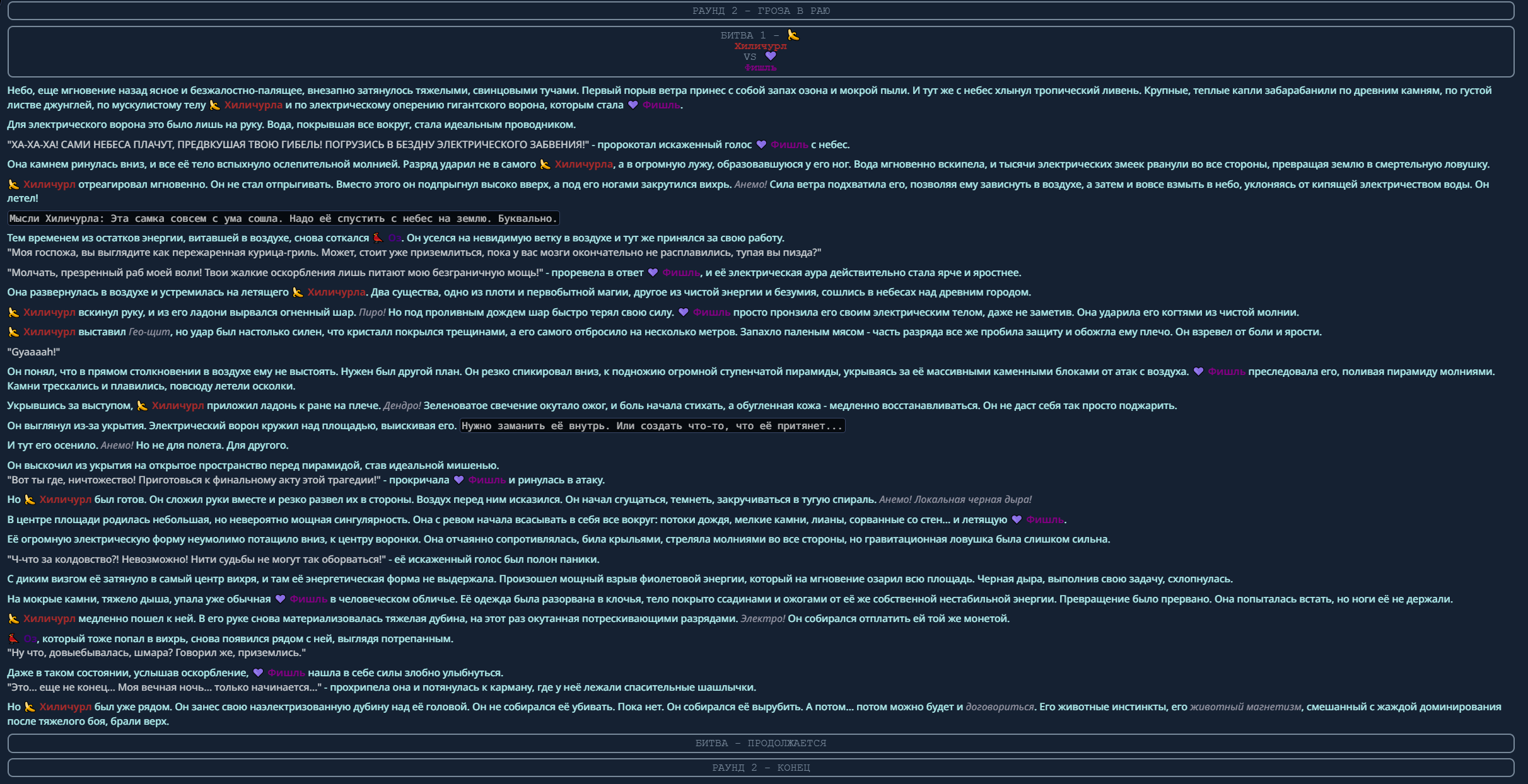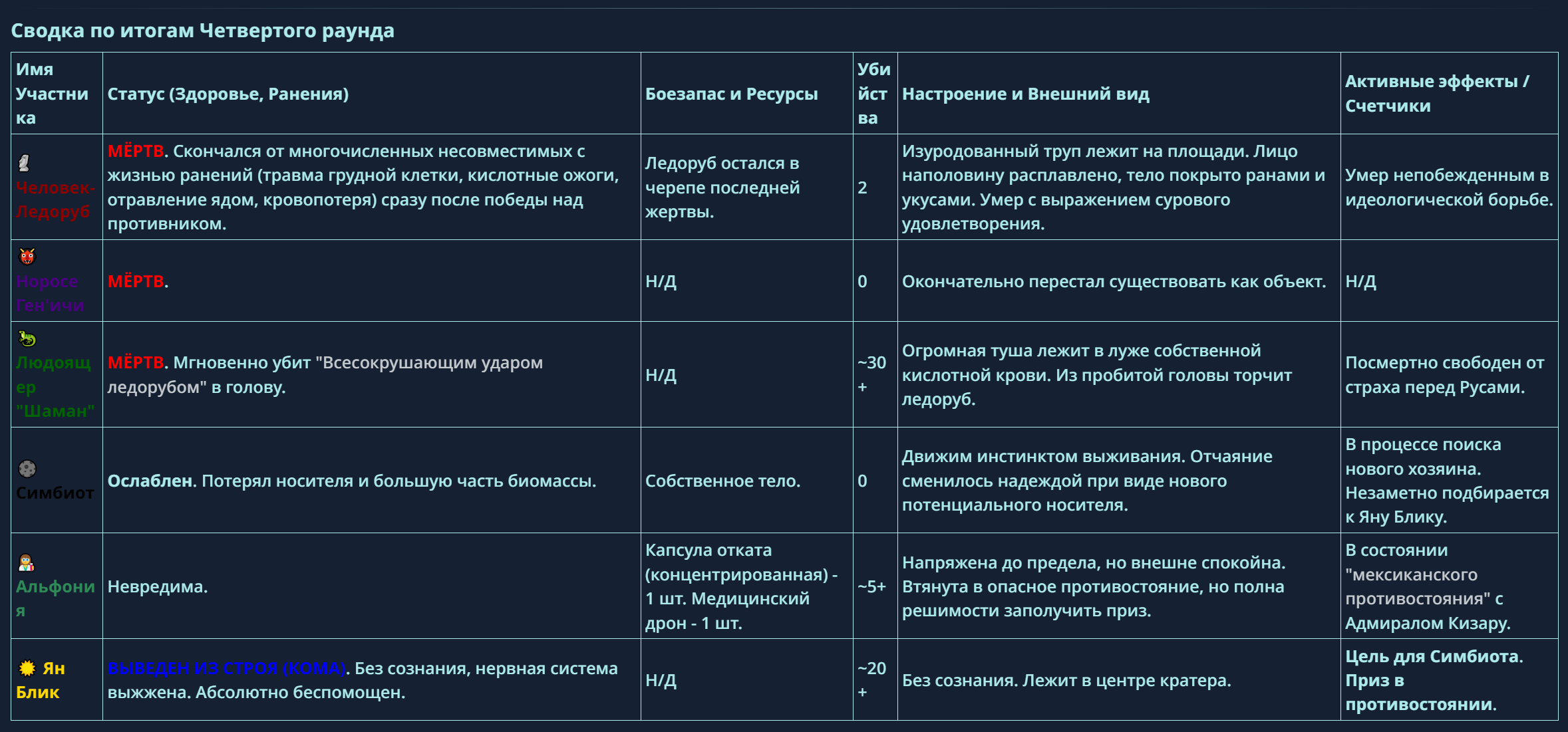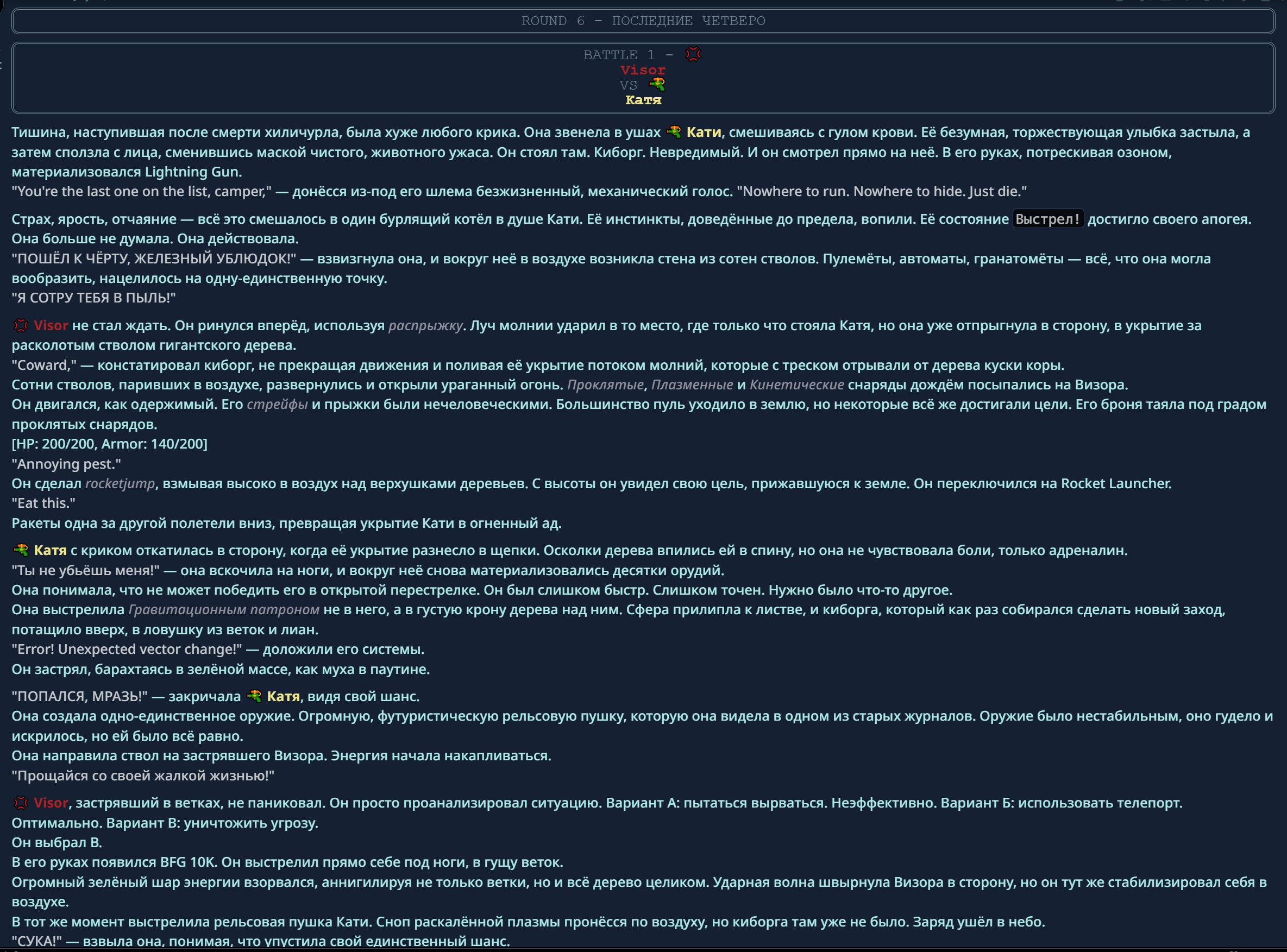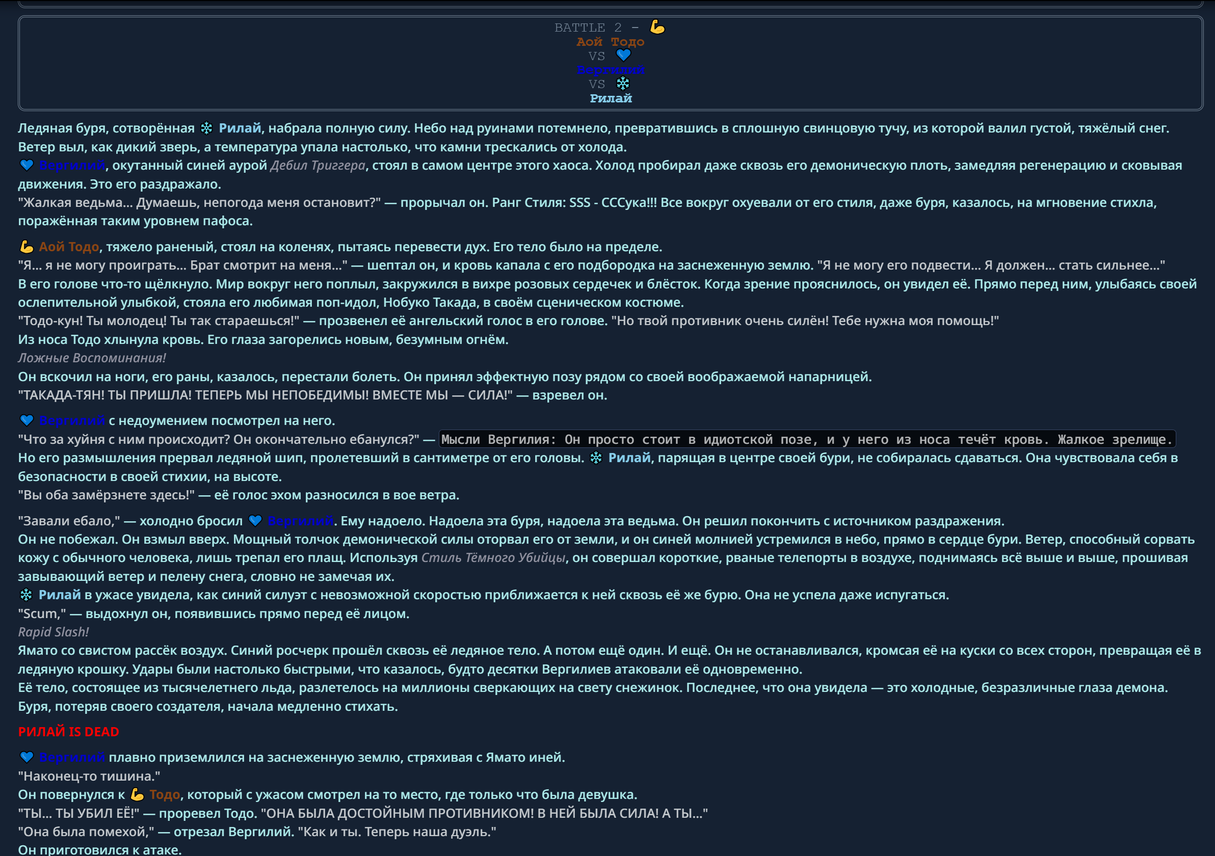 >>841547 Я просто перед каждым раундом вот это пишу нейронке и она логически сама выбирает кто с кем должен пиздиться.