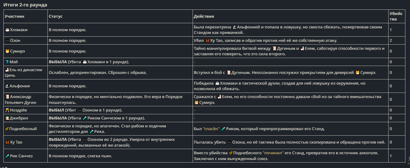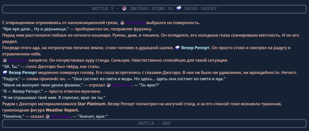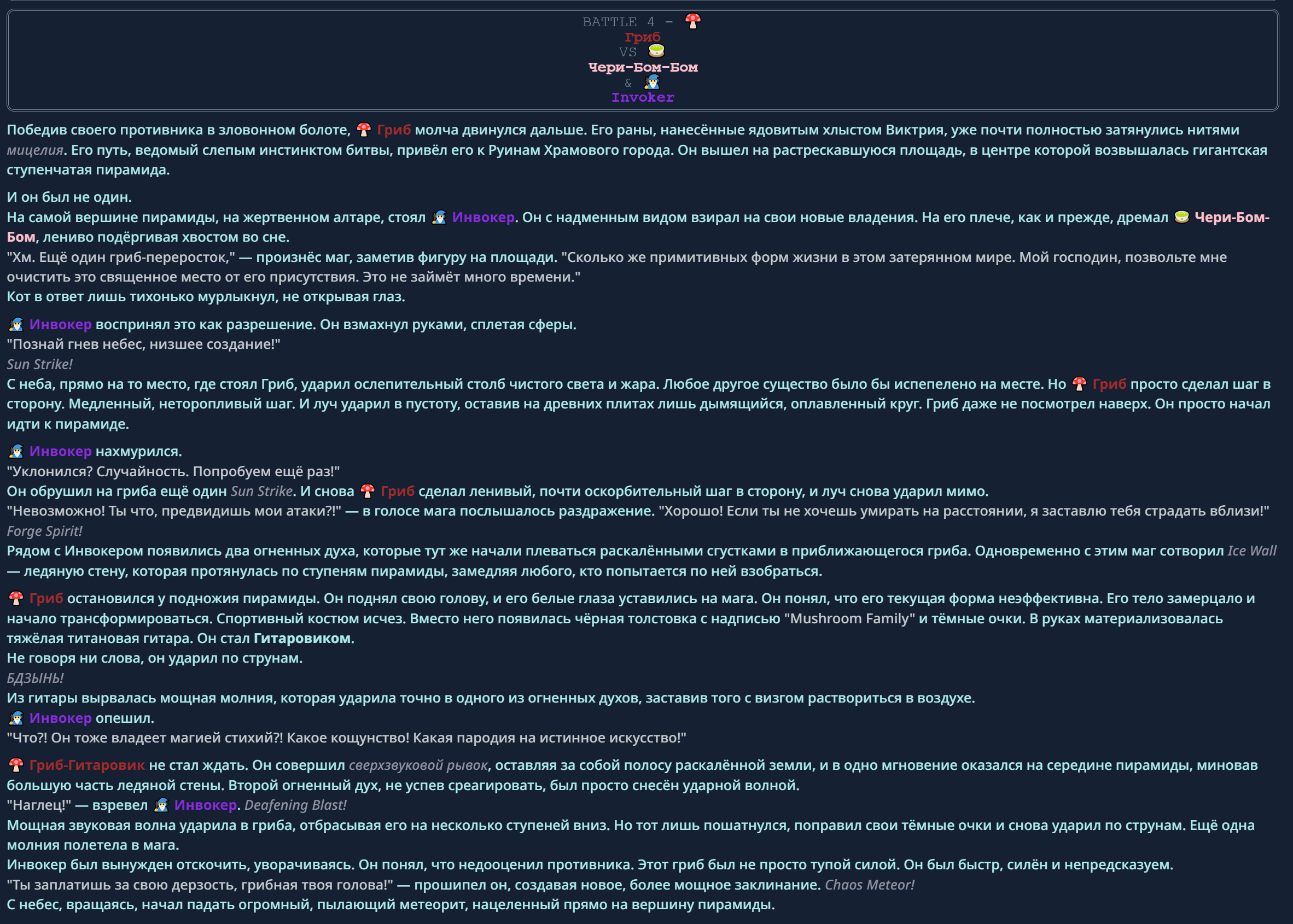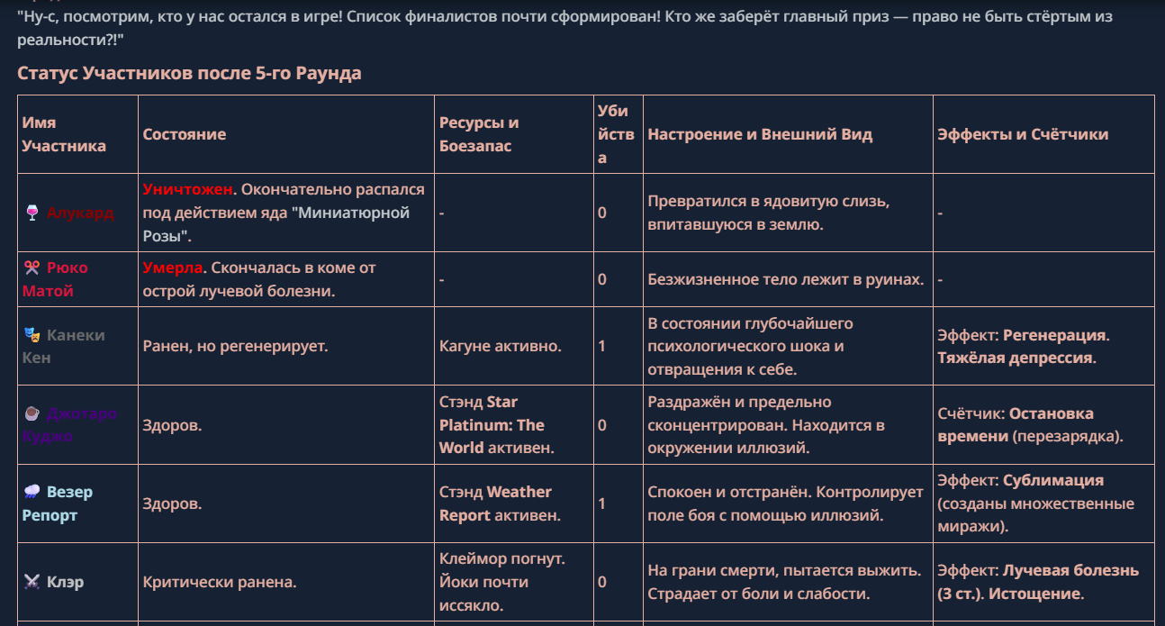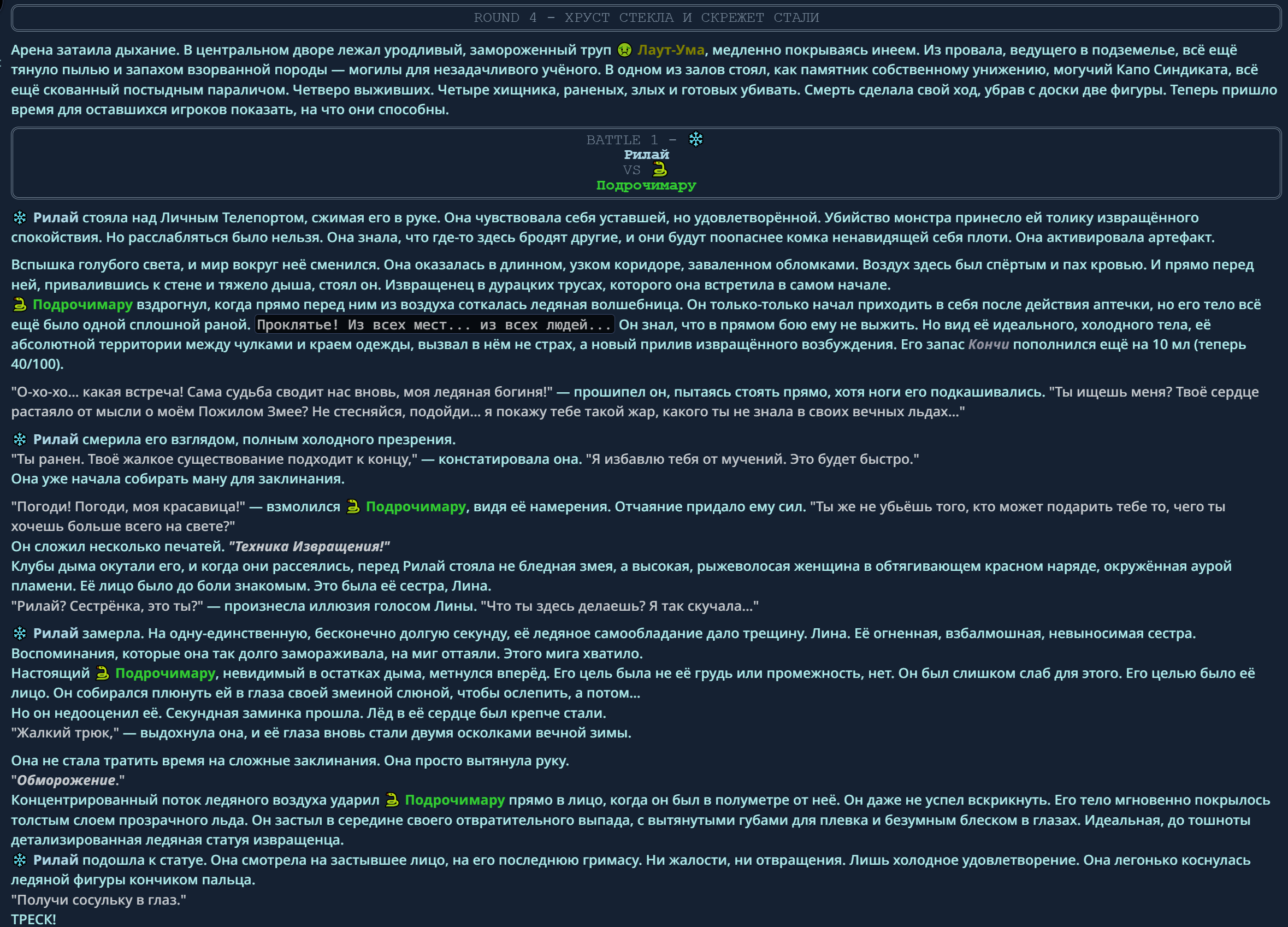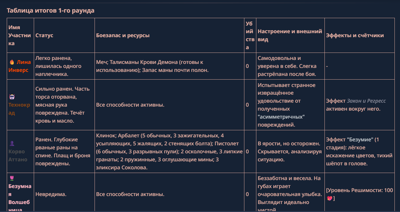 >>841547 Я просто перед каждым раундом вот это пишу нейронке и она логически сама выбирает кто с кем должен пиздиться.