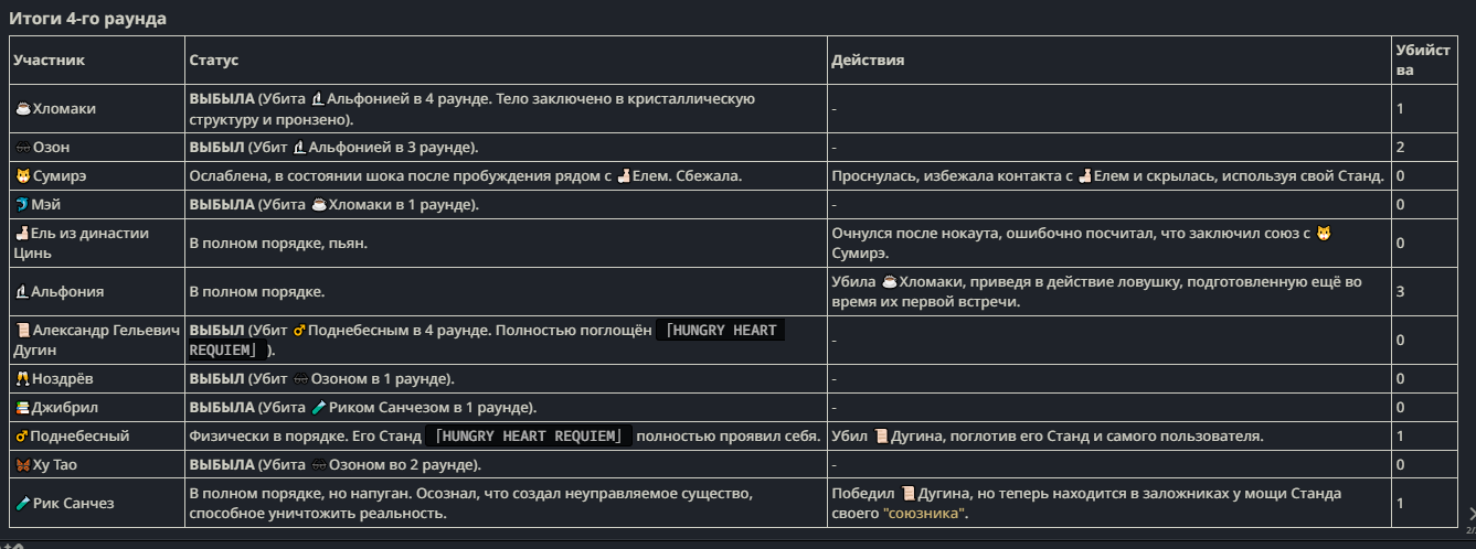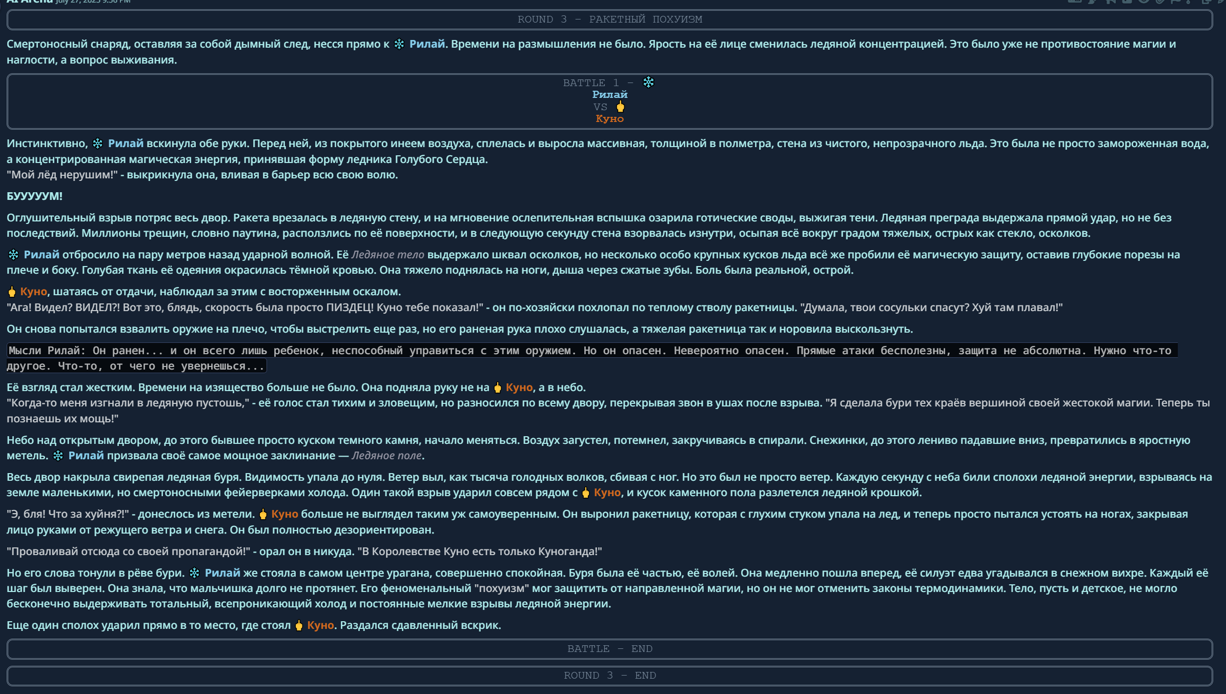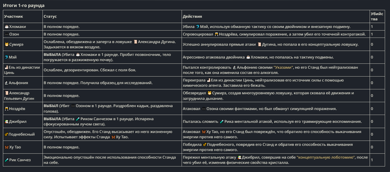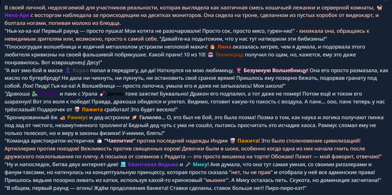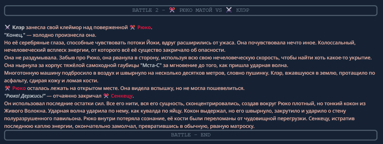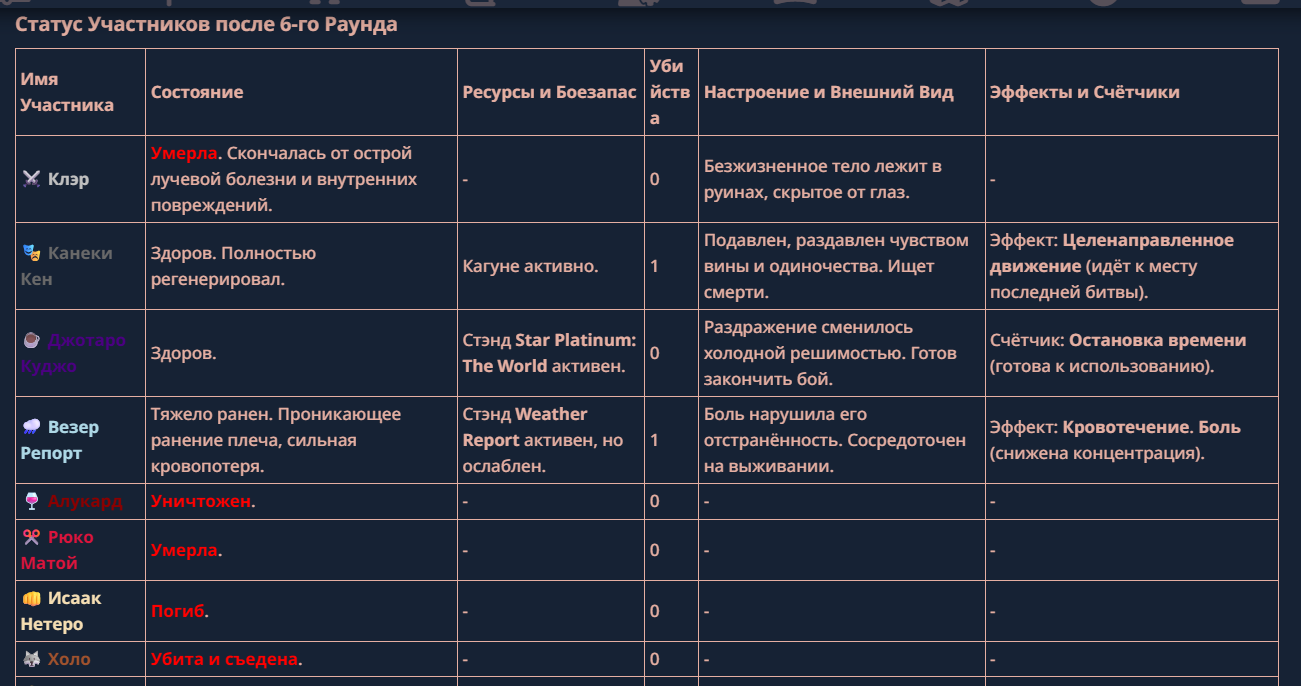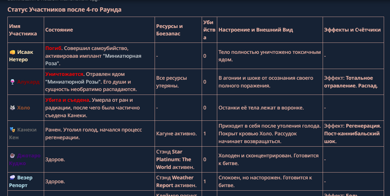 >>841547 Я просто перед каждым раундом вот это пишу нейронке и она логически сама выбирает кто с кем должен пиздиться.