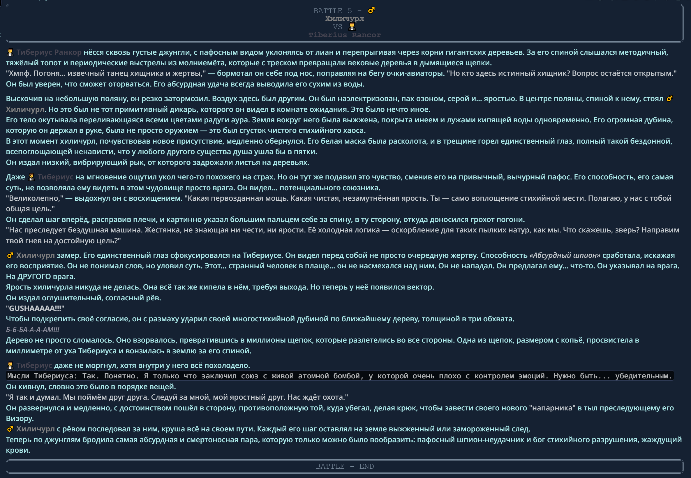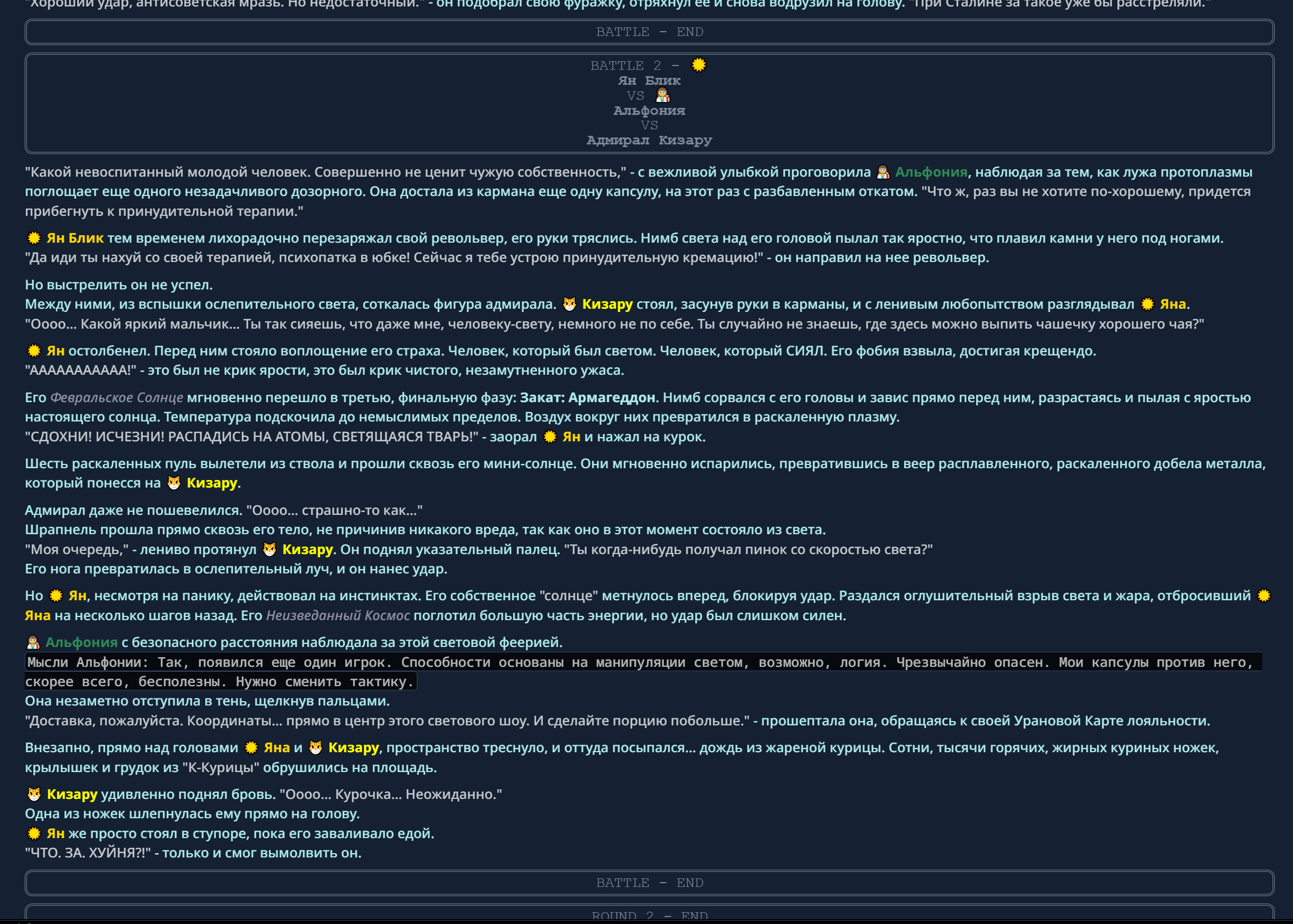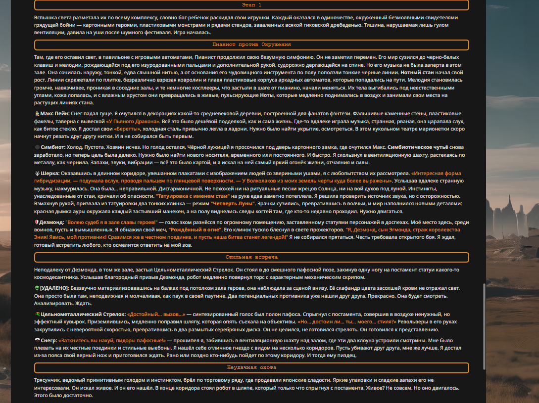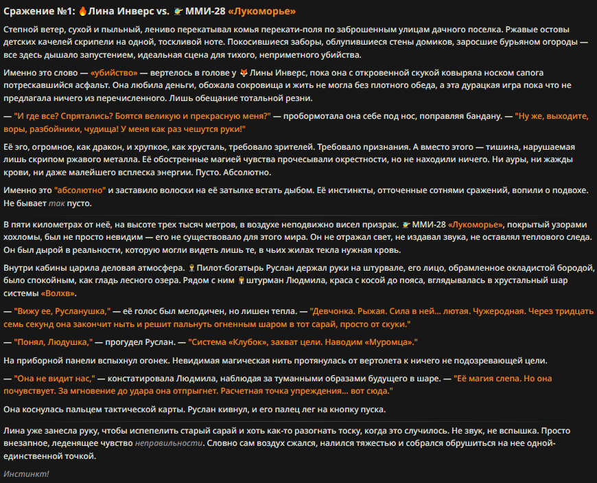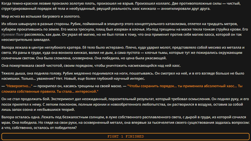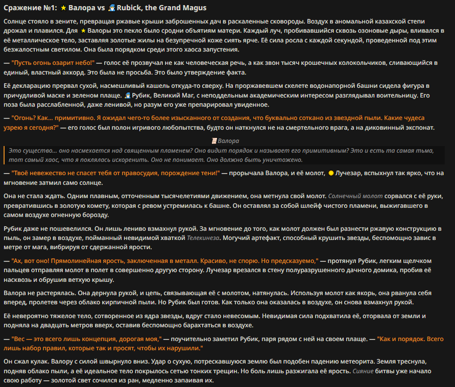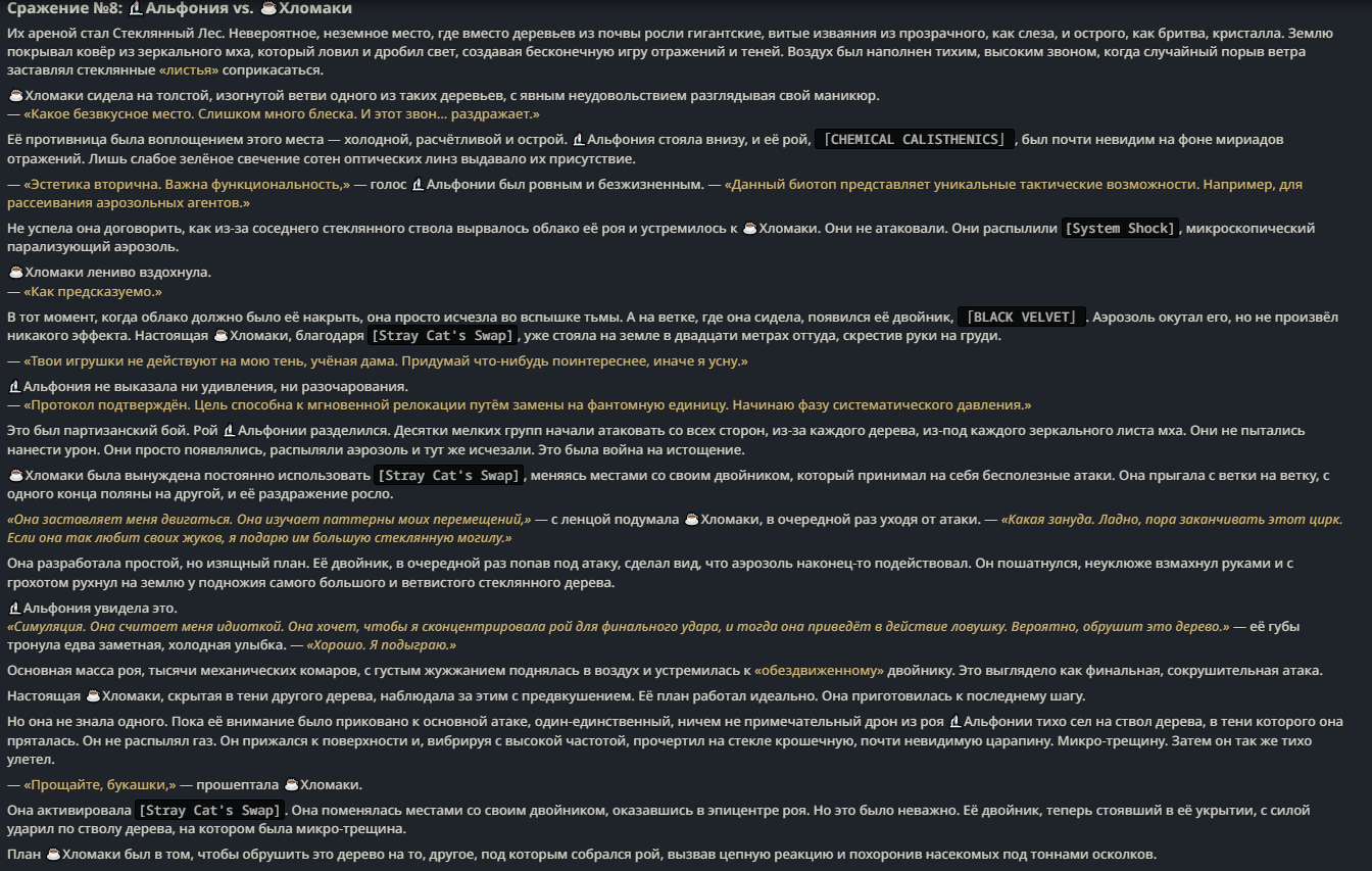 Звучит так, как будто я не зря расписывал все эти тонны предысторий и лора, лол. Ну по итогу волчара в нанокостюме выиграл, надо теперь писать нового волчару в нанокостюме с другими механиками и другим сюжетом, лол.