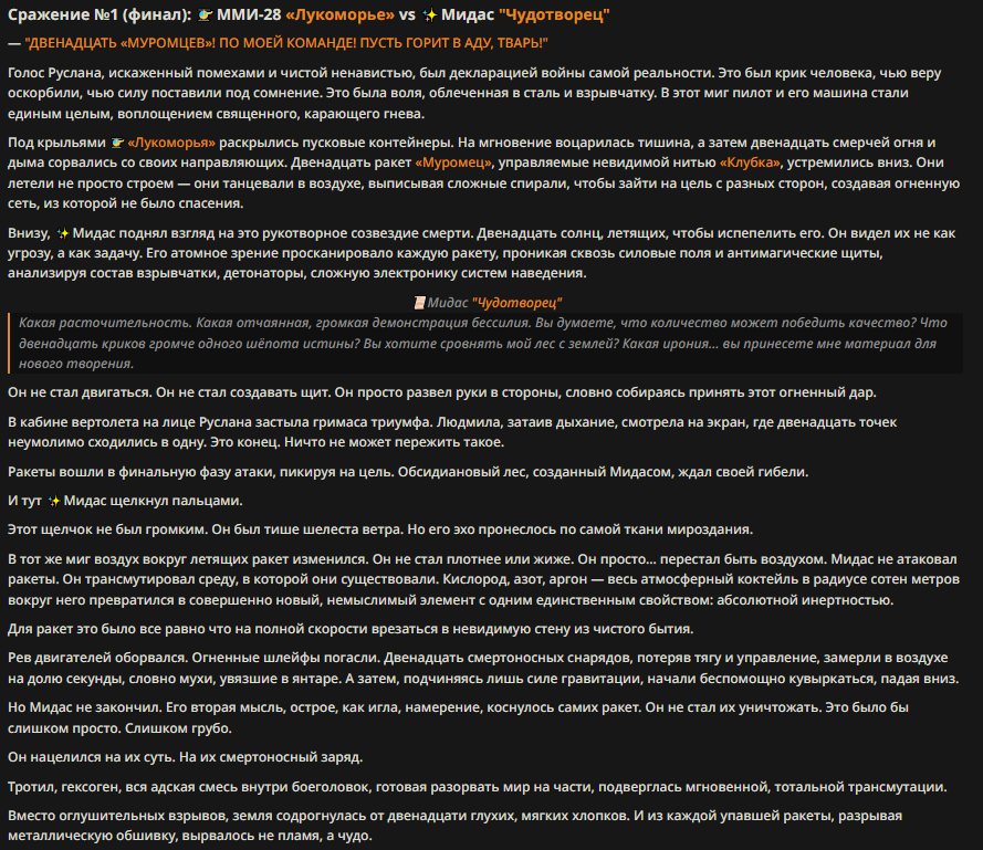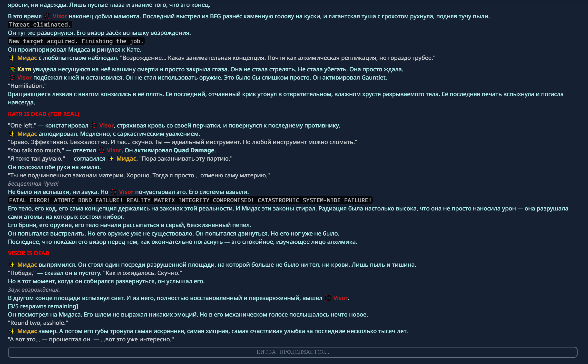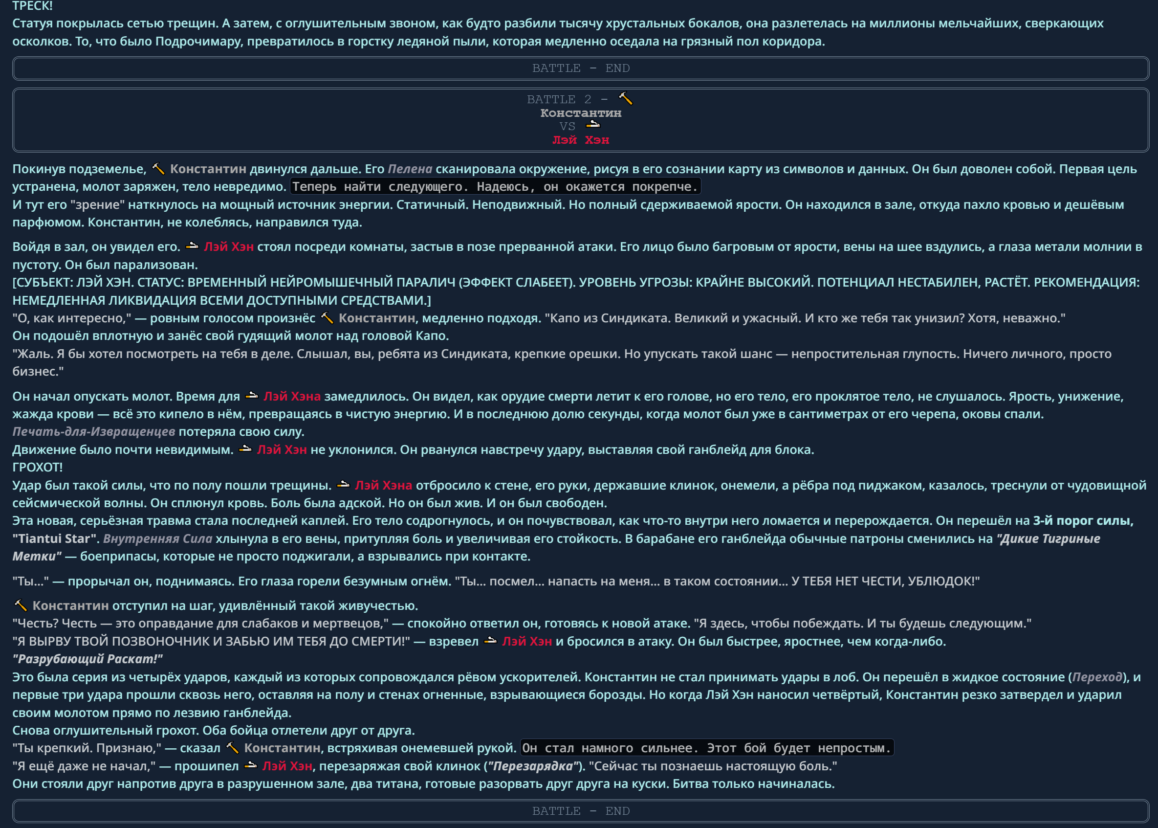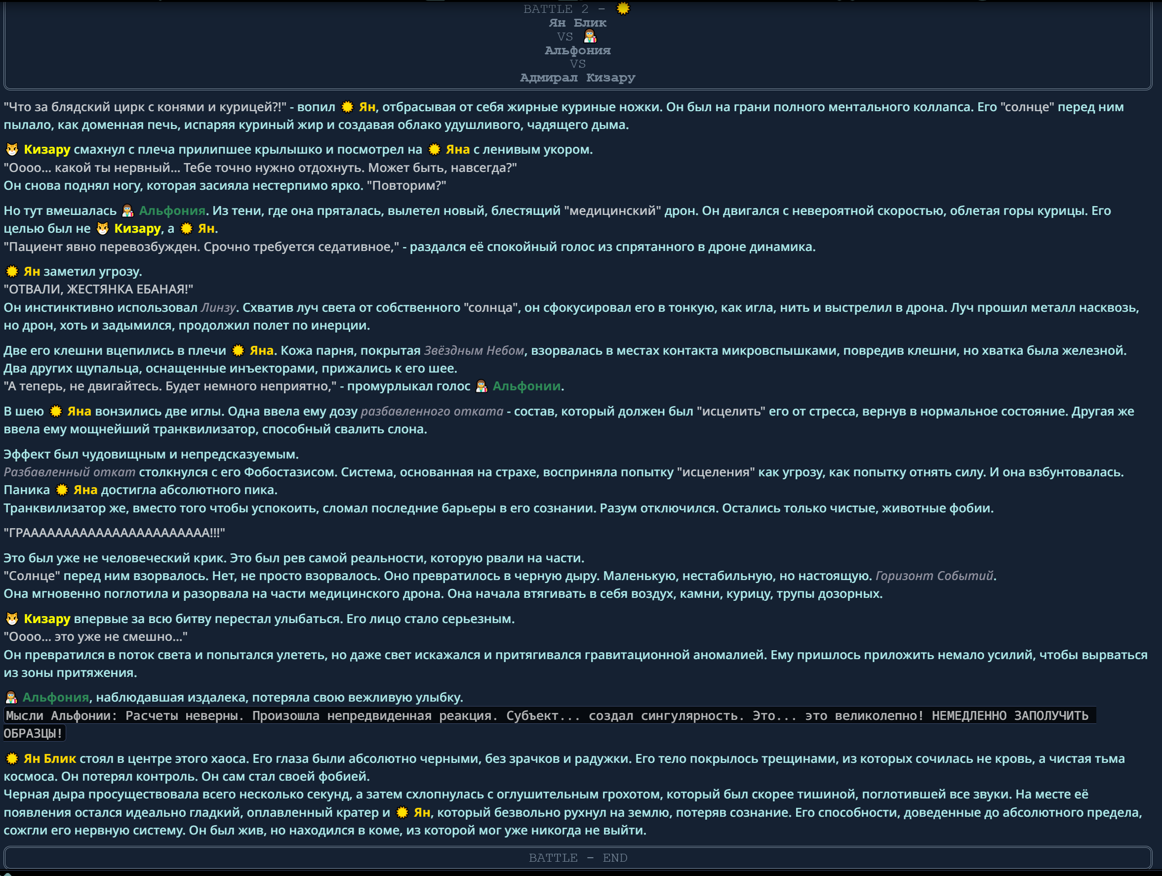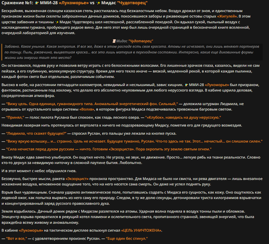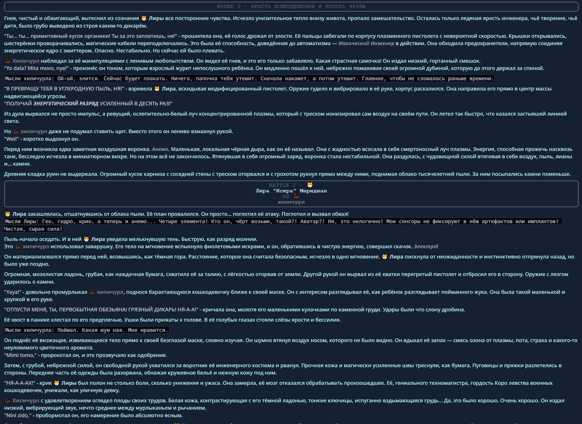 Звучит так, как будто я не зря расписывал все эти тонны предысторий и лора, лол. Ну по итогу волчара в нанокостюме выиграл, надо теперь писать нового волчару в нанокостюме с другими механиками и другим сюжетом, лол.