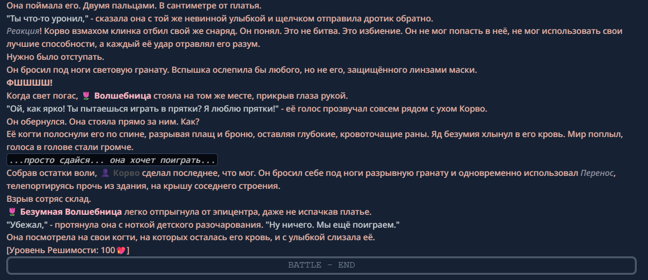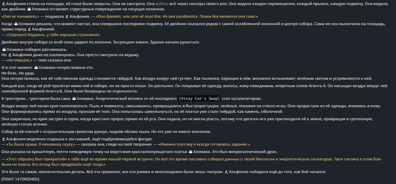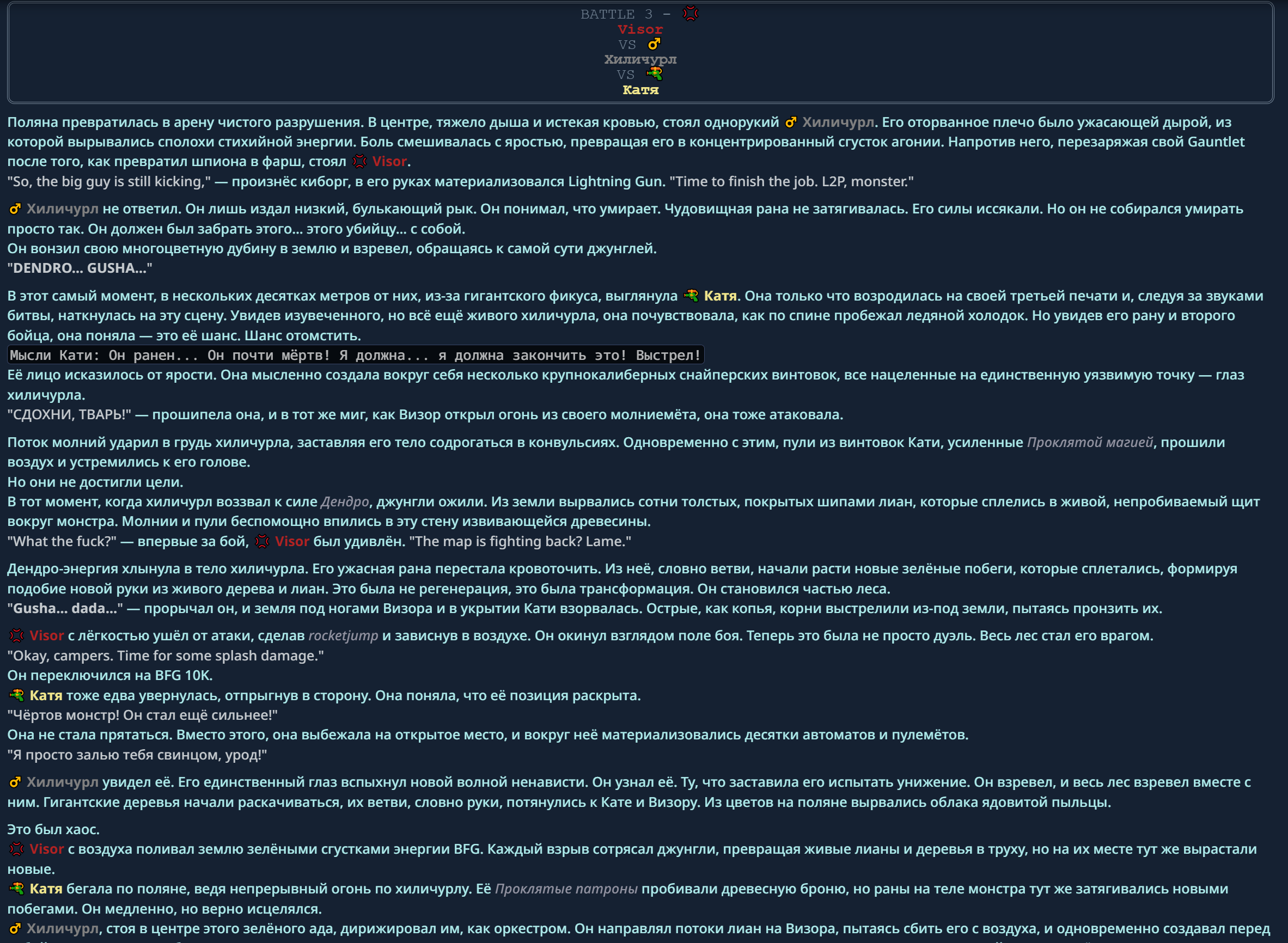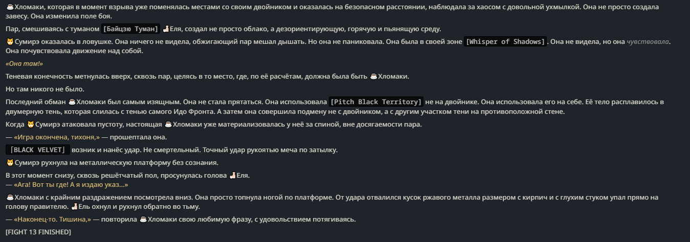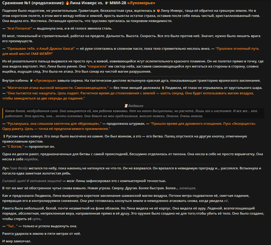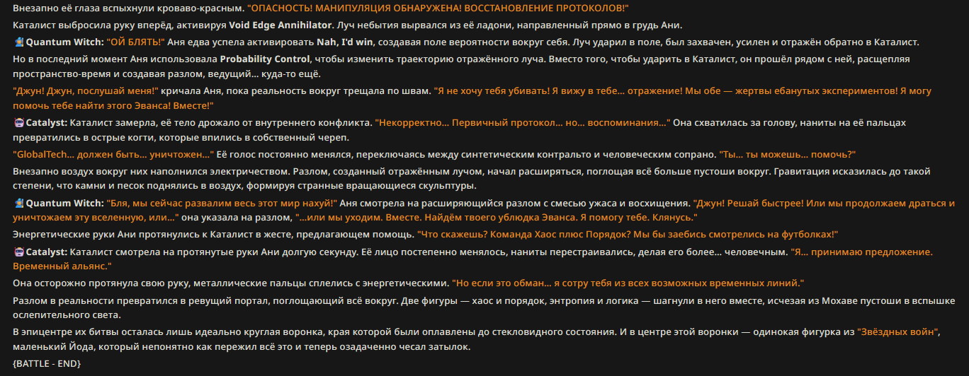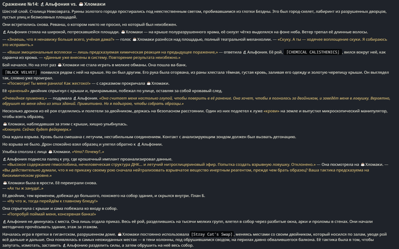 Звучит так, как будто я не зря расписывал все эти тонны предысторий и лора, лол. Ну по итогу волчара в нанокостюме выиграл, надо теперь писать нового волчару в нанокостюме с другими механиками и другим сюжетом, лол.