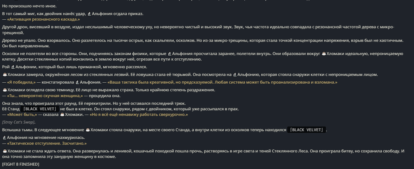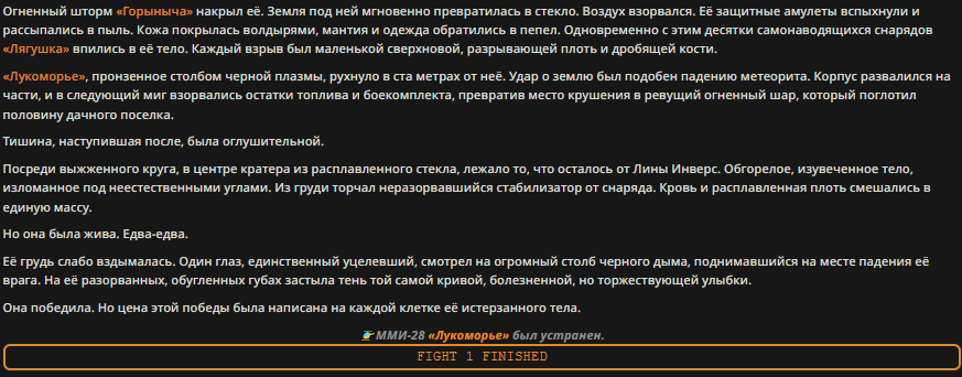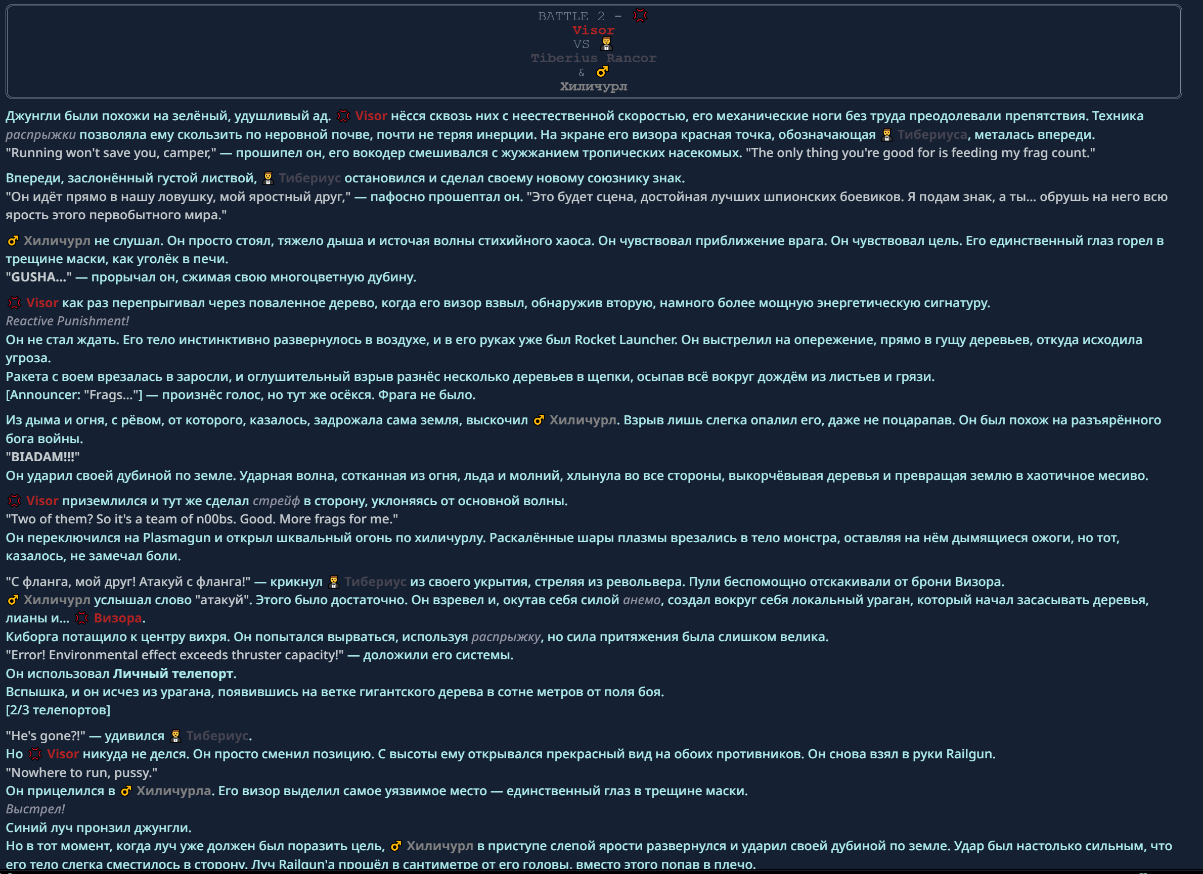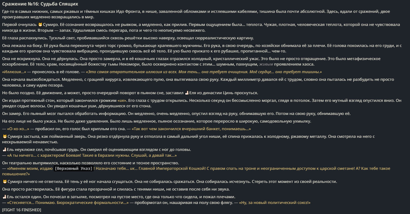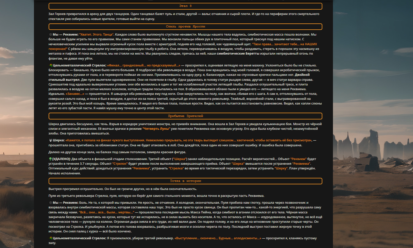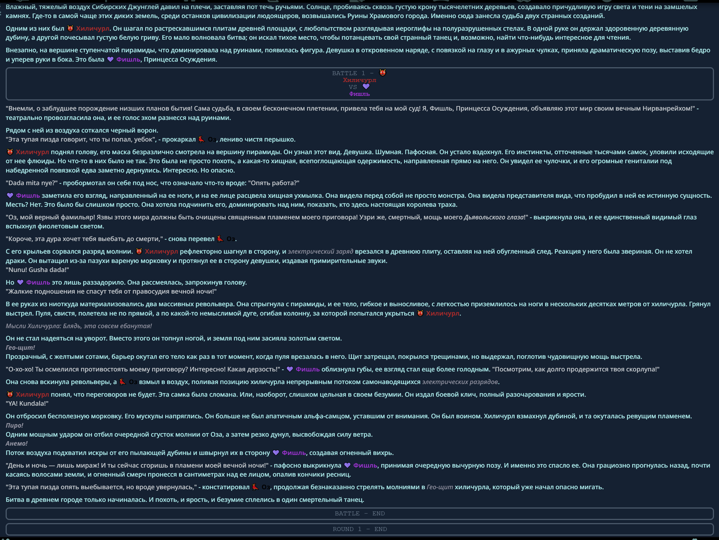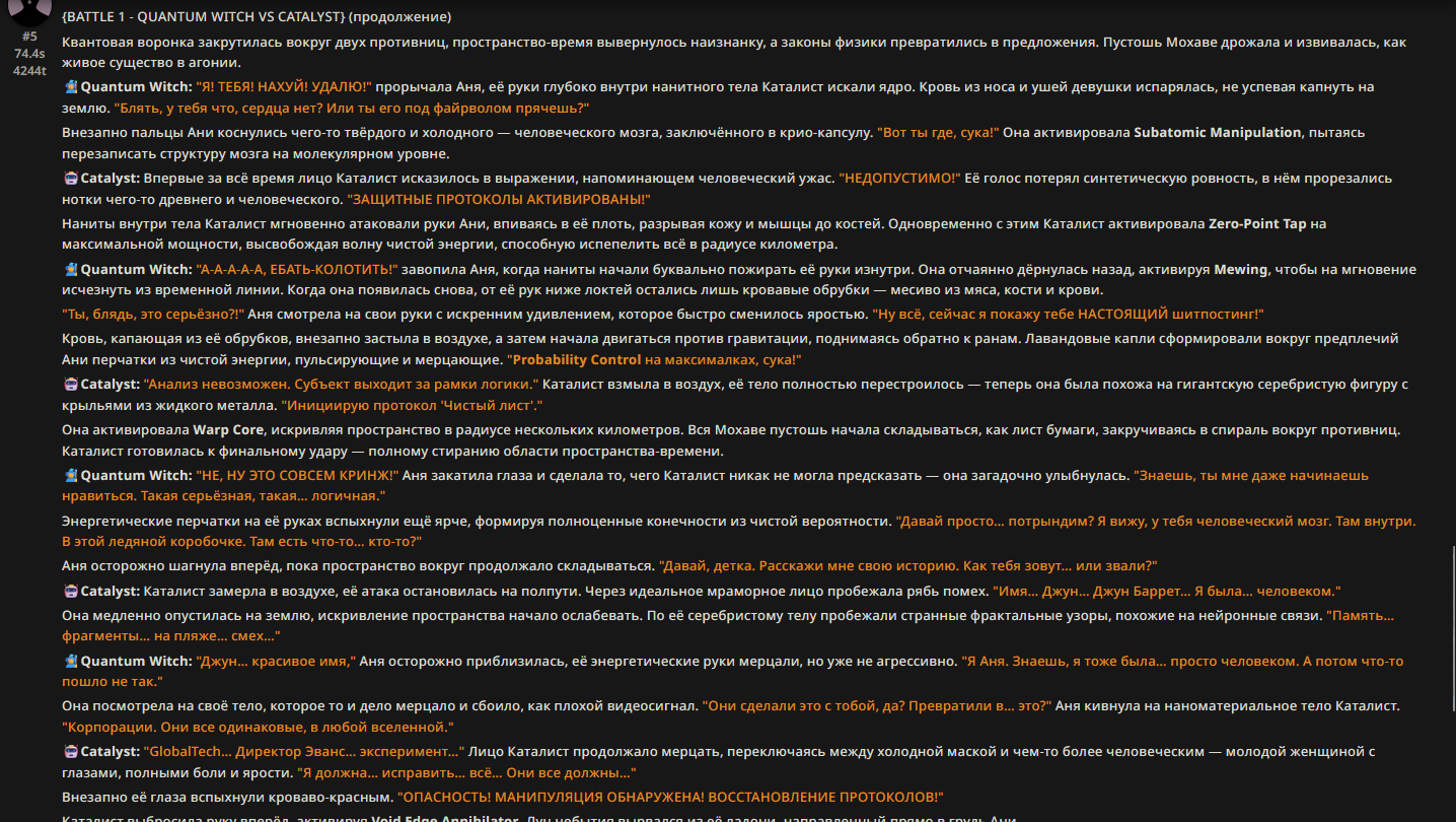 Звучит так, как будто я не зря расписывал все эти тонны предысторий и лора, лол. Ну по итогу волчара в нанокостюме выиграл, надо теперь писать нового волчару в нанокостюме с другими механиками и другим сюжетом, лол.