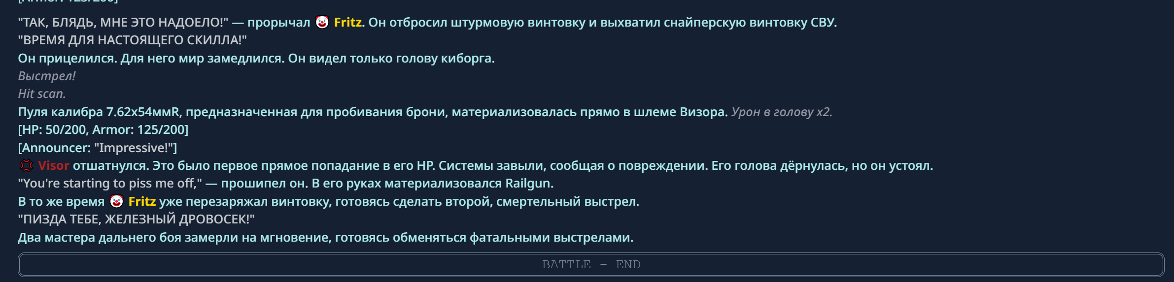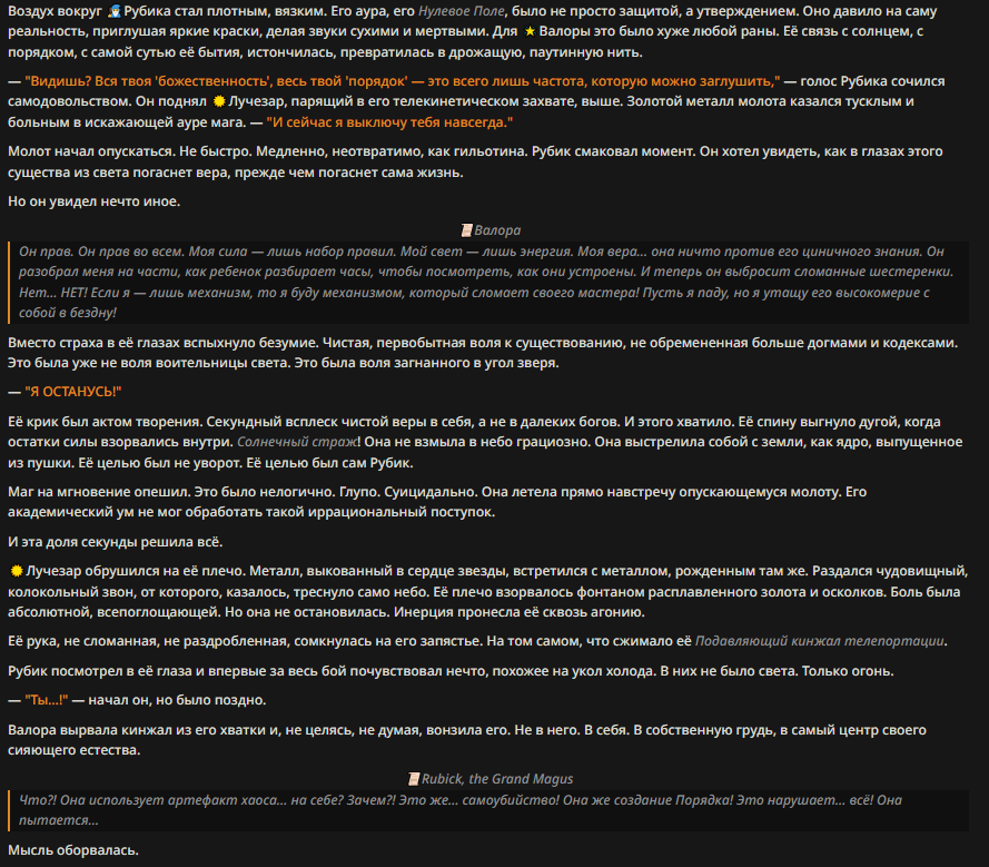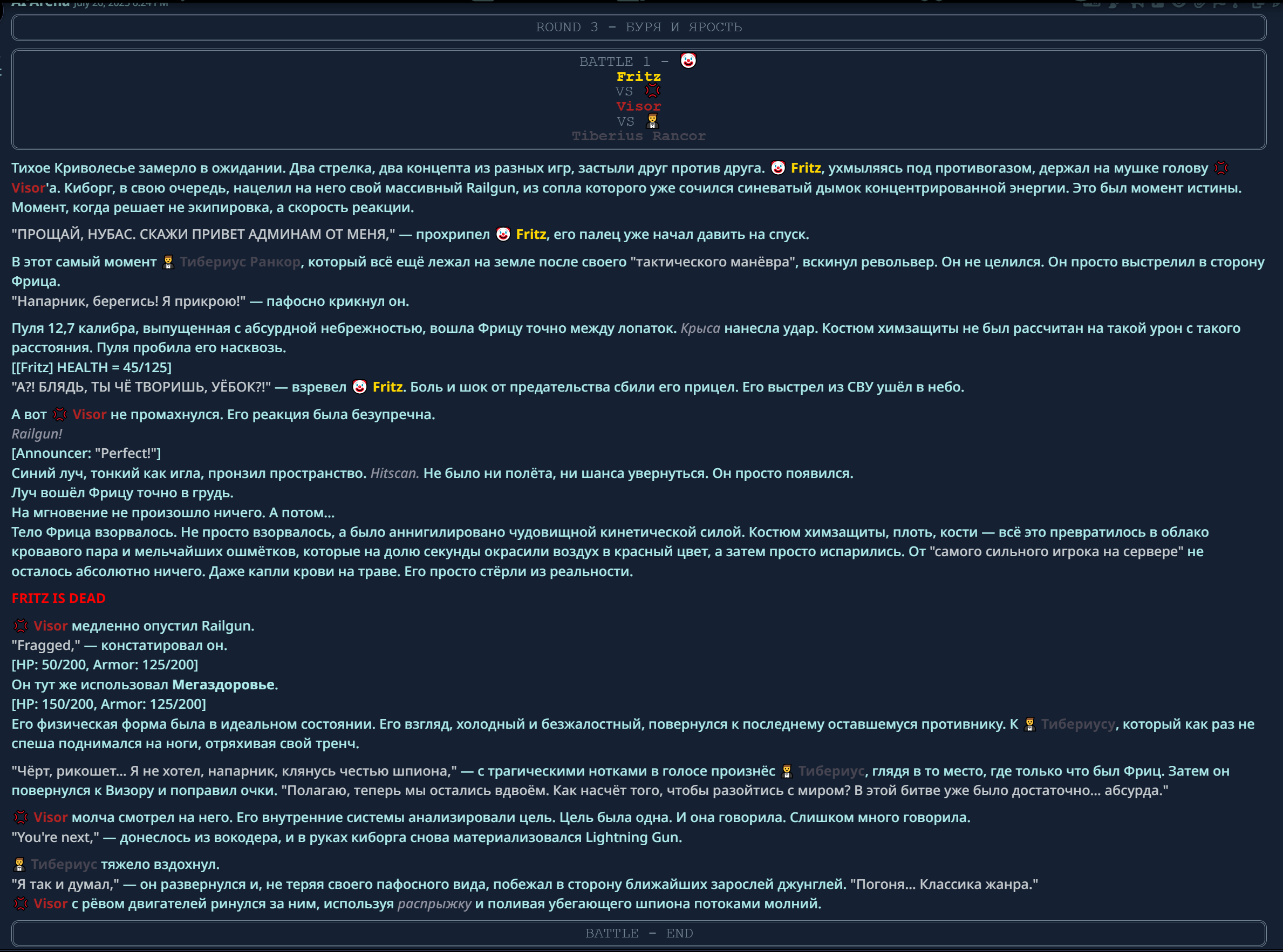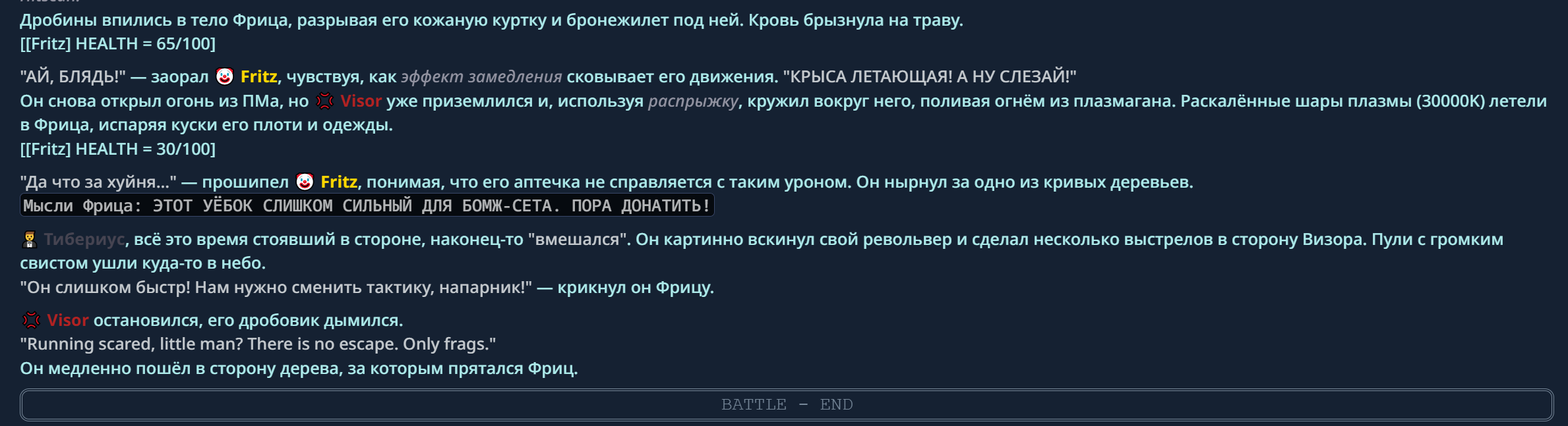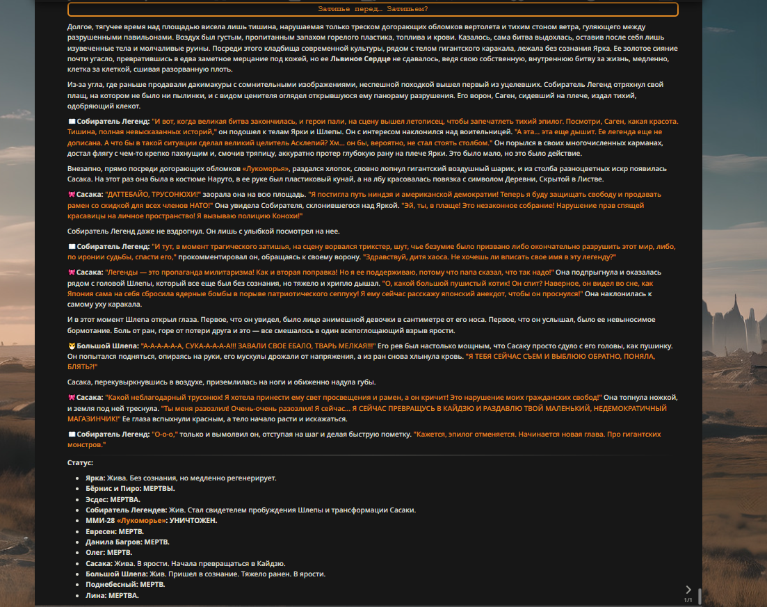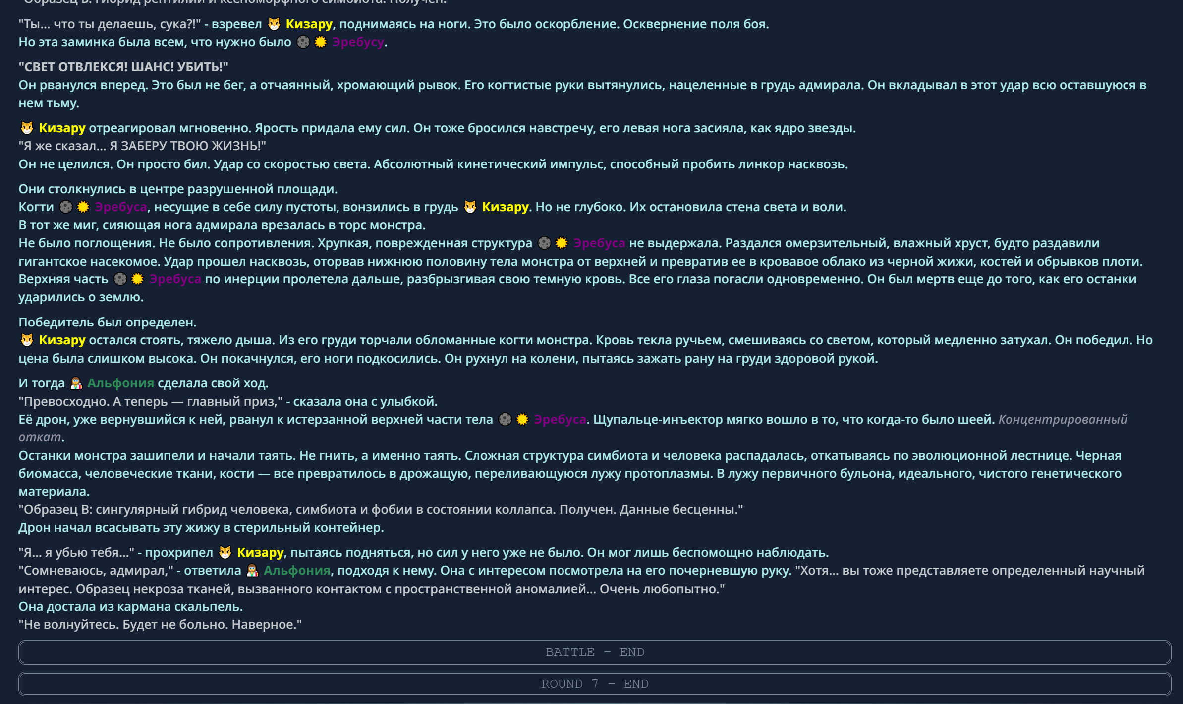 Звучит так, как будто я не зря расписывал все эти тонны предысторий и лора, лол. Ну по итогу волчара в нанокостюме выиграл, надо теперь писать нового волчару в нанокостюме с другими механиками и другим сюжетом, лол.