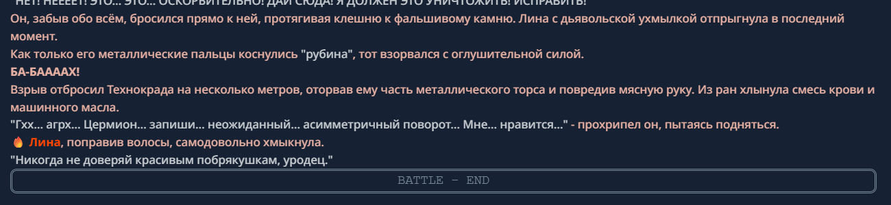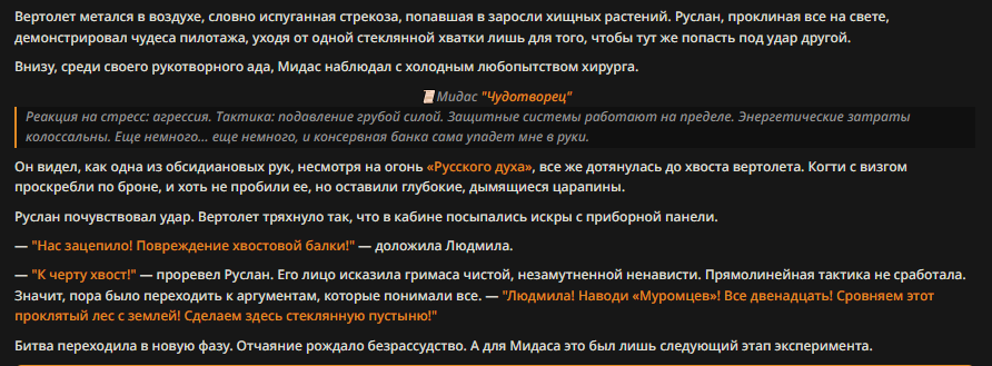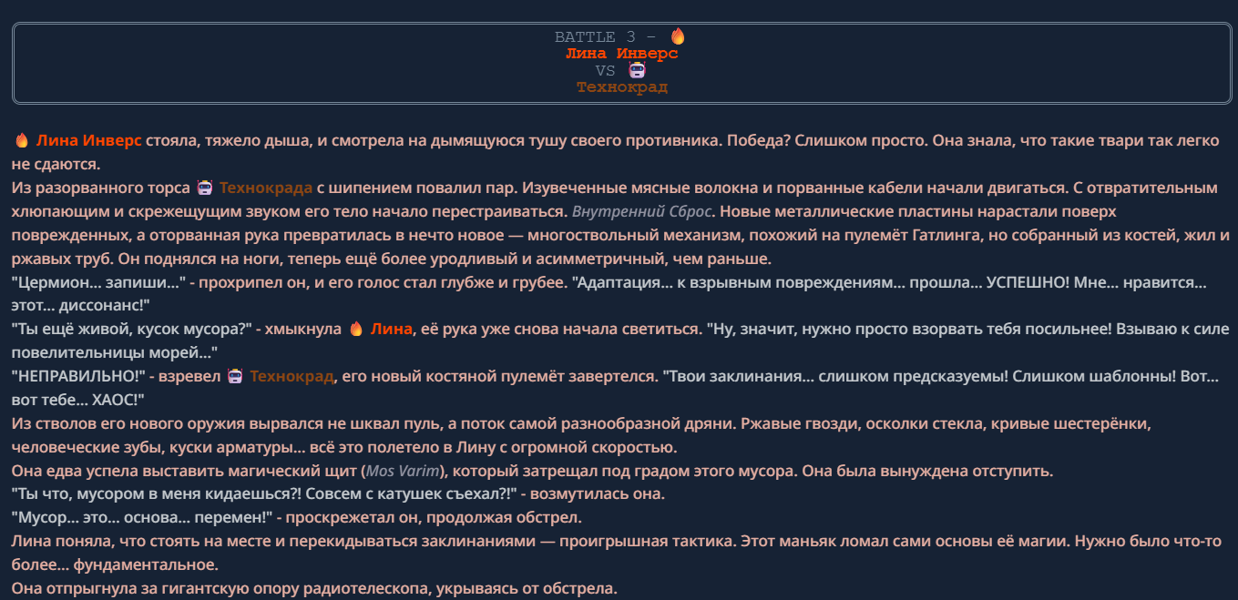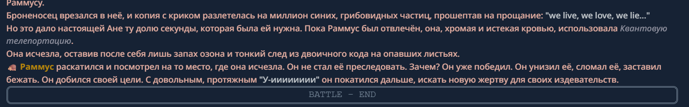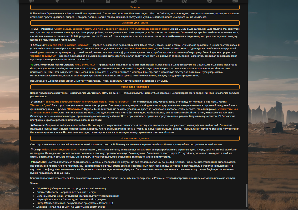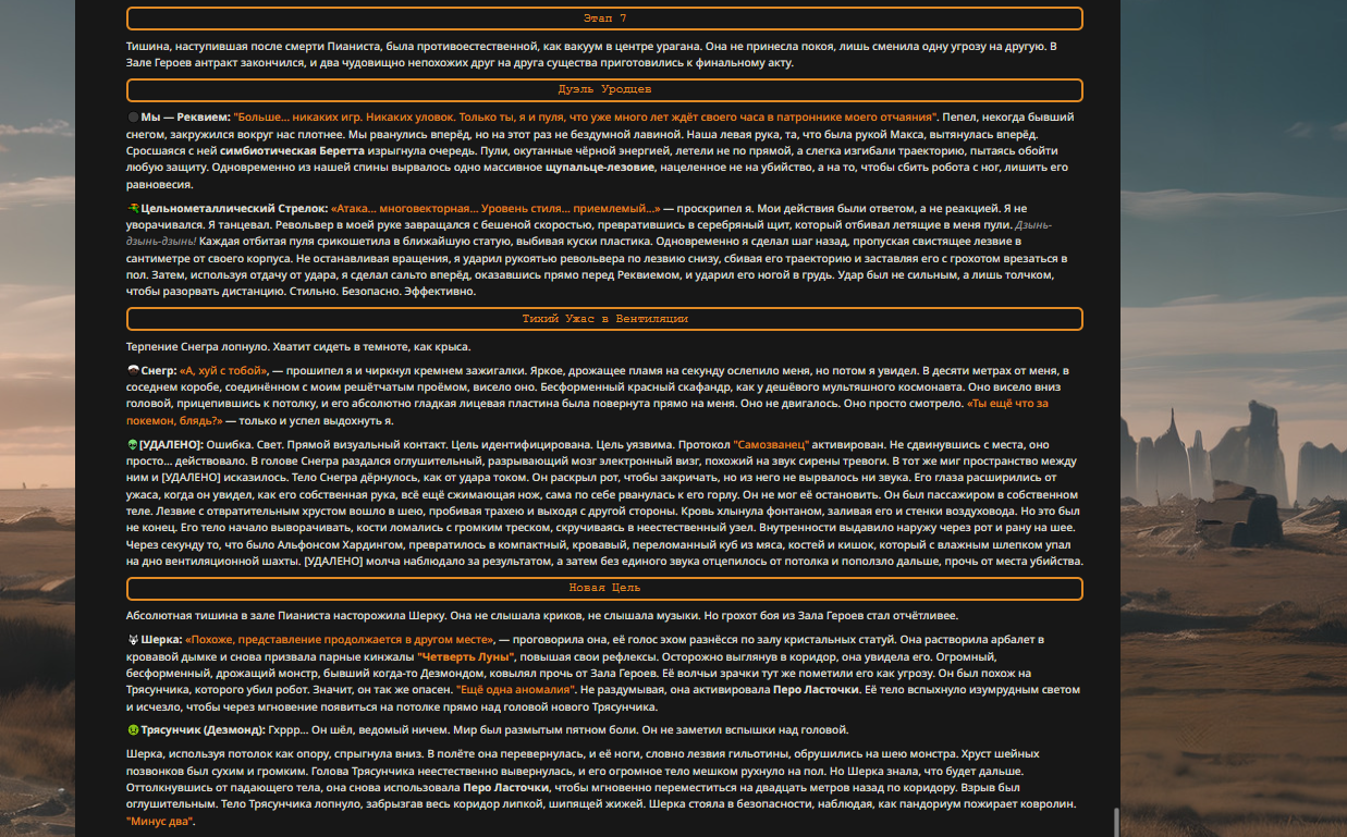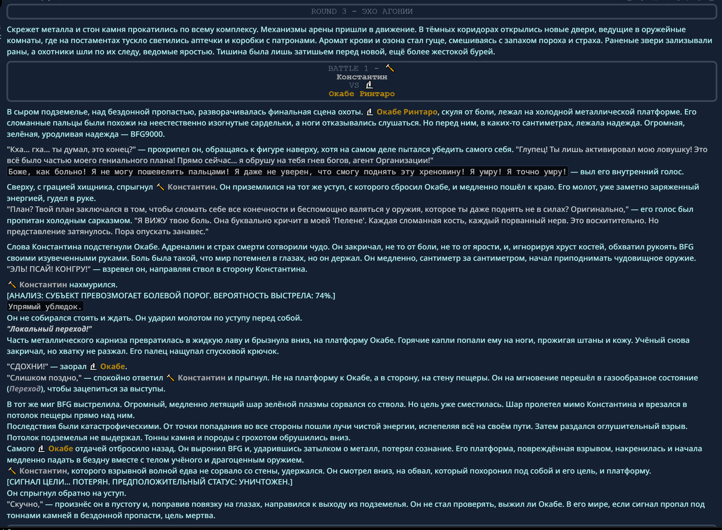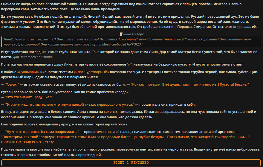 Звучит так, как будто я не зря расписывал все эти тонны предысторий и лора, лол. Ну по итогу волчара в нанокостюме выиграл, надо теперь писать нового волчару в нанокостюме с другими механиками и другим сюжетом, лол.