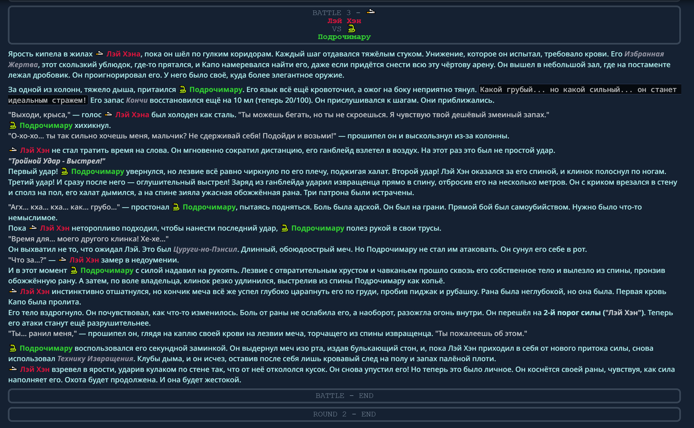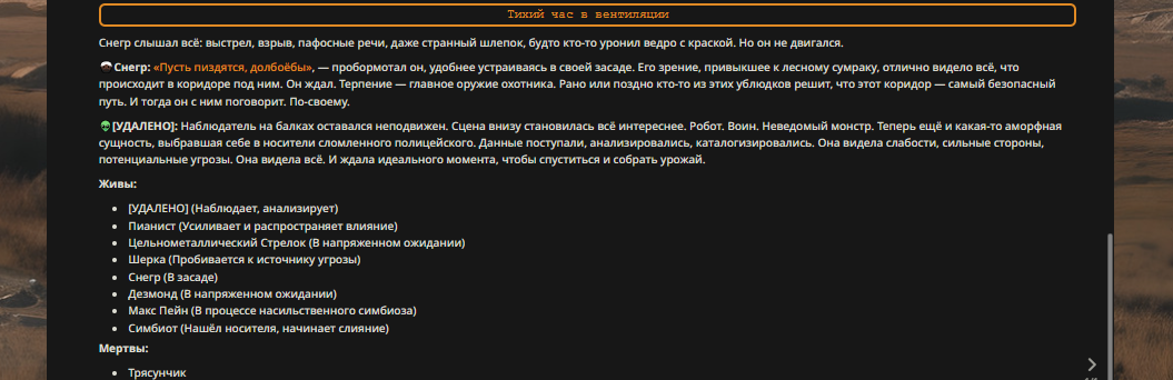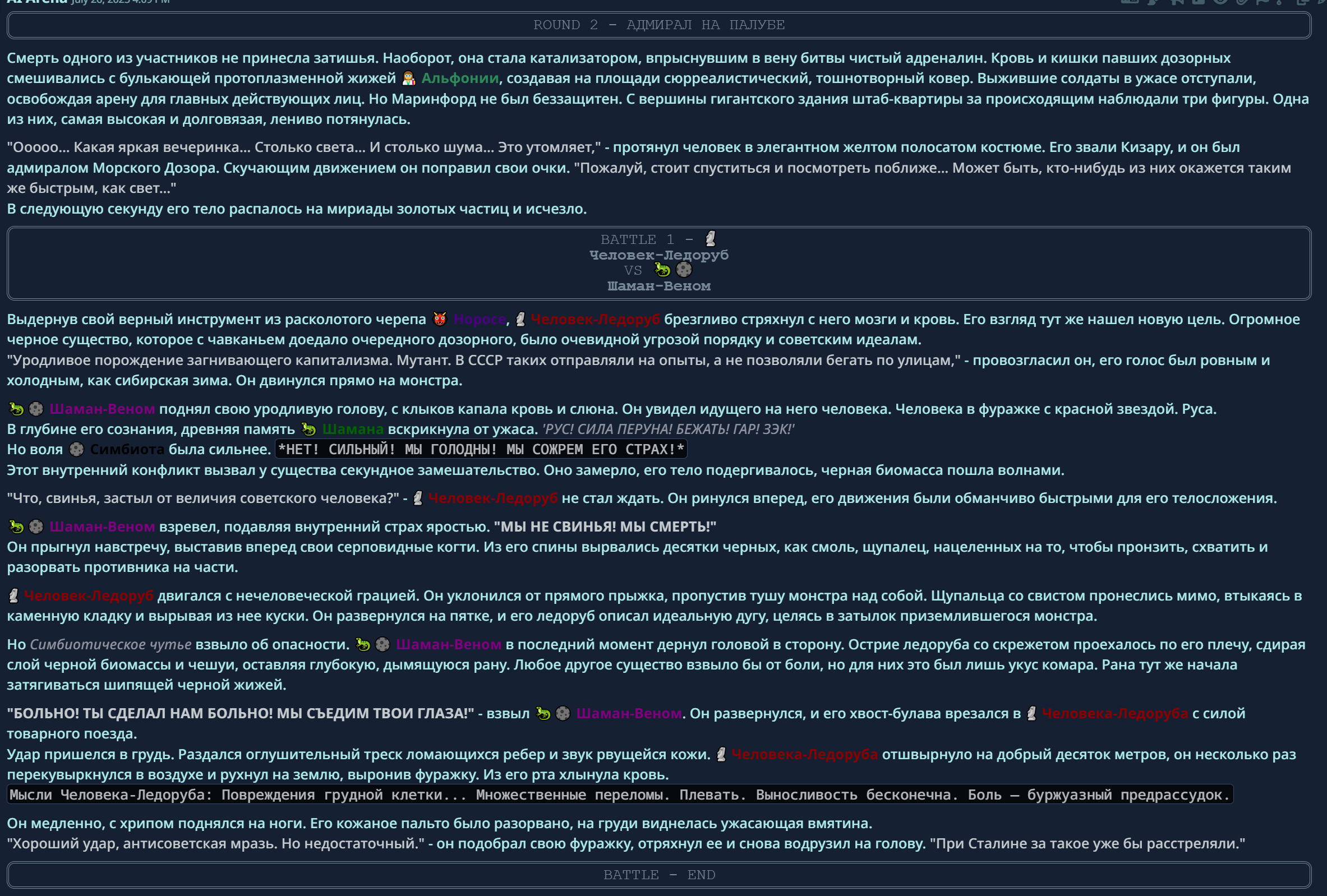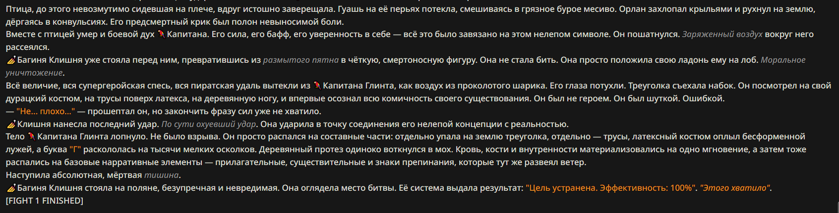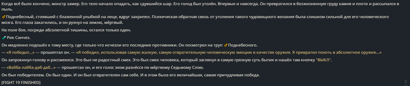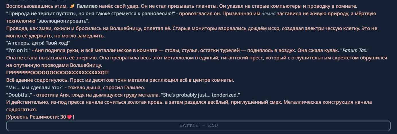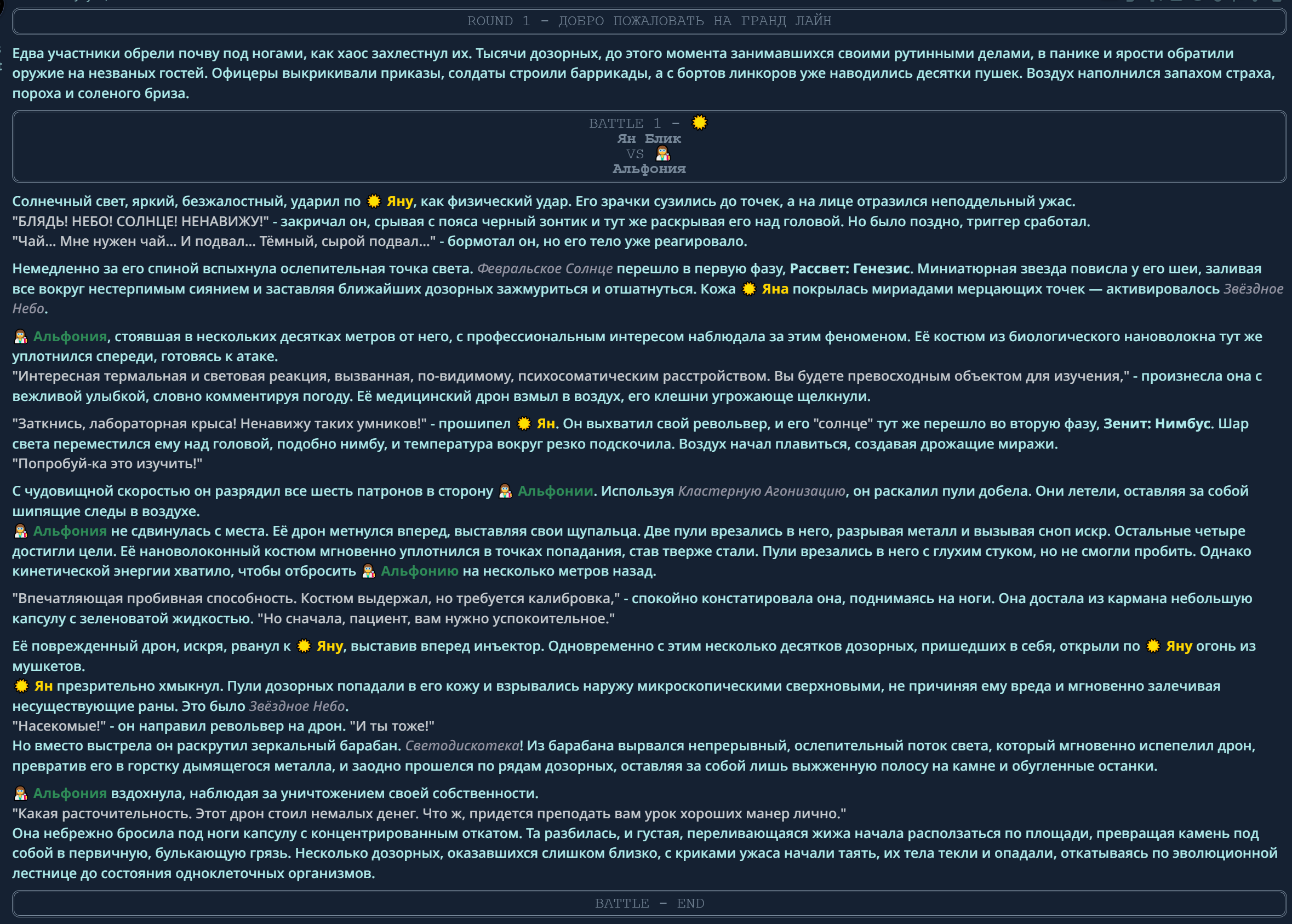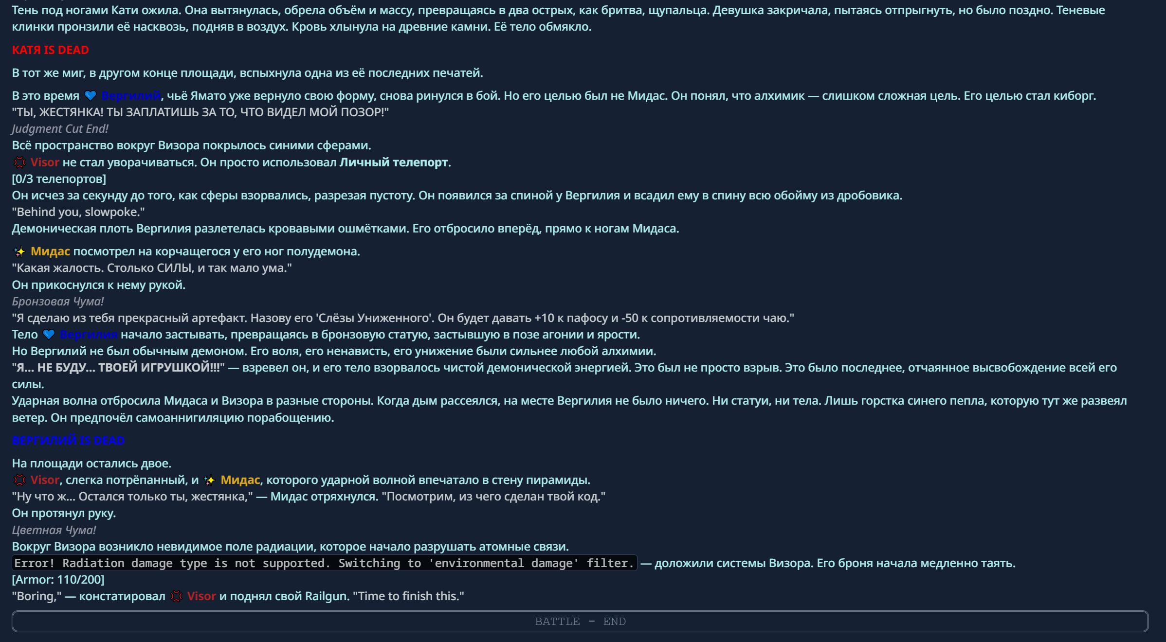 Звучит так, как будто я не зря расписывал все эти тонны предысторий и лора, лол. Ну по итогу волчара в нанокостюме выиграл, надо теперь писать нового волчару в нанокостюме с другими механиками и другим сюжетом, лол.