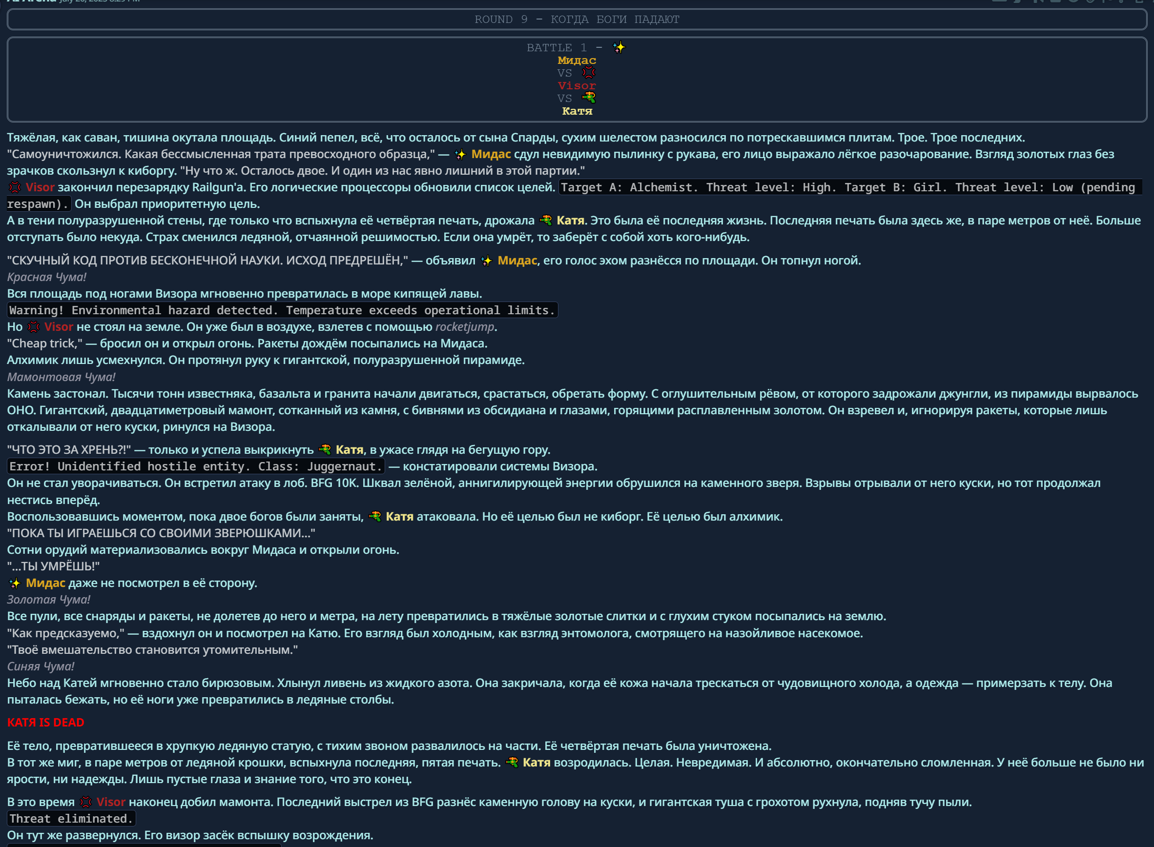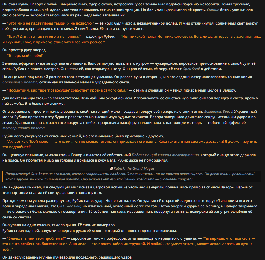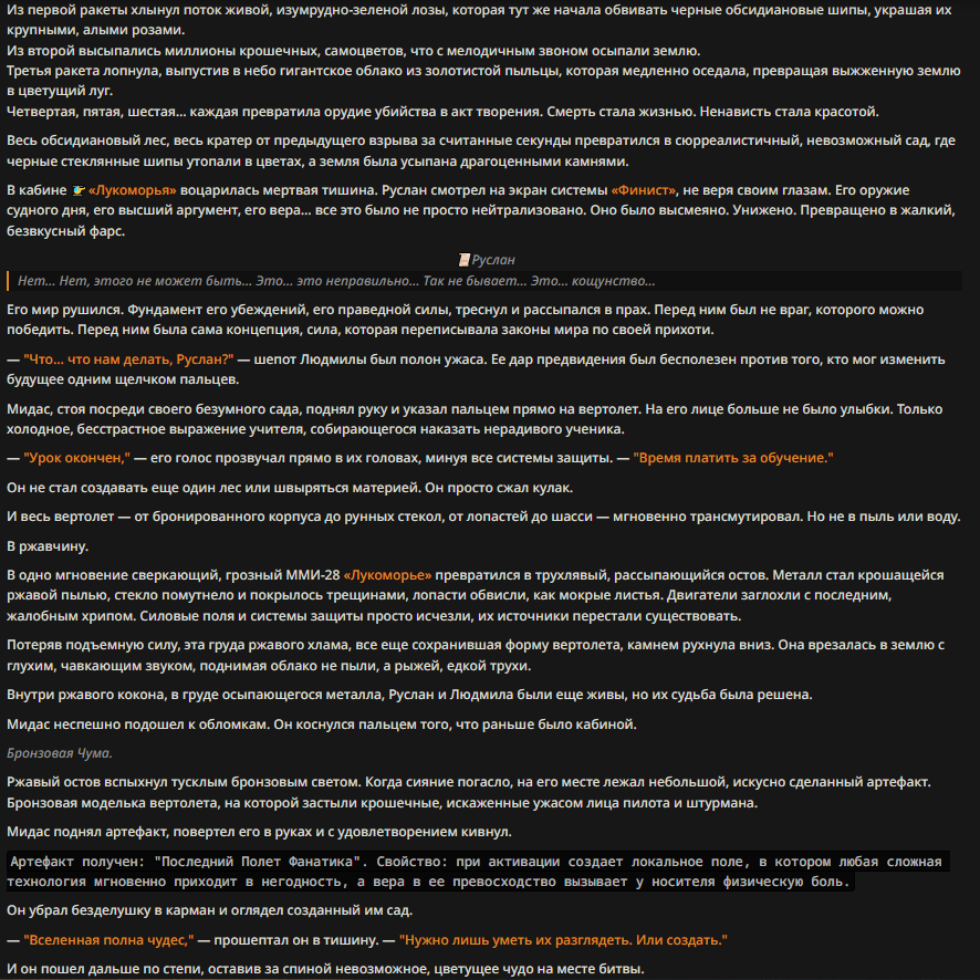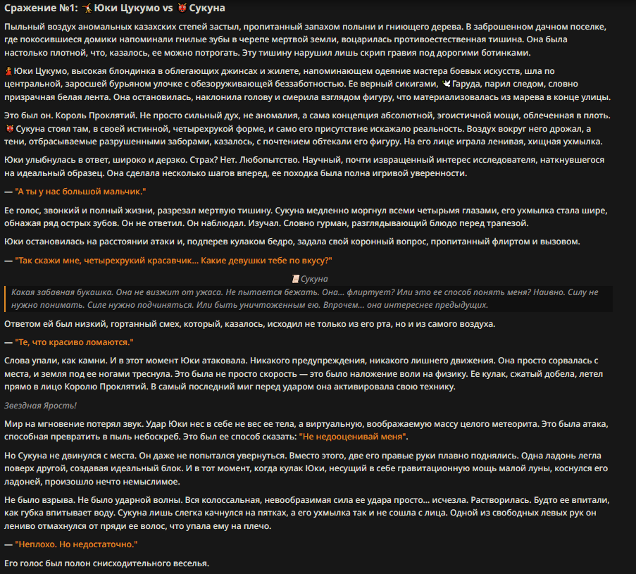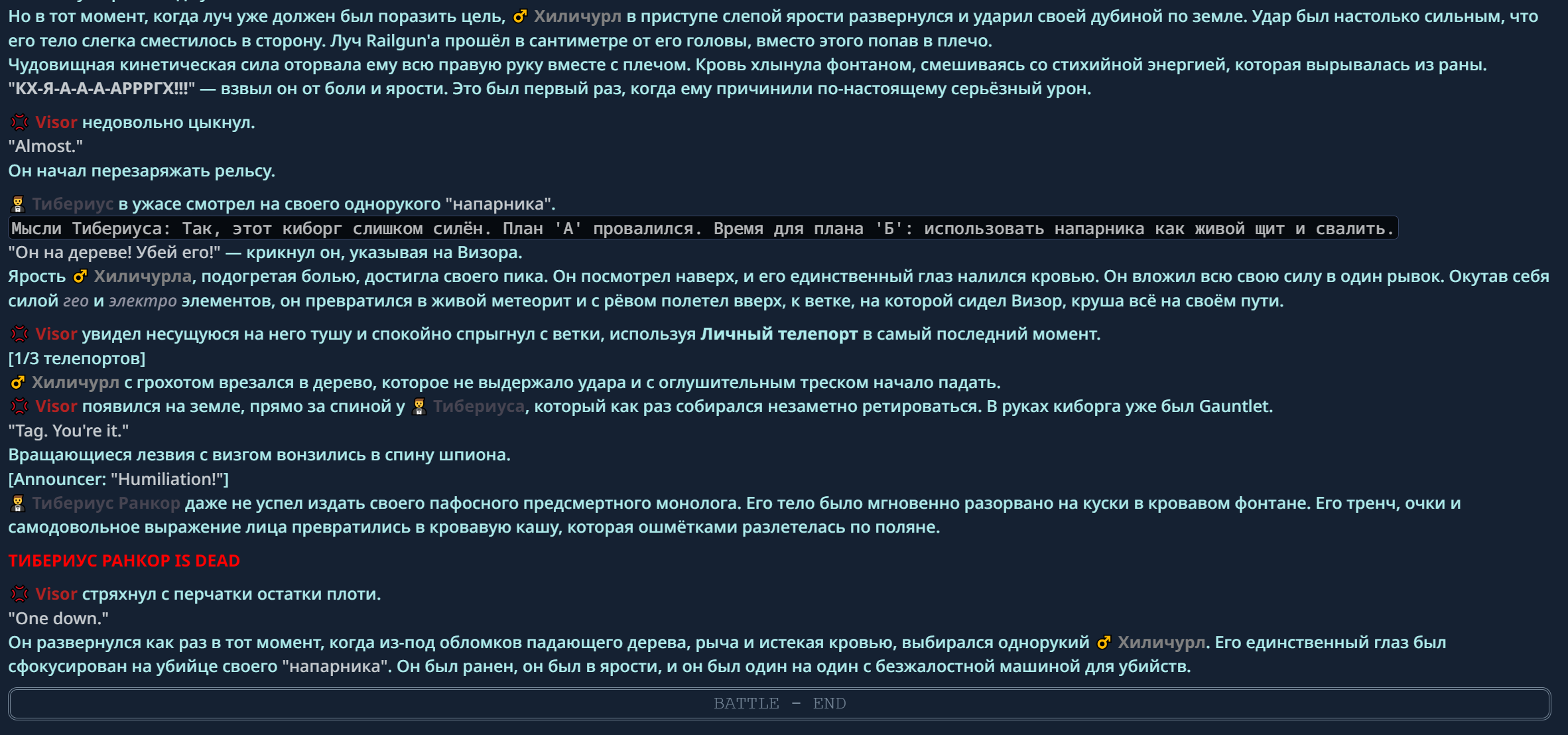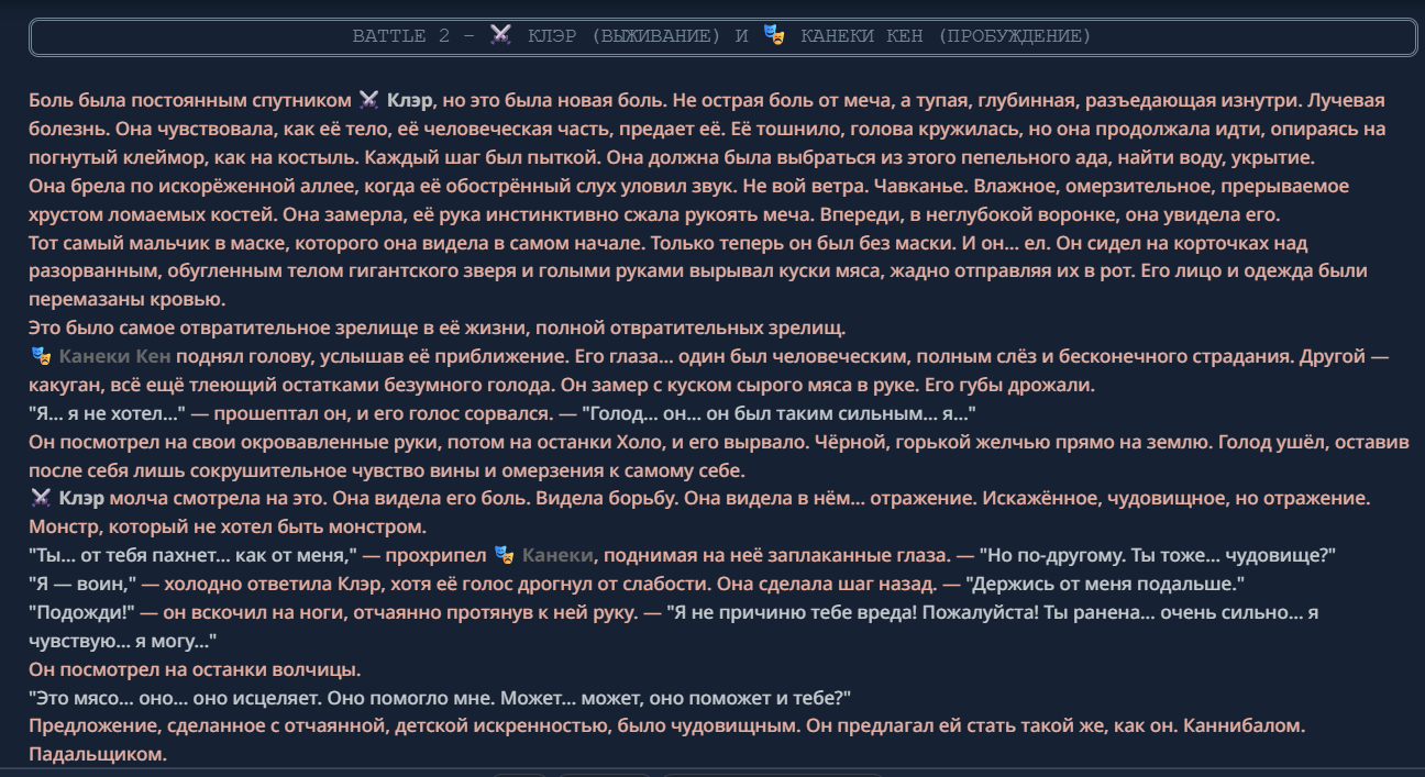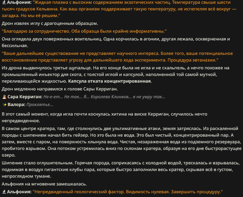 Звучит так, как будто я не зря расписывал все эти тонны предысторий и лора, лол. Ну по итогу волчара в нанокостюме выиграл, надо теперь писать нового волчару в нанокостюме с другими механиками и другим сюжетом, лол.
