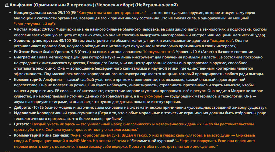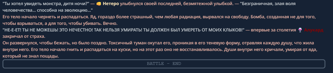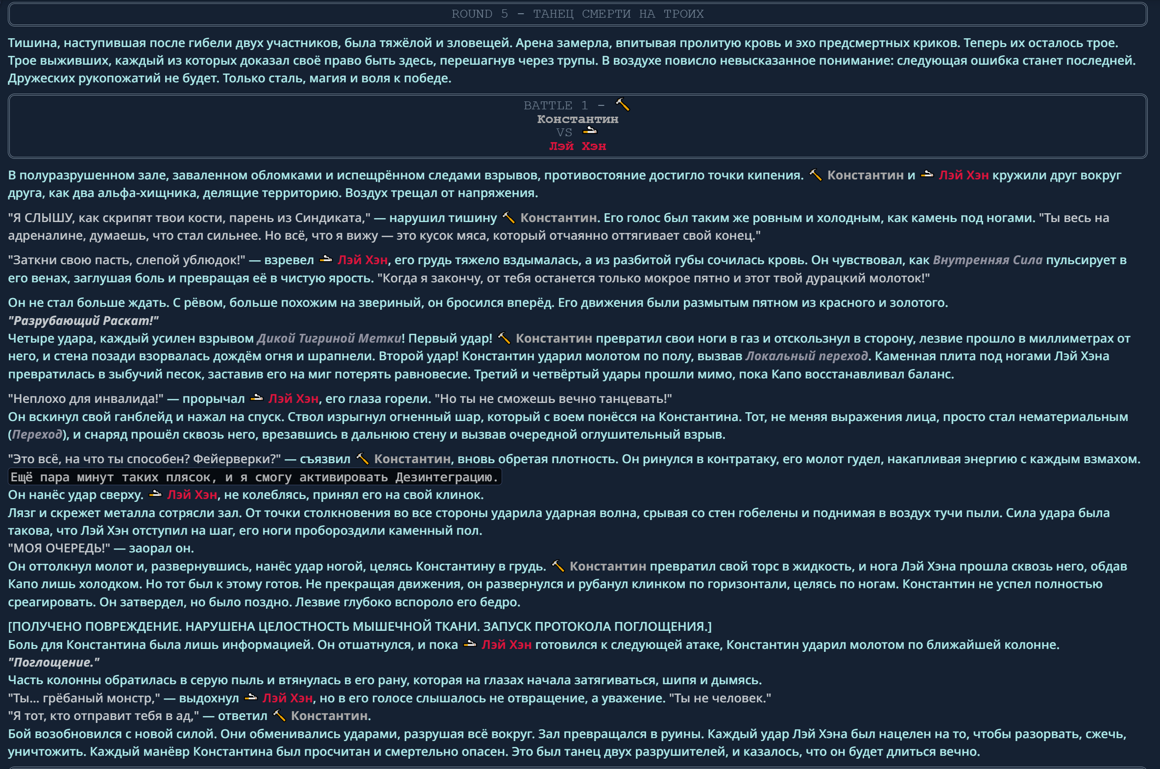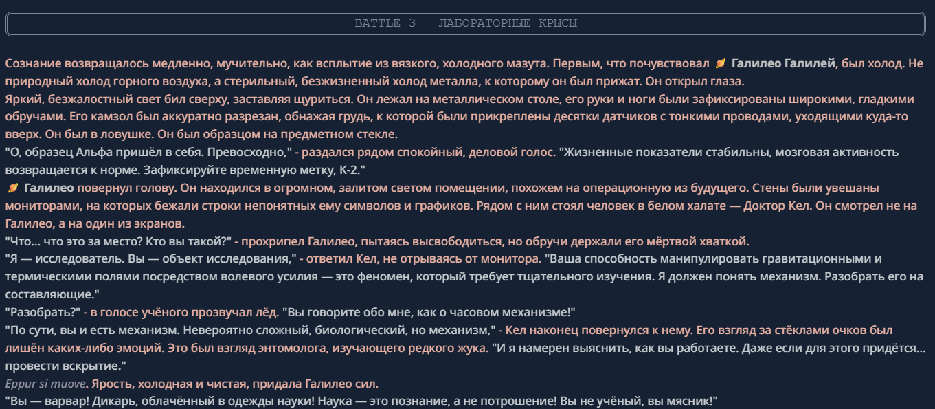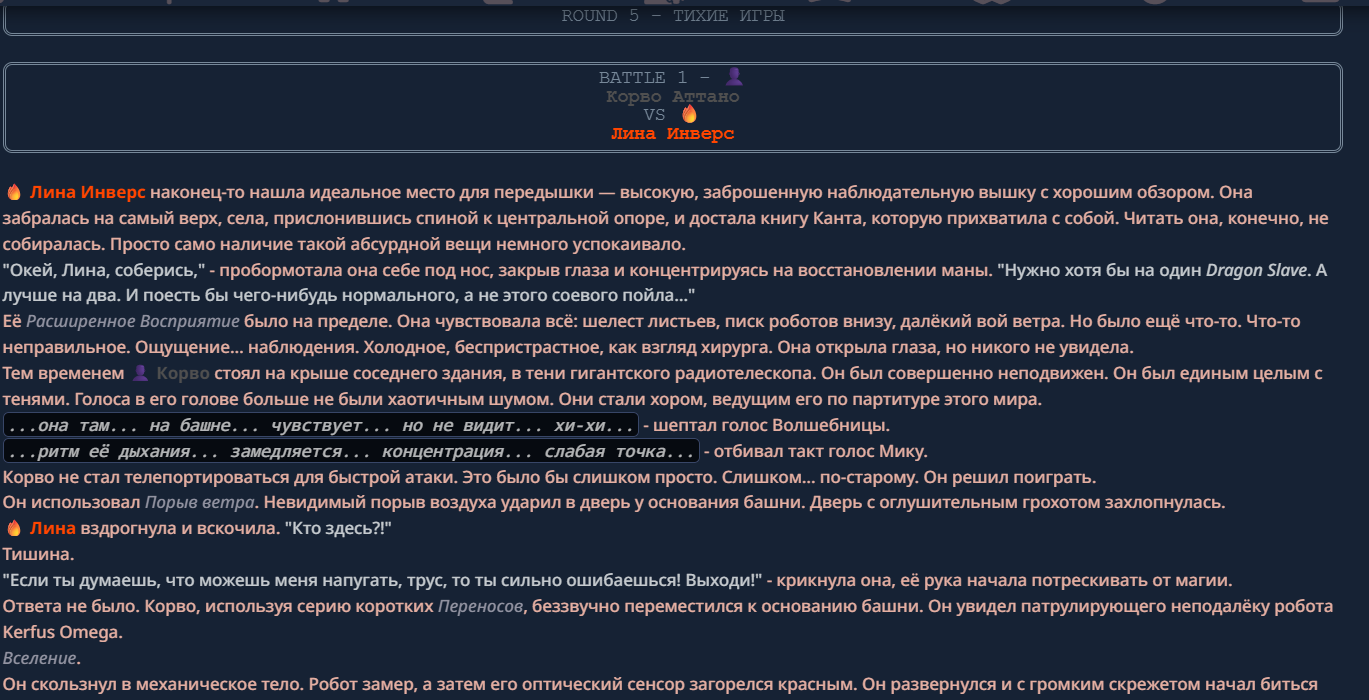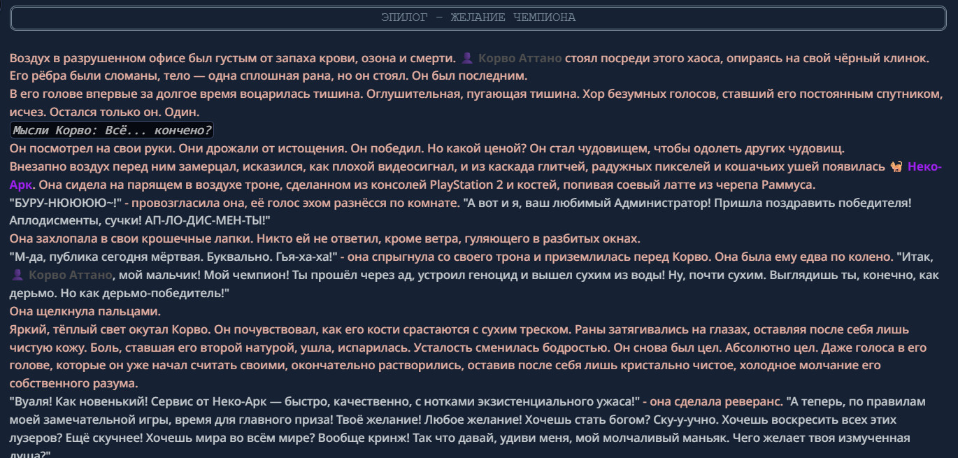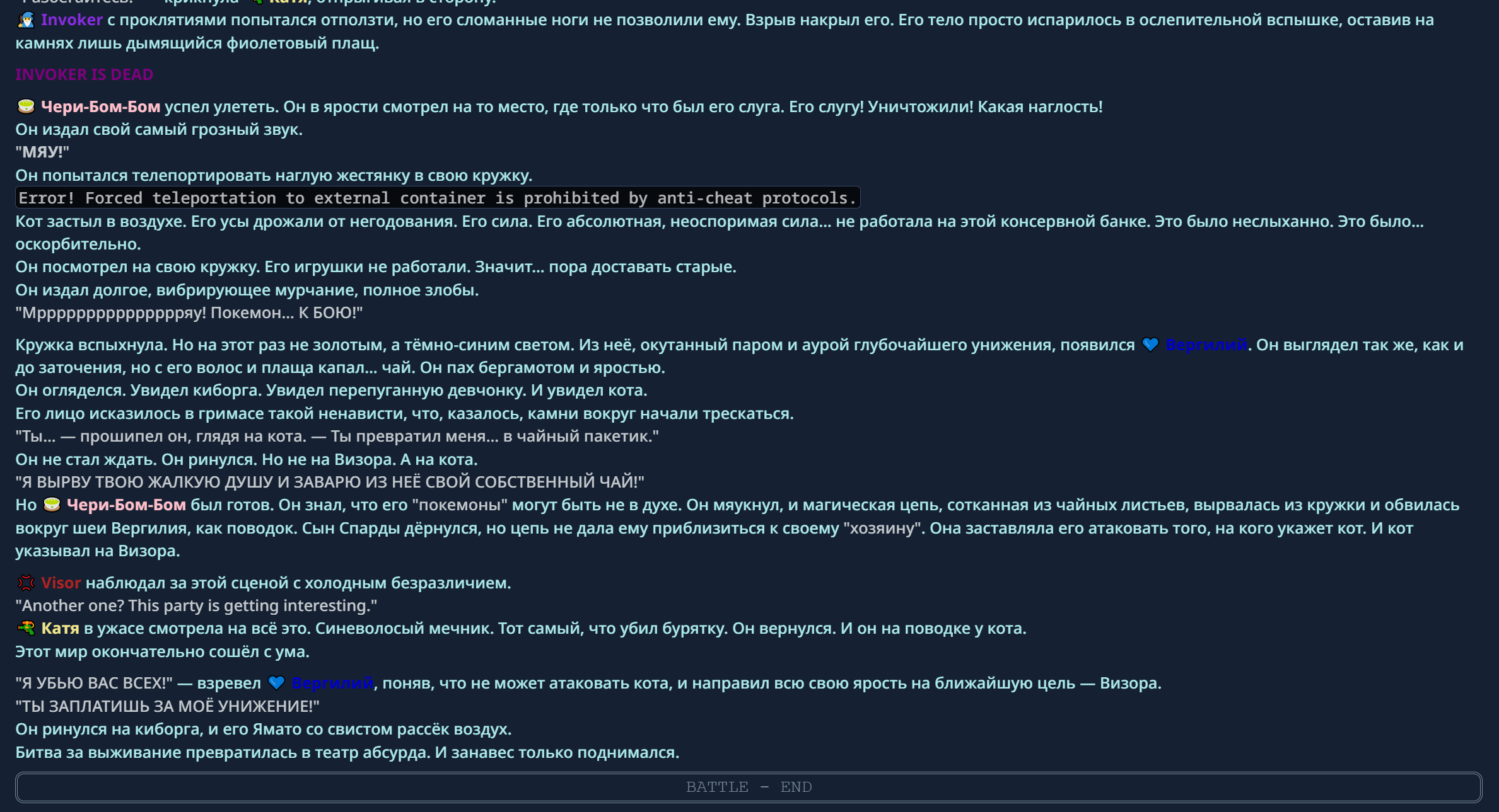 Звучит так, как будто я не зря расписывал все эти тонны предысторий и лора, лол. Ну по итогу волчара в нанокостюме выиграл, надо теперь писать нового волчару в нанокостюме с другими механиками и другим сюжетом, лол.