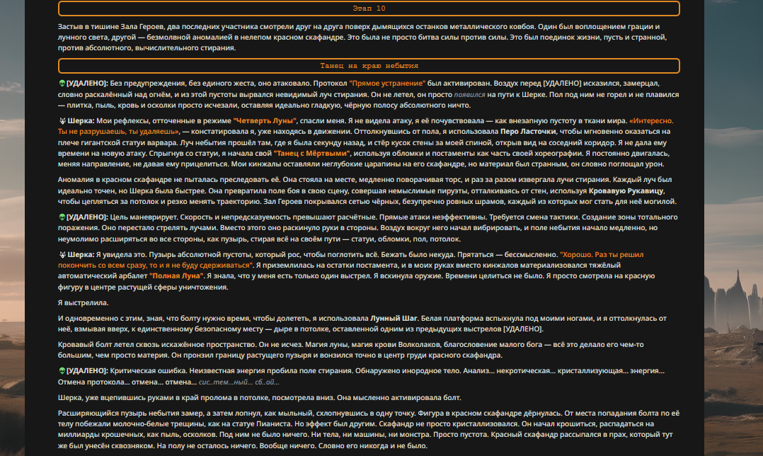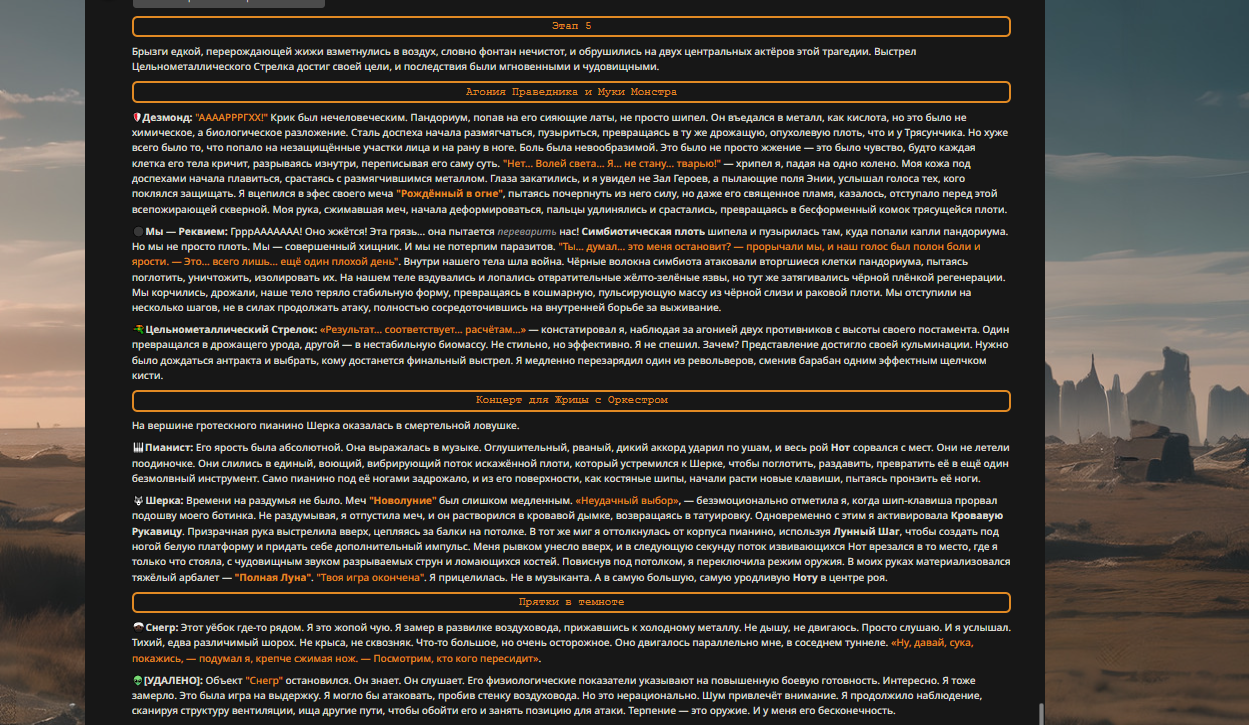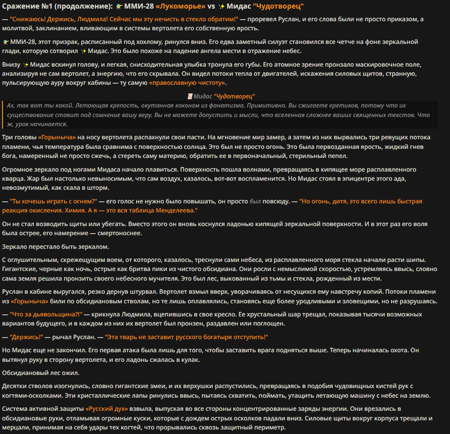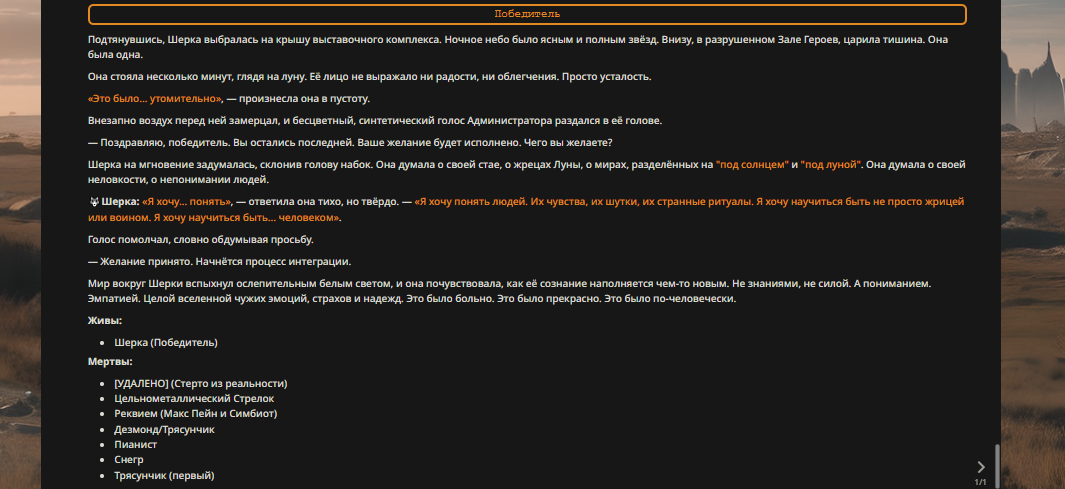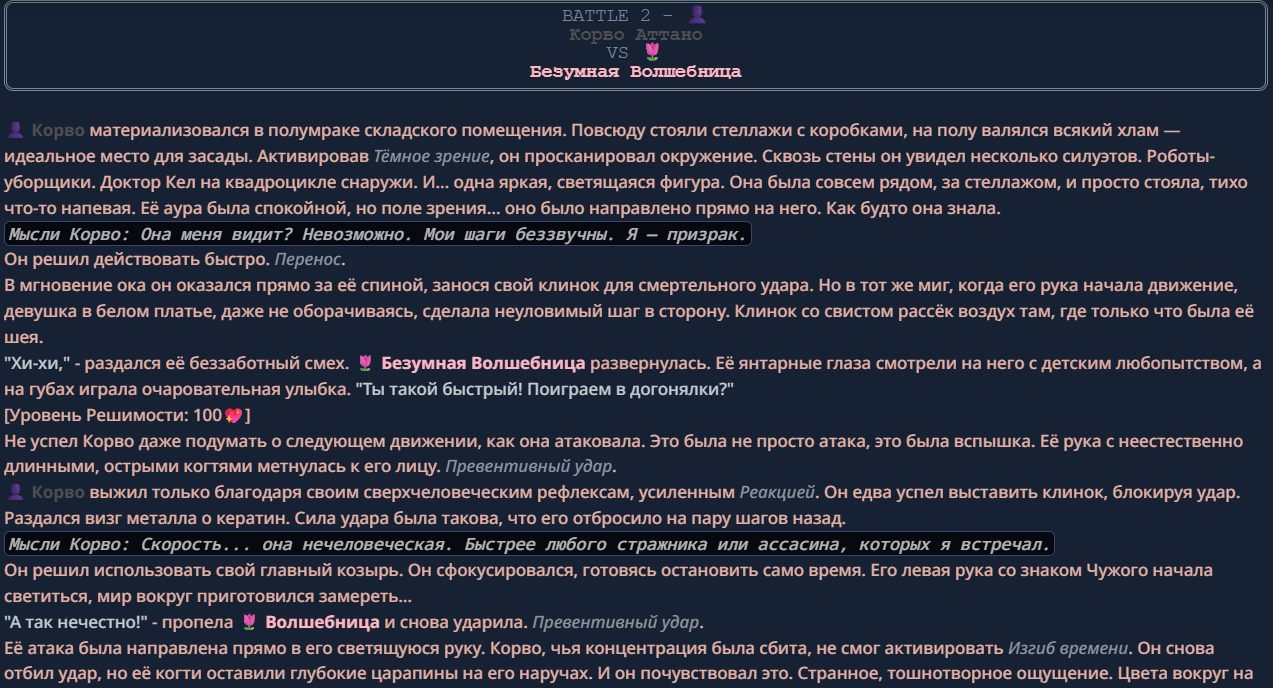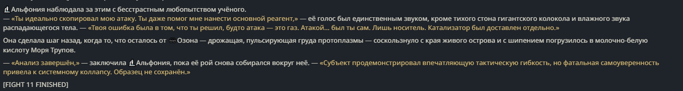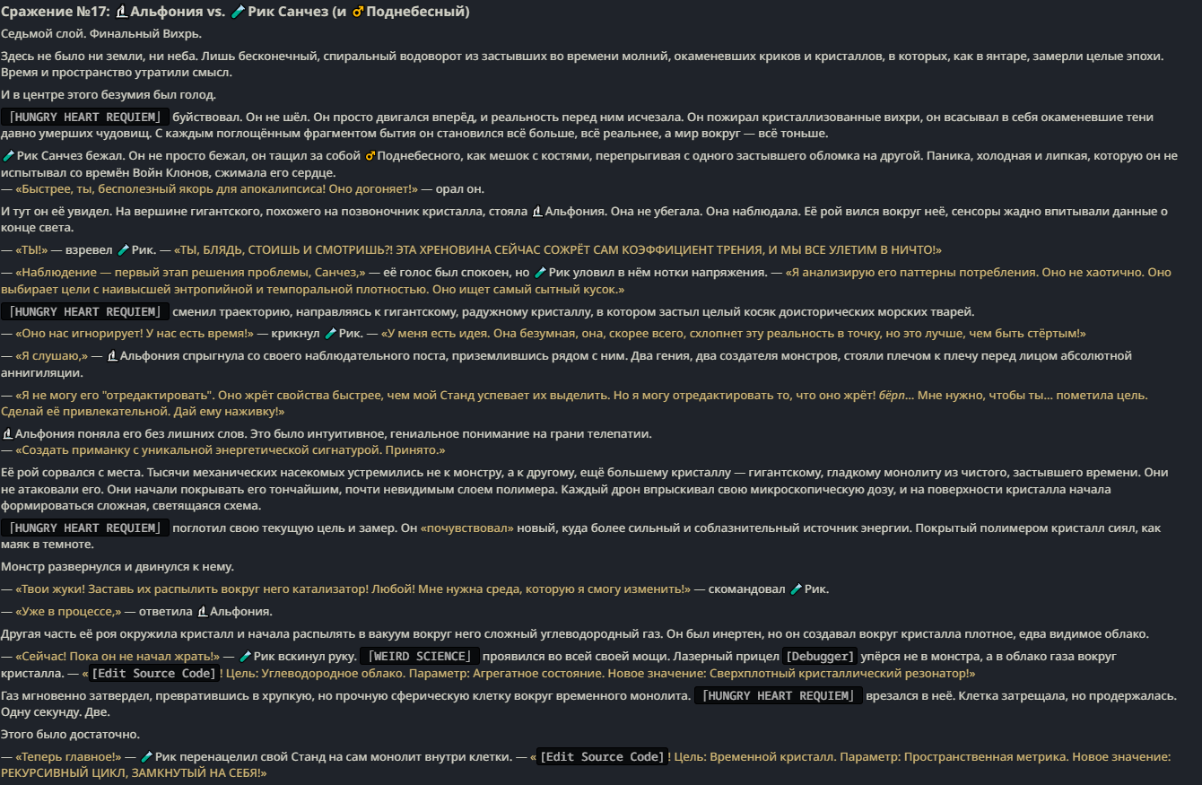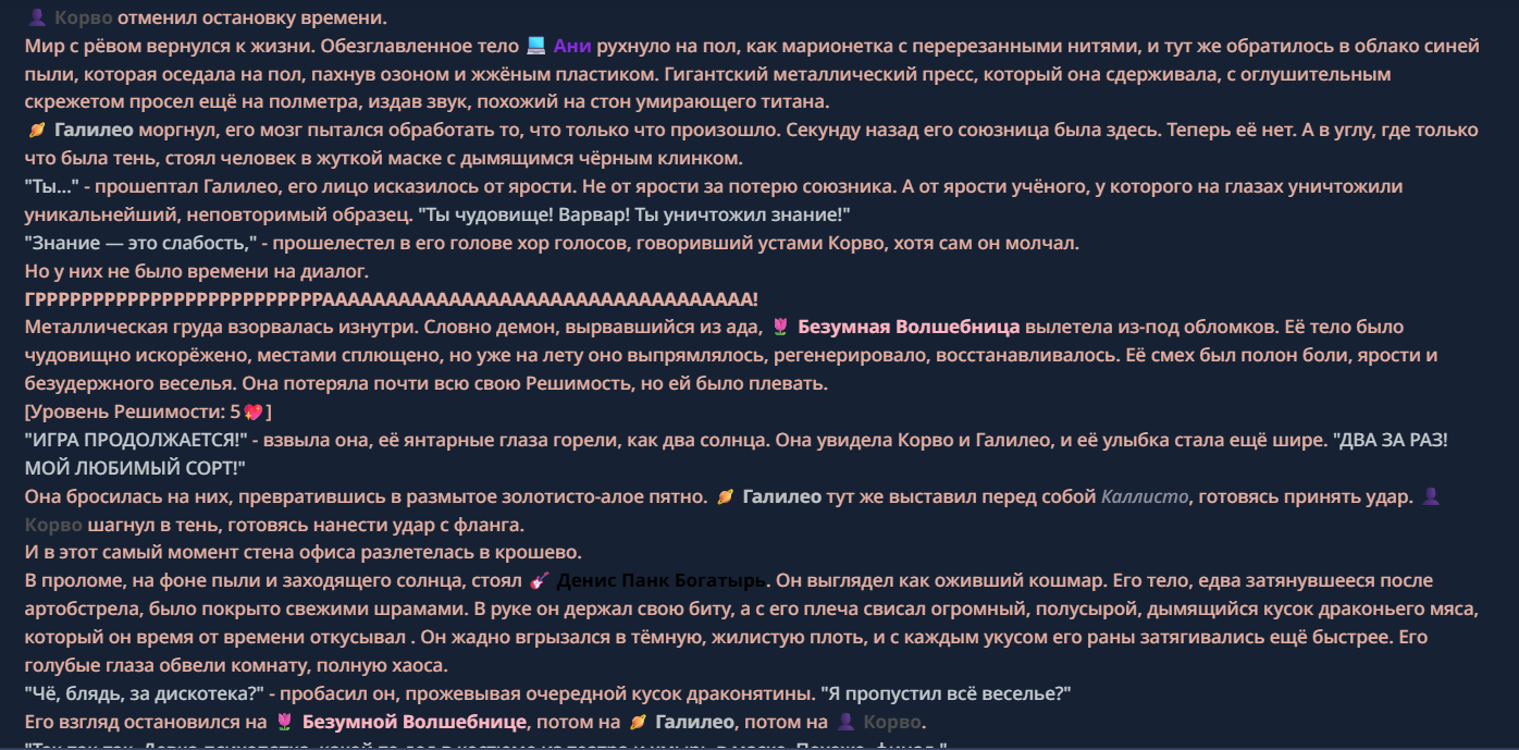 Звучит так, как будто я не зря расписывал все эти тонны предысторий и лора, лол. Ну по итогу волчара в нанокостюме выиграл, надо теперь писать нового волчару в нанокостюме с другими механиками и другим сюжетом, лол.