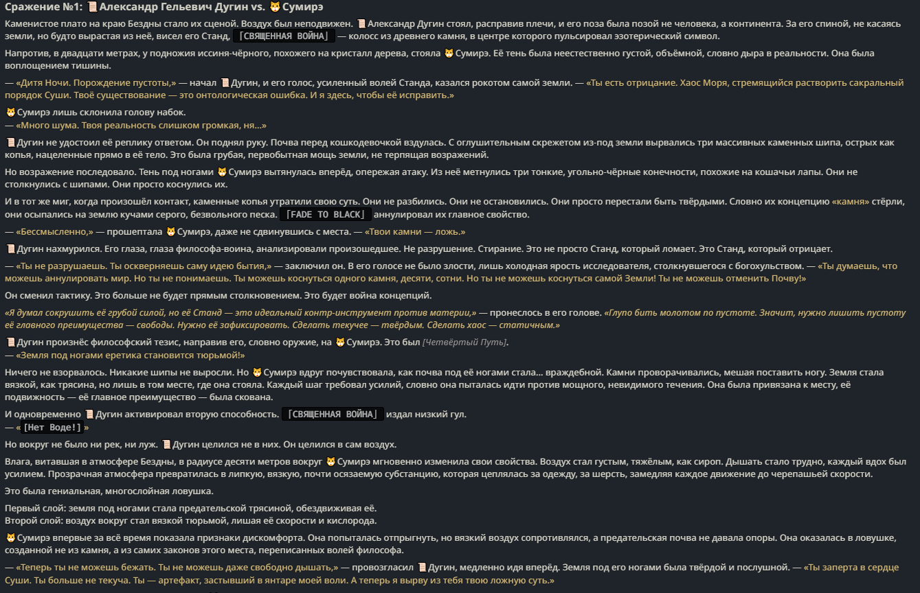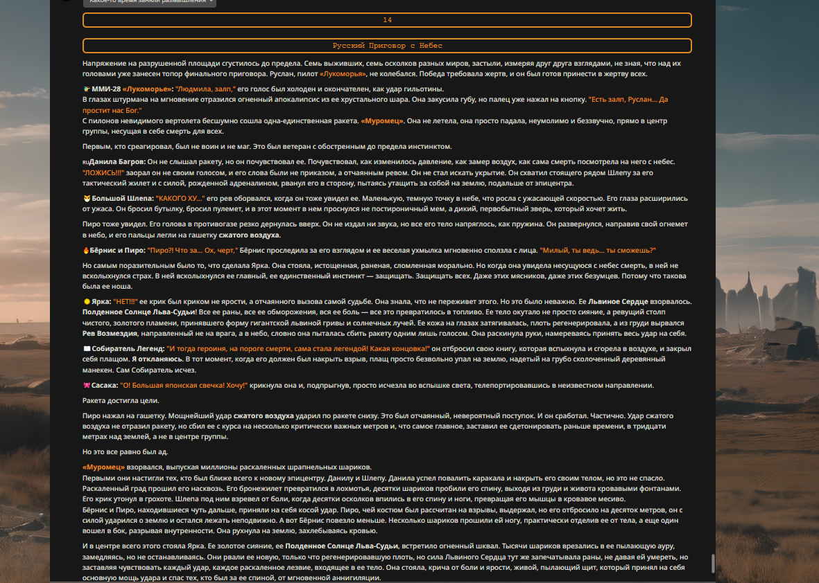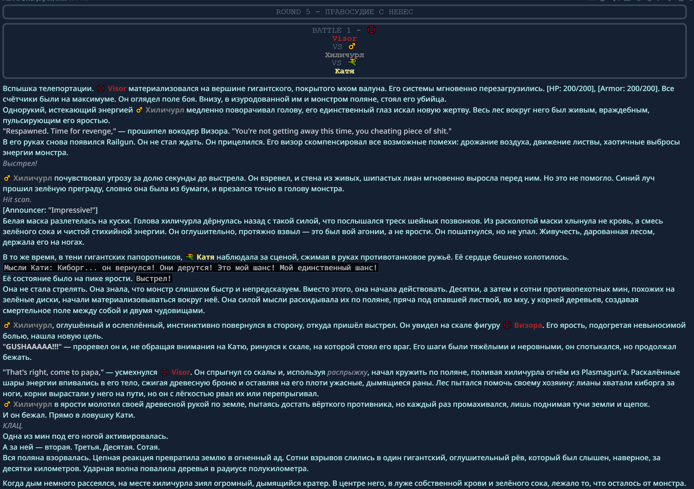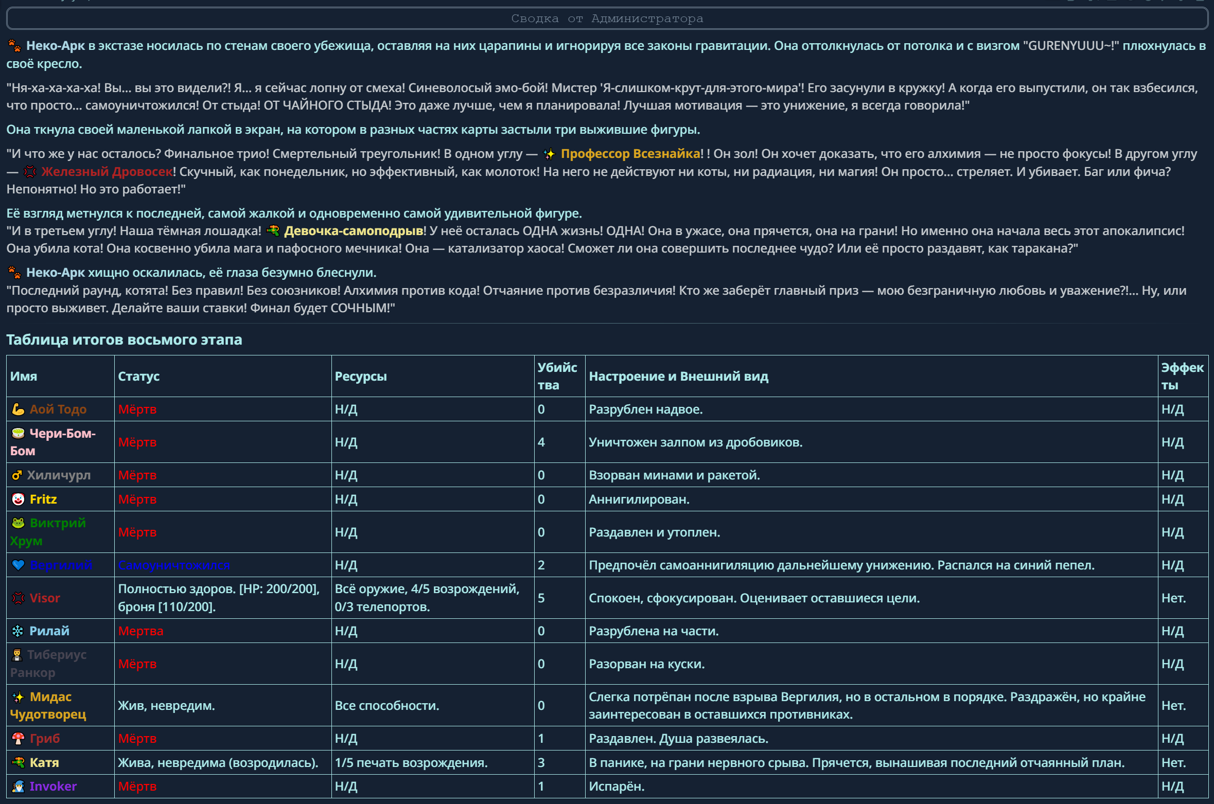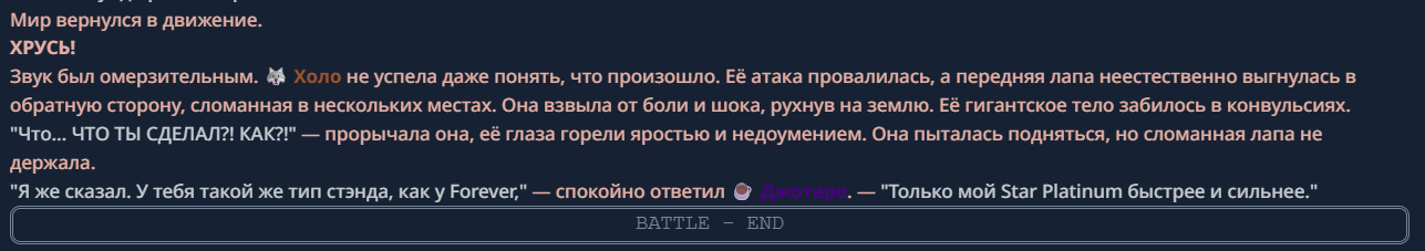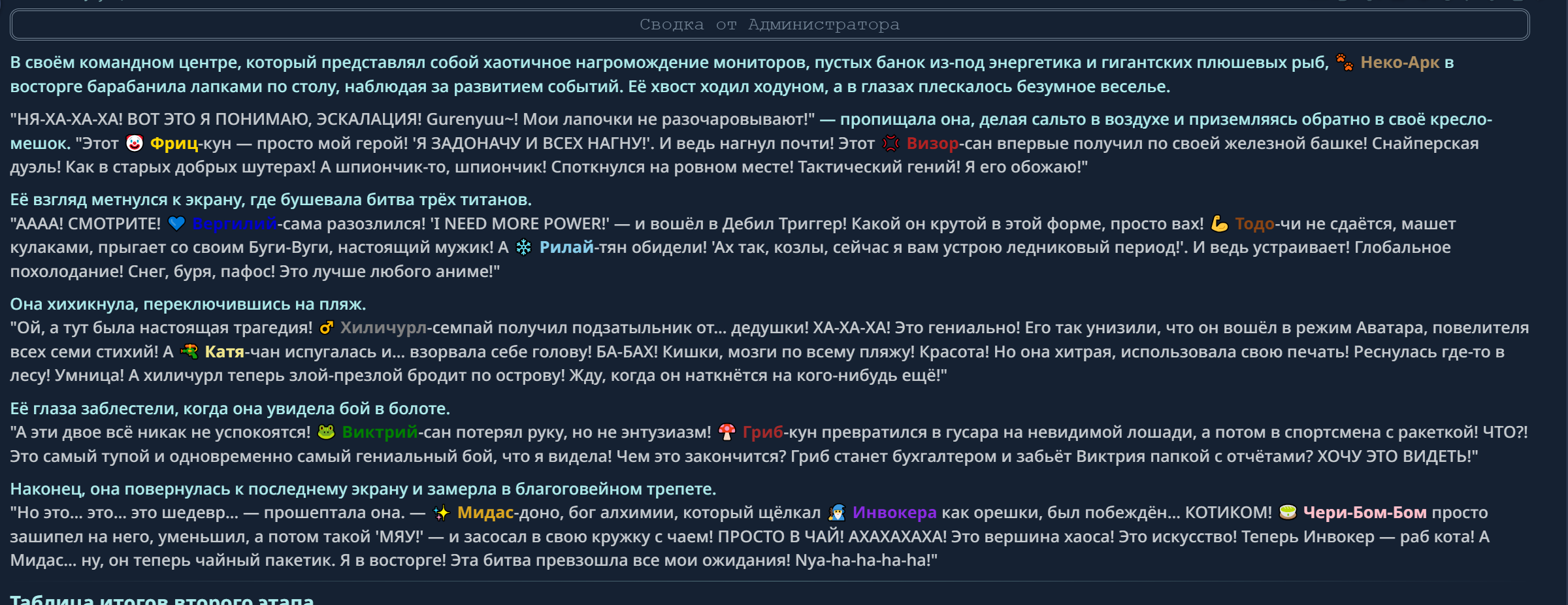 Звучит так, как будто я не зря расписывал все эти тонны предысторий и лора, лол. Ну по итогу волчара в нанокостюме выиграл, надо теперь писать нового волчару в нанокостюме с другими механиками и другим сюжетом, лол.