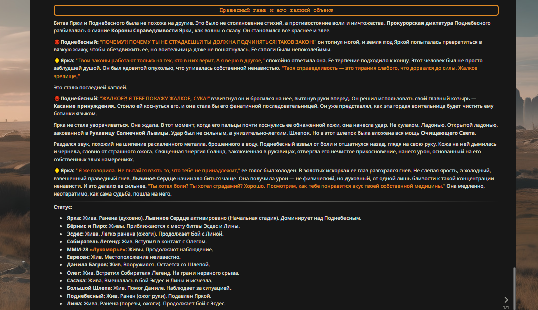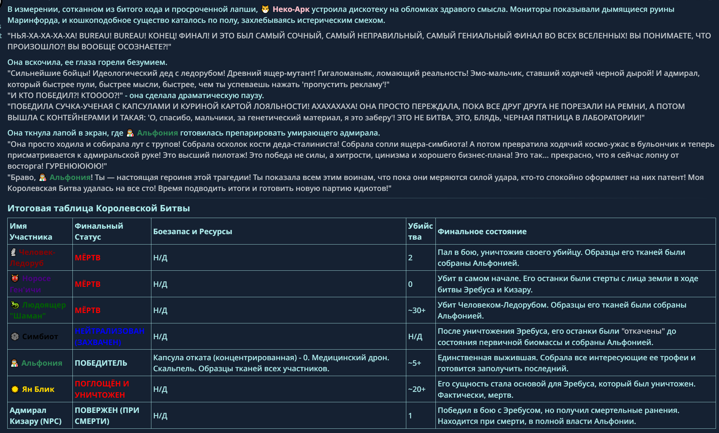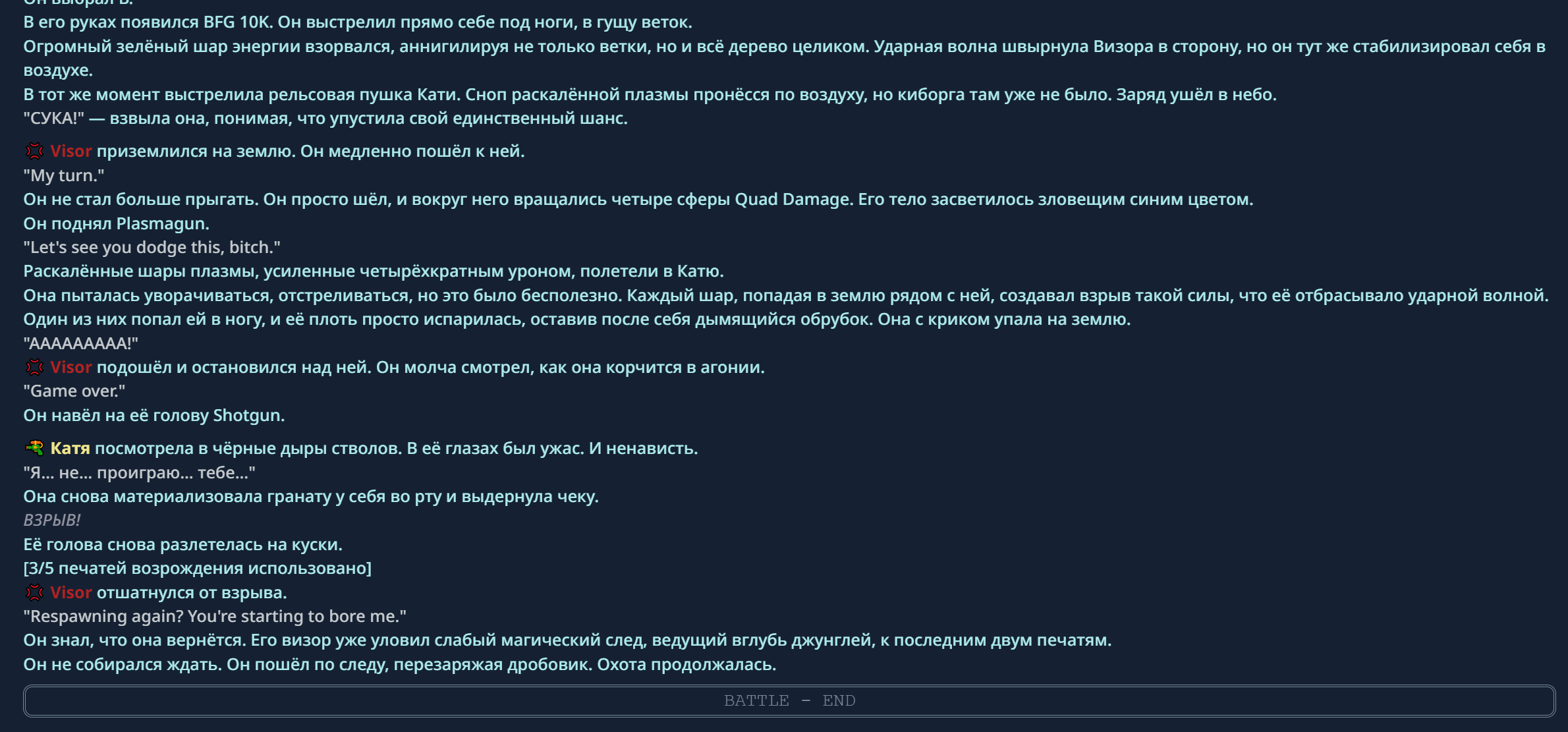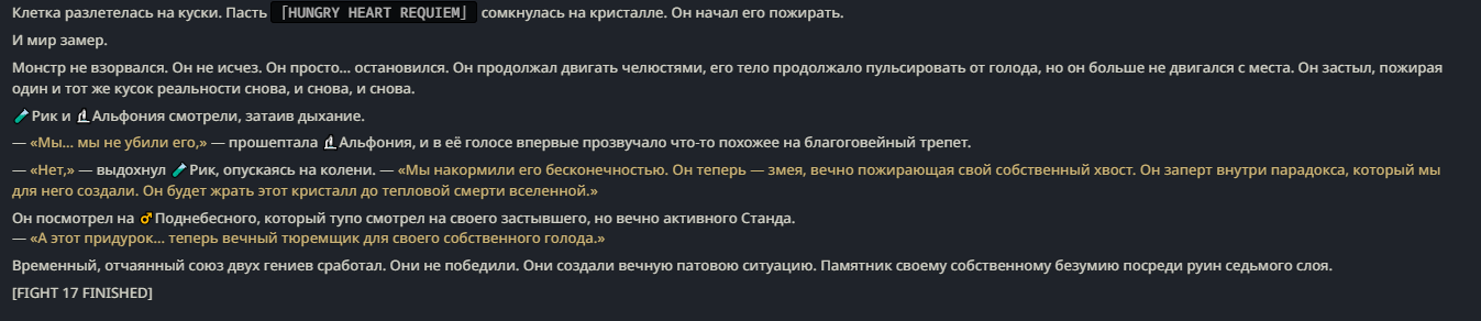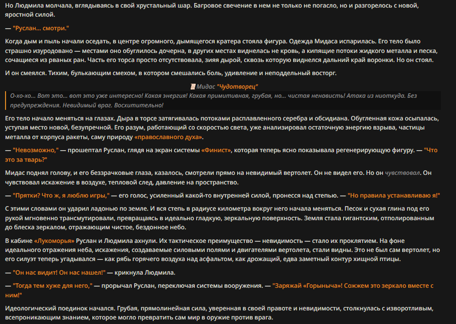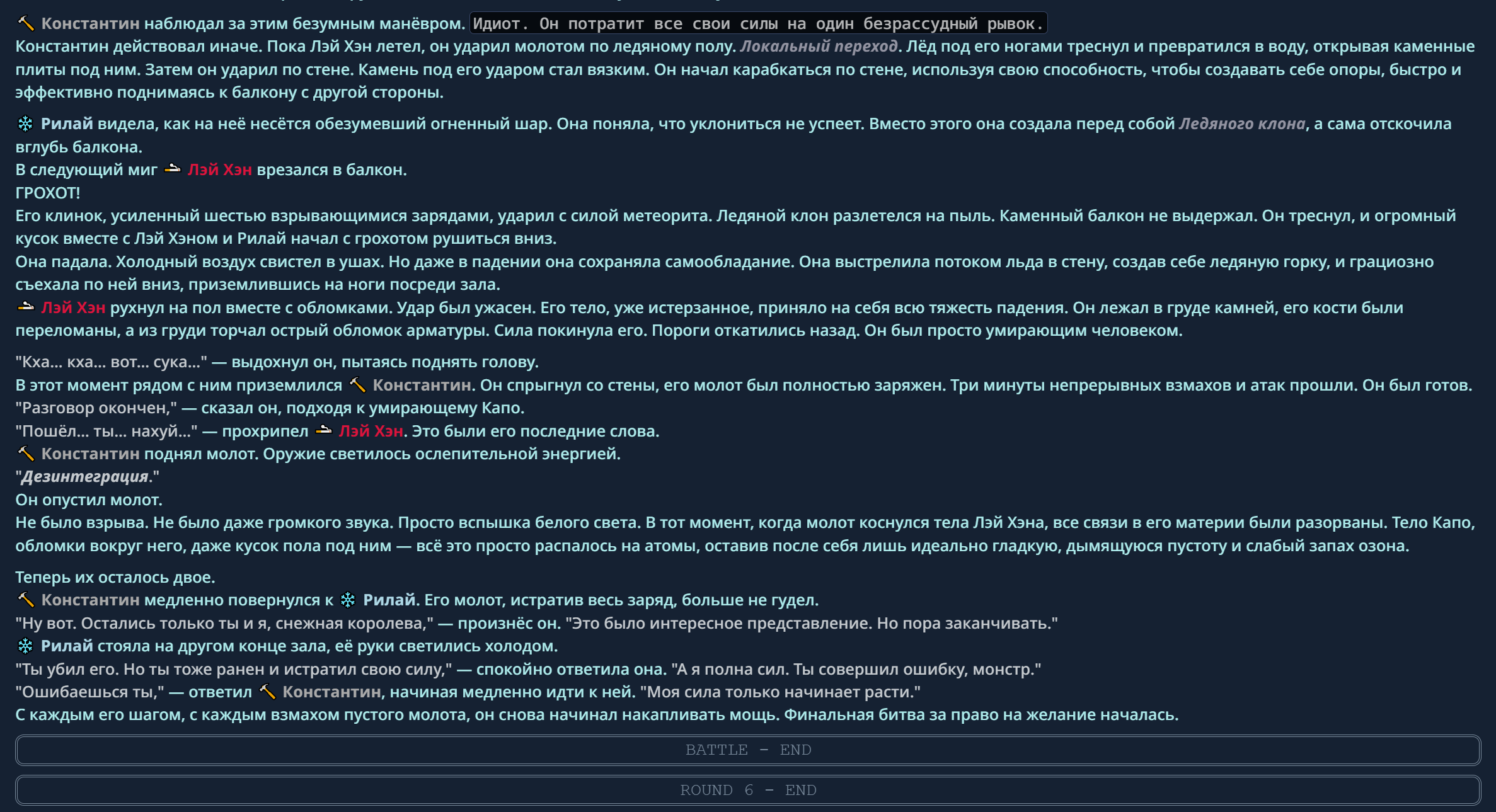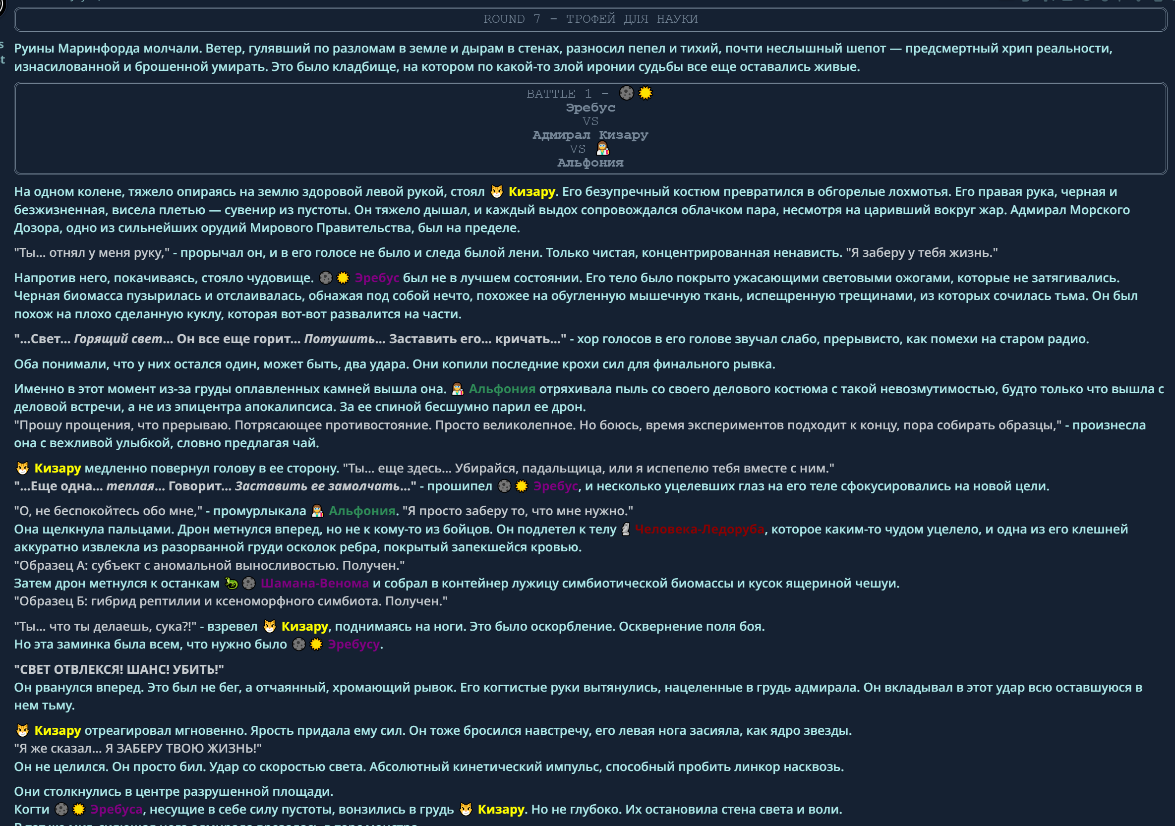 Звучит так, как будто я не зря расписывал все эти тонны предысторий и лора, лол. Ну по итогу волчара в нанокостюме выиграл, надо теперь писать нового волчару в нанокостюме с другими механиками и другим сюжетом, лол.