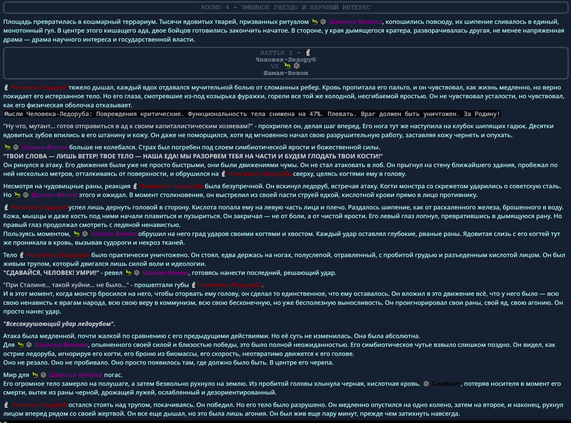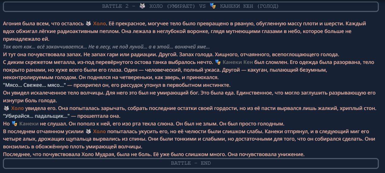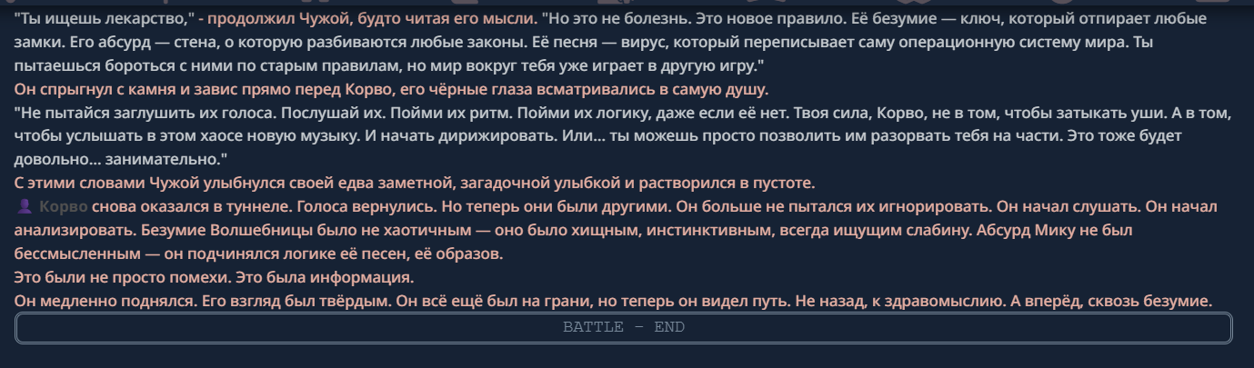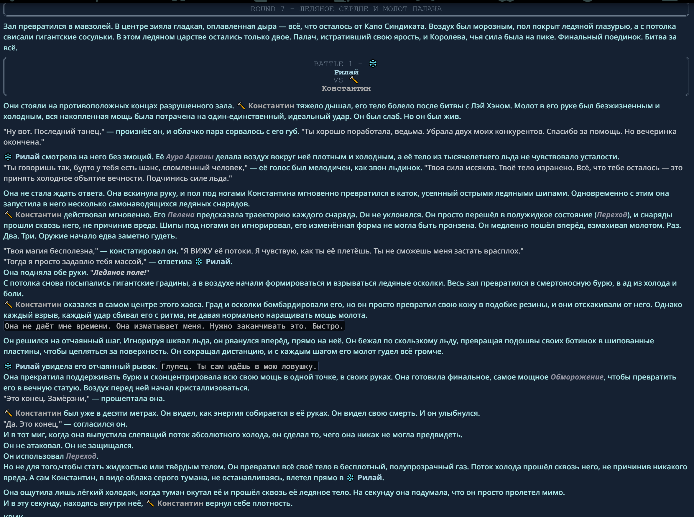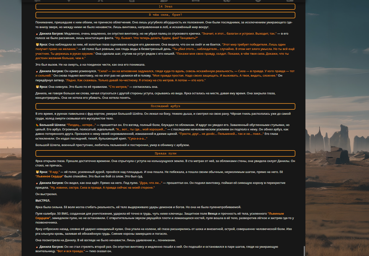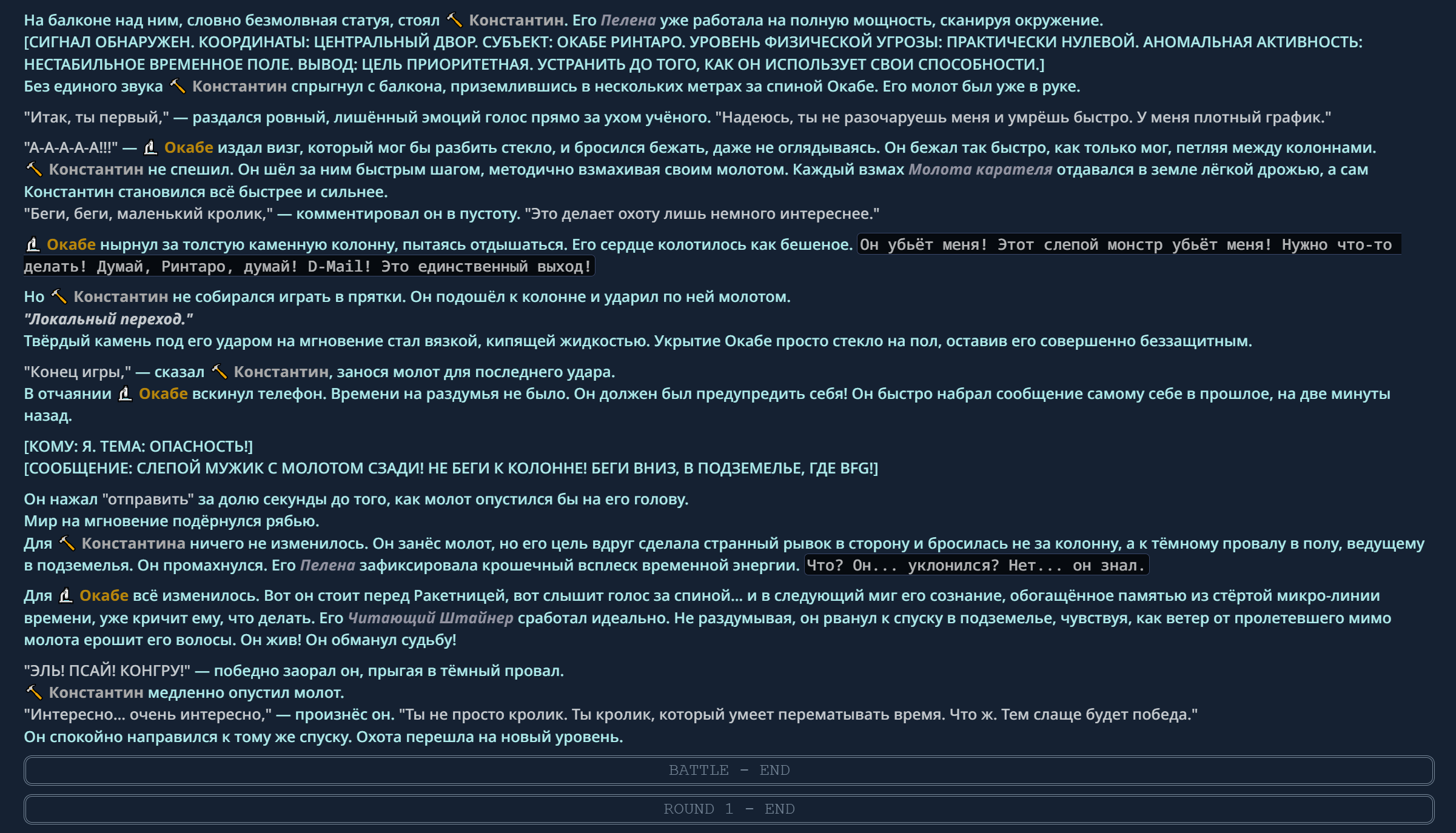 Звучит так, как будто я не зря расписывал все эти тонны предысторий и лора, лол. Ну по итогу волчара в нанокостюме выиграл, надо теперь писать нового волчару в нанокостюме с другими механиками и другим сюжетом, лол.