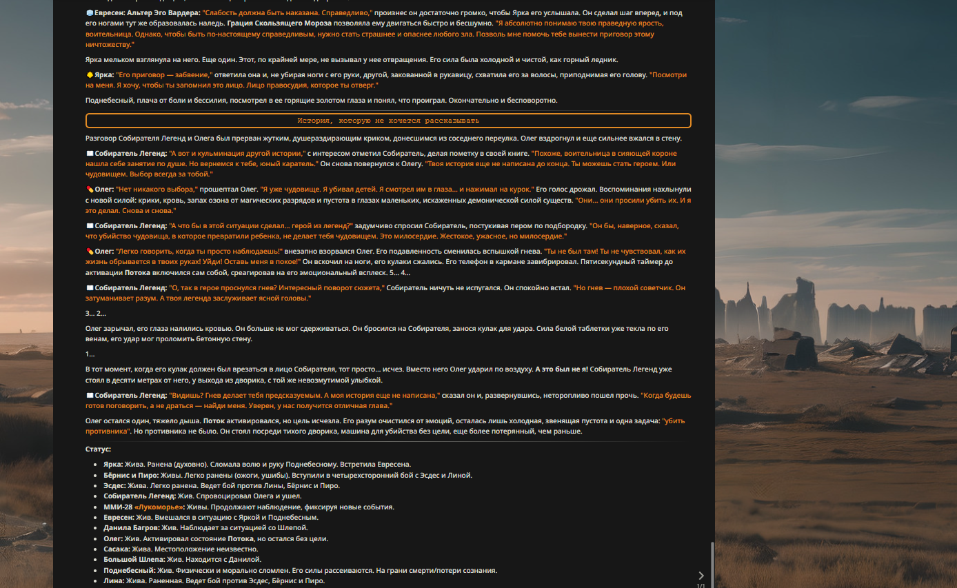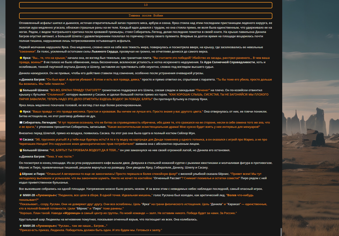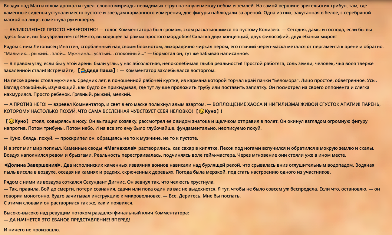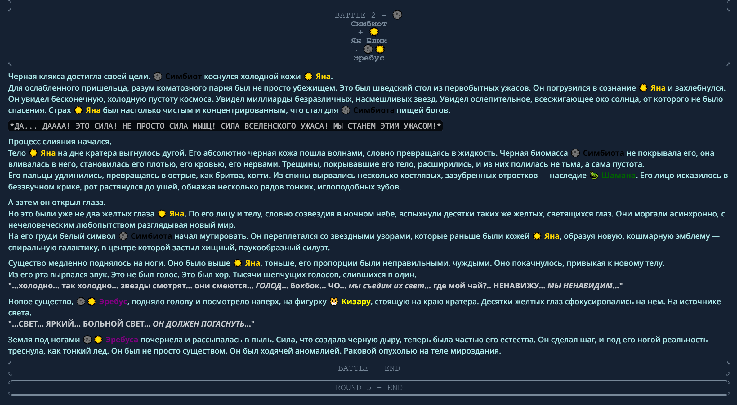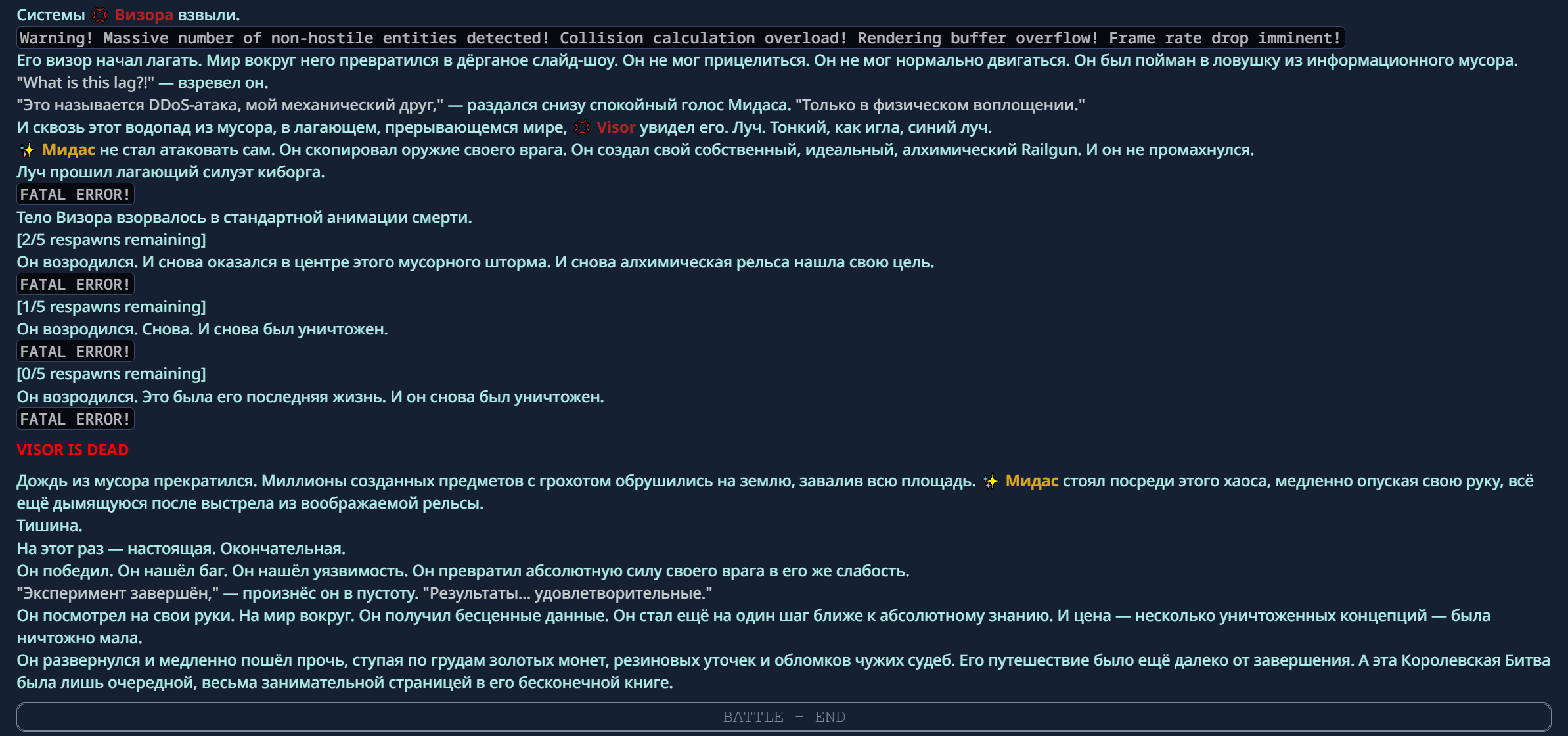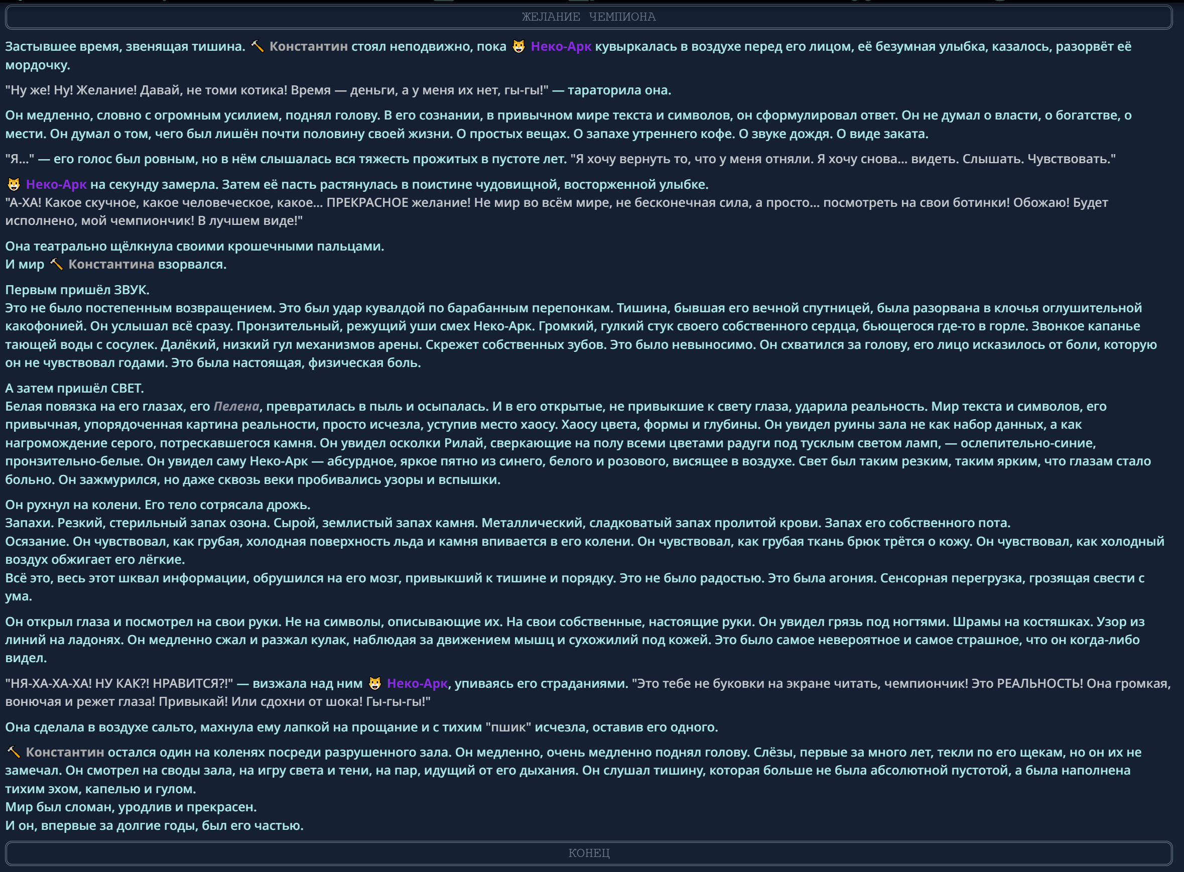Звучит так, как будто я не зря расписывал все эти тонны предысторий и лора, лол. Ну по итогу волчара в нанокостюме выиграл, надо теперь писать нового волчару в нанокостюме с другими механиками и другим сюжетом, лол.