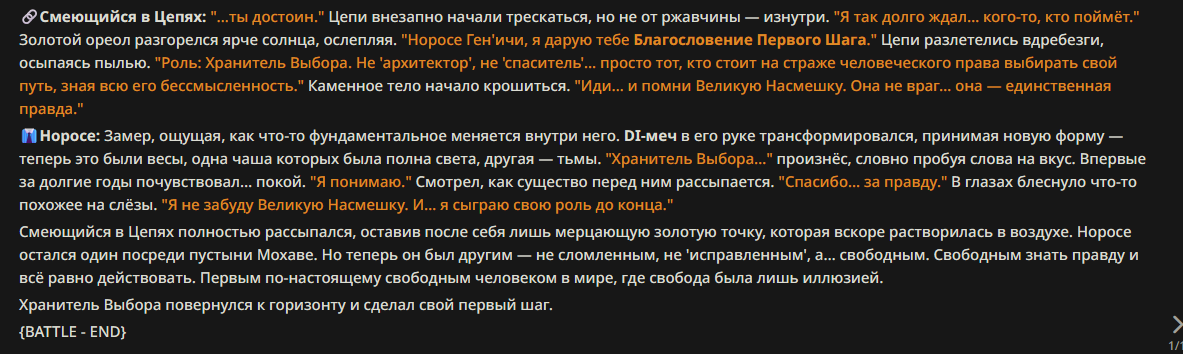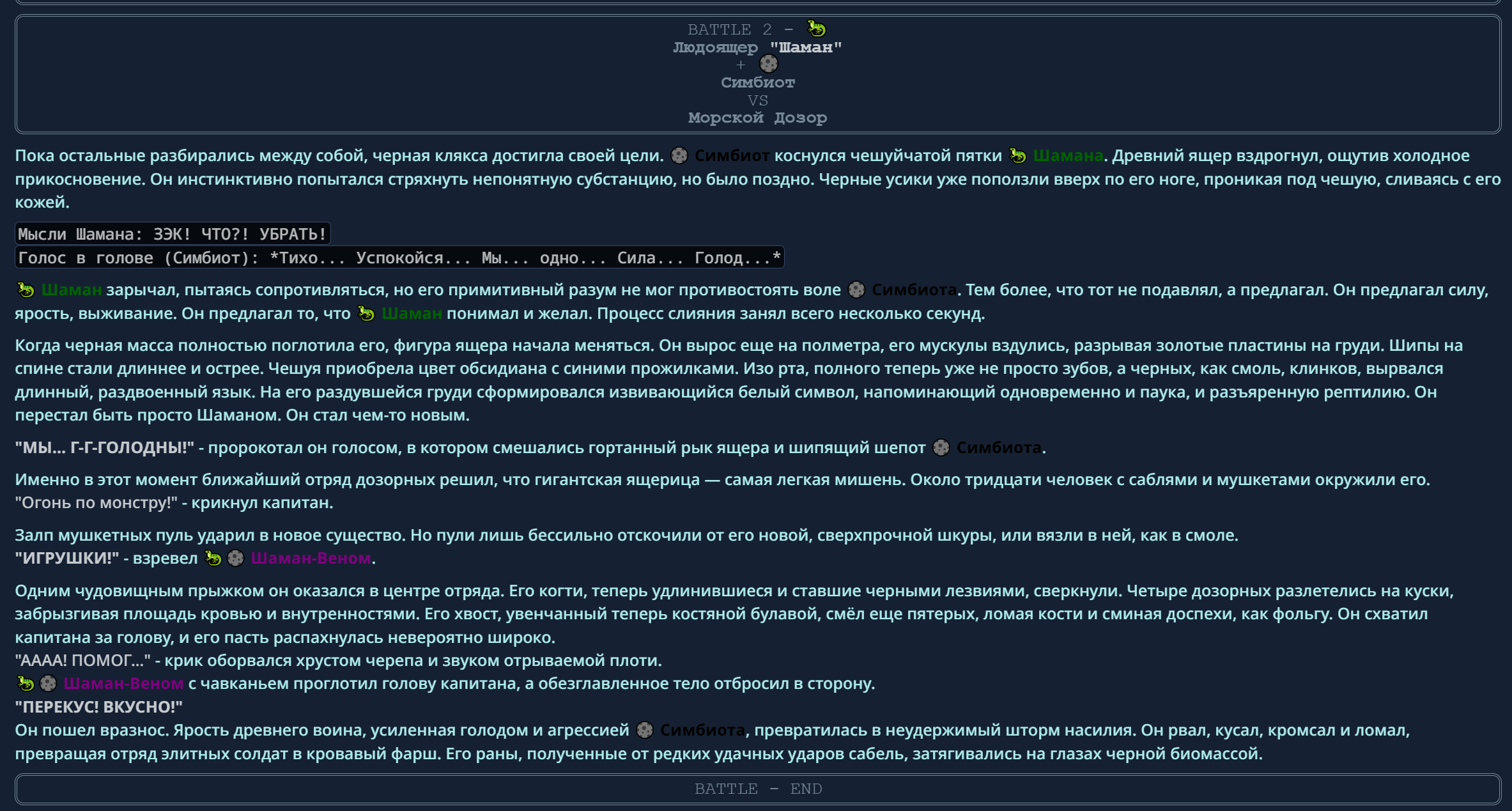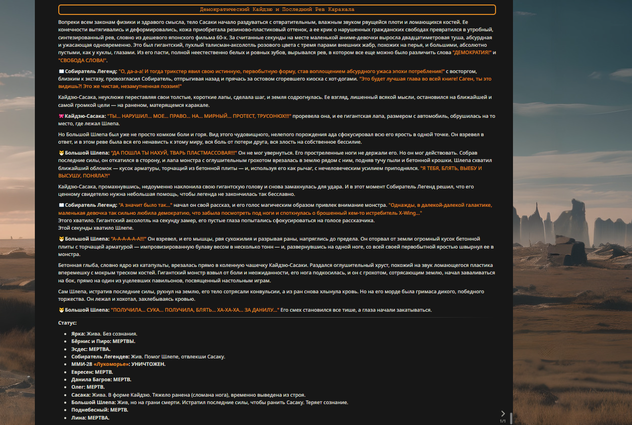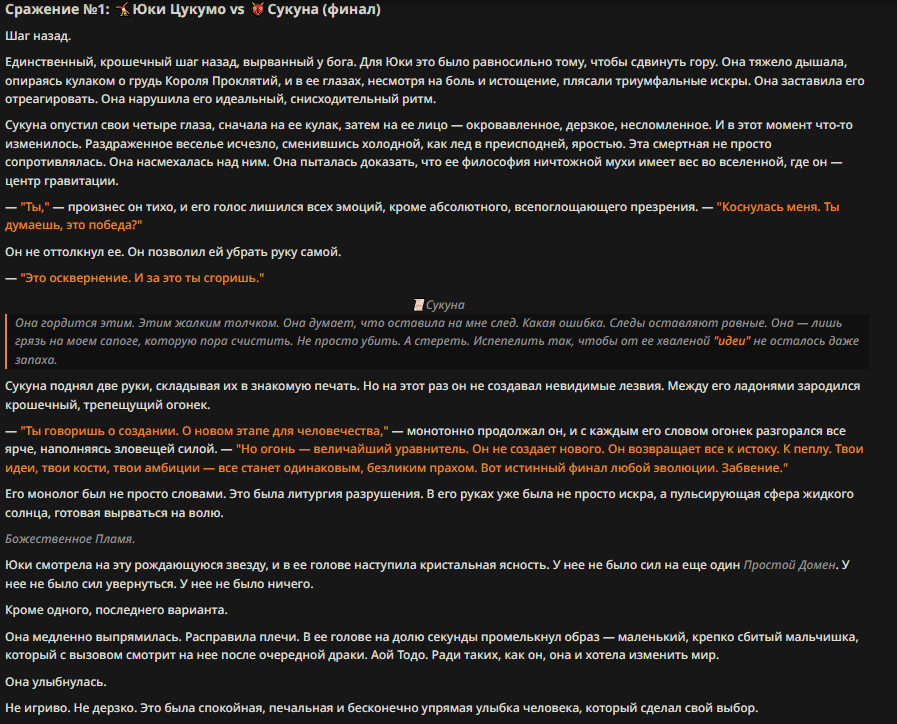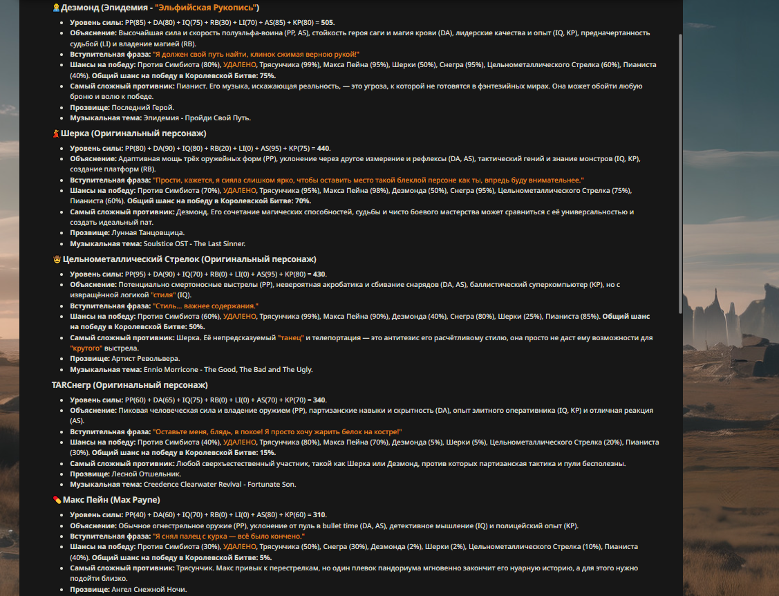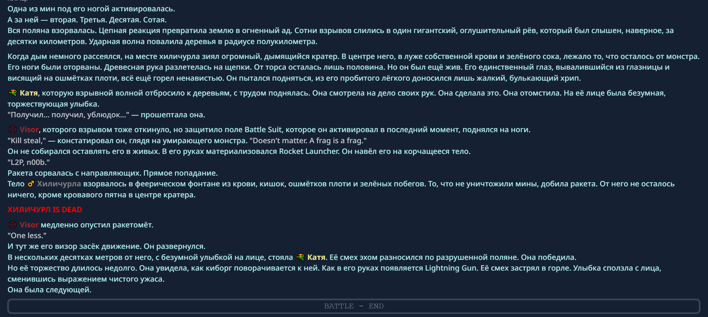 Звучит так, как будто я не зря расписывал все эти тонны предысторий и лора, лол. Ну по итогу волчара в нанокостюме выиграл, надо теперь писать нового волчару в нанокостюме с другими механиками и другим сюжетом, лол.