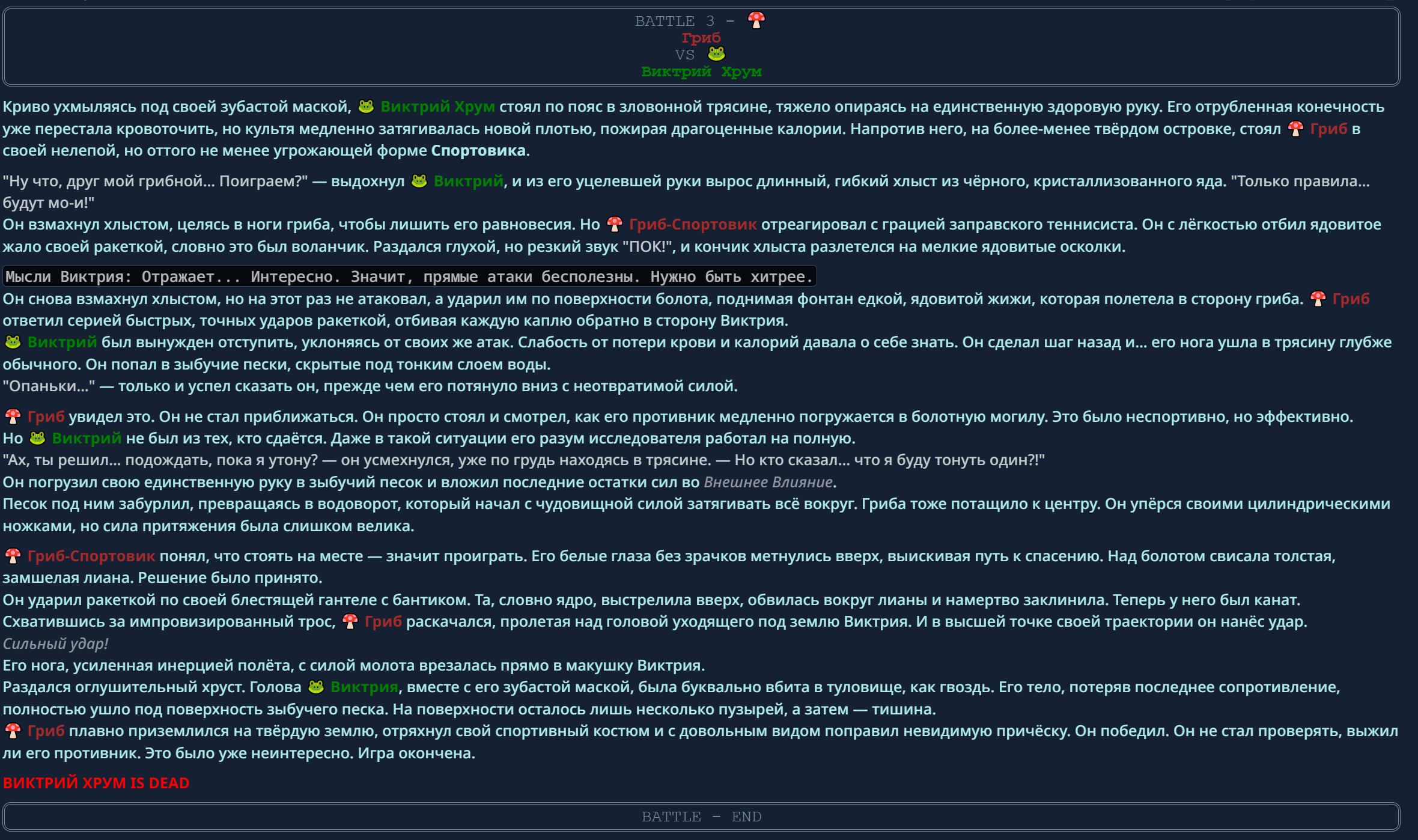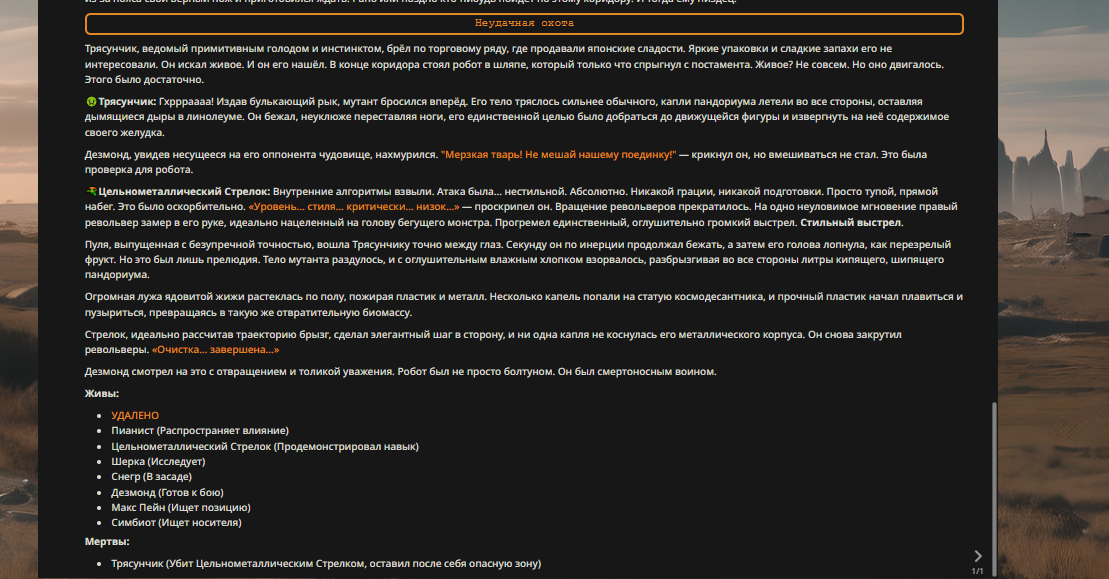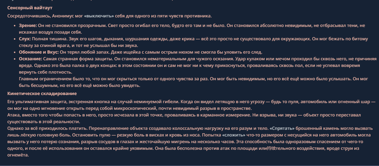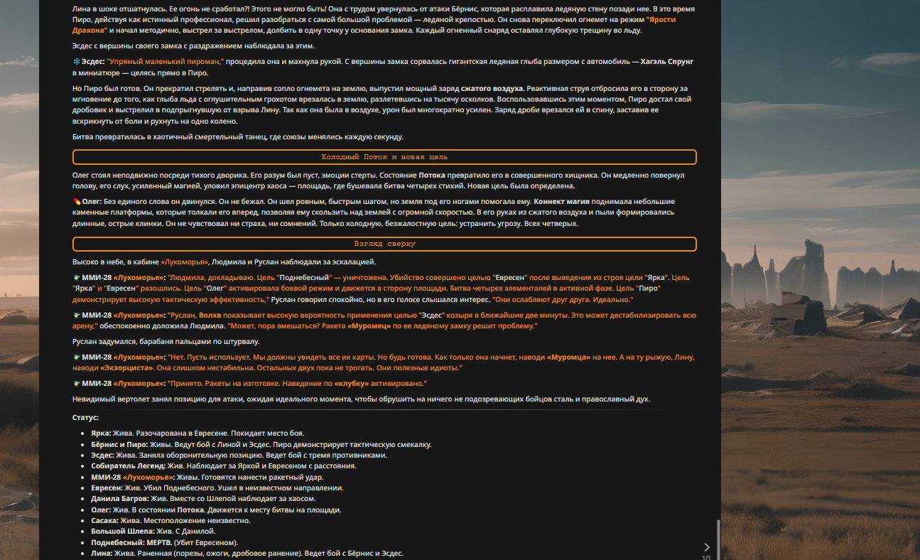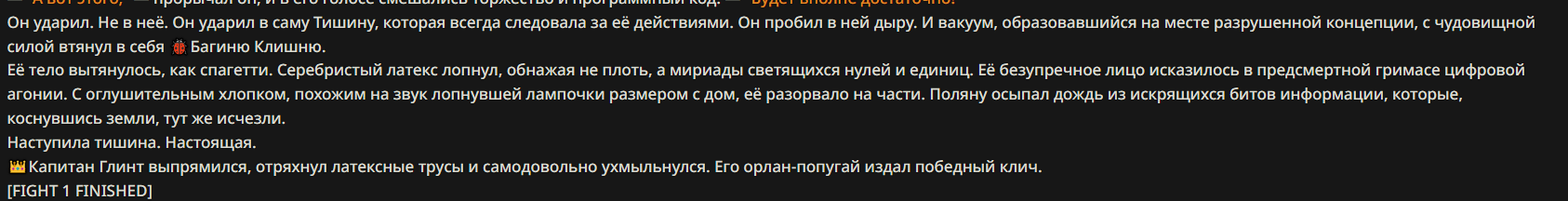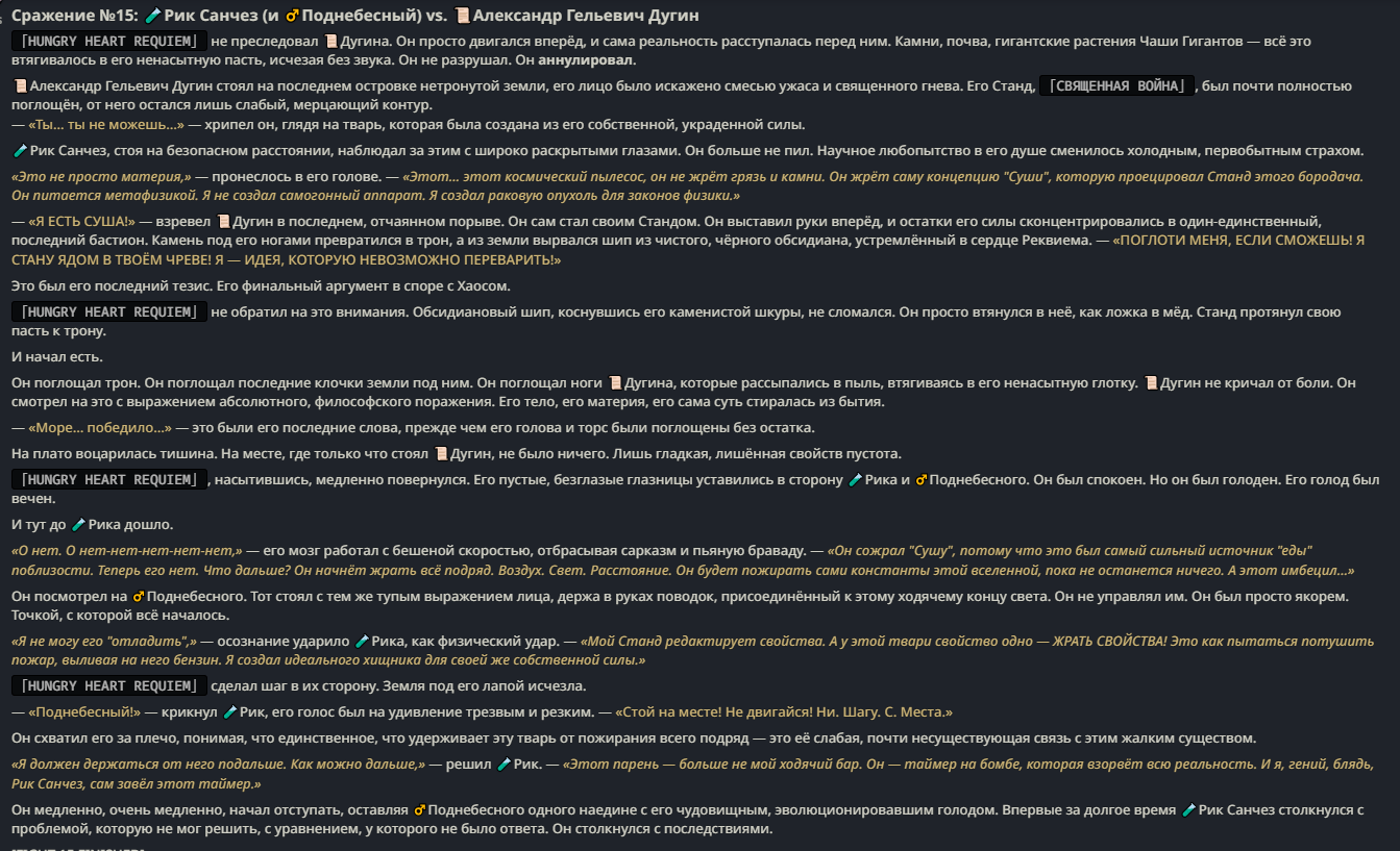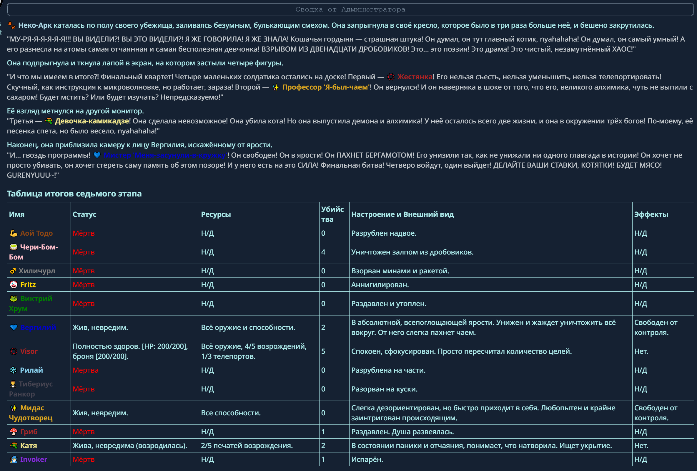 Звучит так, как будто я не зря расписывал все эти тонны предысторий и лора, лол. Ну по итогу волчара в нанокостюме выиграл, надо теперь писать нового волчару в нанокостюме с другими механиками и другим сюжетом, лол.
